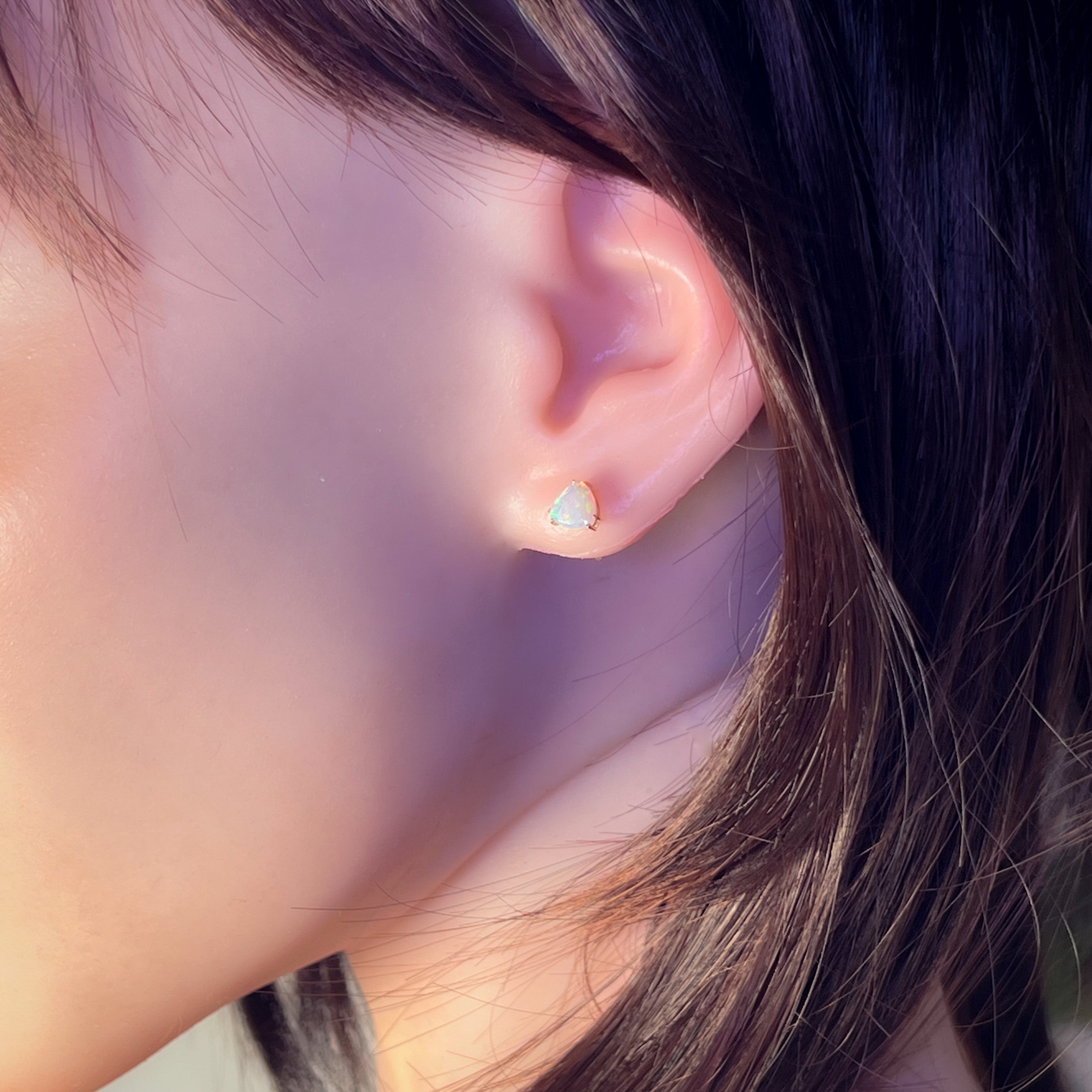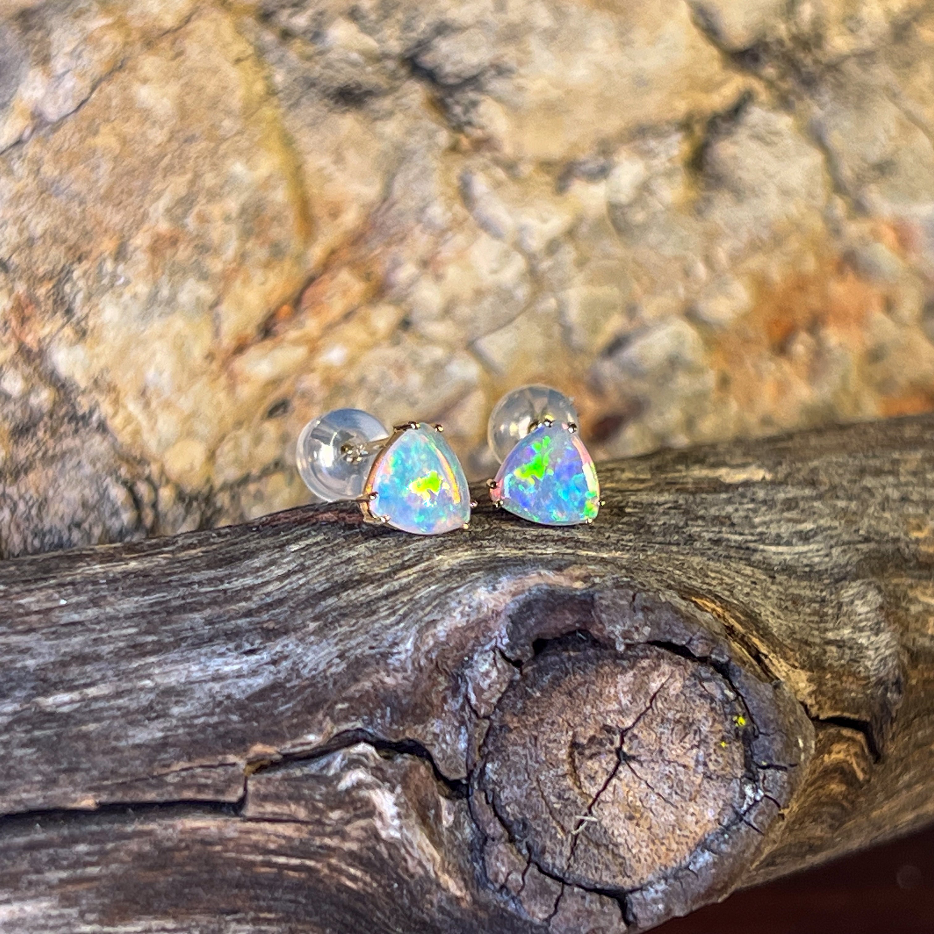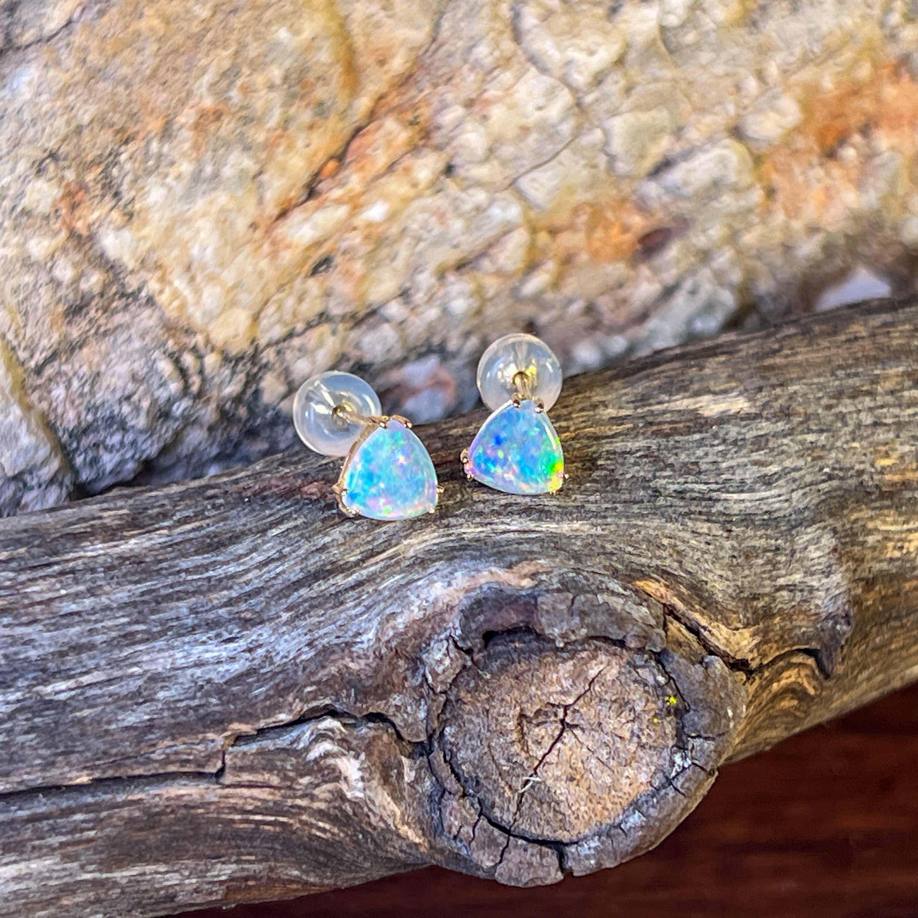 One pair of 14kt Yellow gold Opal Triangle cut shape claw studs