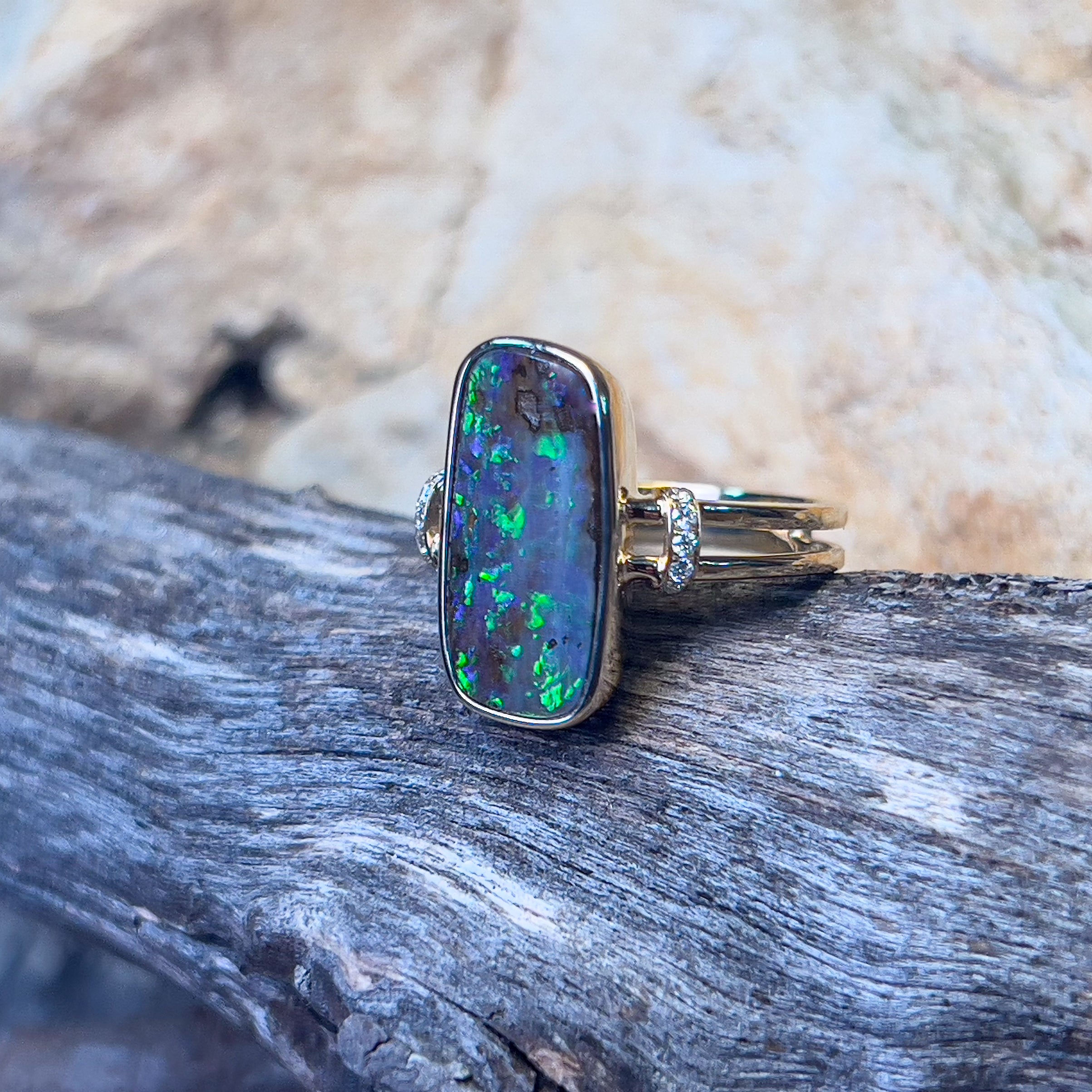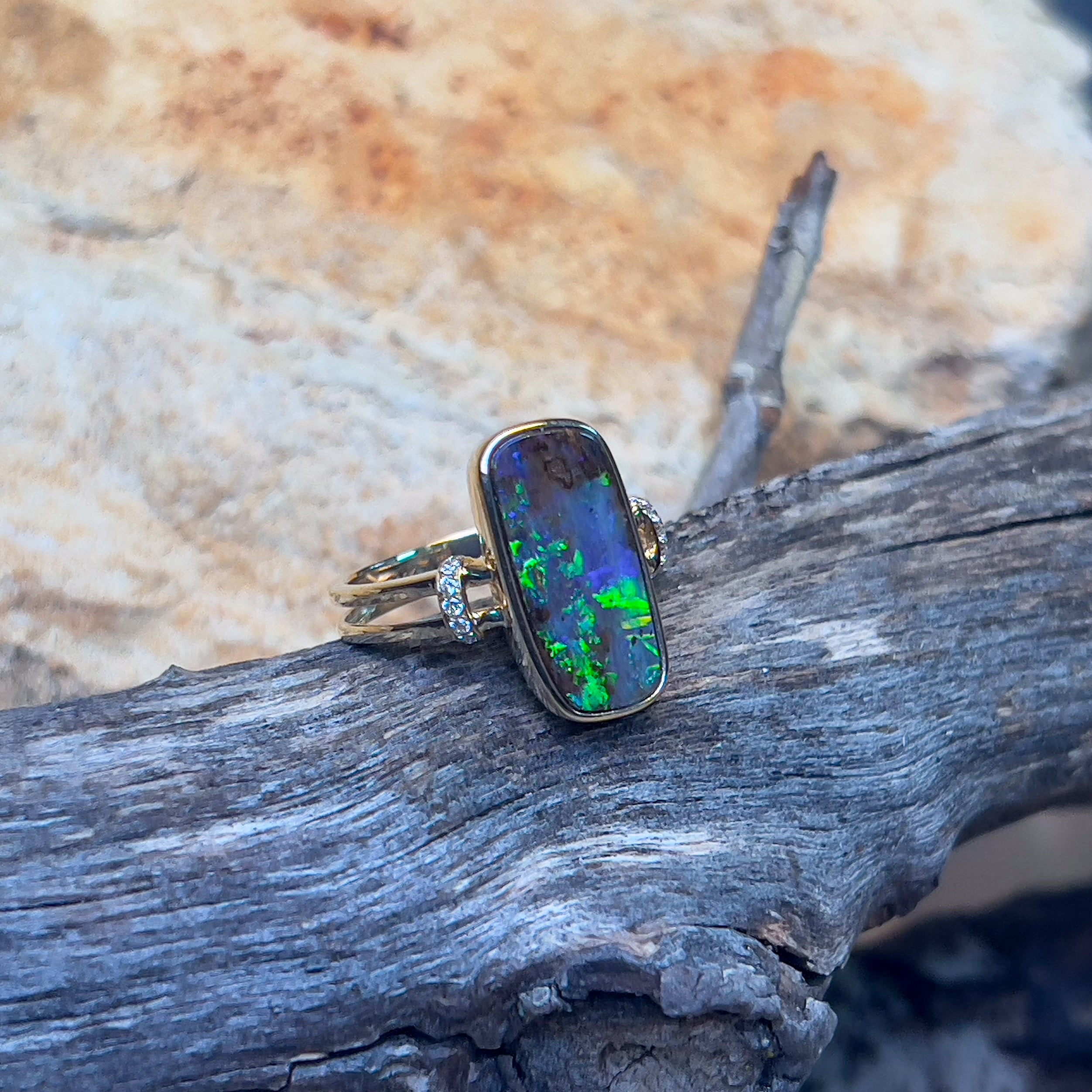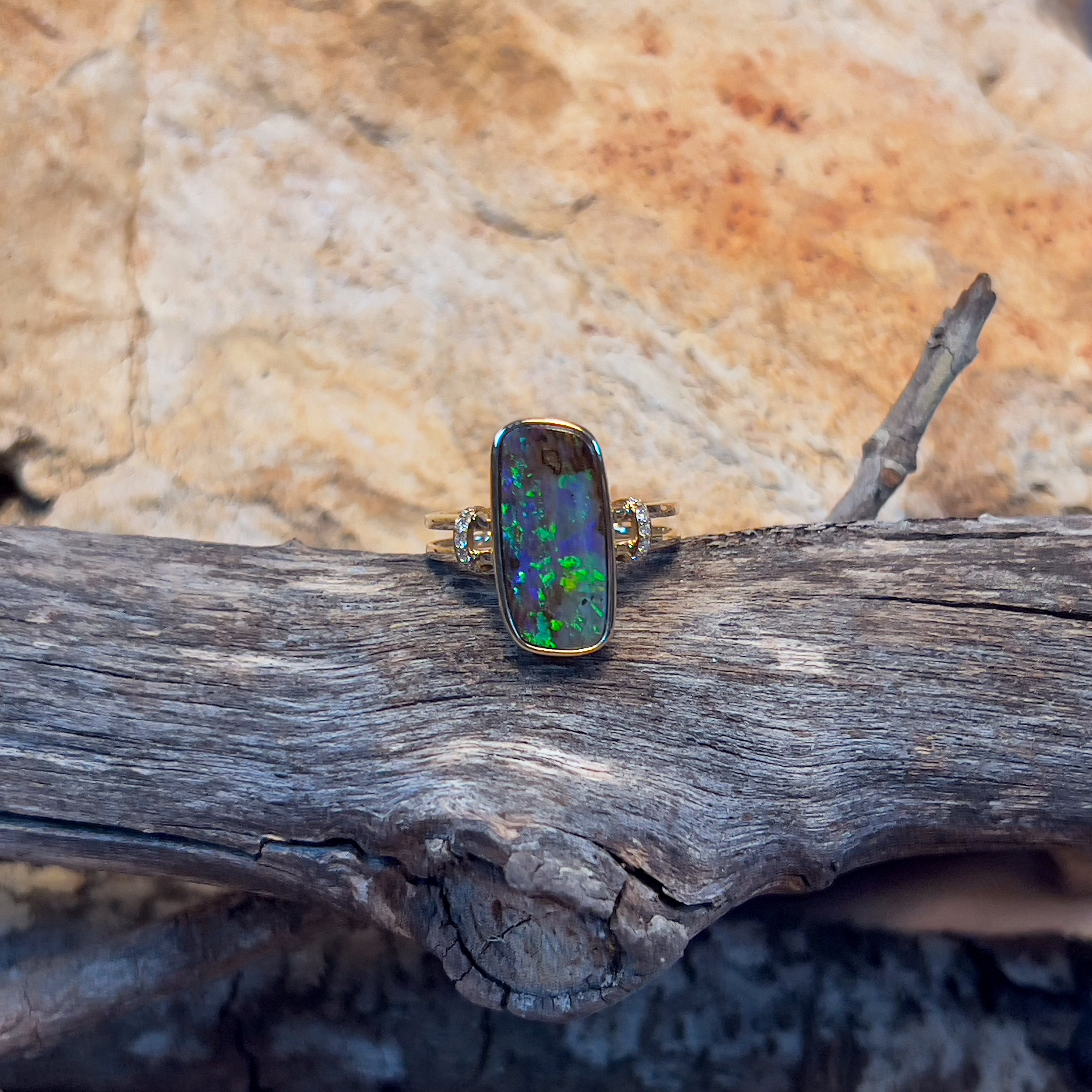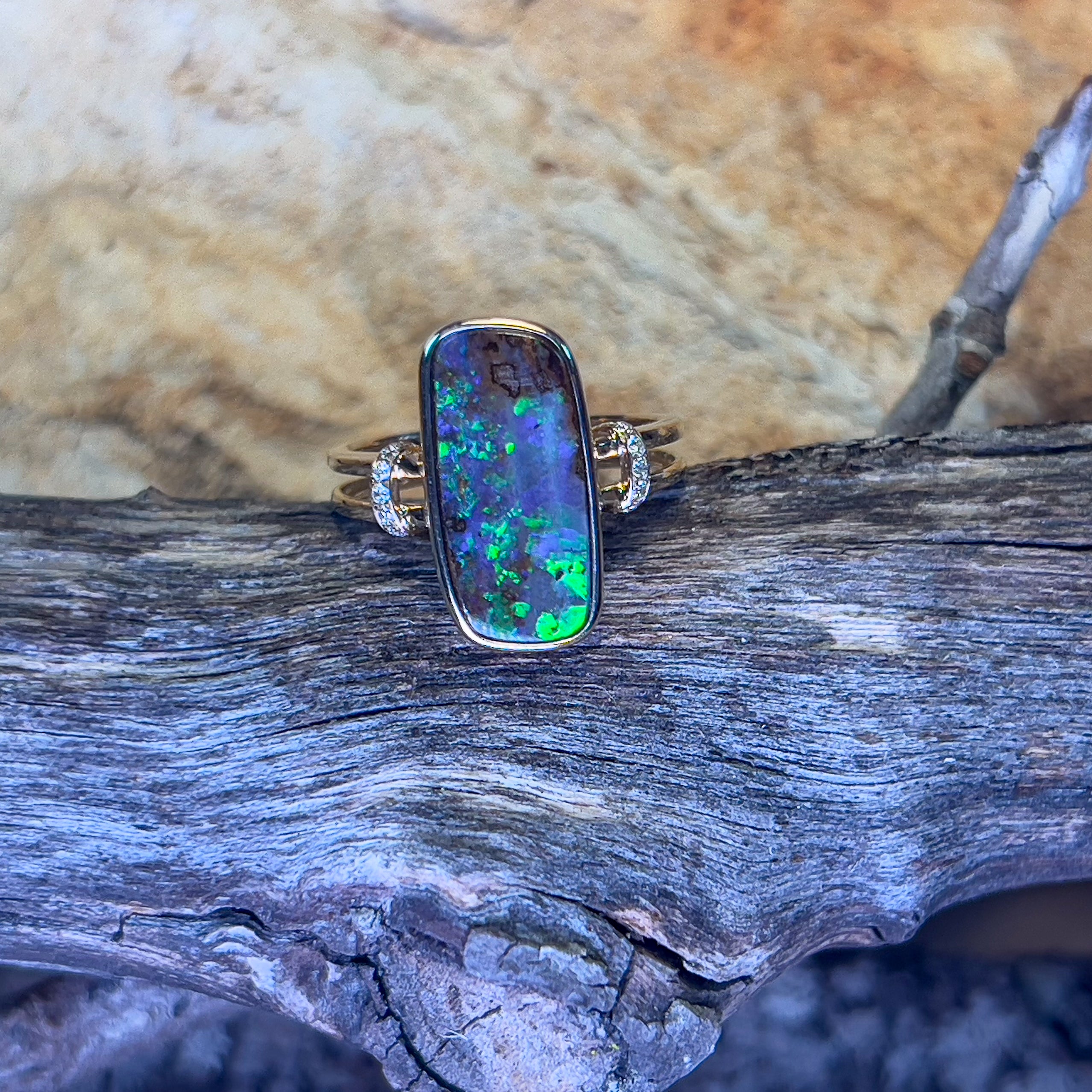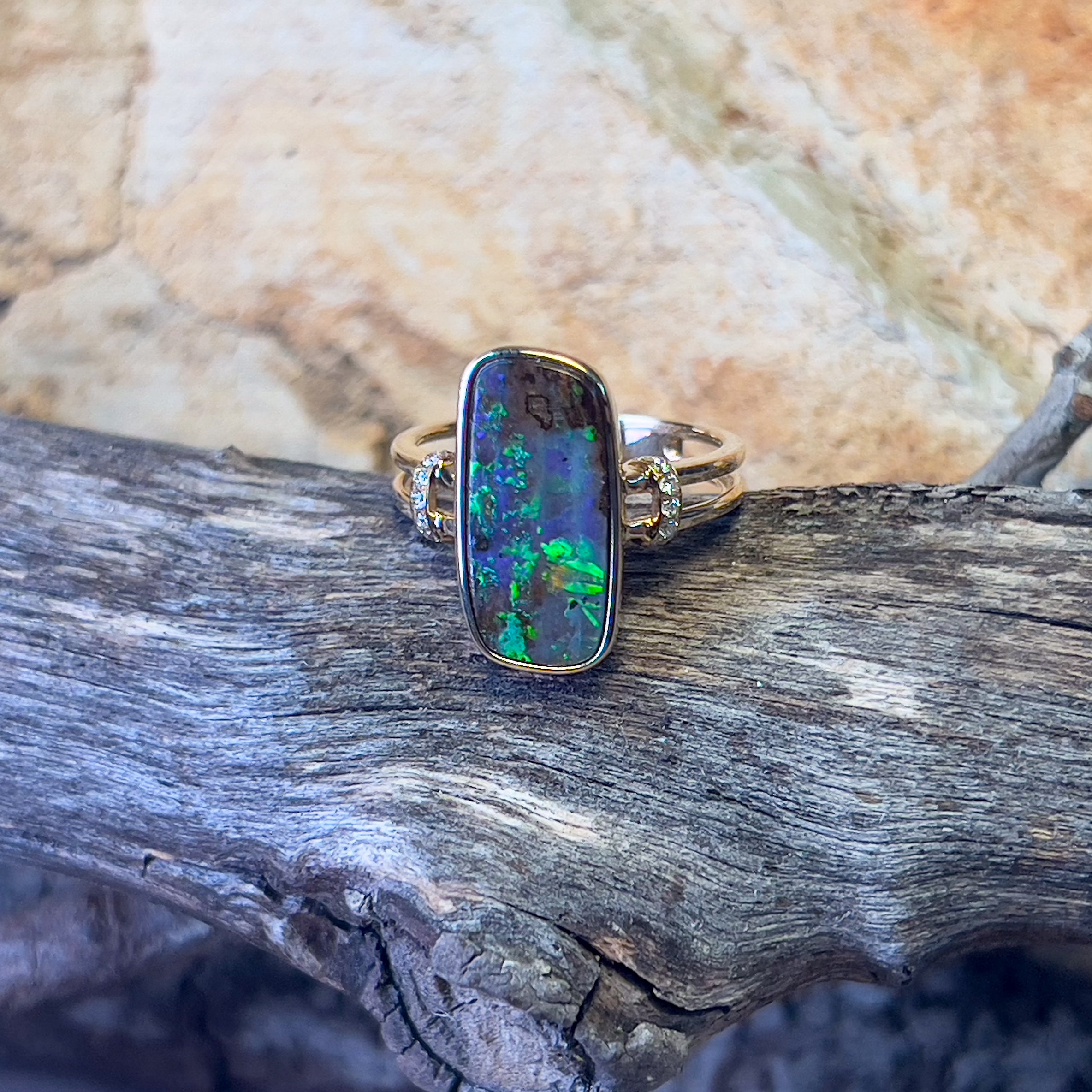 Indulge in luxury with our 14kt Yellow Gold split shank Boulder Opal 3.98ct and diamond ring. This exquisite piece features a rare boulder opal center stone set in rich yellow gold. Perfect for any occasion, this unique ring makes a beautiful gift for someone special.