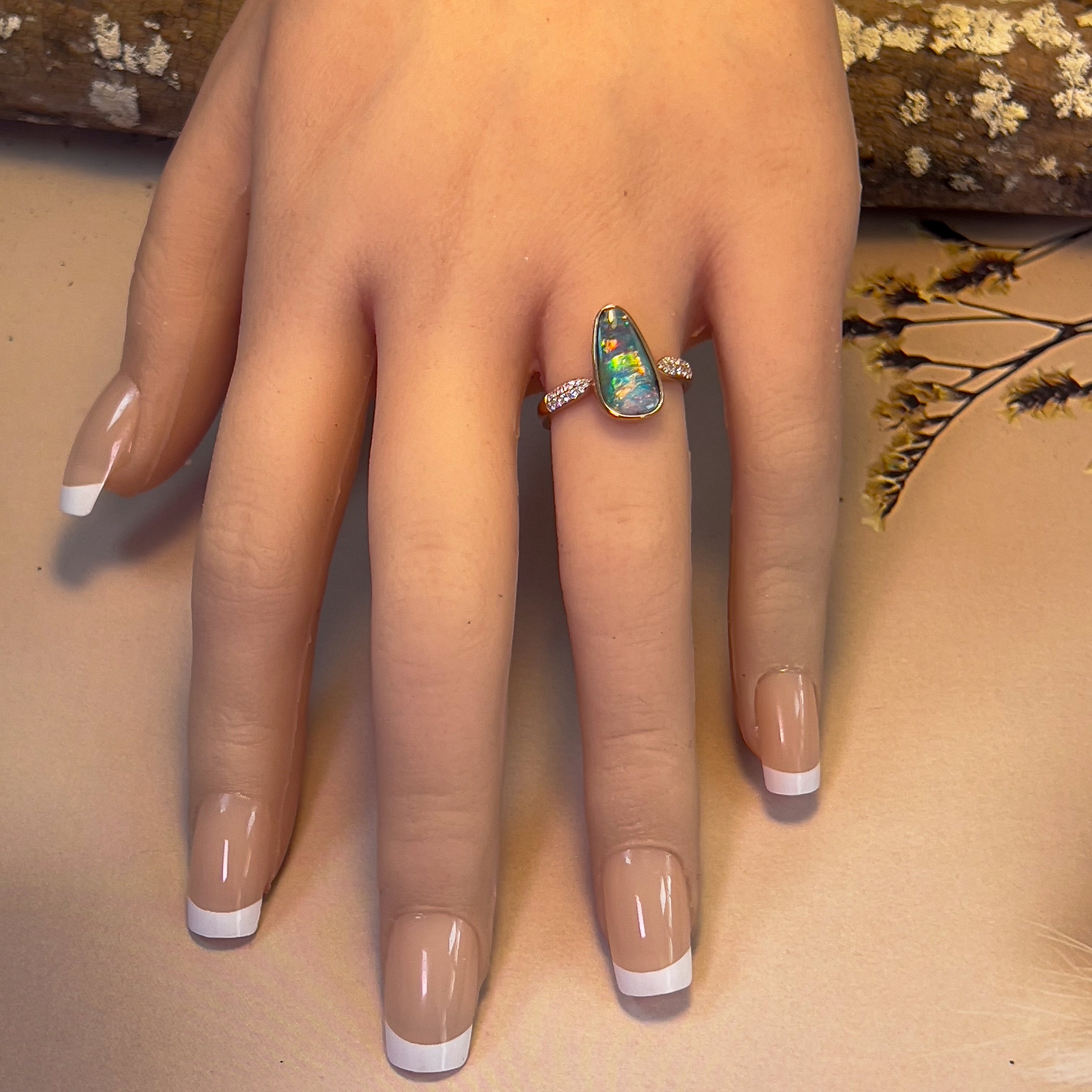 14kt Yellow Gold split shank Boulder Opal 3.98ct and diamond ring