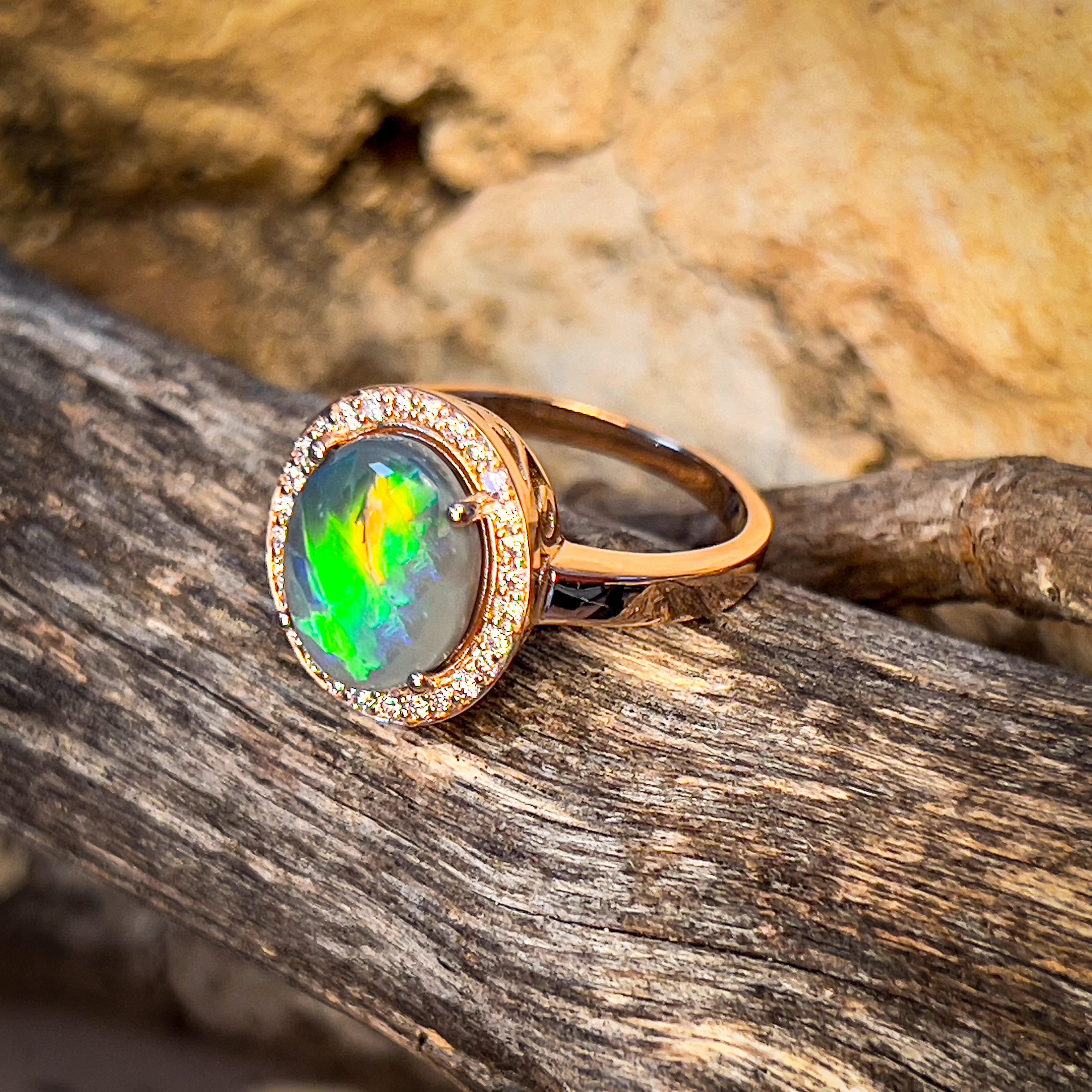 18kt Rose Gold Black Opal 2.13ct Light pink diamonds 0.28ct halo ring