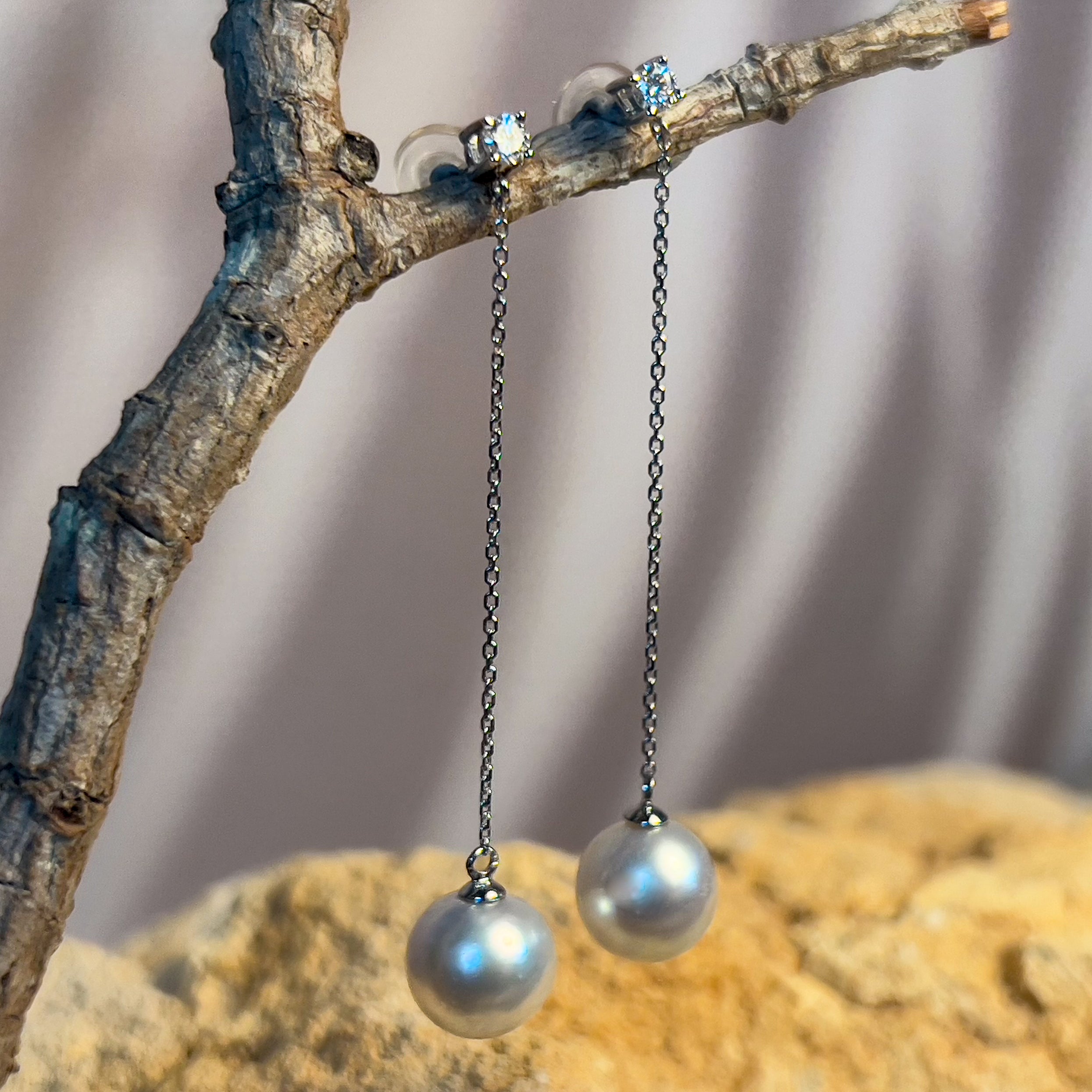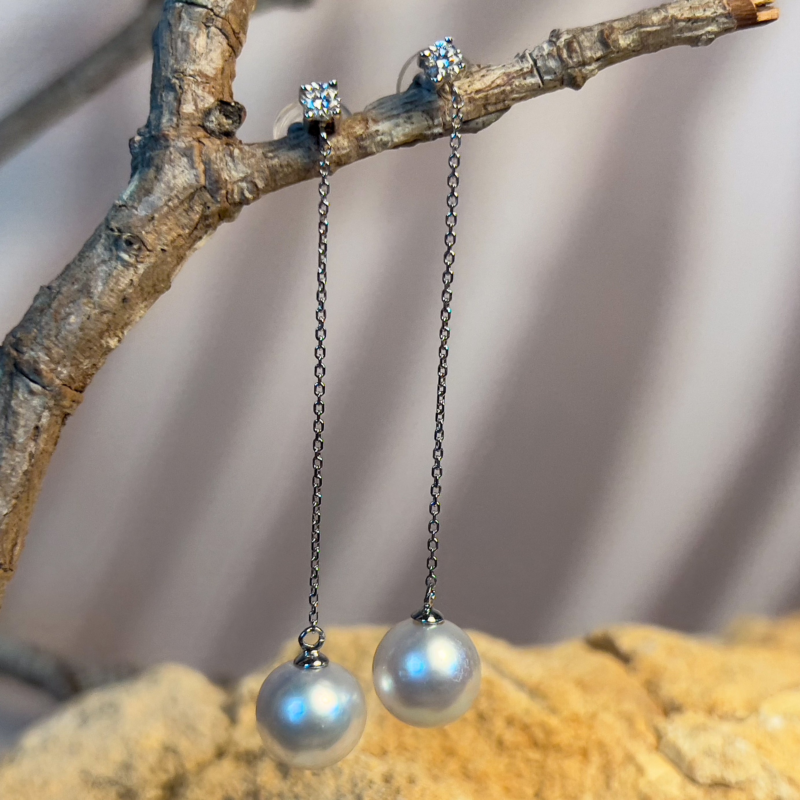 Indulge in ultimate luxury with our 18kt White Gold dangling earrings featuring 8.5-9mm South Sea pearls and dazzling diamonds. Allow the elegant white pearls to drop and sway with every step, making a statement of sophistication and exclusivity. Elevate any outfit to new heights with these exquisite pearl earrings.
