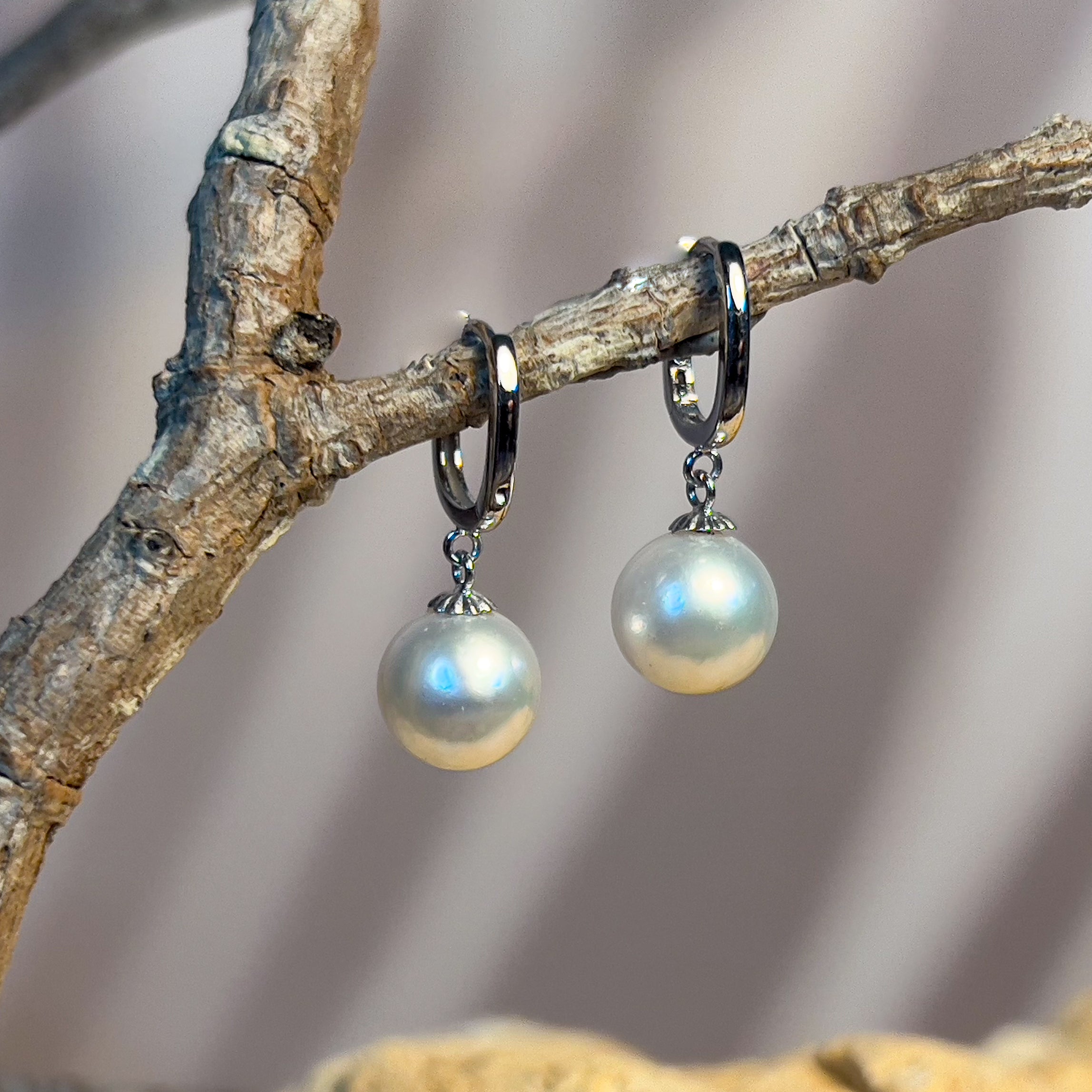 18kt White Gold dangling U-shape huggies with 8-8.5mm South Sea Pearls earrings