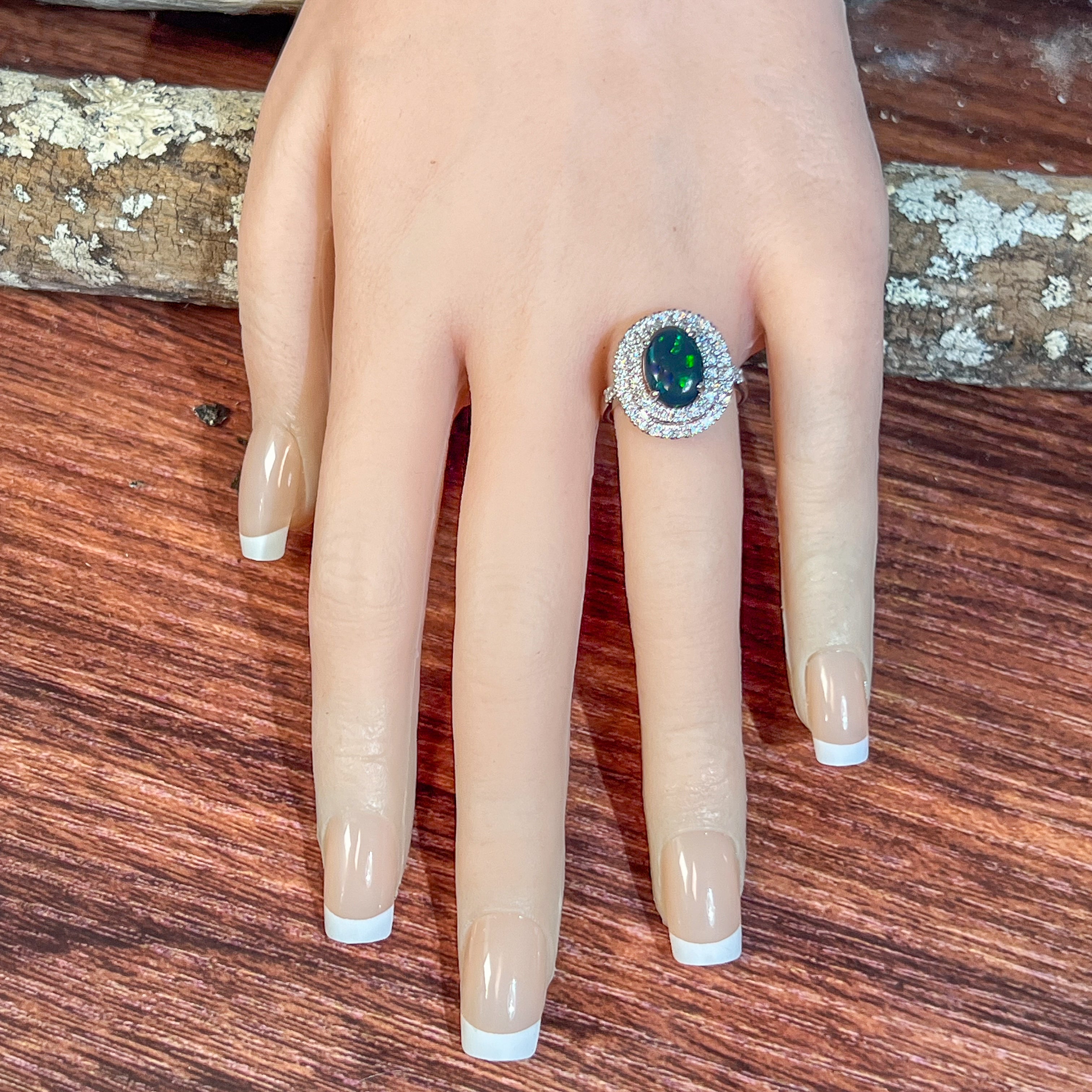 18kt White Gold double halo Black Opal and diamond ring