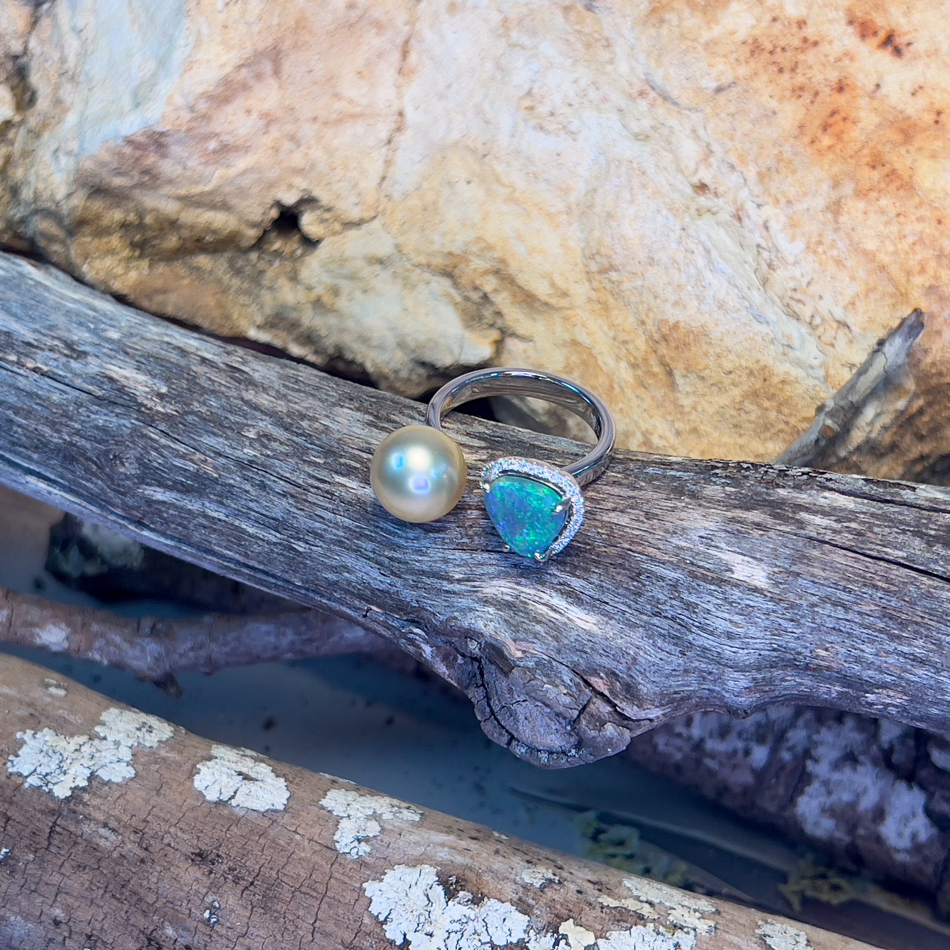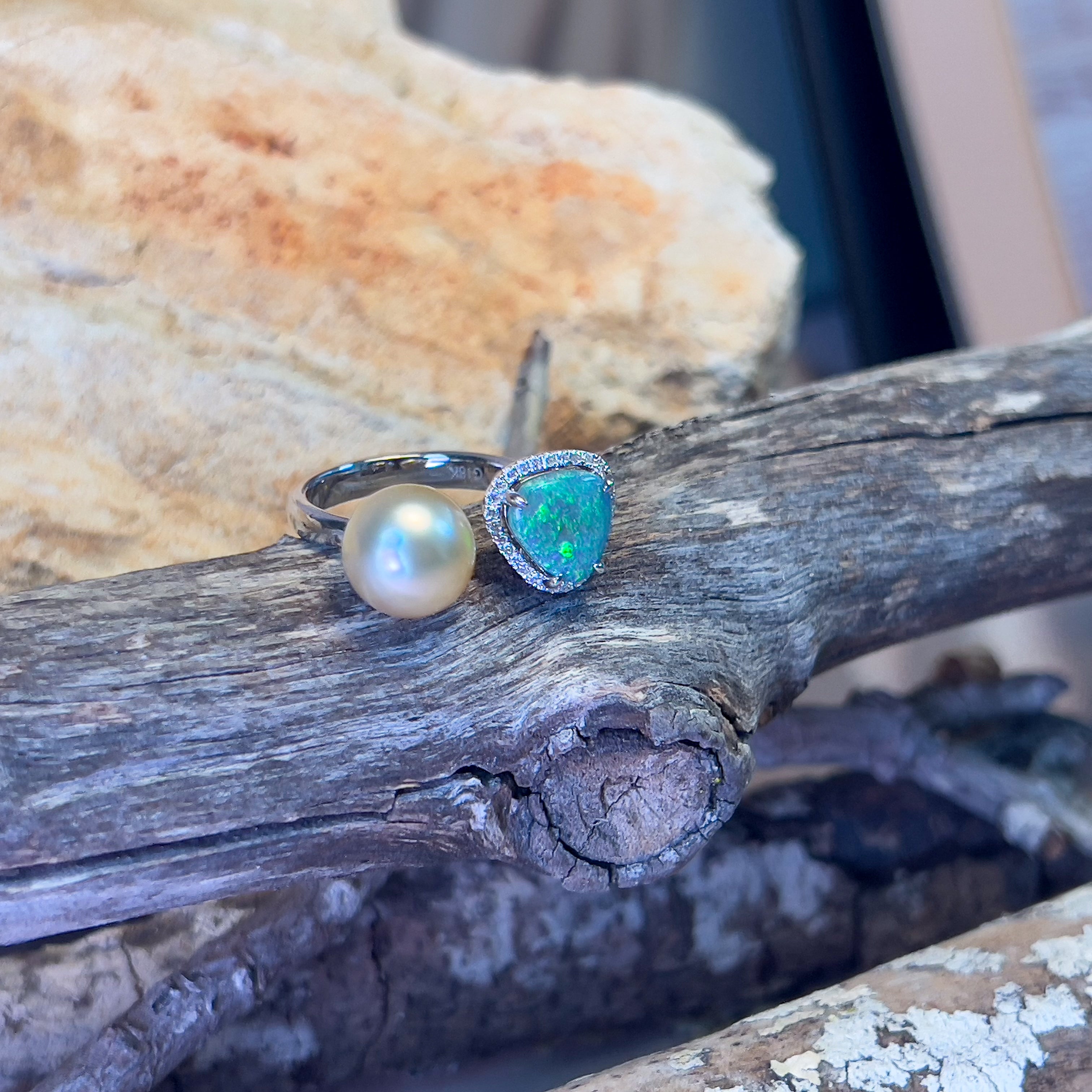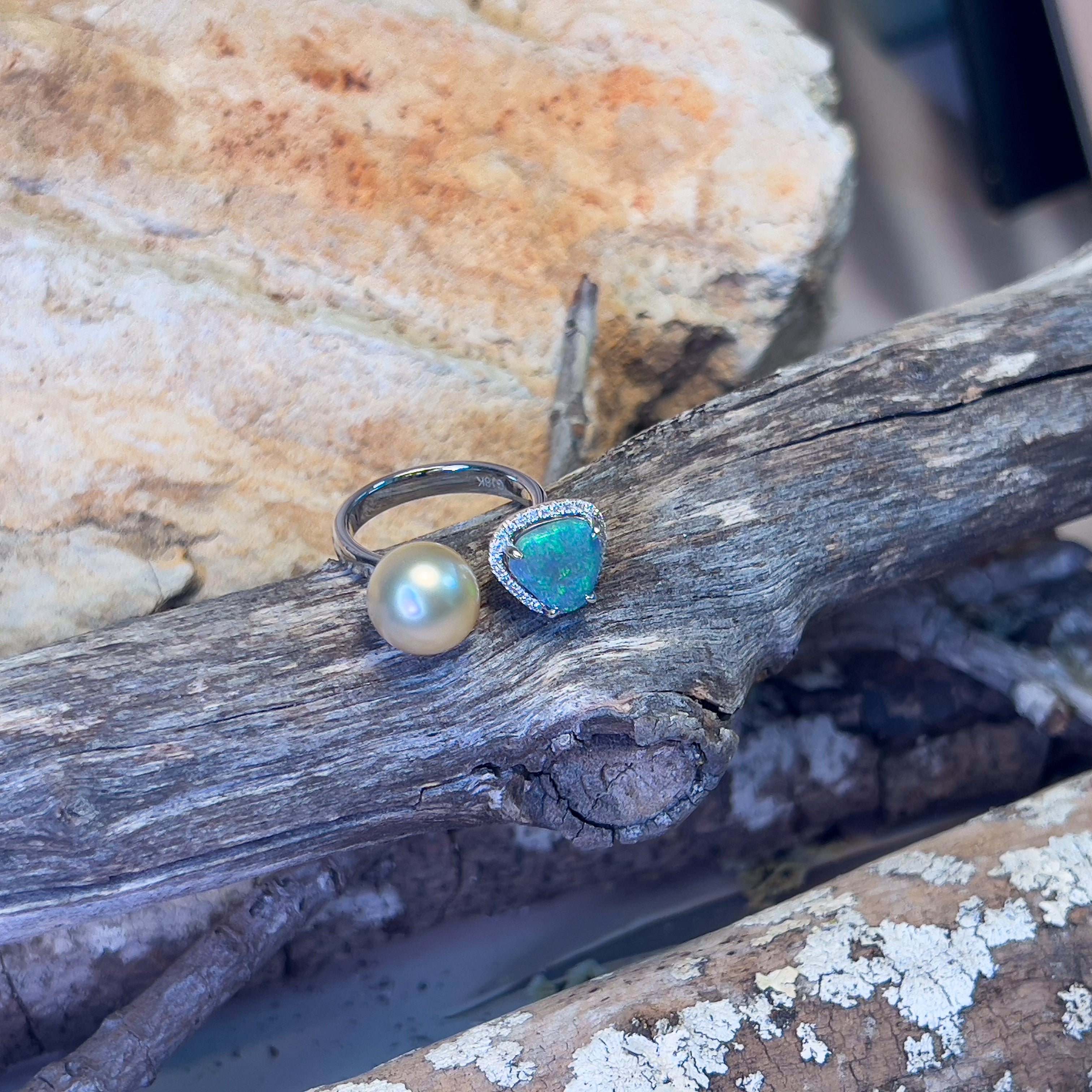 Indulge in luxury with our 18kt white gold ring featuring a stunning opal centerpiece, surrounded by sparkling diamonds. The open design adds a modern touch, while the golden pearl adds a classic touch. Elevate any outfit with this statement jewelry piece.