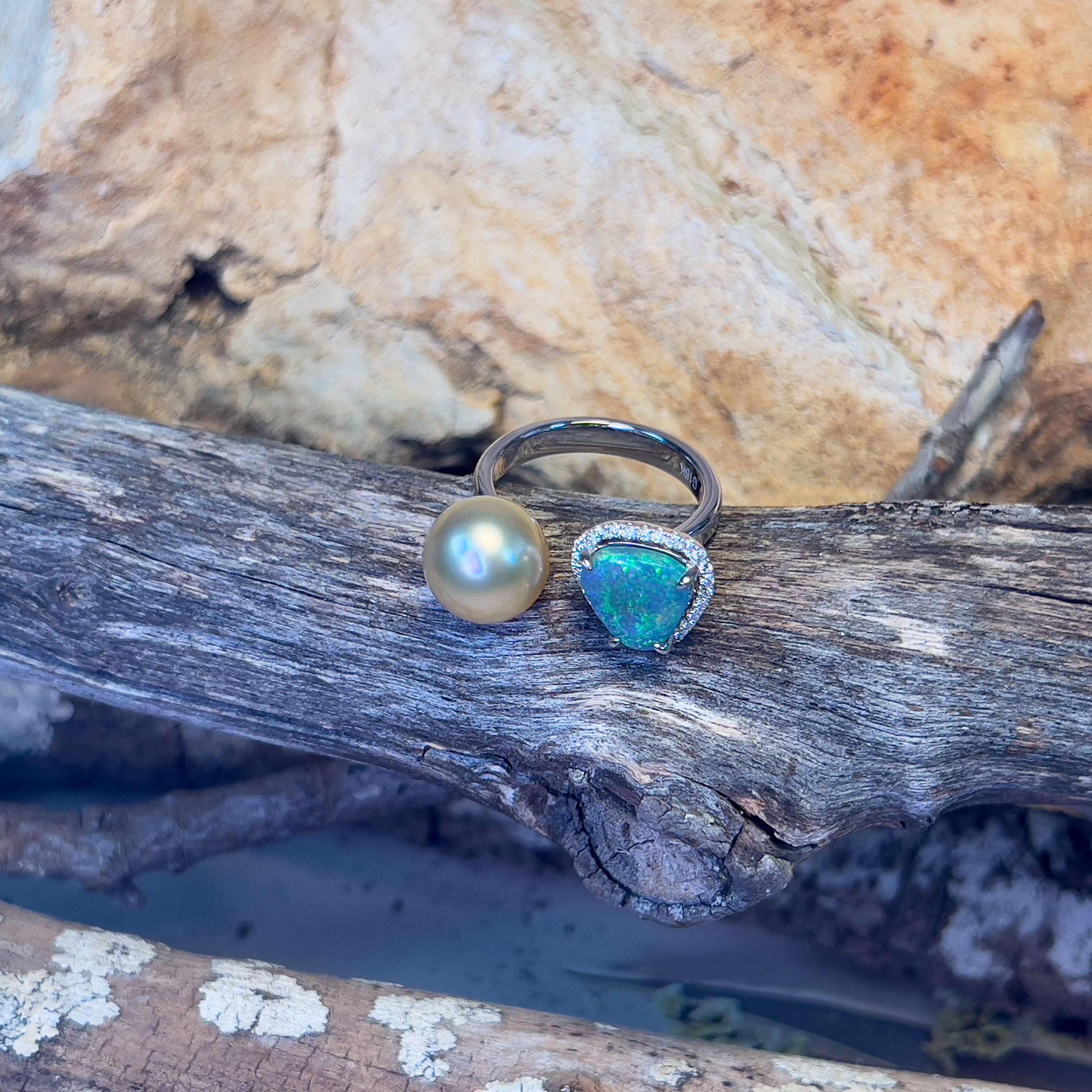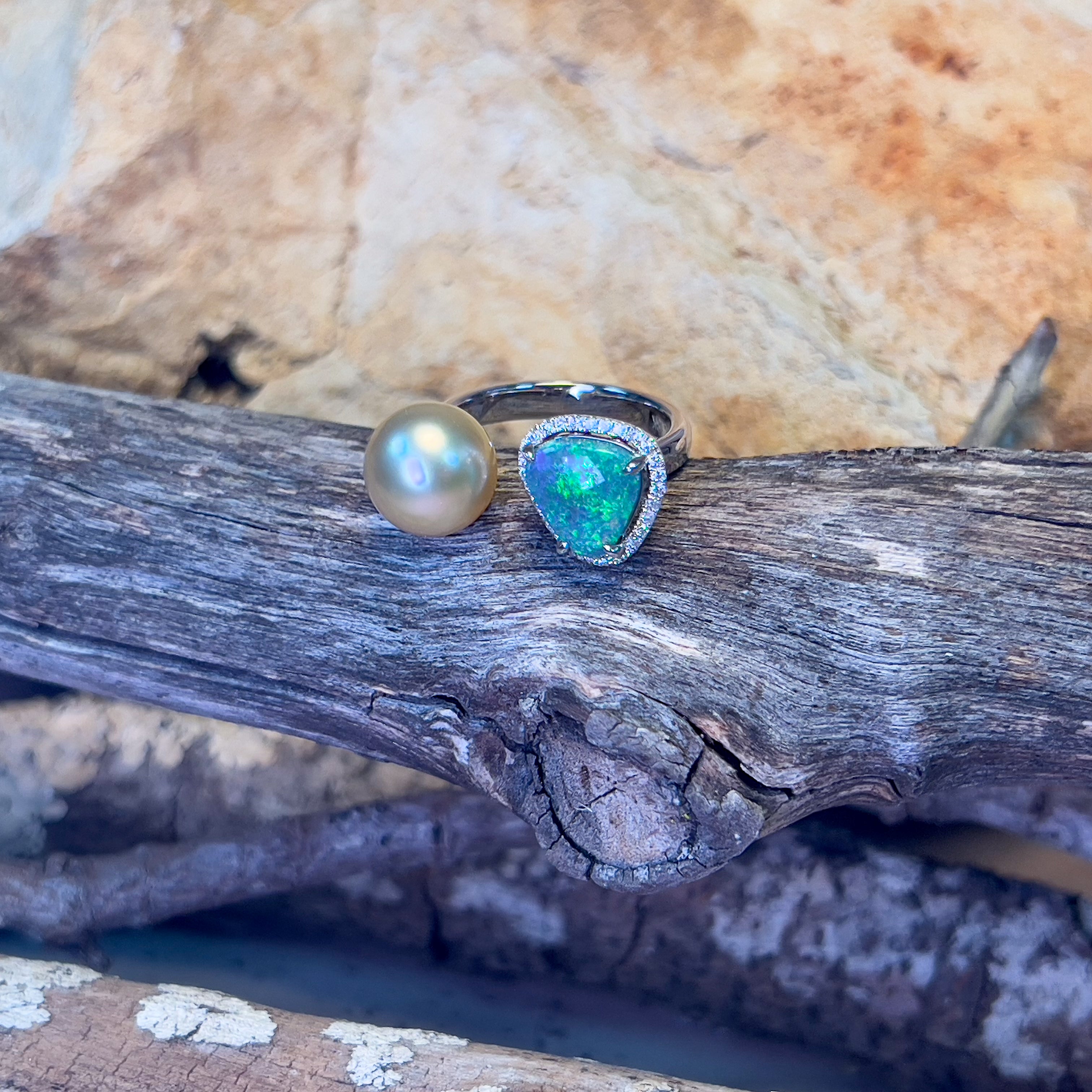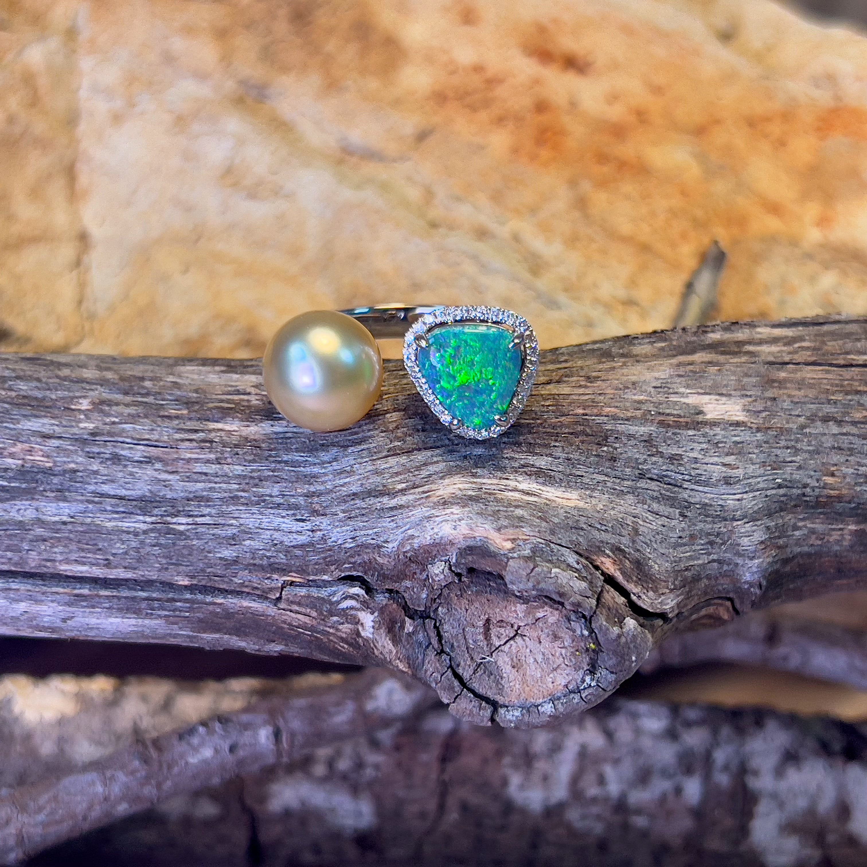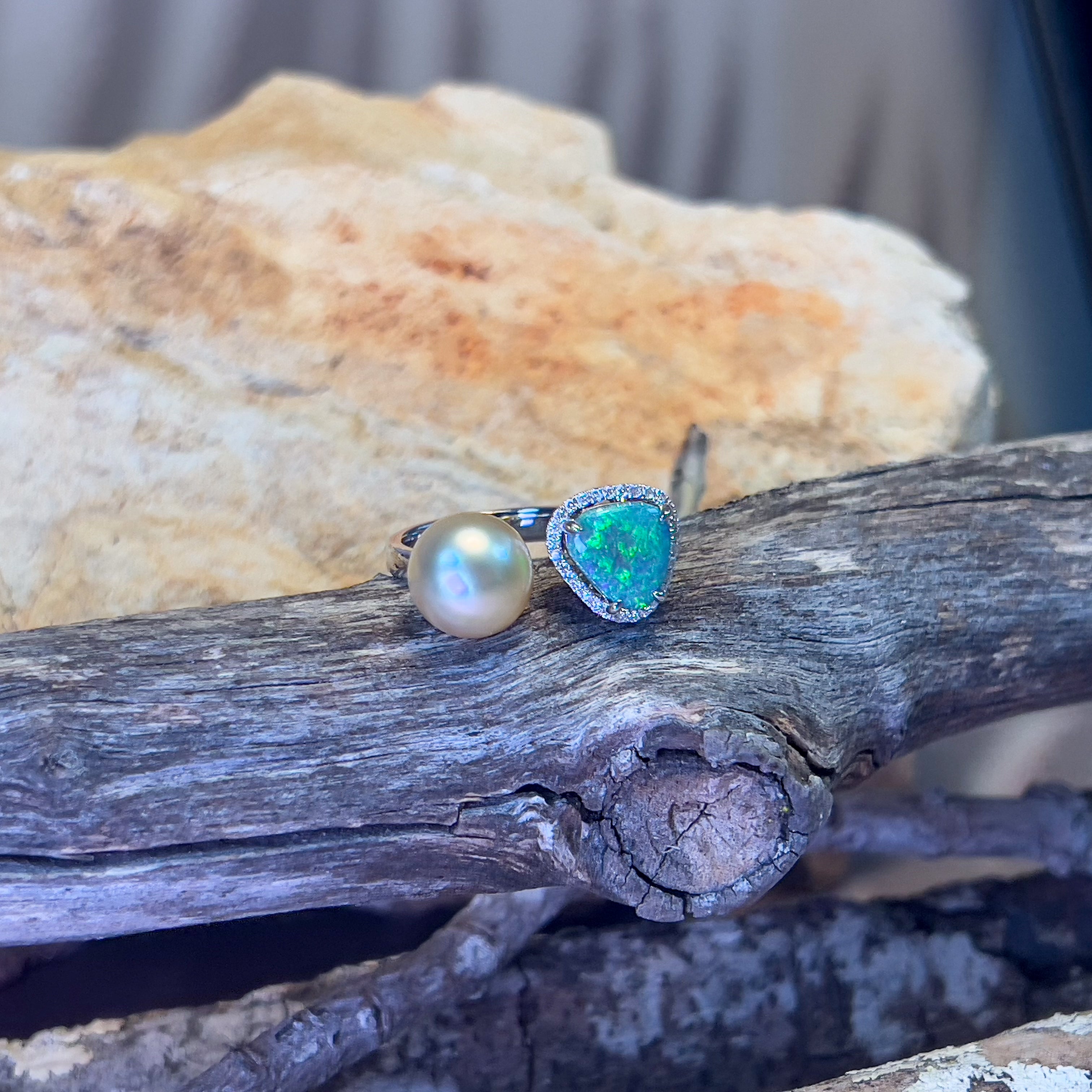 Indulge in luxury with our 18kt white gold ring featuring a stunning opal centerpiece, surrounded by sparkling diamonds. The open design adds a modern touch, while the golden pearl adds a classic touch. Elevate any outfit with this statement jewelry piece.