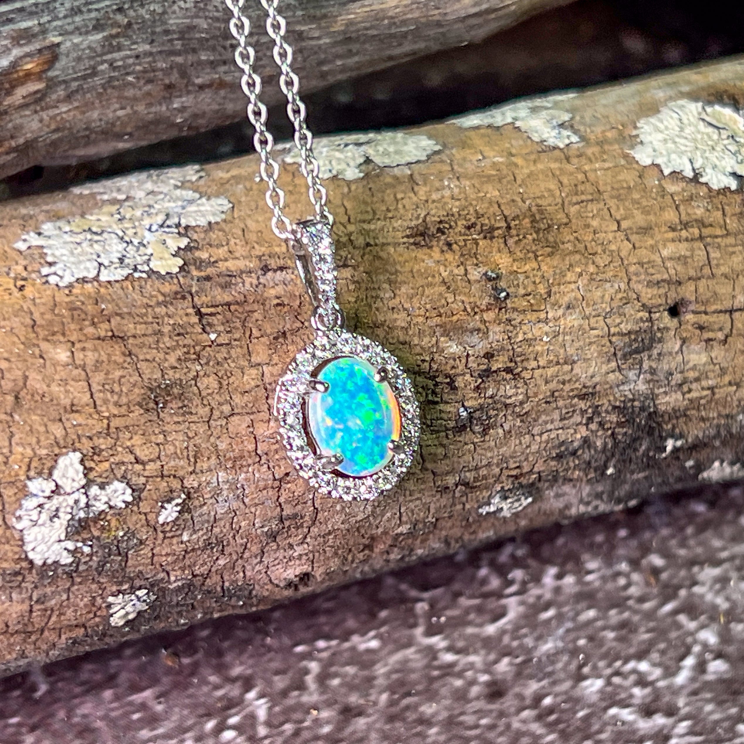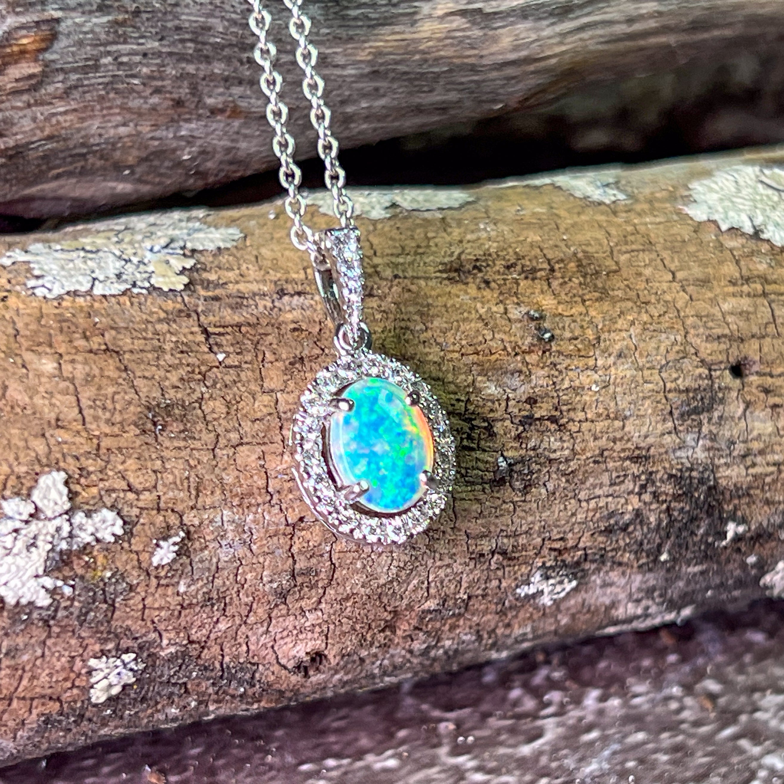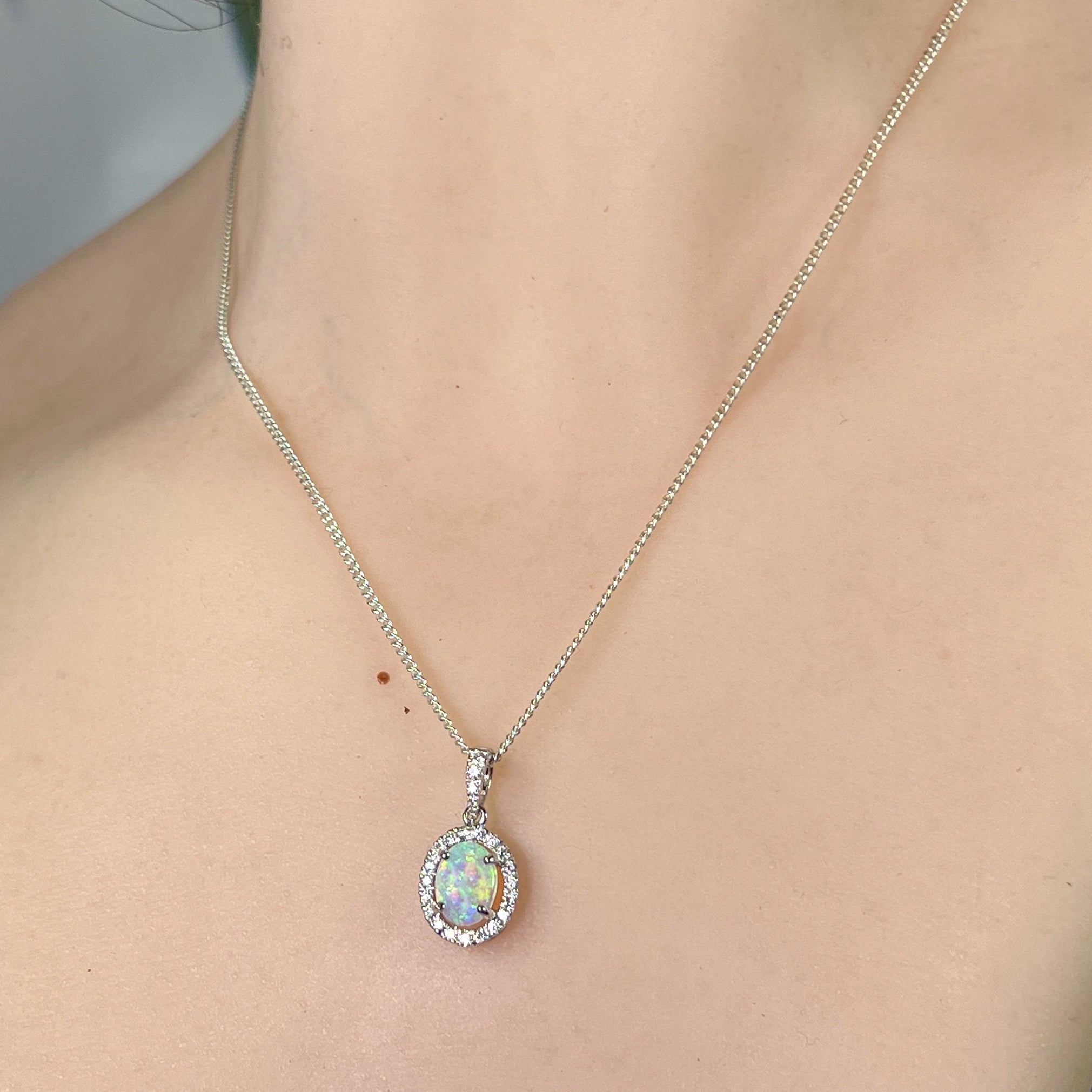 18kt White Gold Oval Opal 8x6mm Halo design pendant