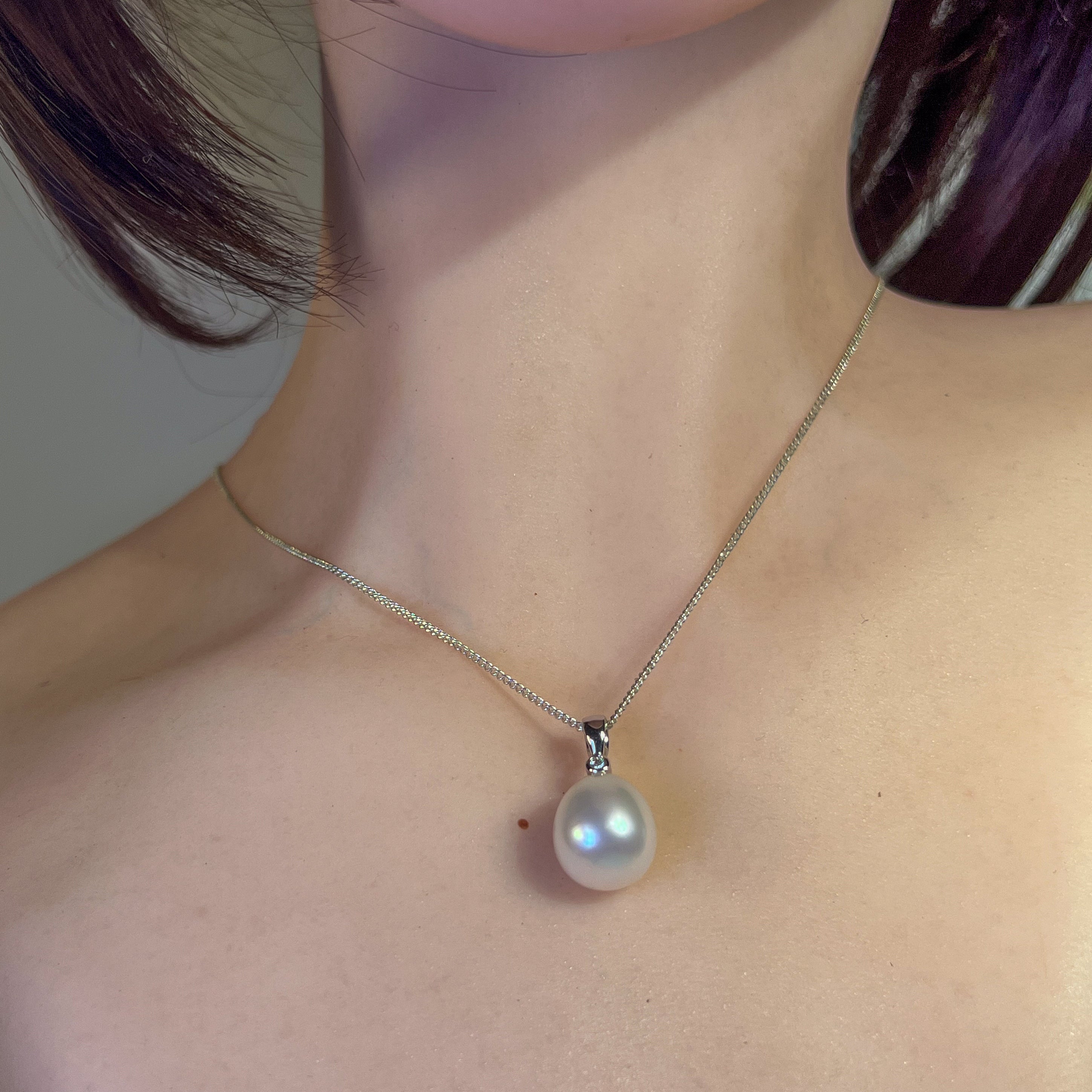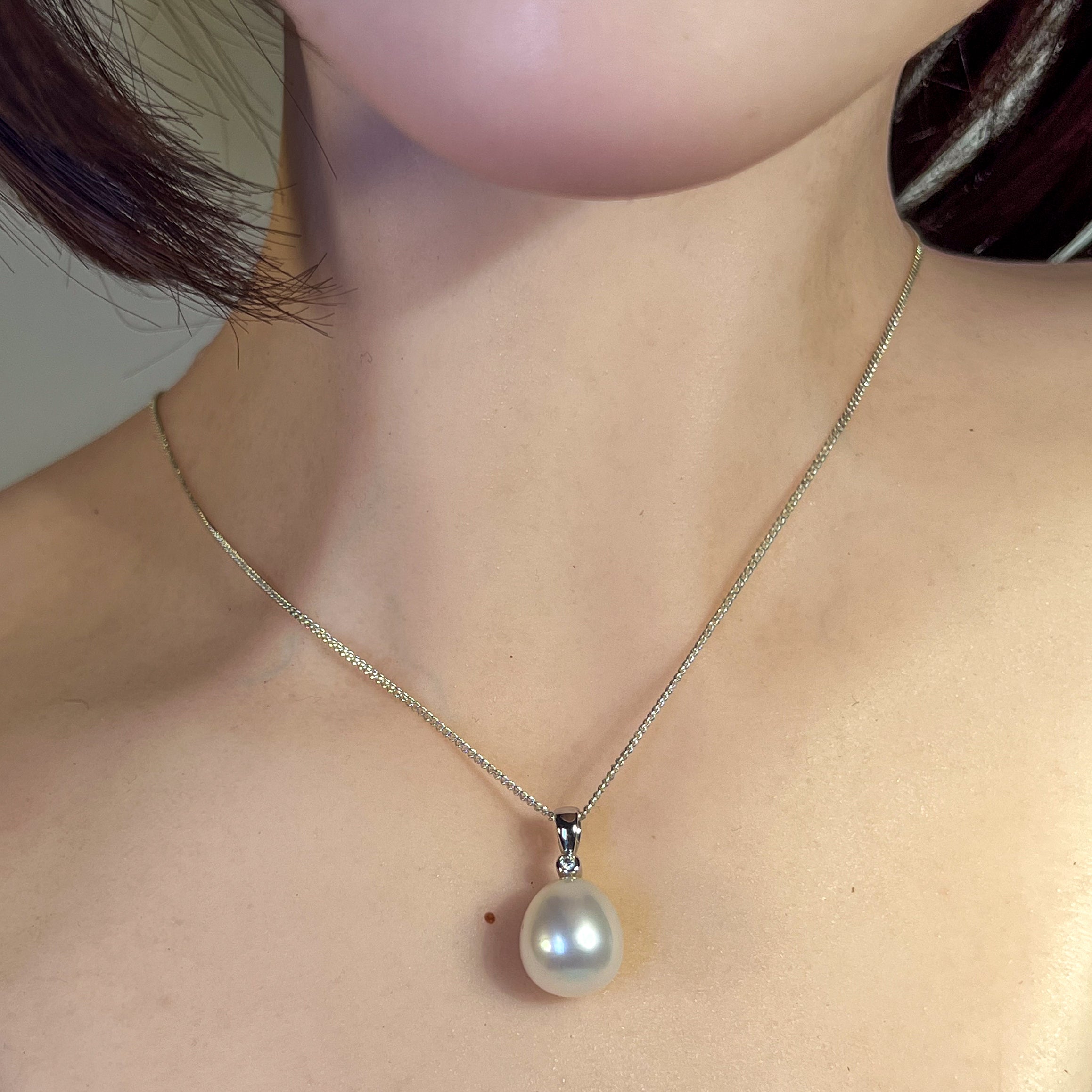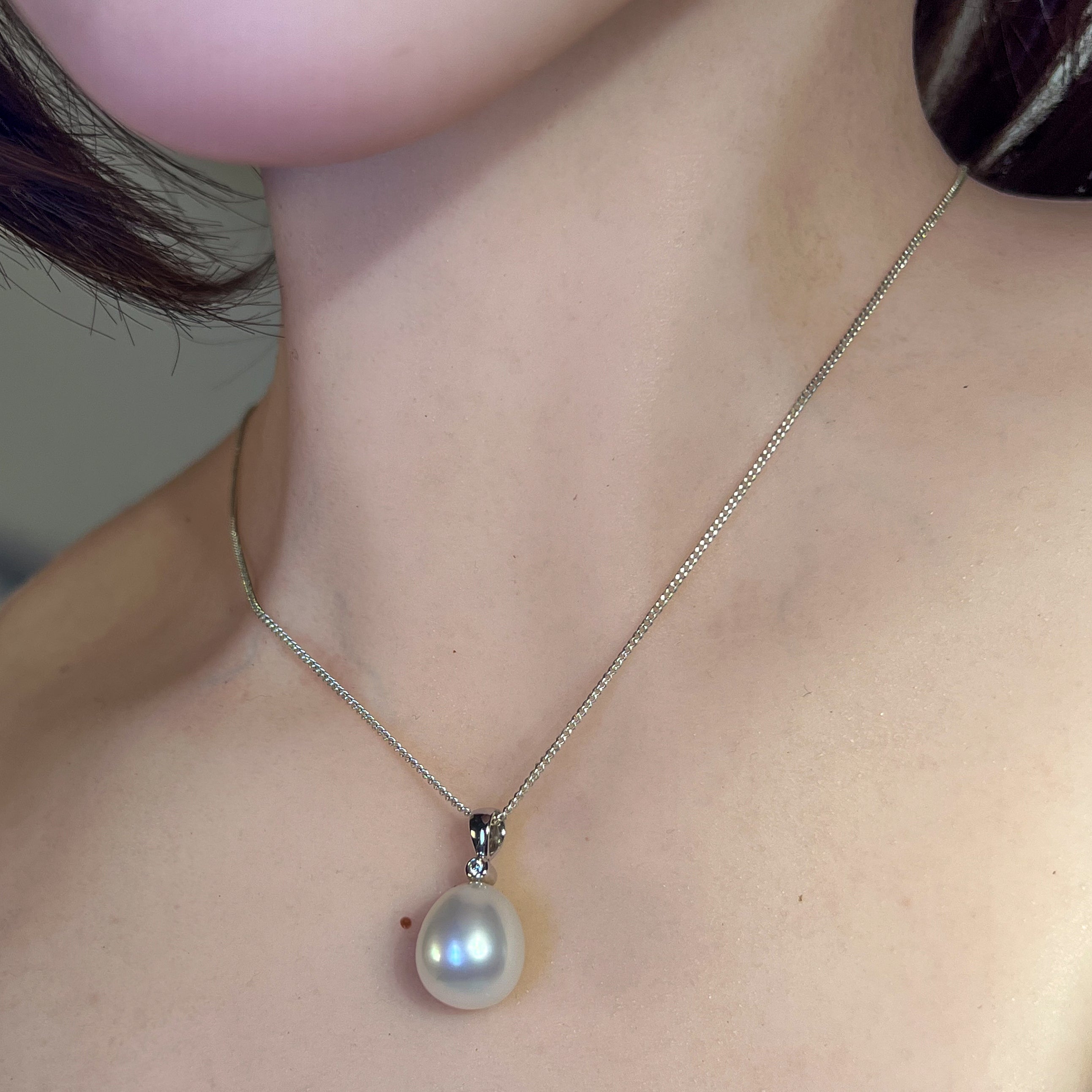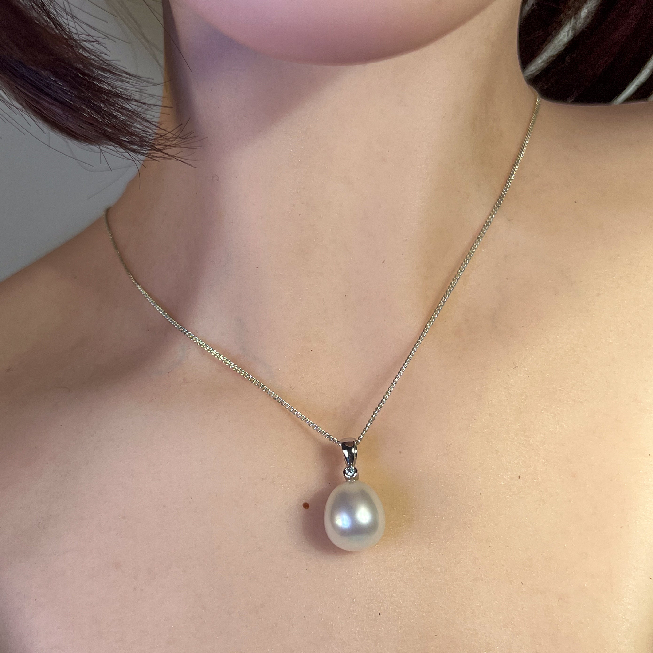 Sparkle and shine with this 18kt white gold pendant featuring a stunning 12.5mm South Sea pearl. The large, off round oval shape adds a unique touch, while the dazzling diamonds add a touch of luxury. Elevate any outfit with this elegant piece.