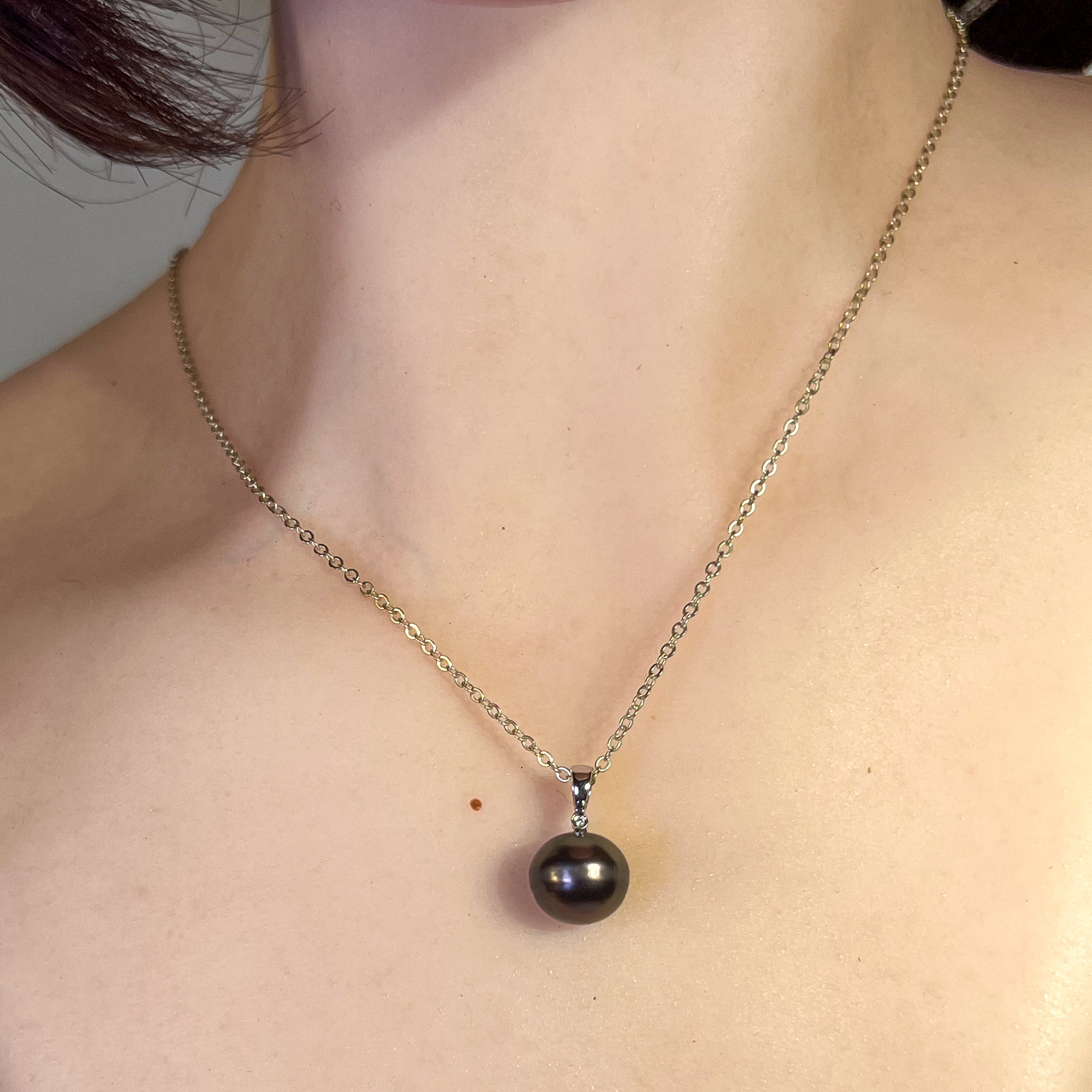 18kt White Gold Tahitian Black Pearl 11-11.5mm and diamond pendant