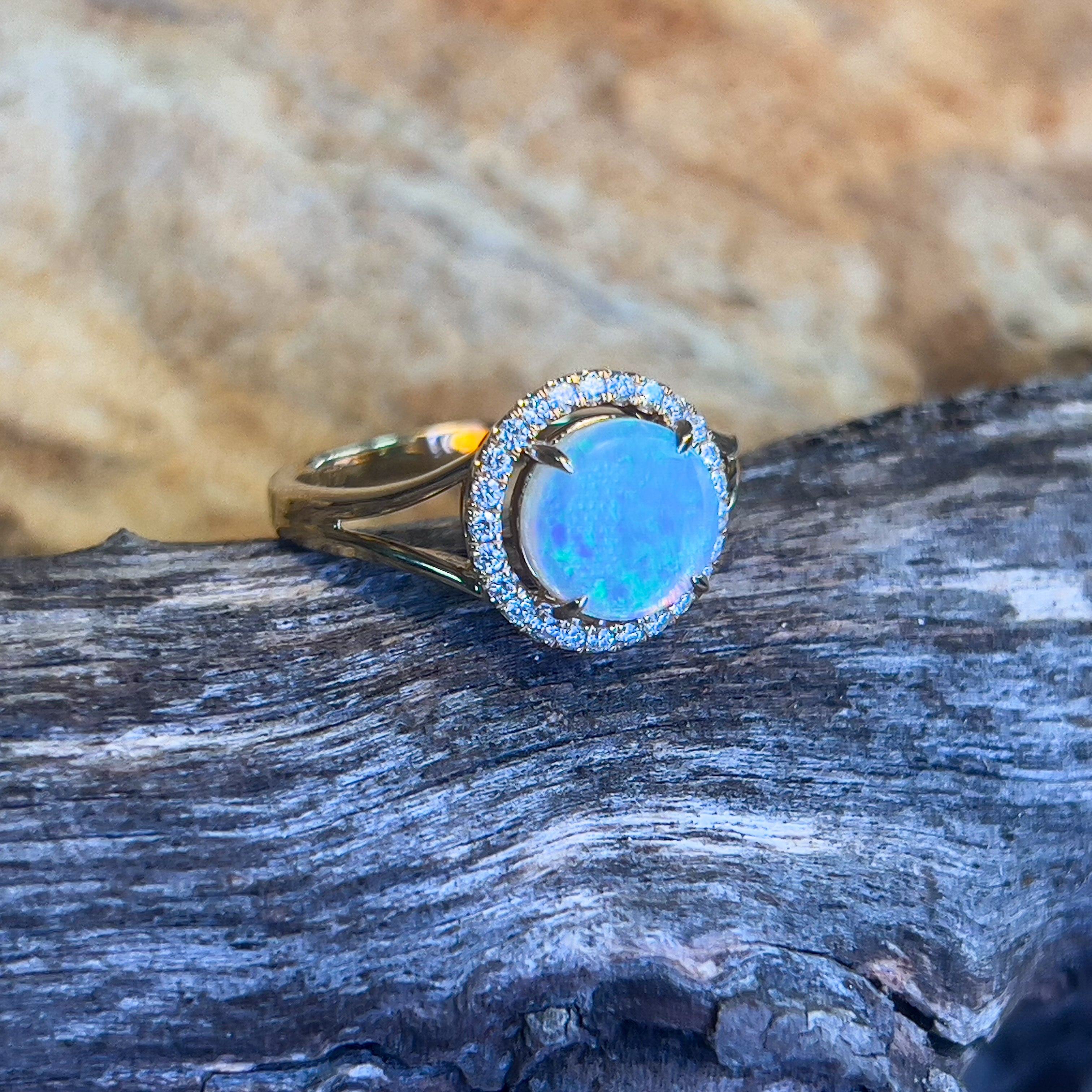 Sparkle with this playful 18kt Yellow Gold Opal engagement ring! Featuring a stunning 1.09ct Opal stone surrounded by a diamond cluster halo design, this ring adds a unique and fun twist to traditional engagement rings. Perfect for the quirky and unconventional bride-to-be!