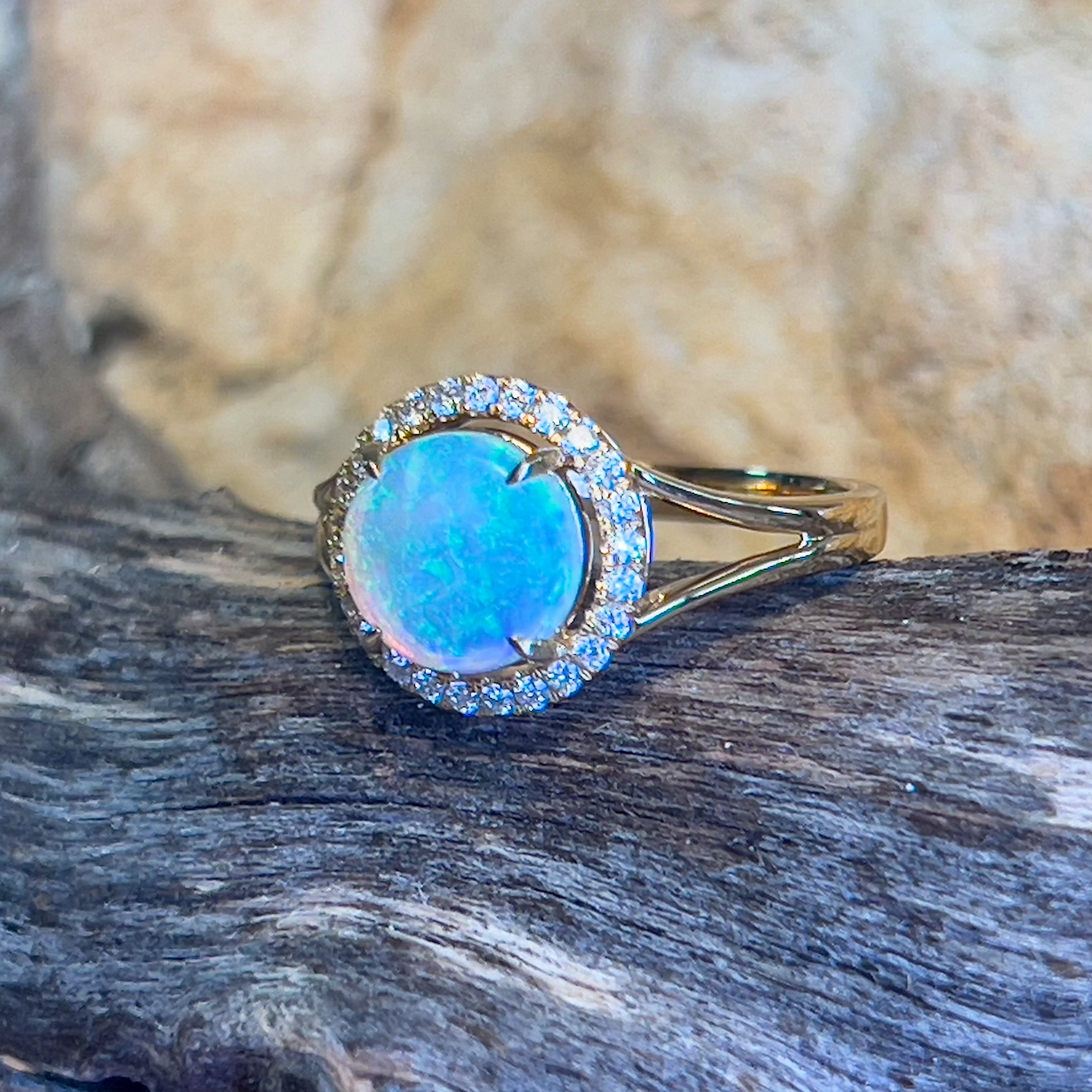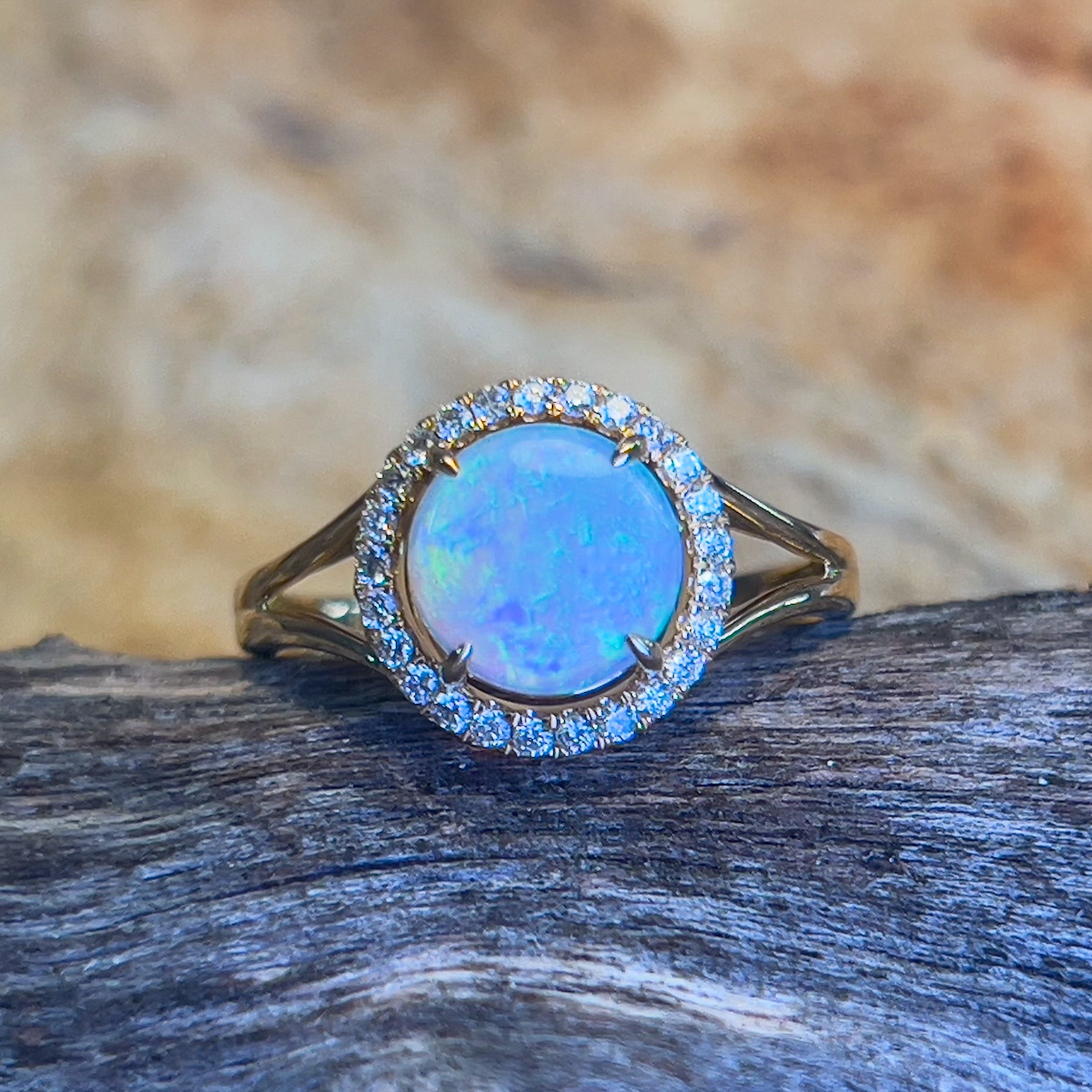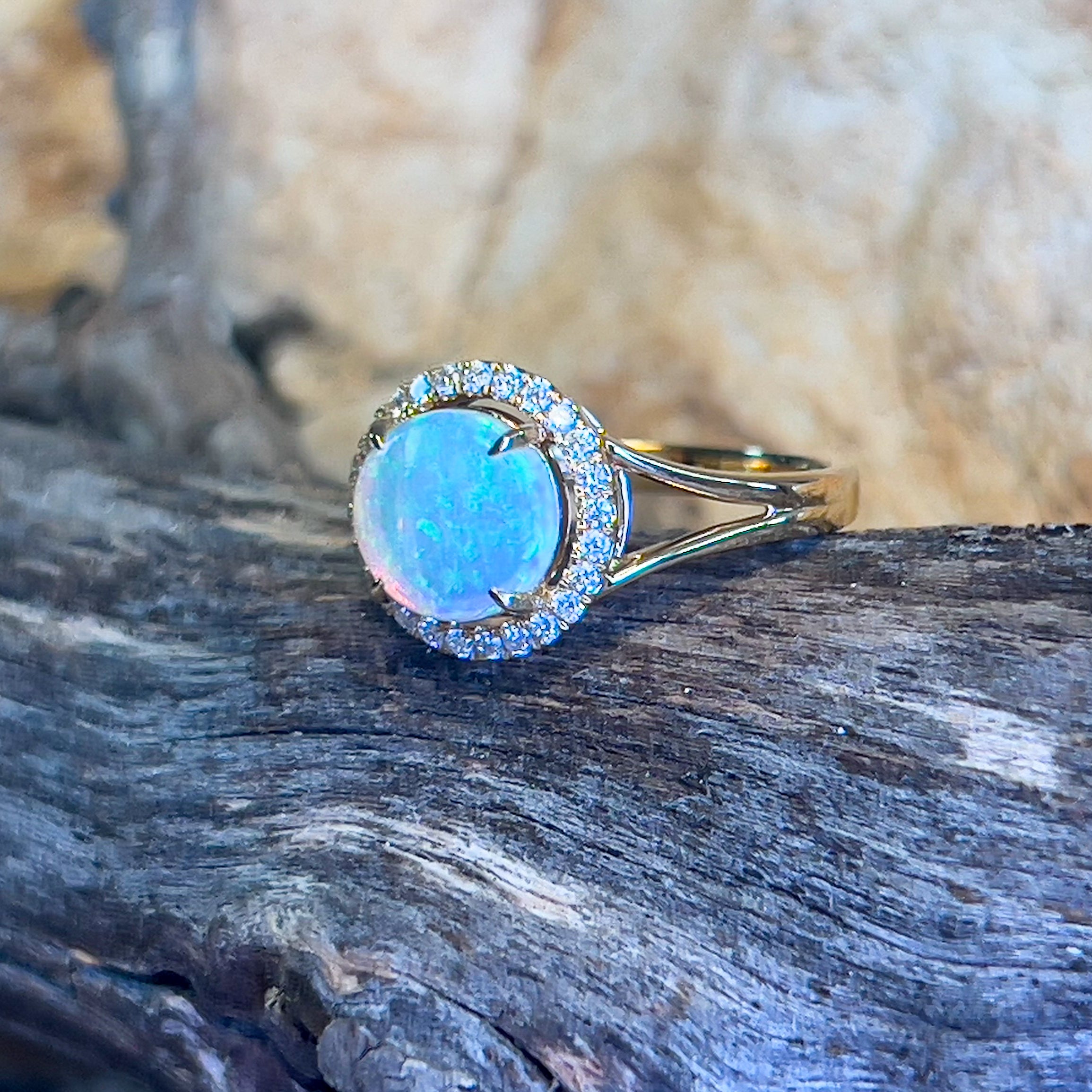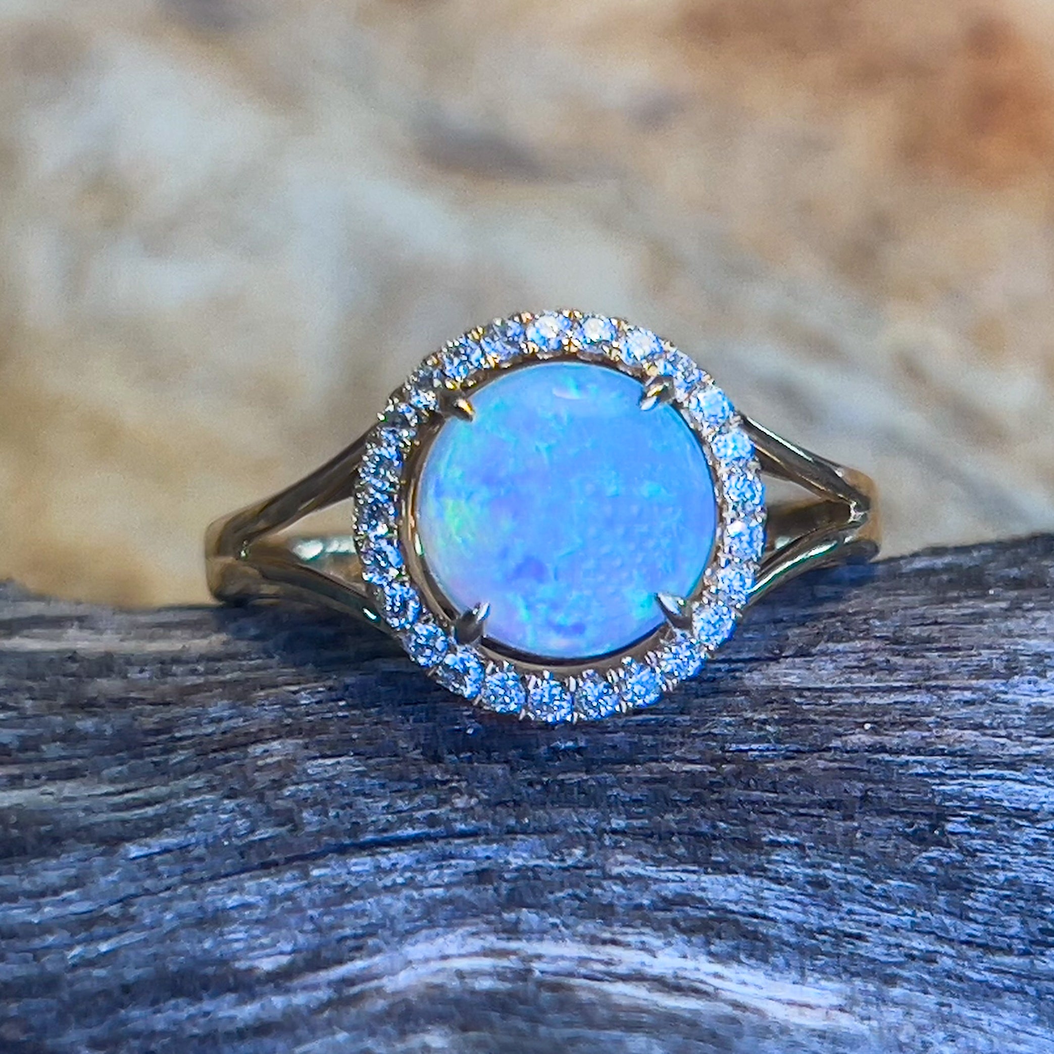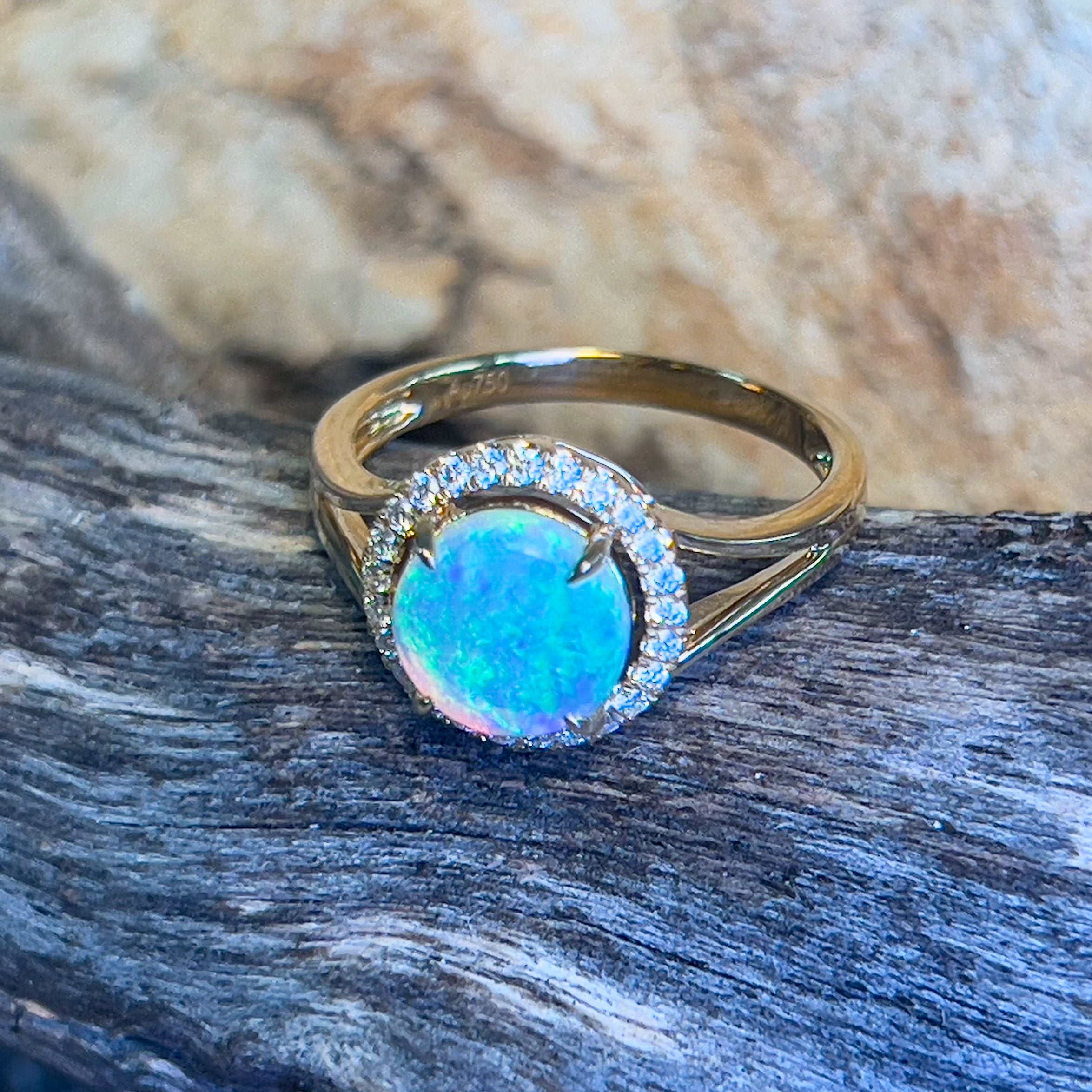 18kt Yellow Gold 1.09ct Opal engagement ring diamond cluster design