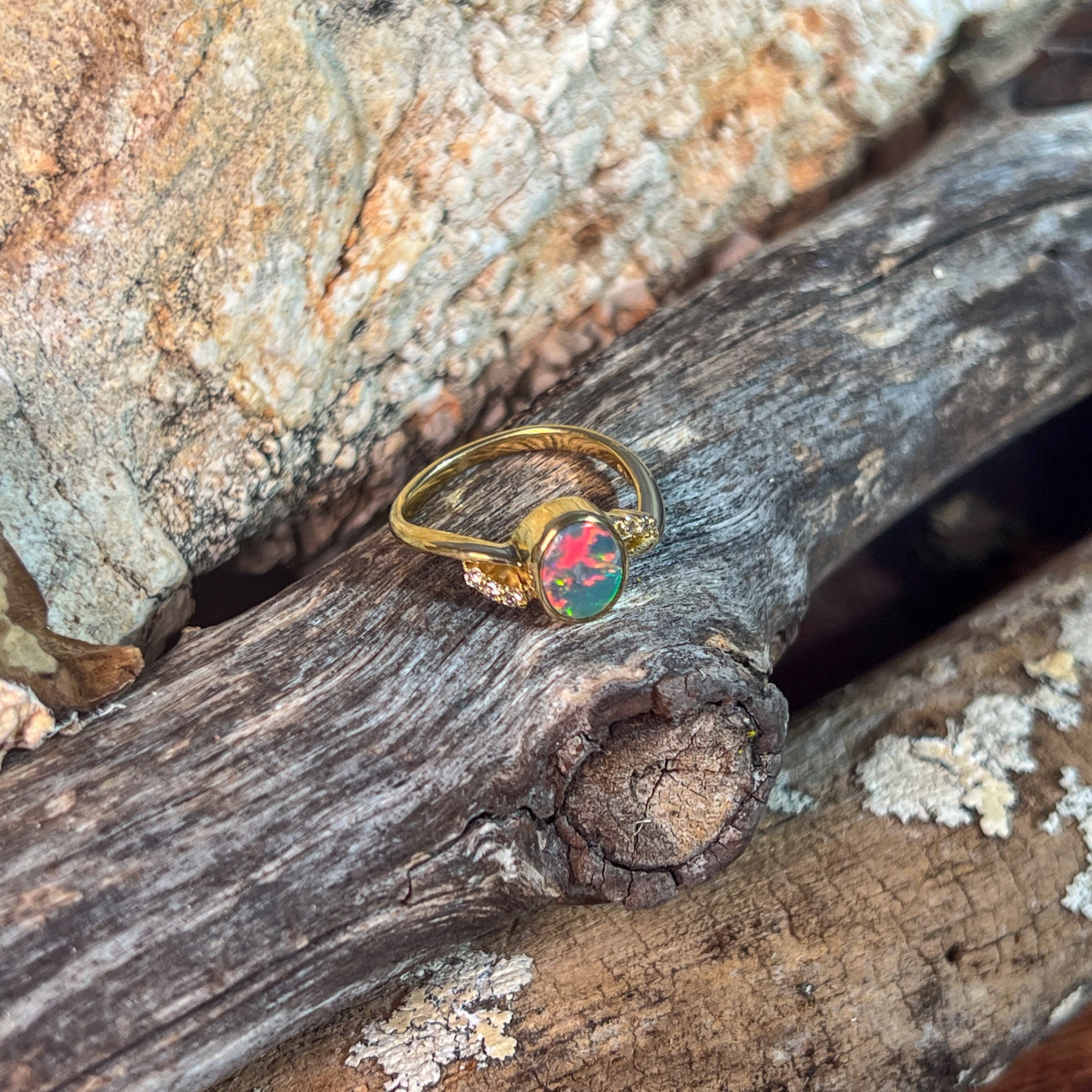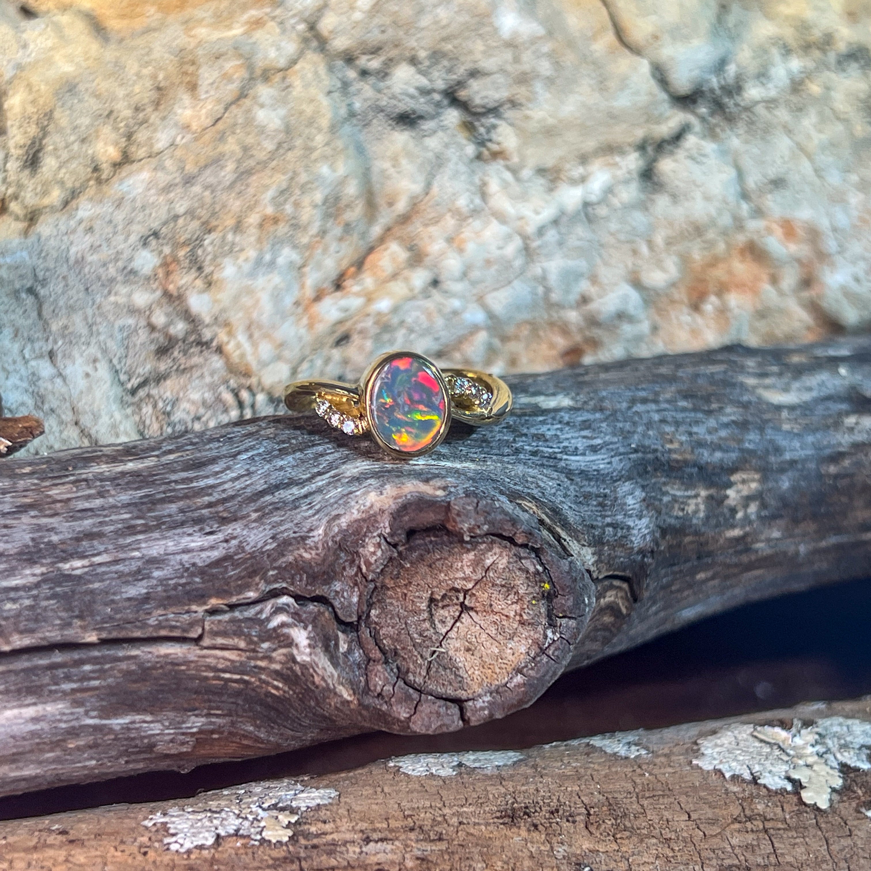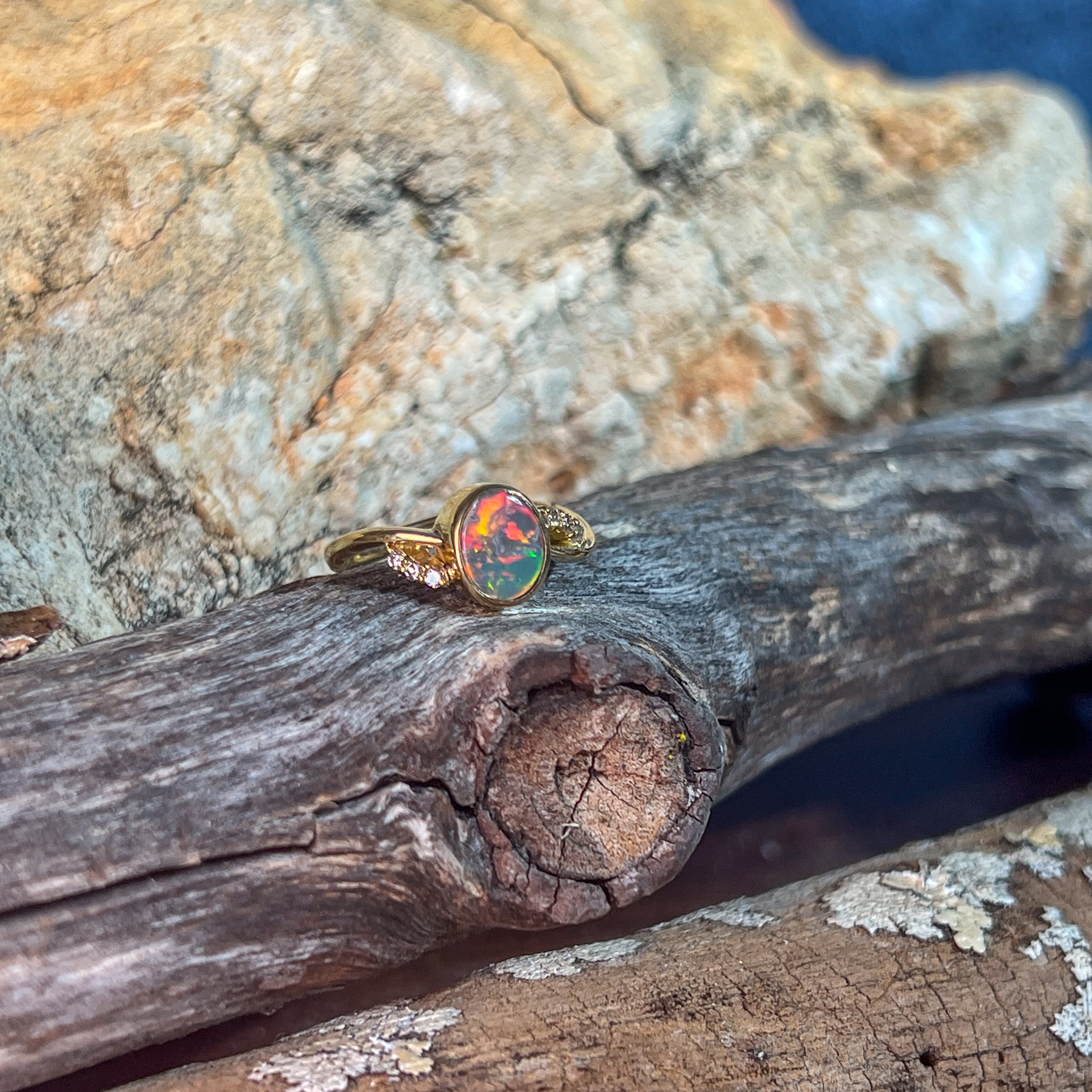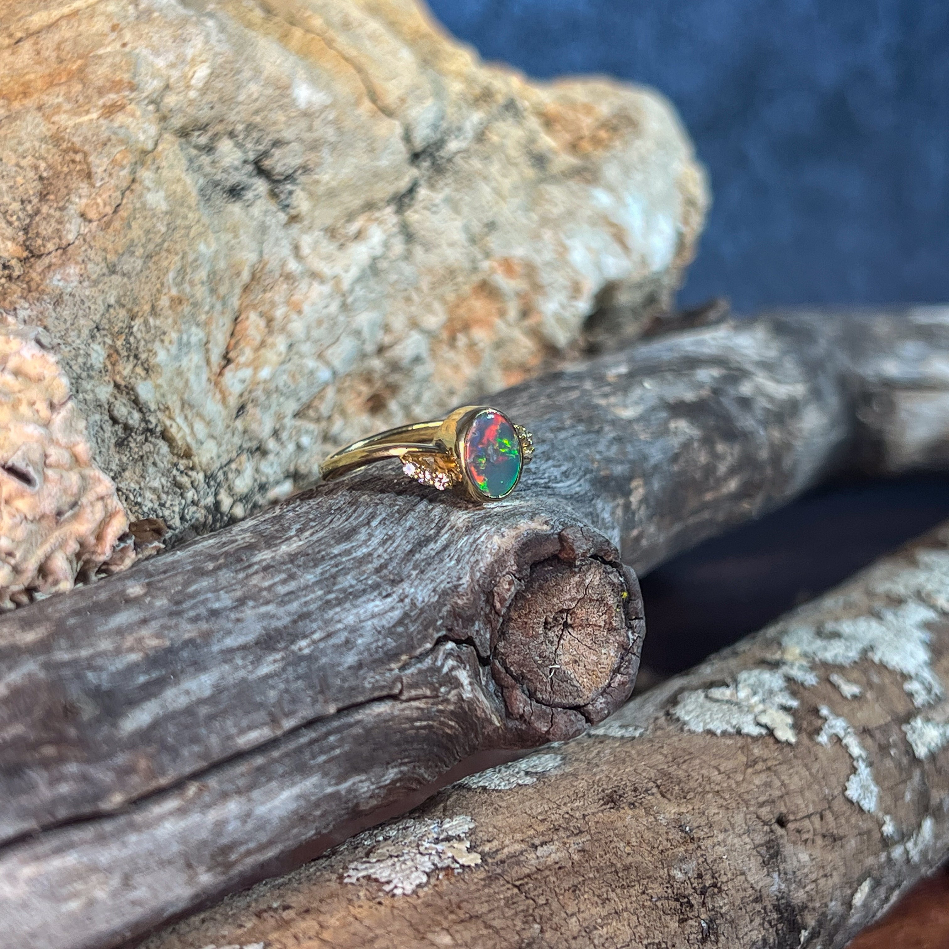 Experience the mesmerizing fire of our 18kt Yellow Gold Black Opal 1.07ct and diamond ring. The stunning opal display captures attention with its fiery colors, making it the perfect addition to any engagement ring. Don't settle for an ordinary ring, make a statement with our opal ring and ignite the passion in your relationship.