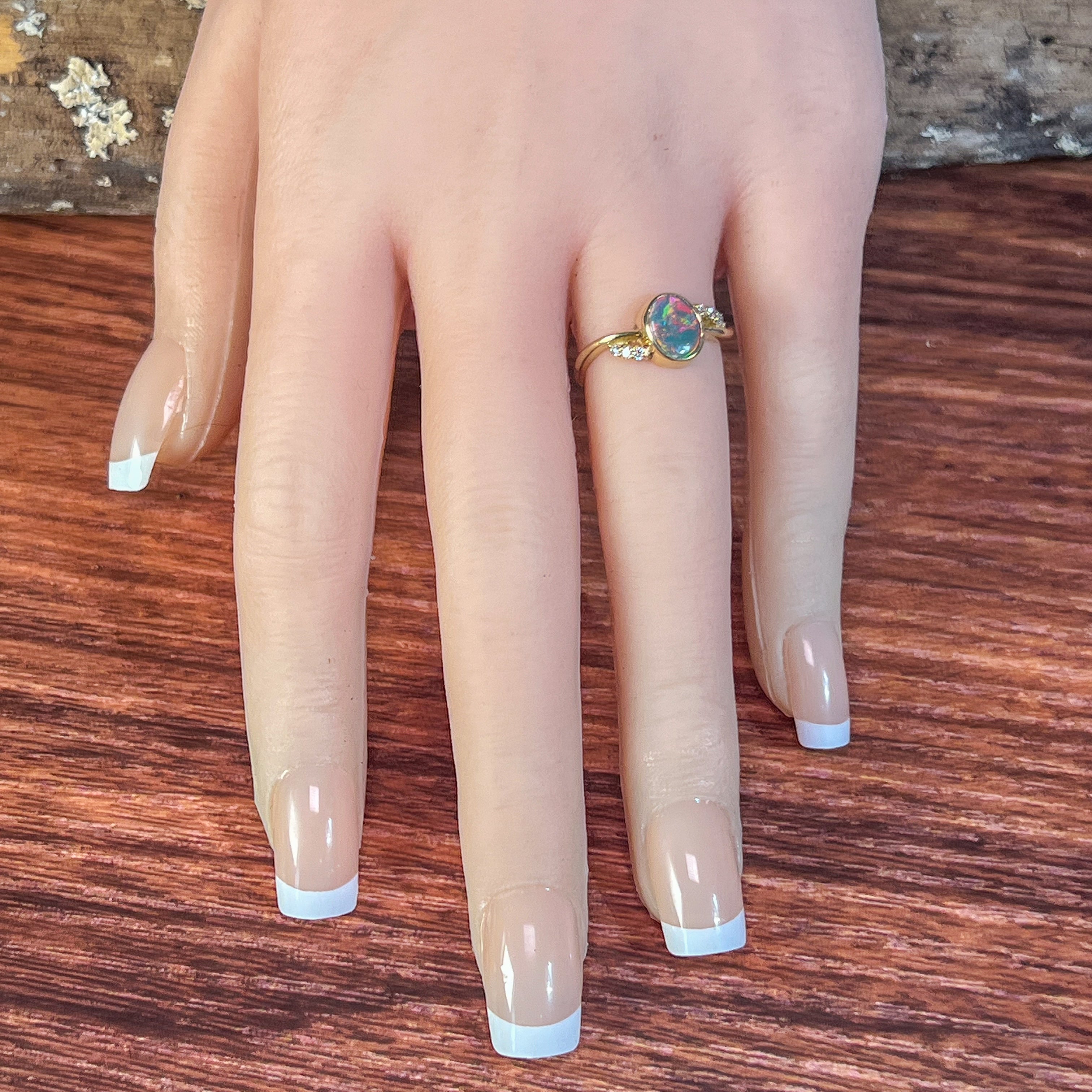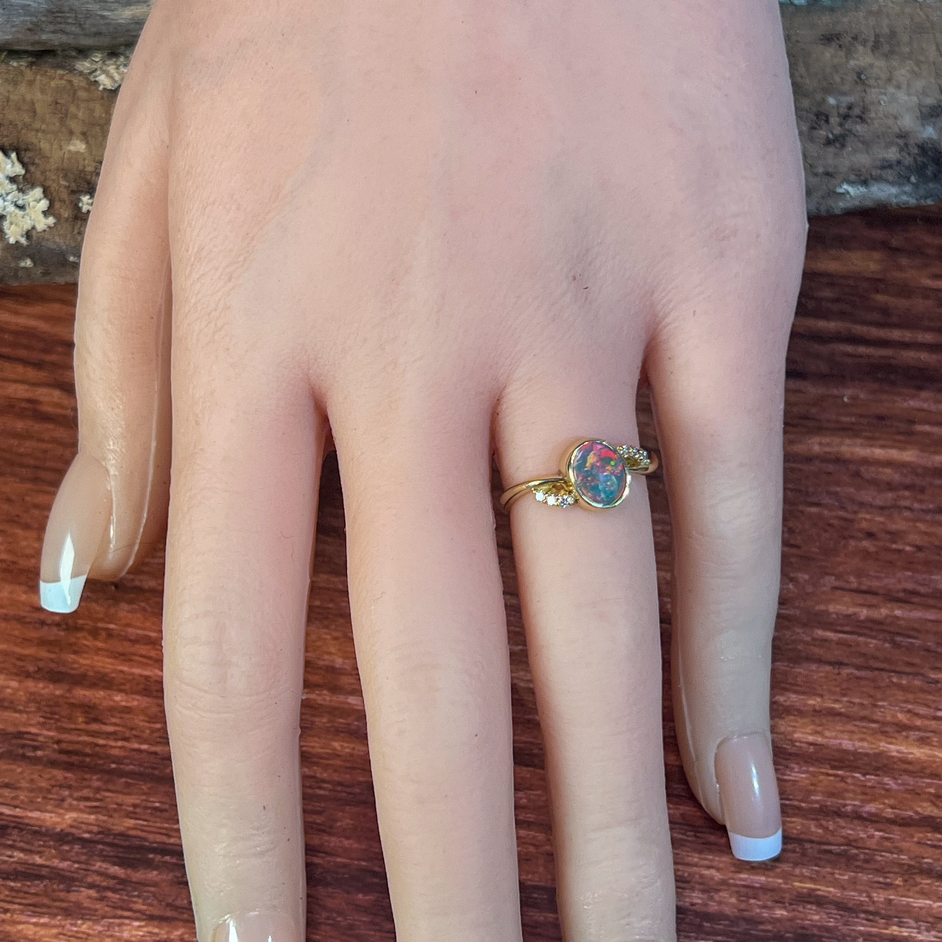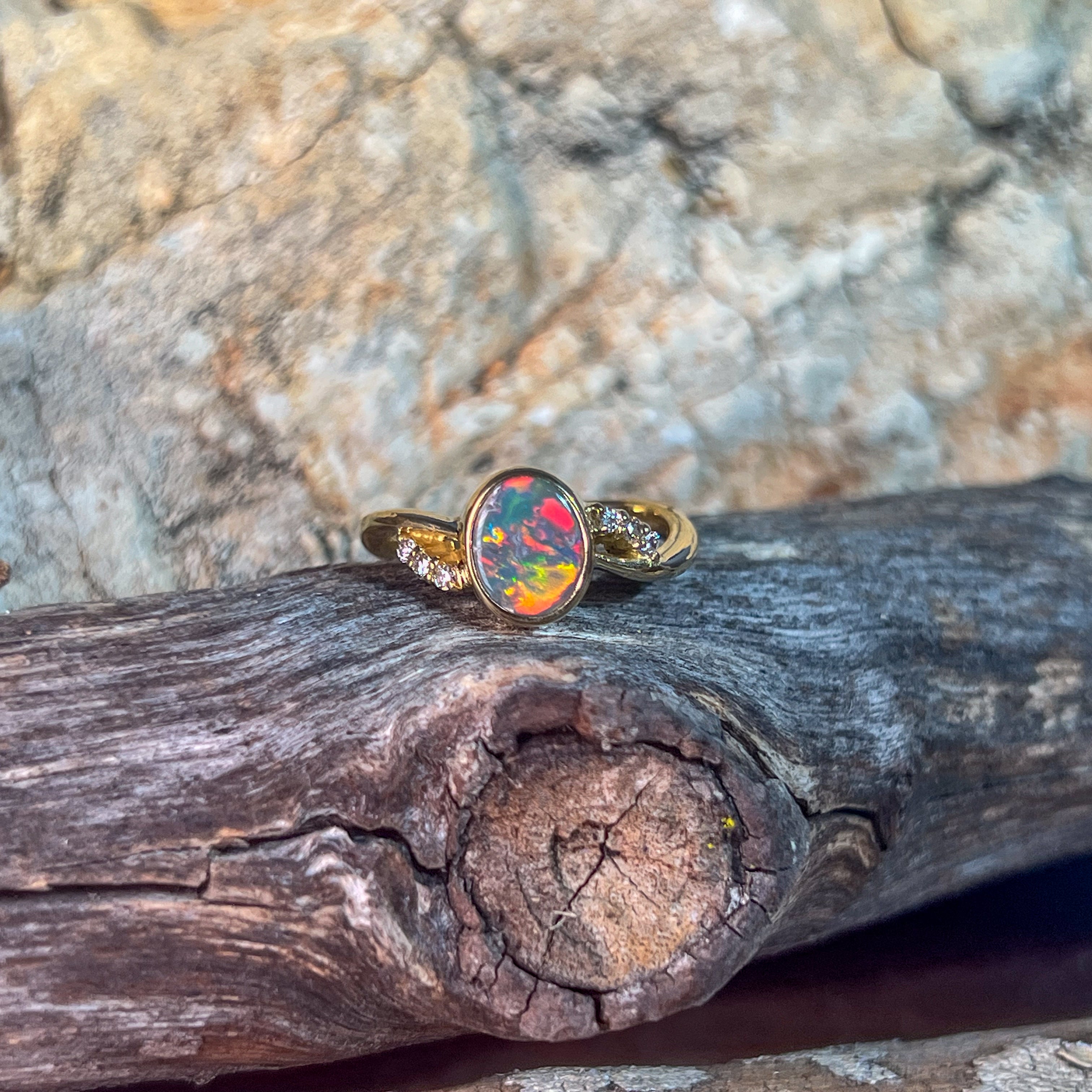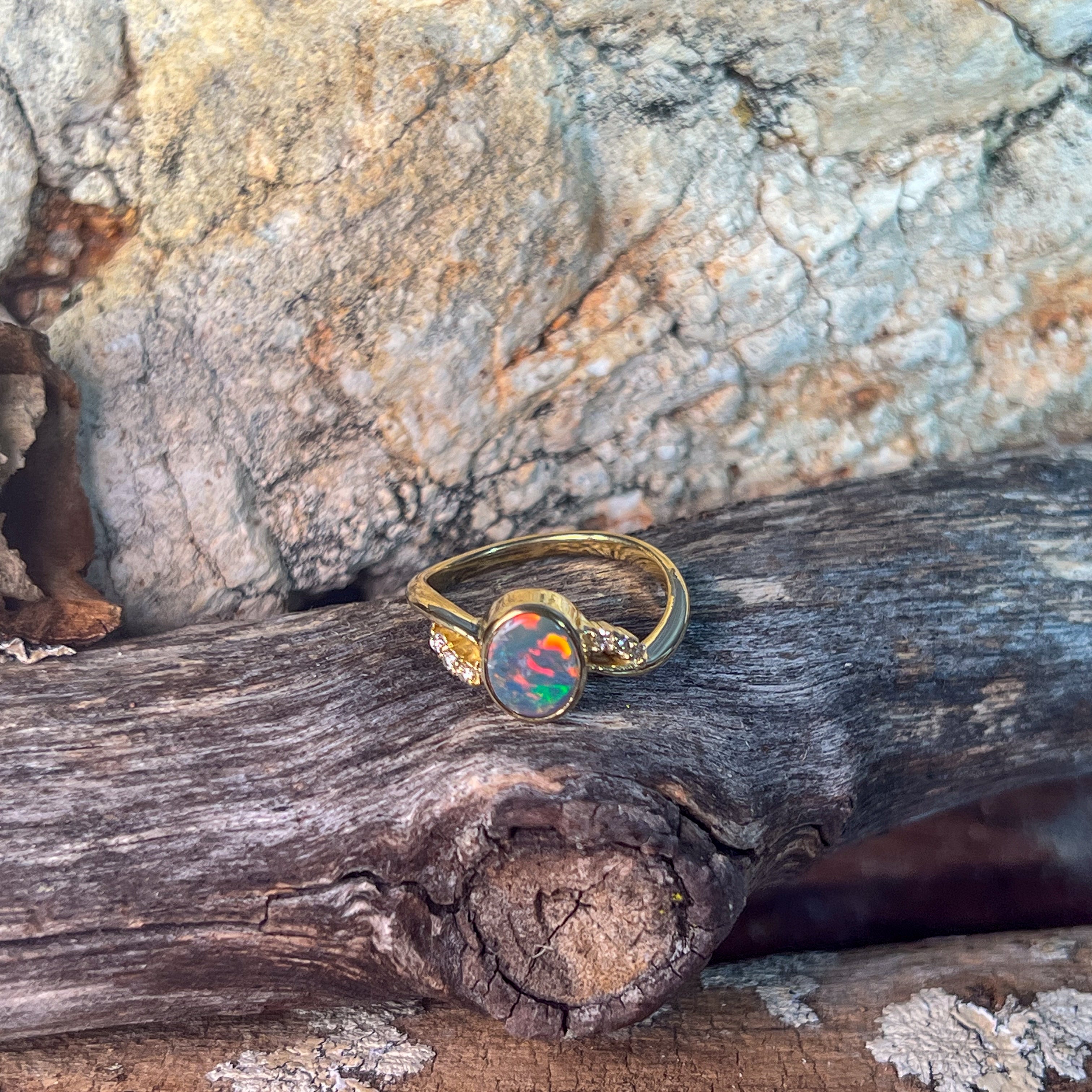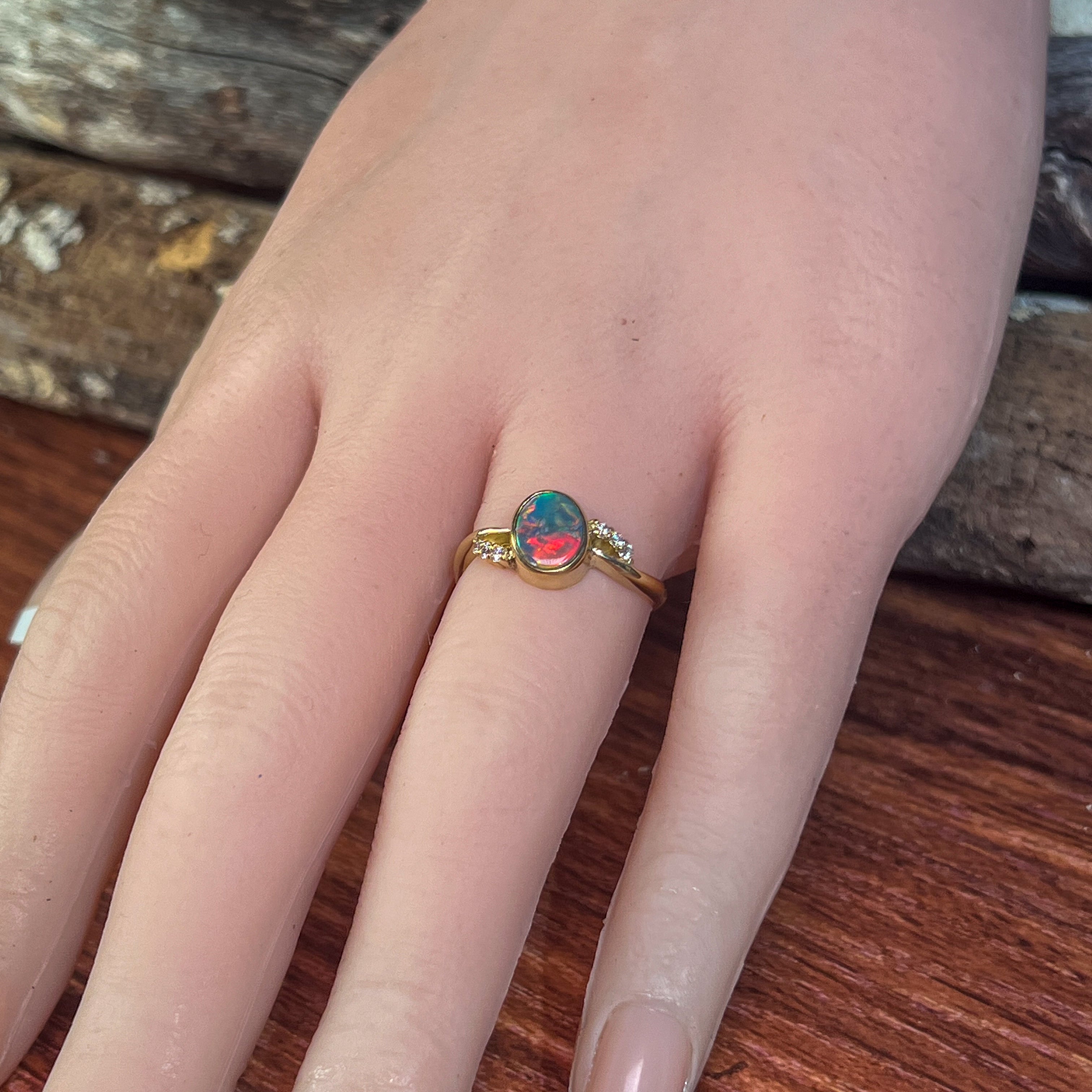 Experience the mesmerizing fire of our 18kt Yellow Gold Black Opal 1.07ct and diamond ring. The stunning opal display captures attention with its fiery colors, making it the perfect addition to any engagement ring. Don't settle for an ordinary ring, make a statement with our opal ring and ignite the passion in your relationship.