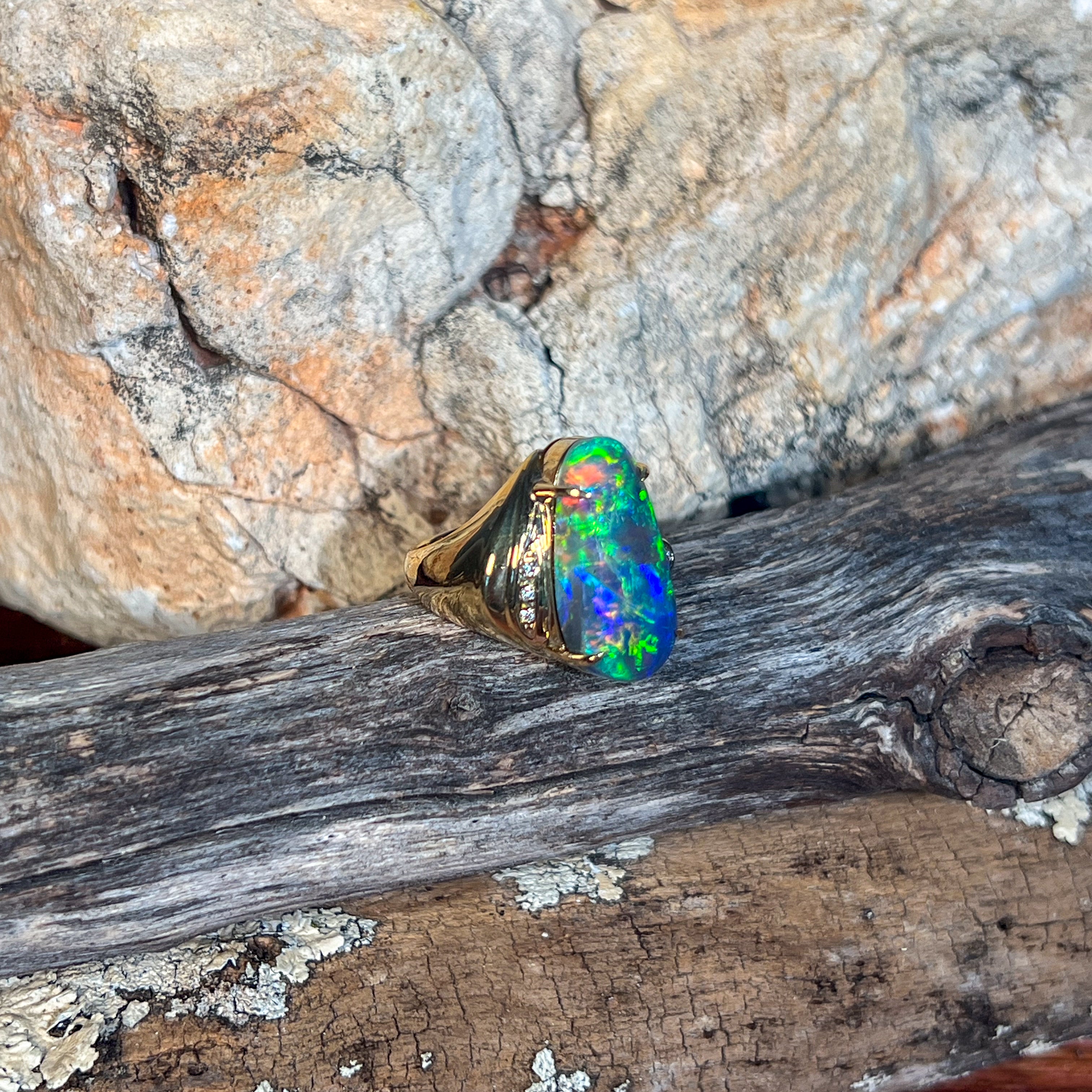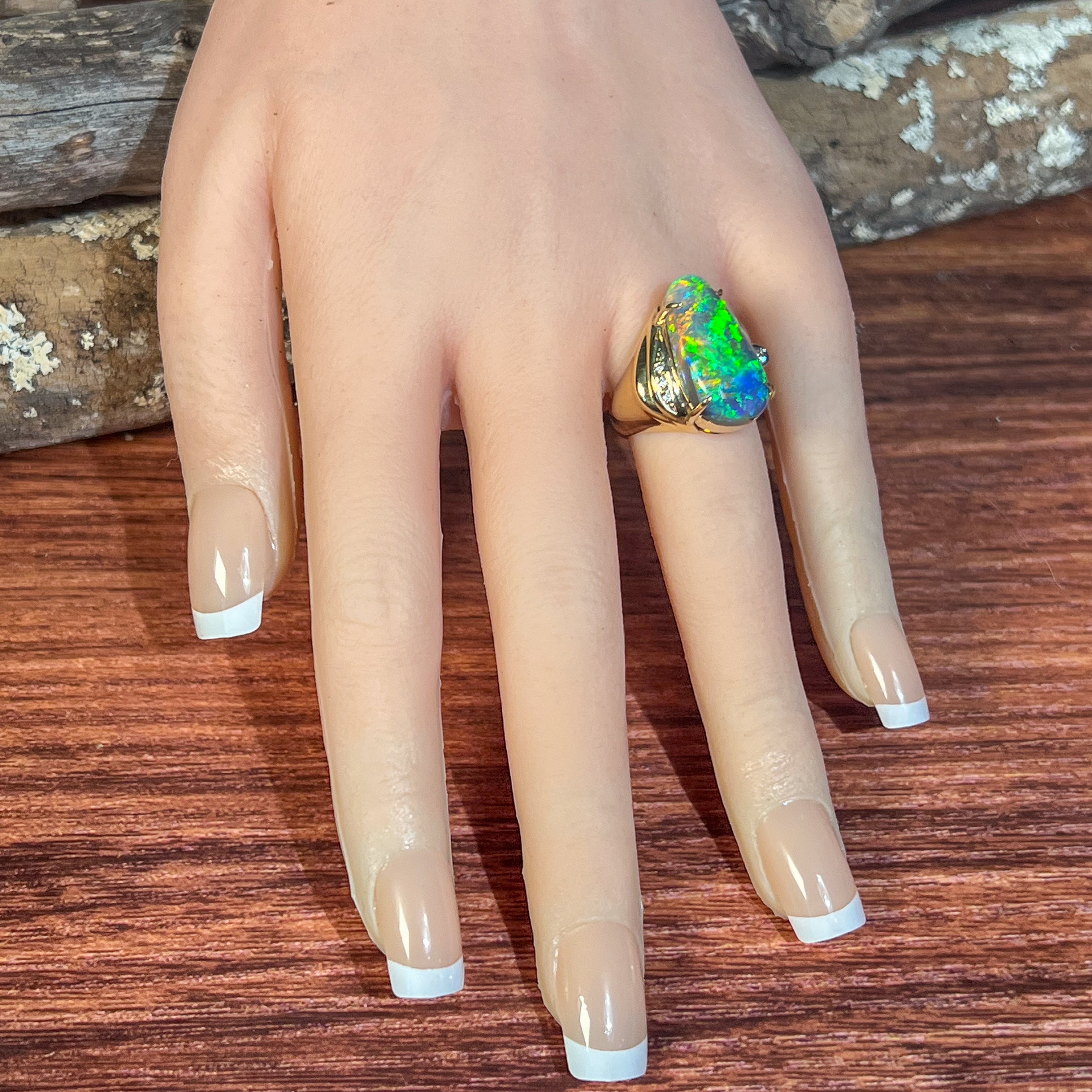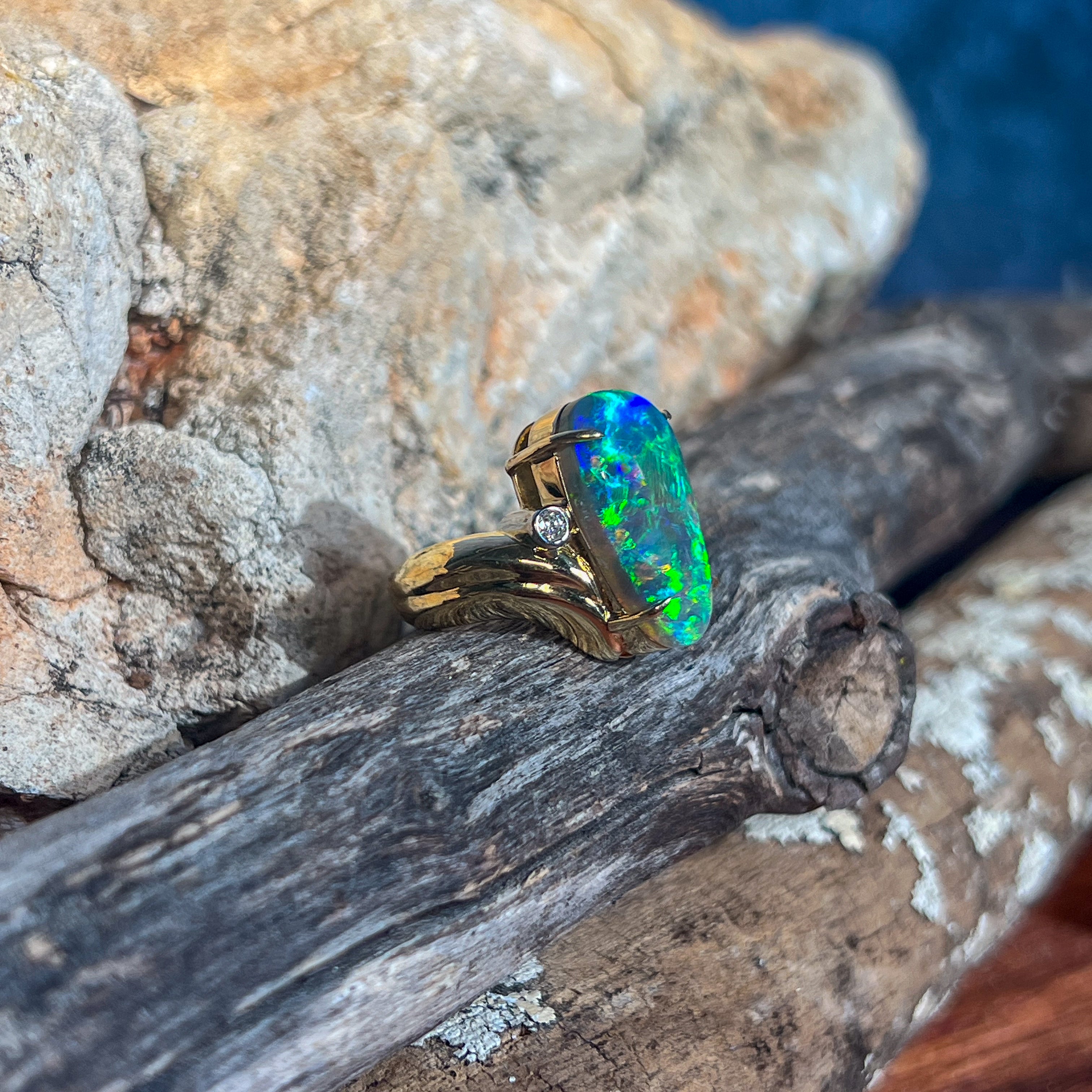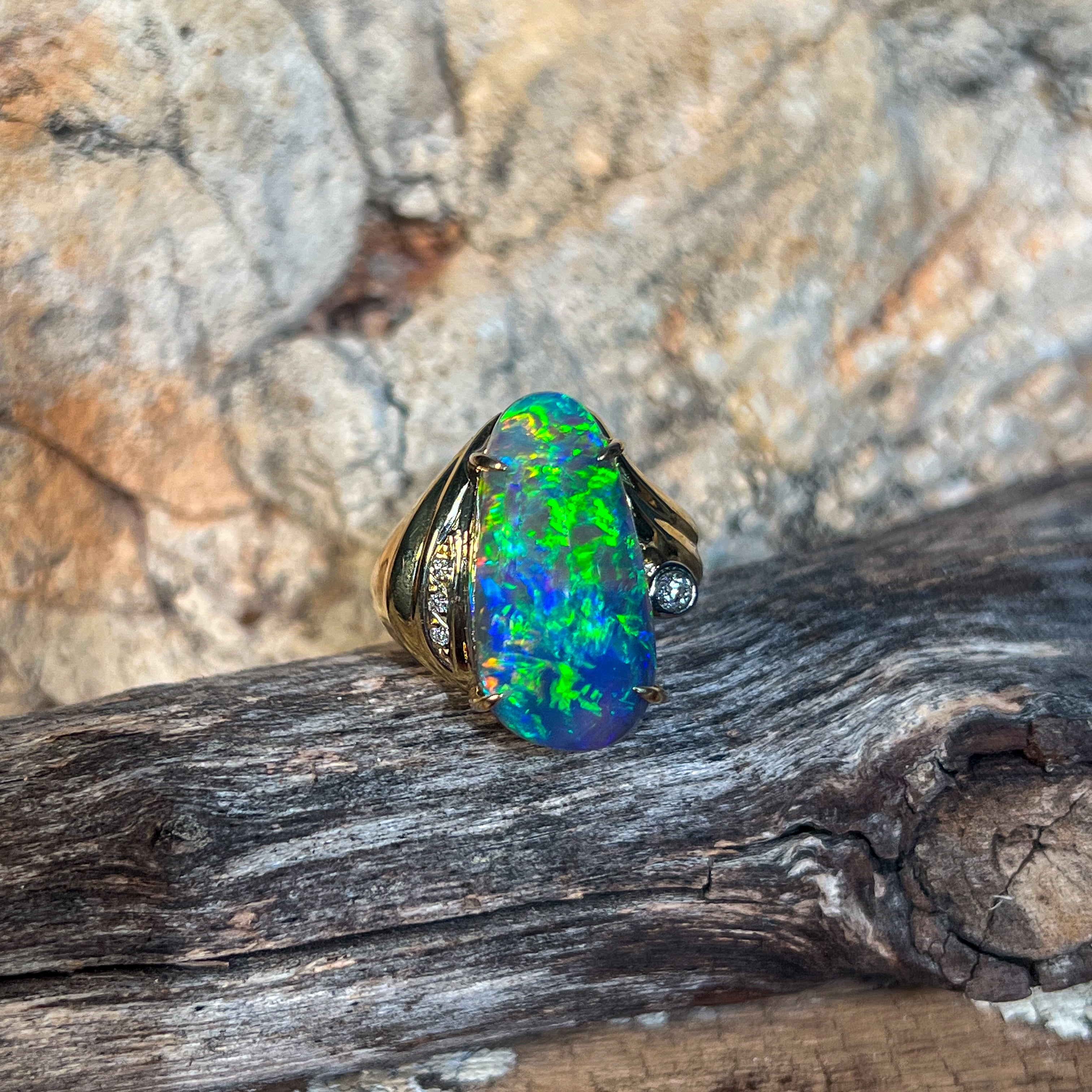 Experience bold elegance with this 18kt yellow gold designer ring featuring a stunning 9.19ct black opal. Its deep, multi-dimensional 3D colours shimmer vividly, creating a captivating play of light that commands attention. Accented with sparkling diamonds, this ring is a daring statement piece that elevates any look with its unique, luxurious allure. Perfect for those who embrace bold sophistication.