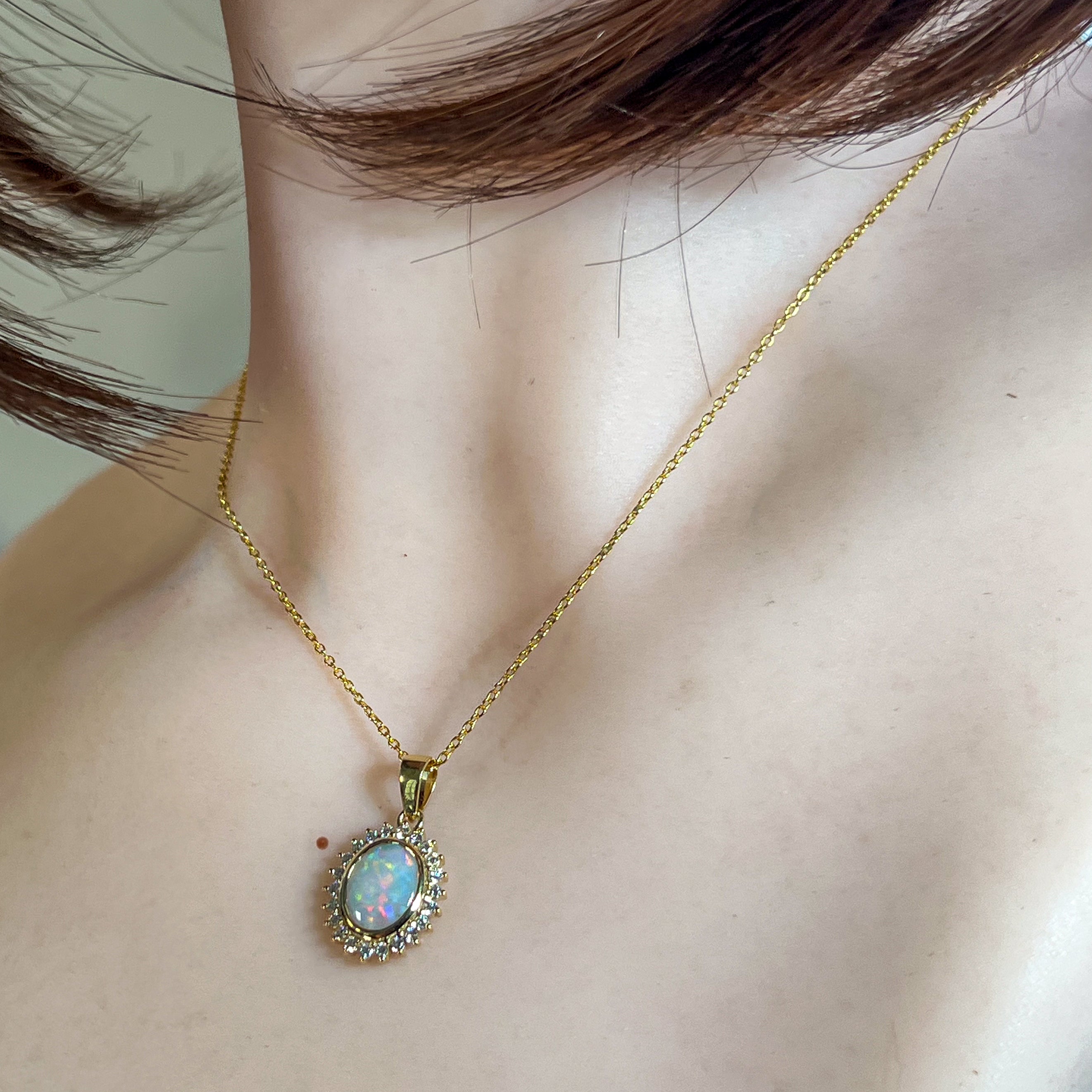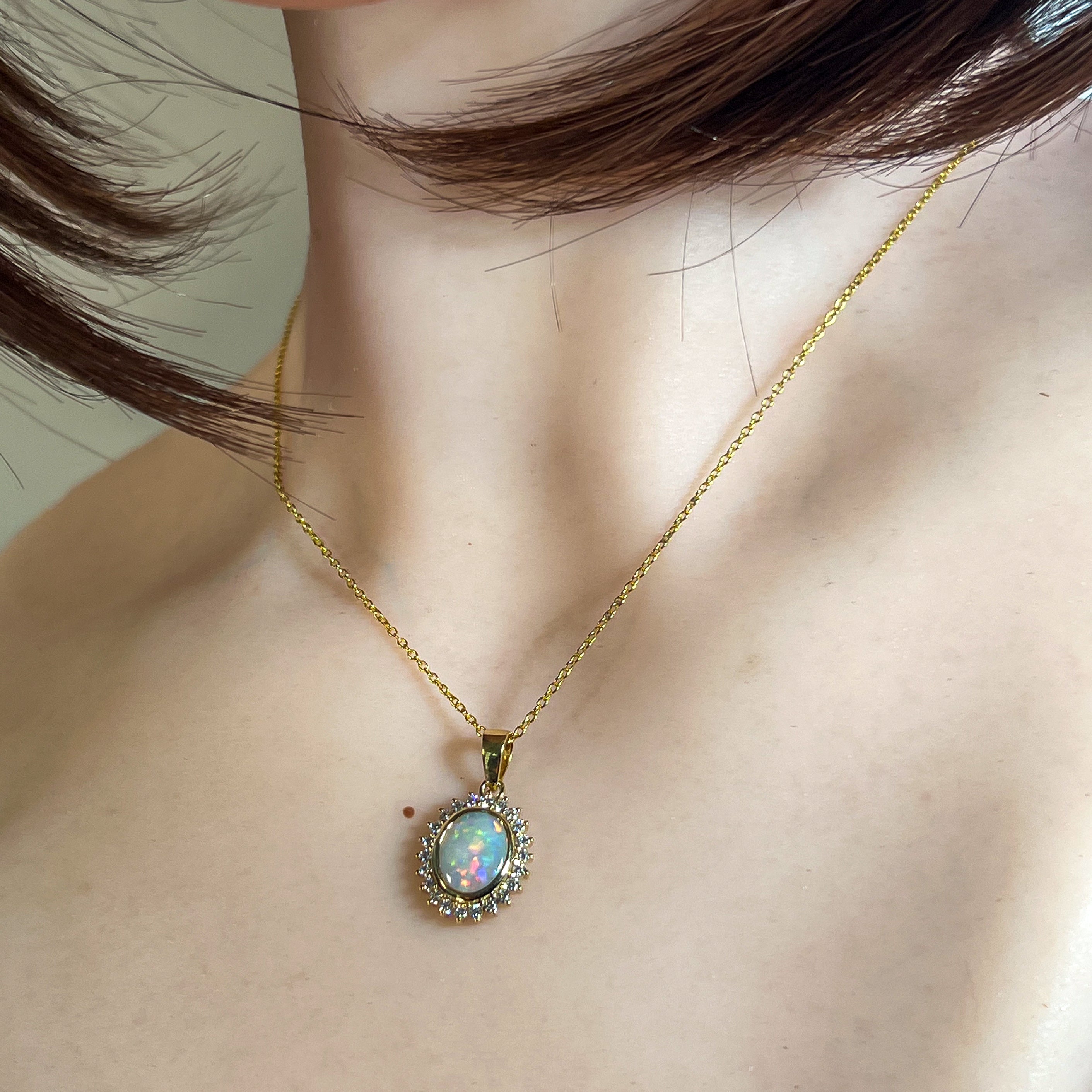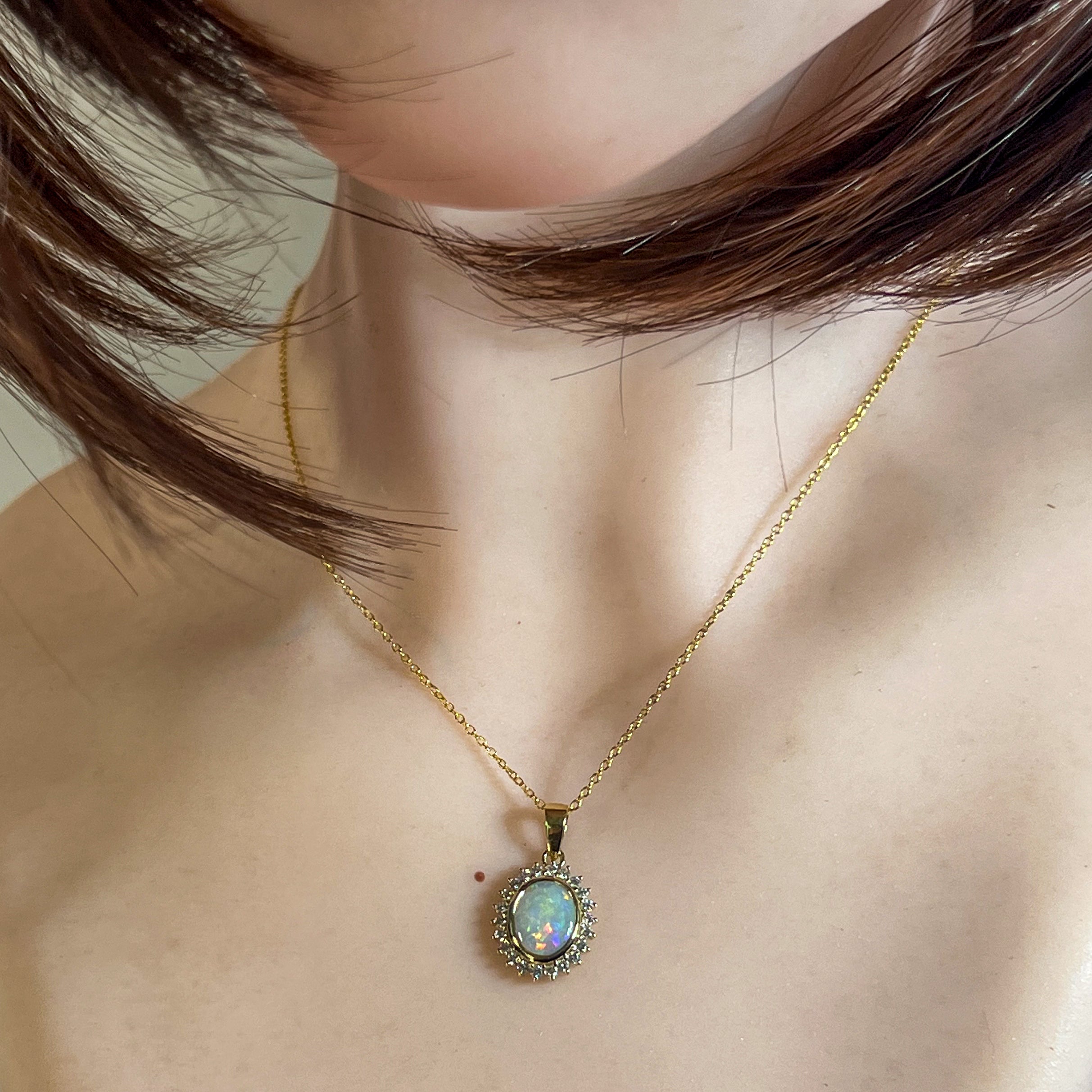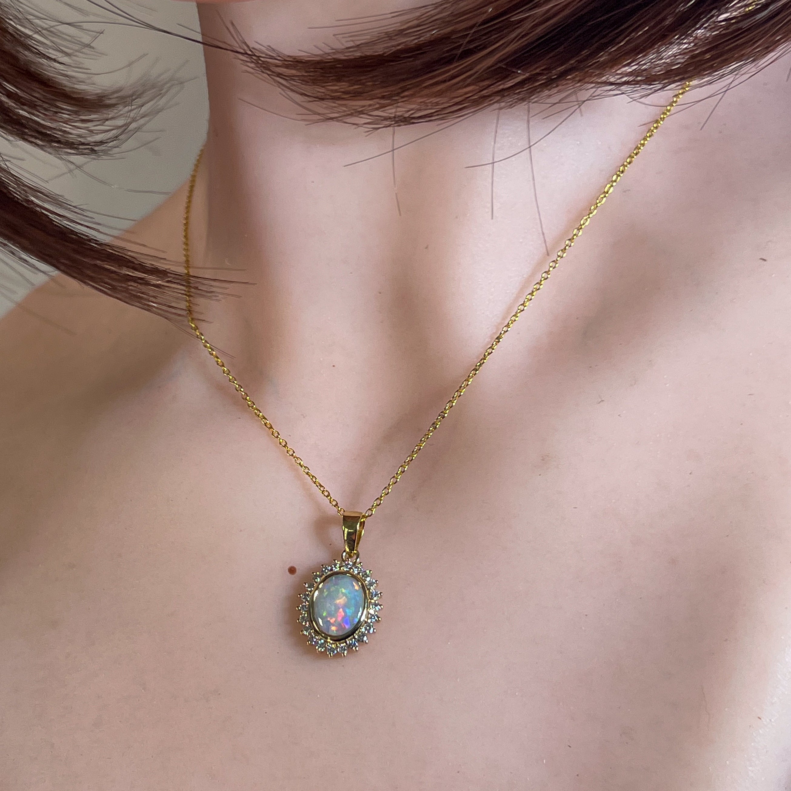 Elevate your elegance with this 18kt yellow gold pendant featuring a stunning cluster of crystal opals and sparkling diamonds. Its timeless design captures light beautifully, adding a radiant glow to any outfit. Perfect for special occasions or everyday luxury, this pendant combines classic charm with exquisite craftsmanship to make a lasting impression.
