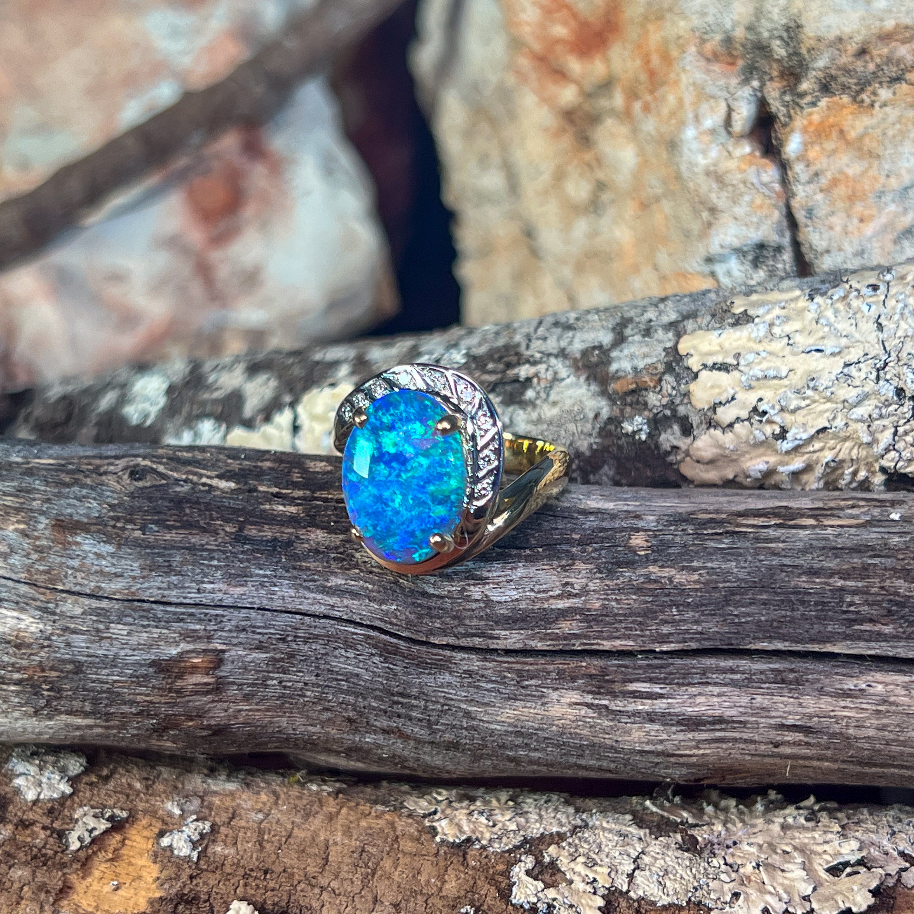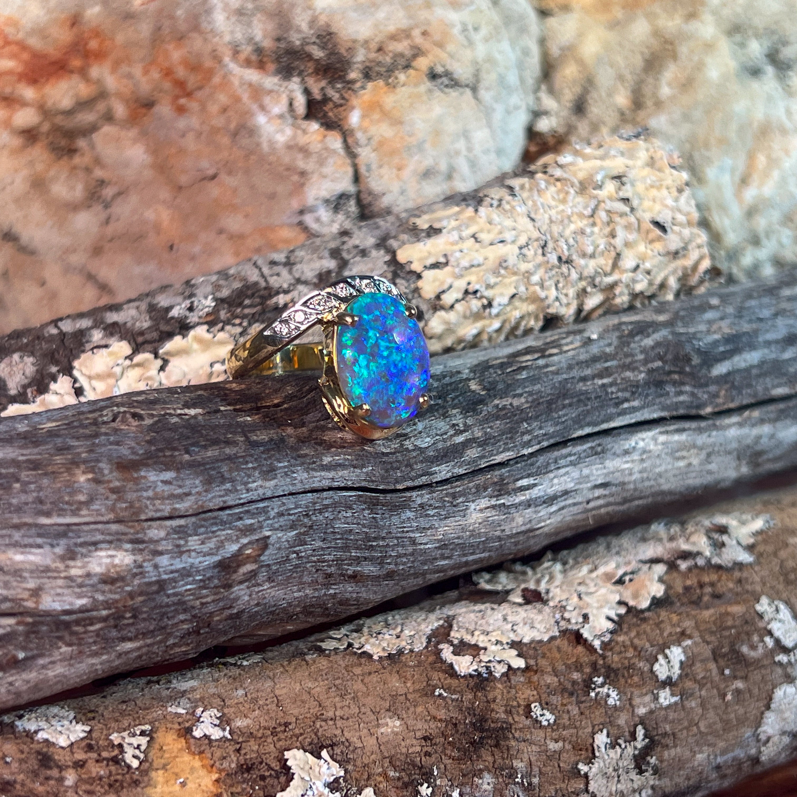 Experience the captivating beauty of our 18kt Yellow Gold cross over style Black Opal ring. Adorned with a striking 3.98ct blue-green 3D Opal, accented by sparkling diamonds, this ring is a true showstopper. Add a touch of elegance and sophistication to any outfit with this stunning piece.