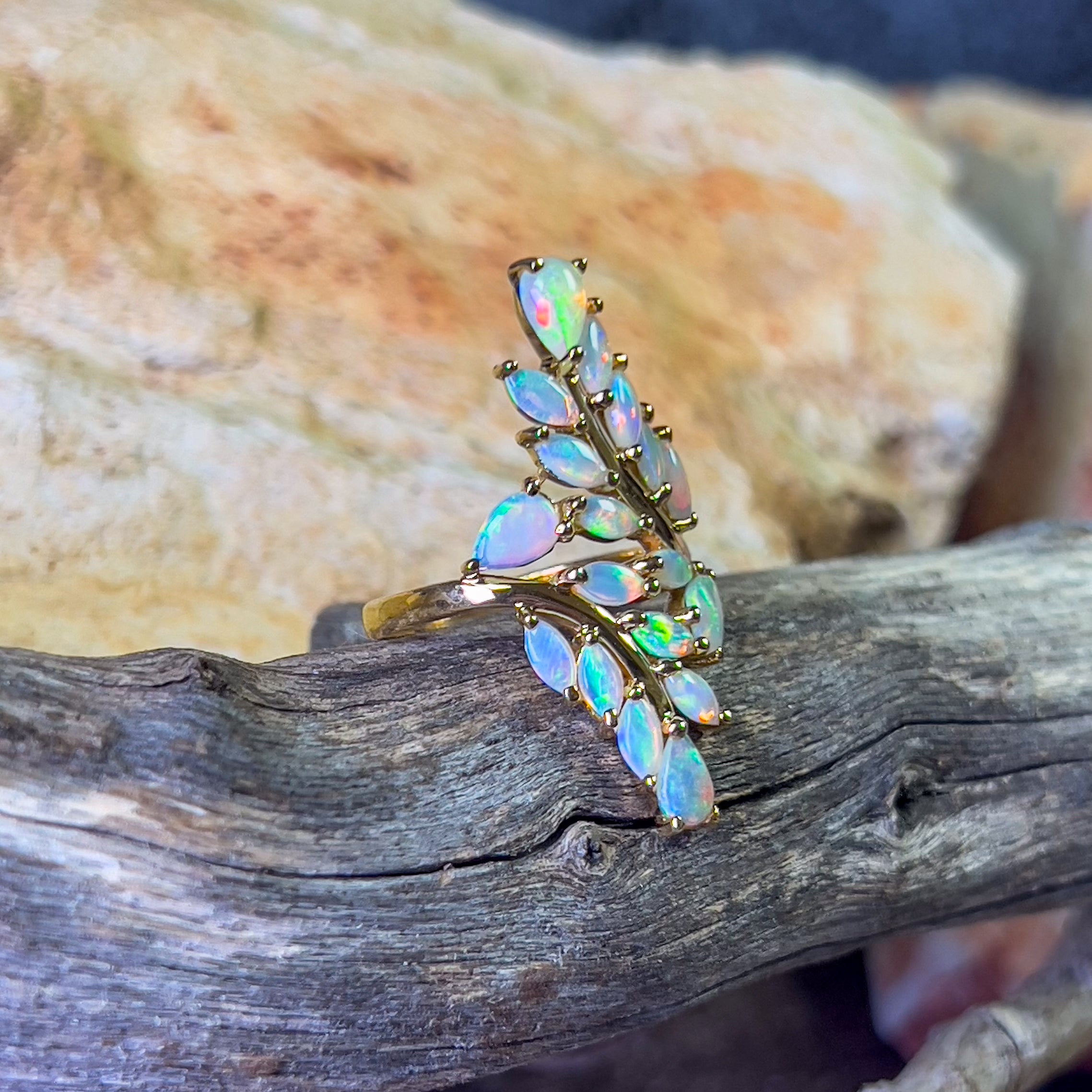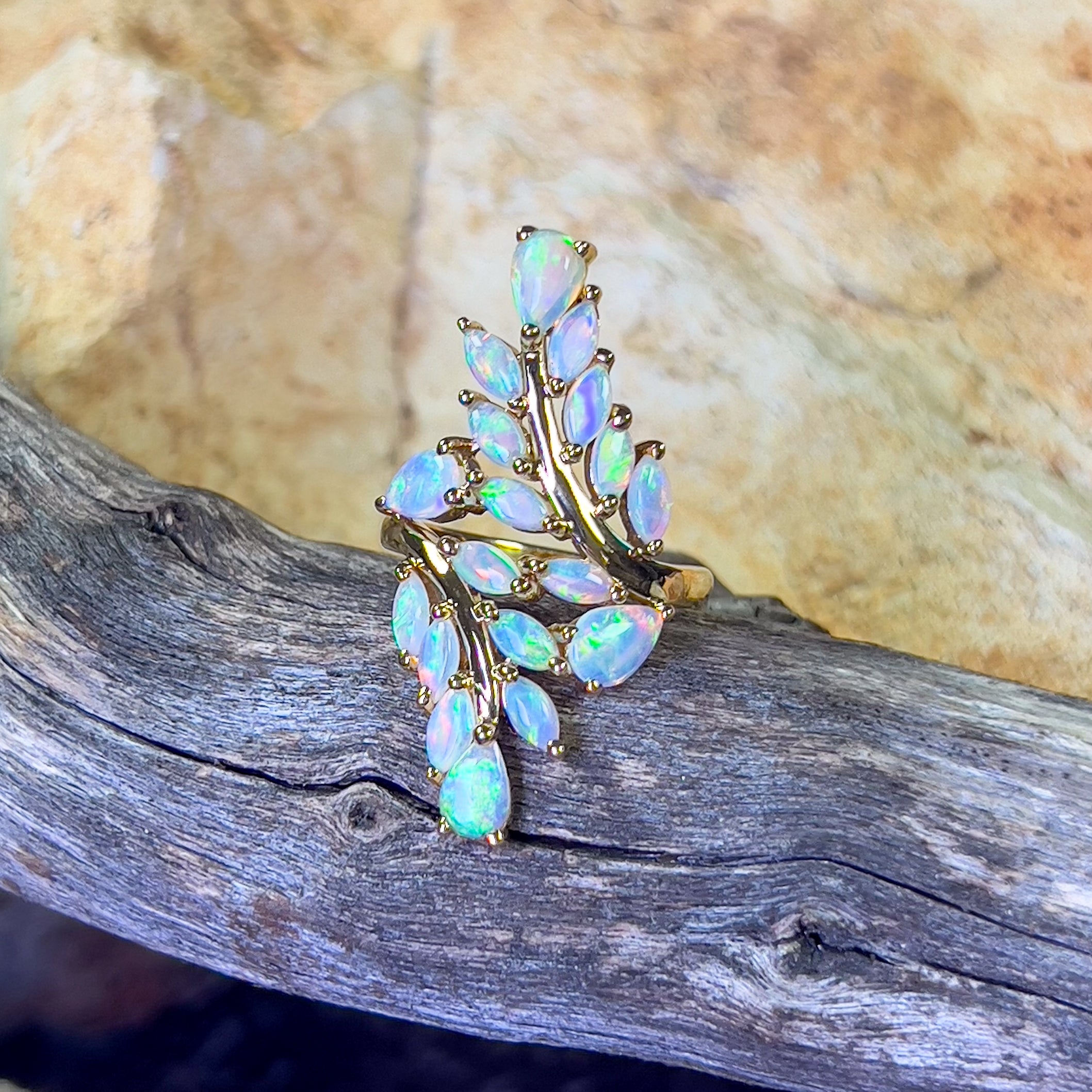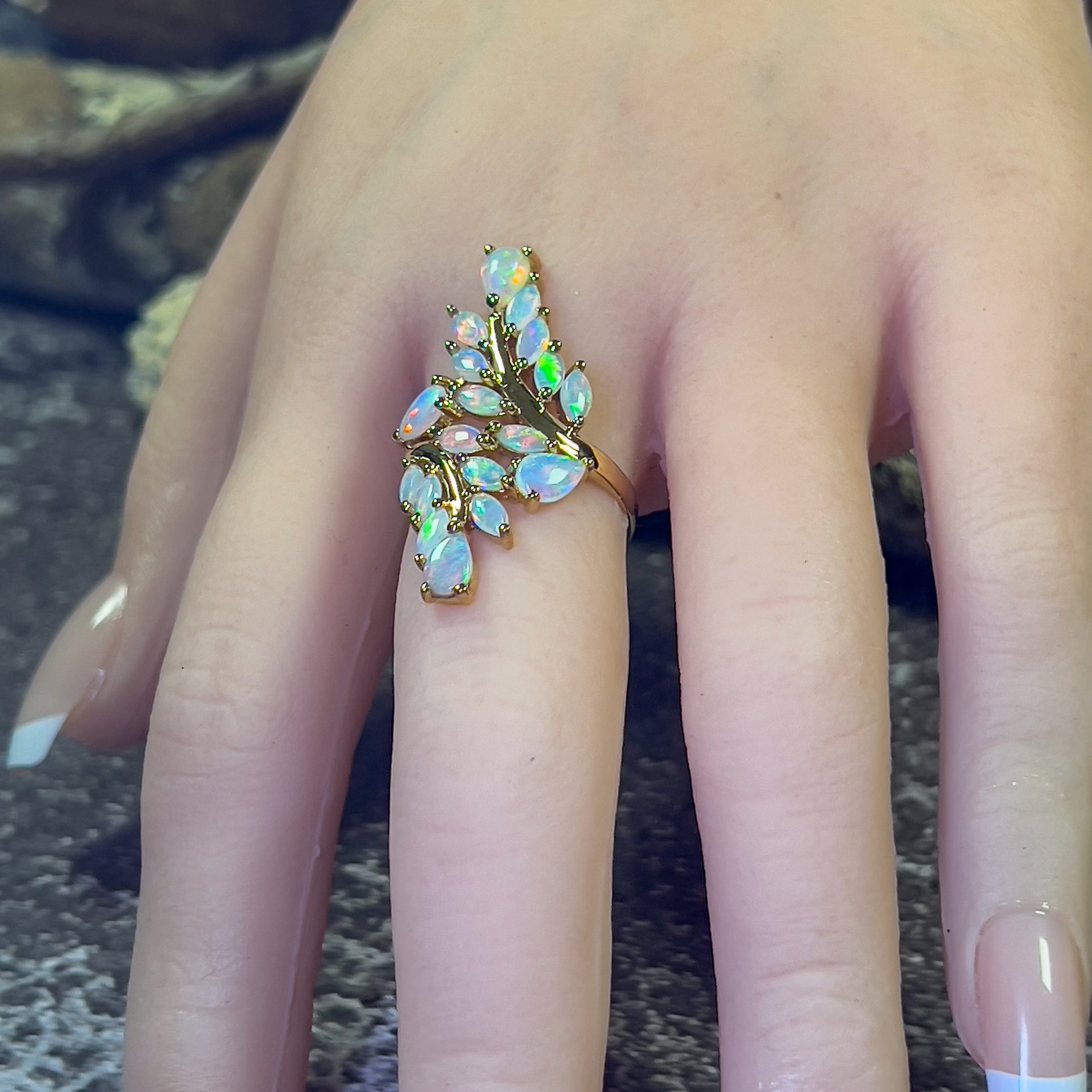 Elevate your style with this stunning 18kt Yellow Gold Crystal Opal leaf motif ring. Featuring a delicate floral design, this statement ring adds a touch of elegance to any look. With its lustrous opal and rich gold, you'll feel confident and radiant all day long.