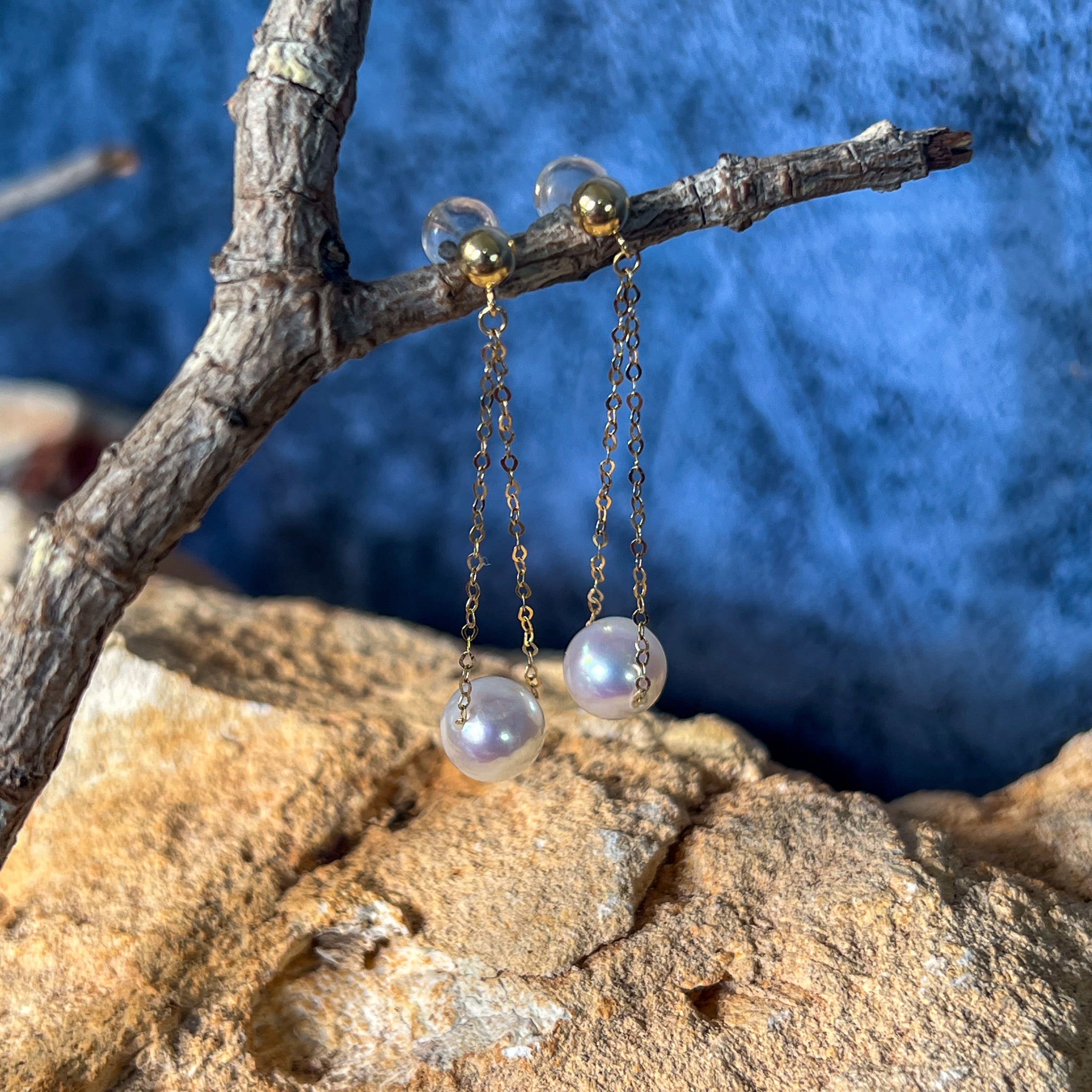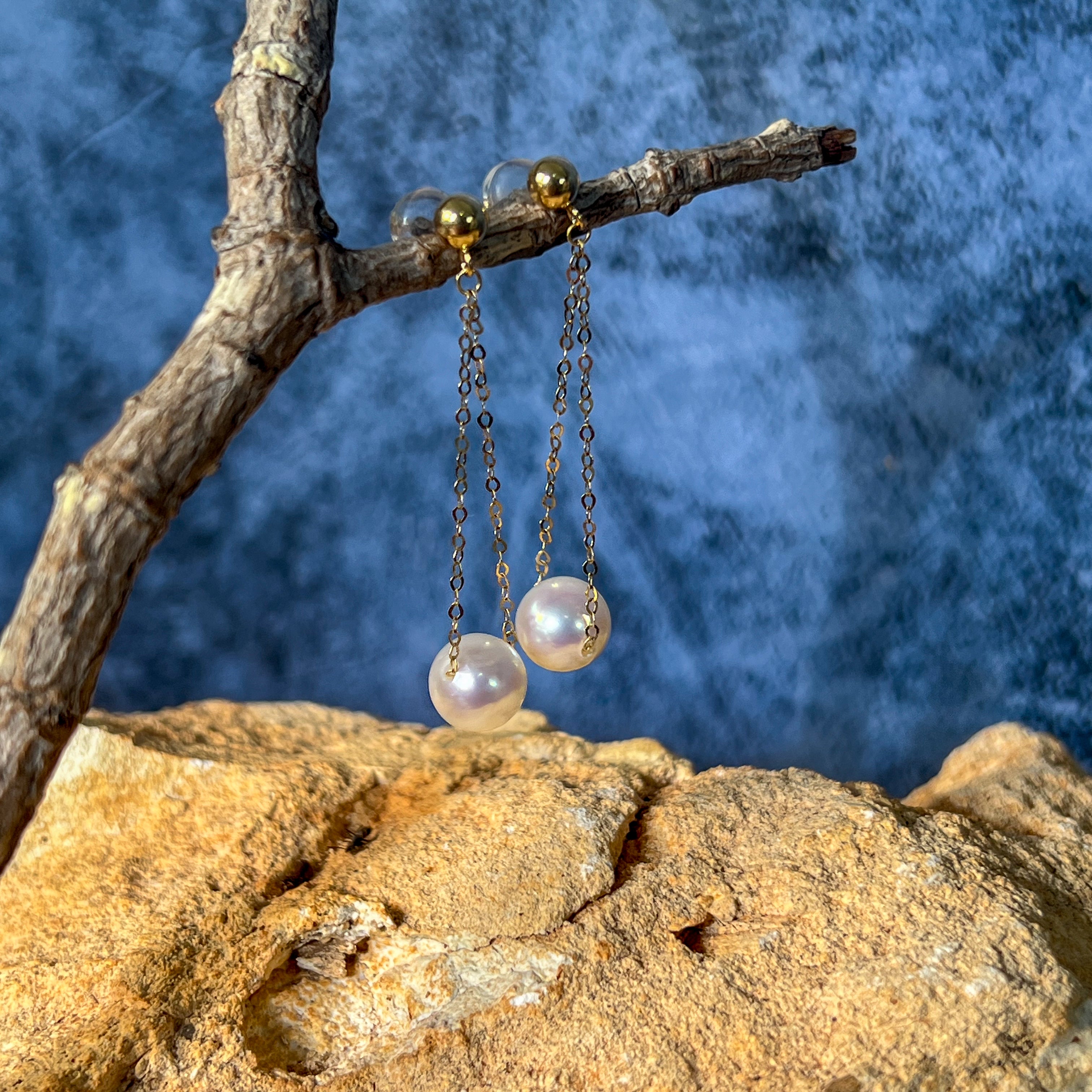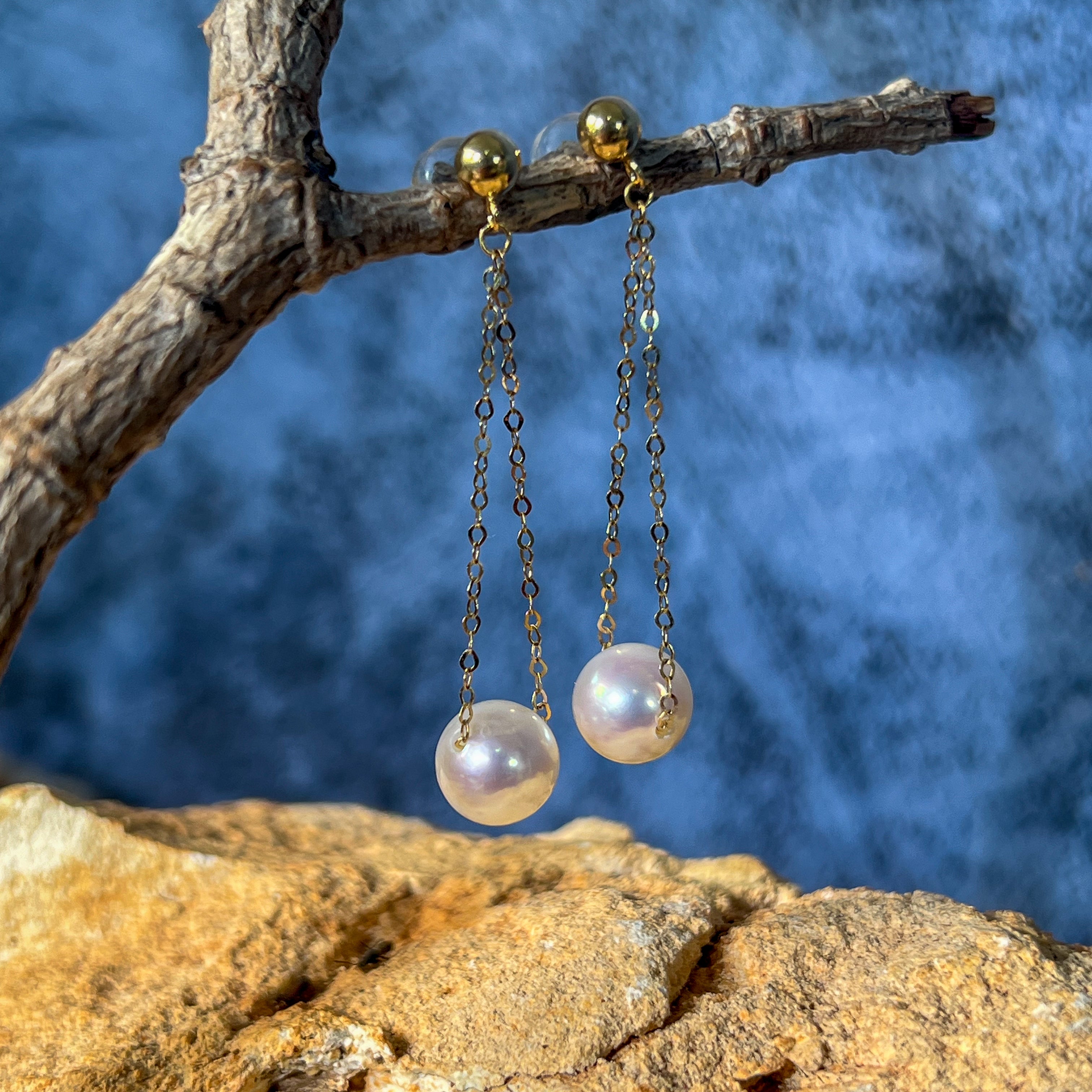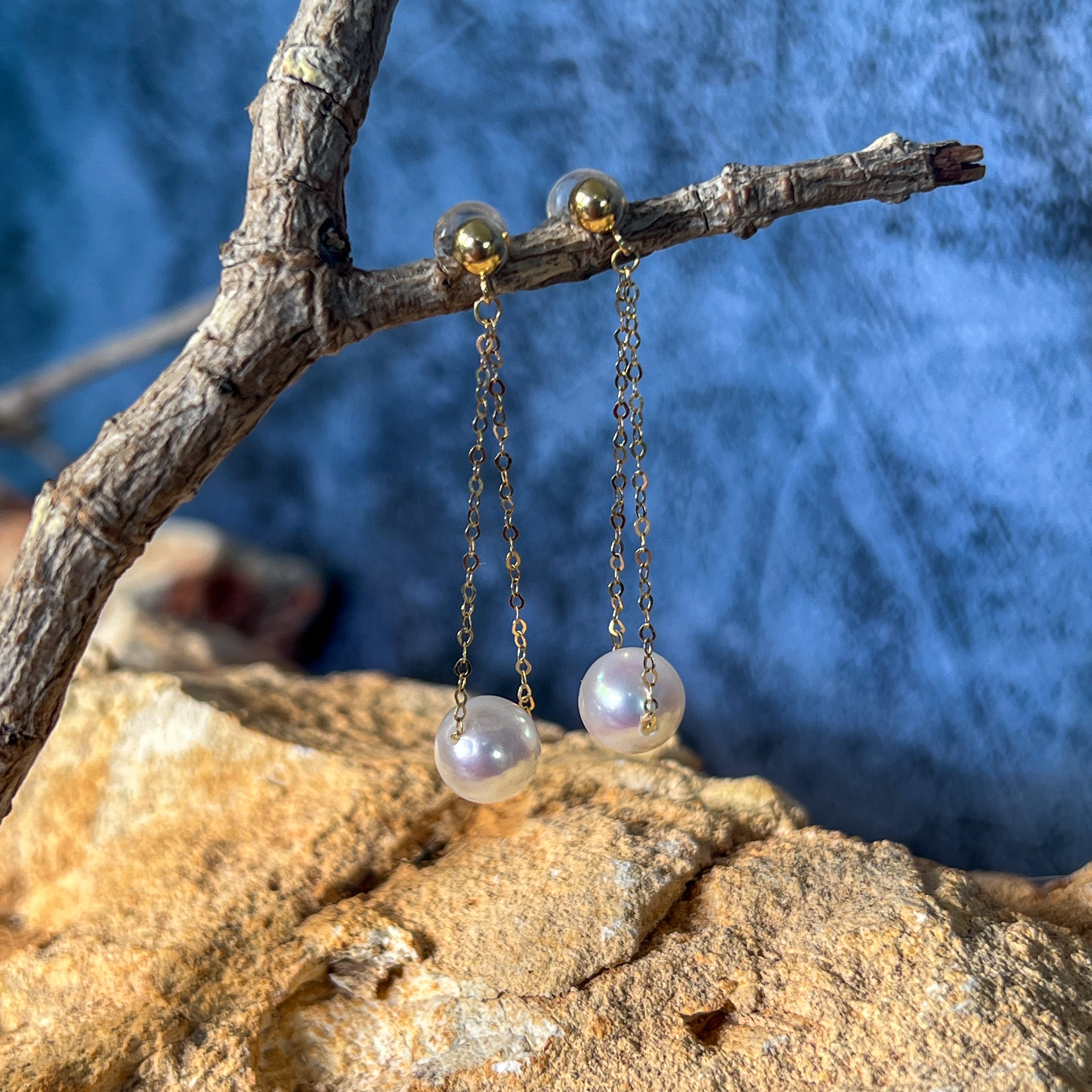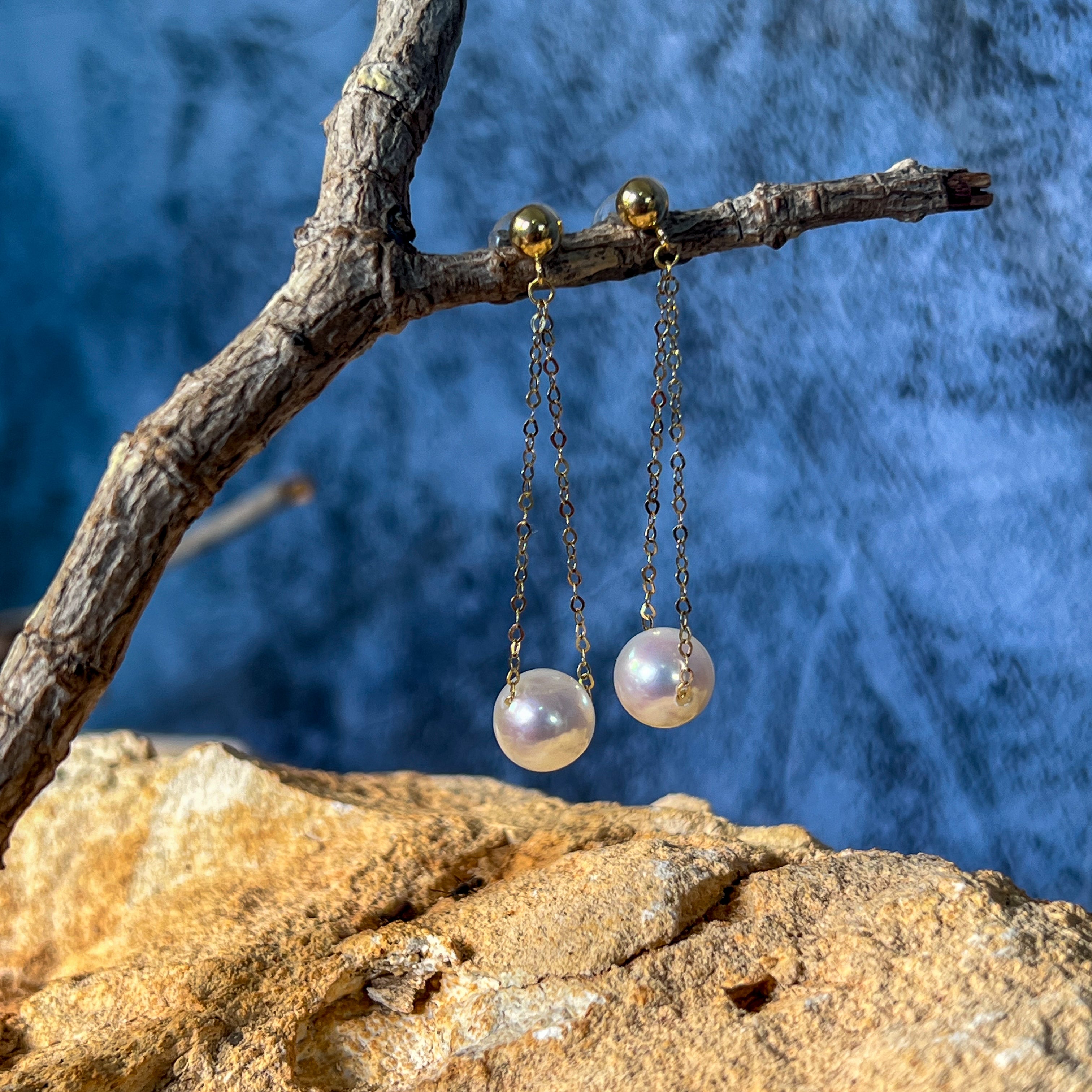 18kt Yellow Gold dangling Akoya 7-7.5mm Pearl earrings