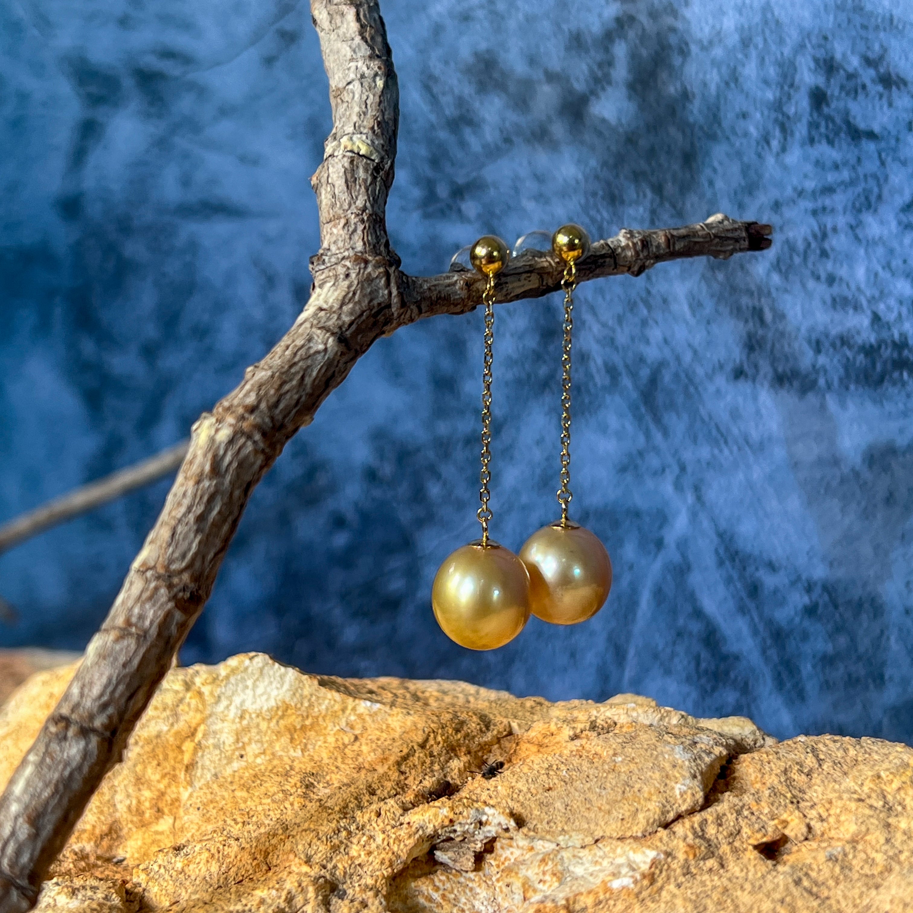 18kt Yellow gold dangling Golden South Sea Pearl 9-10mm earrings