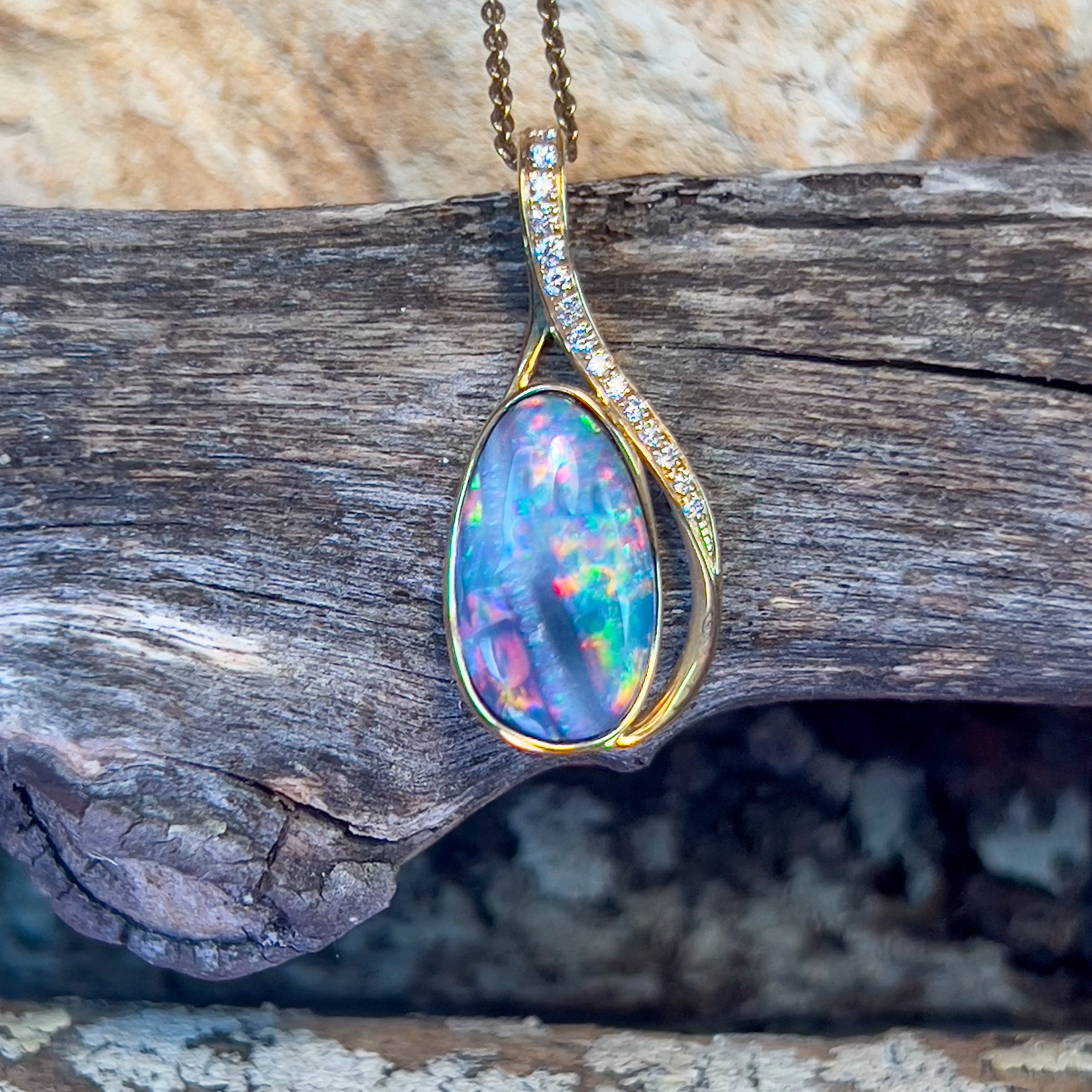 Crafted from luxurious 18kt yellow gold, this stunning pendant features a mesmerizing 4.05ct opal doublet and sparkling 0.1ct diamonds. Perfect for any special occasion, this gold necklace for women exudes elegance and sophistication while adding a touch of glamour to any outfit. Elevate your style with this exquisite accessory.