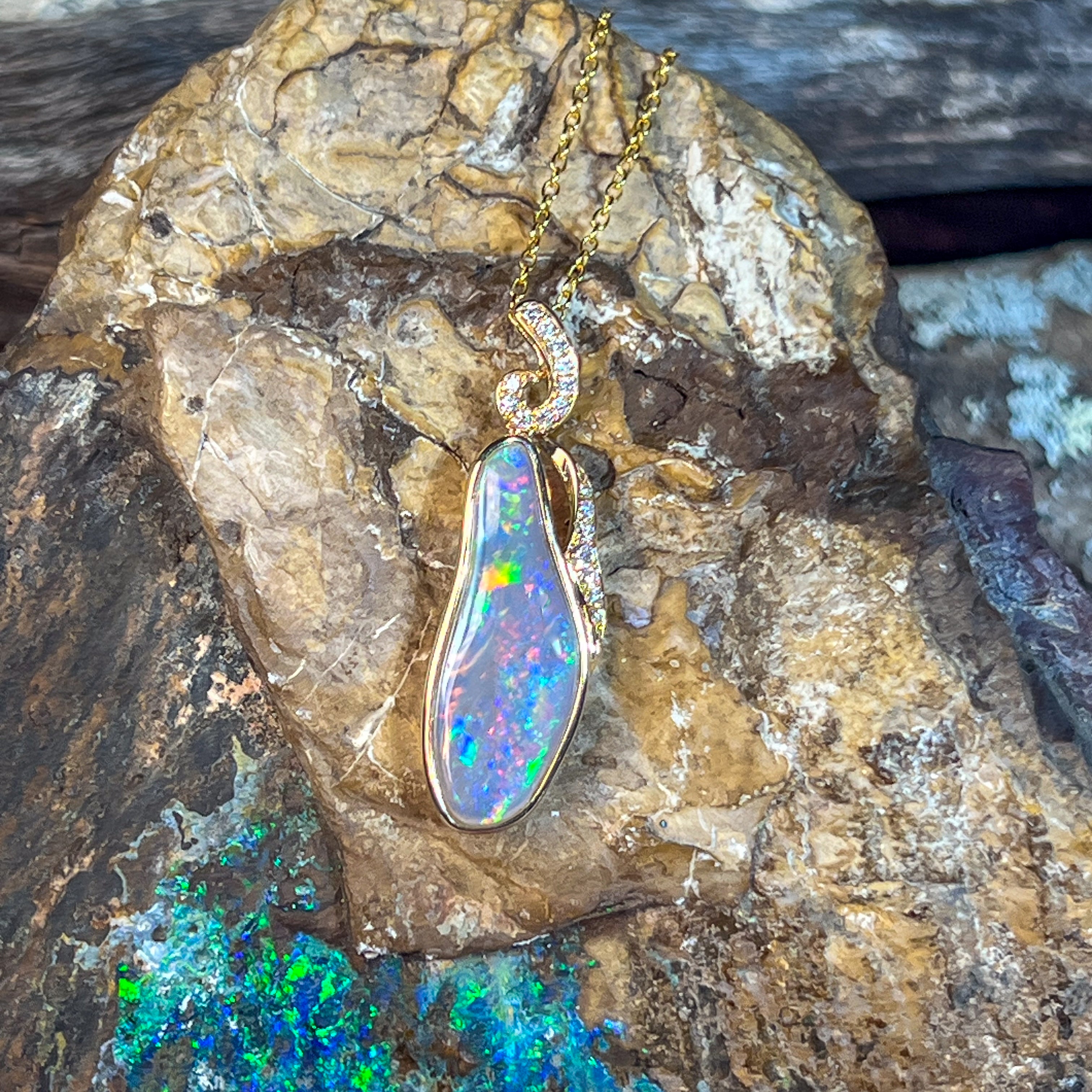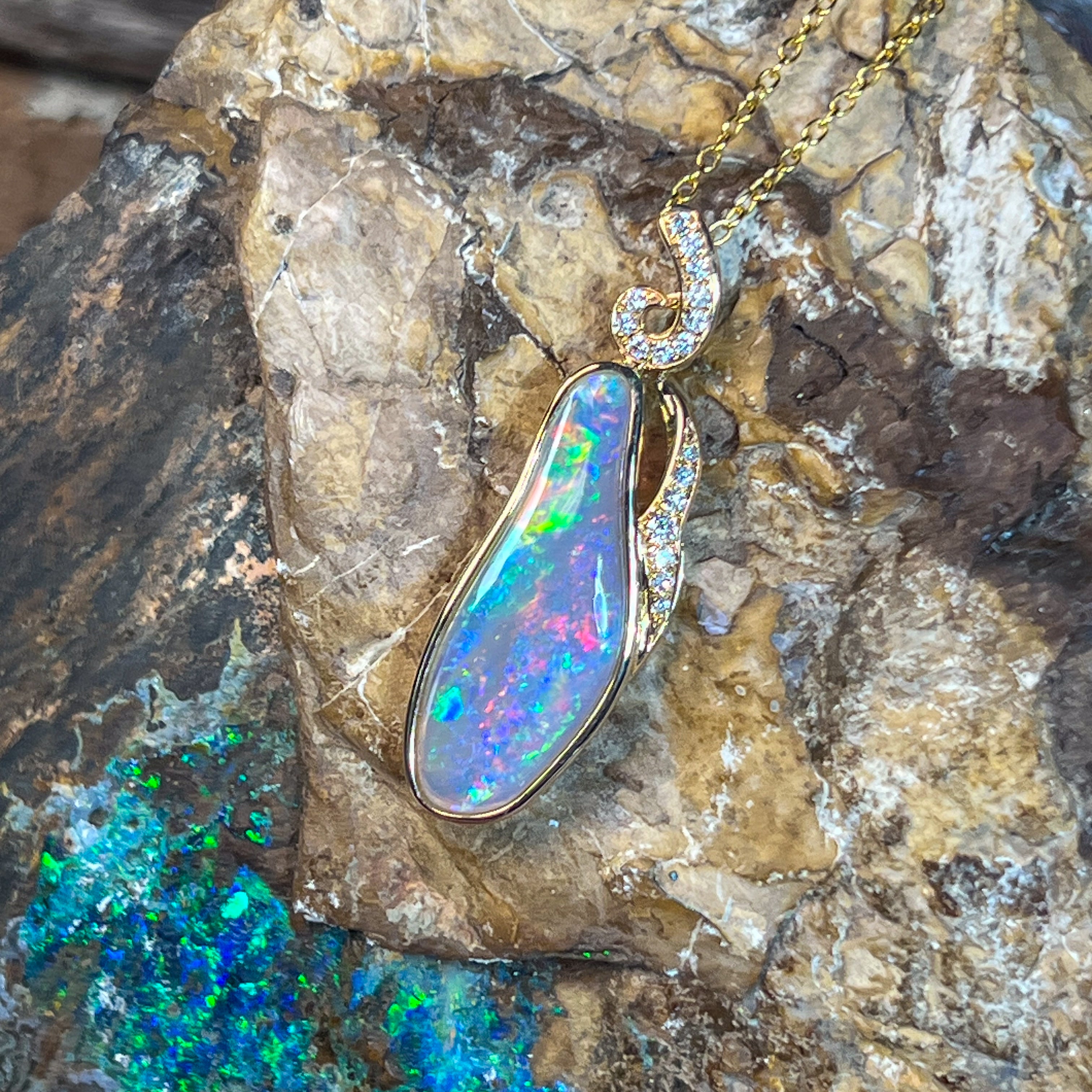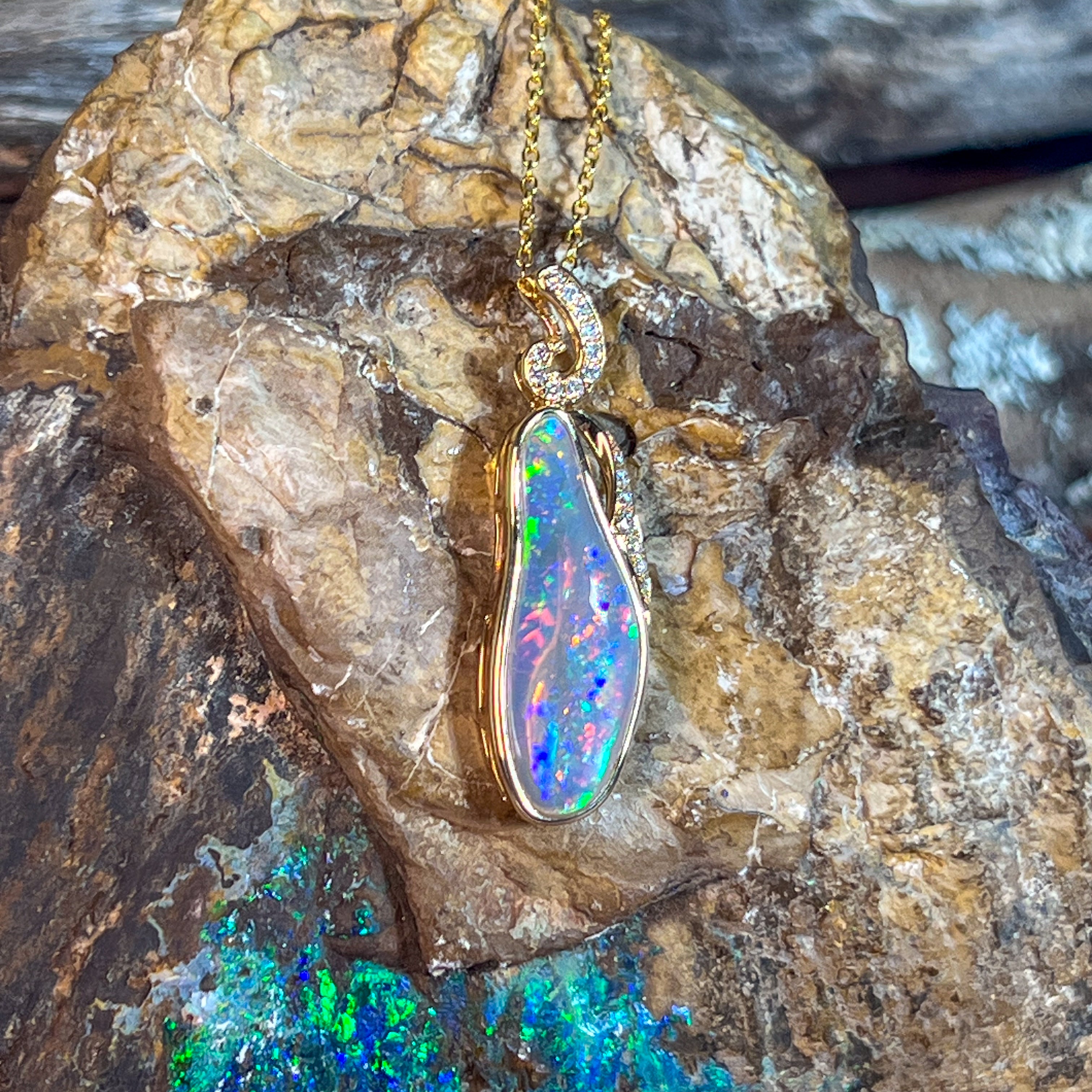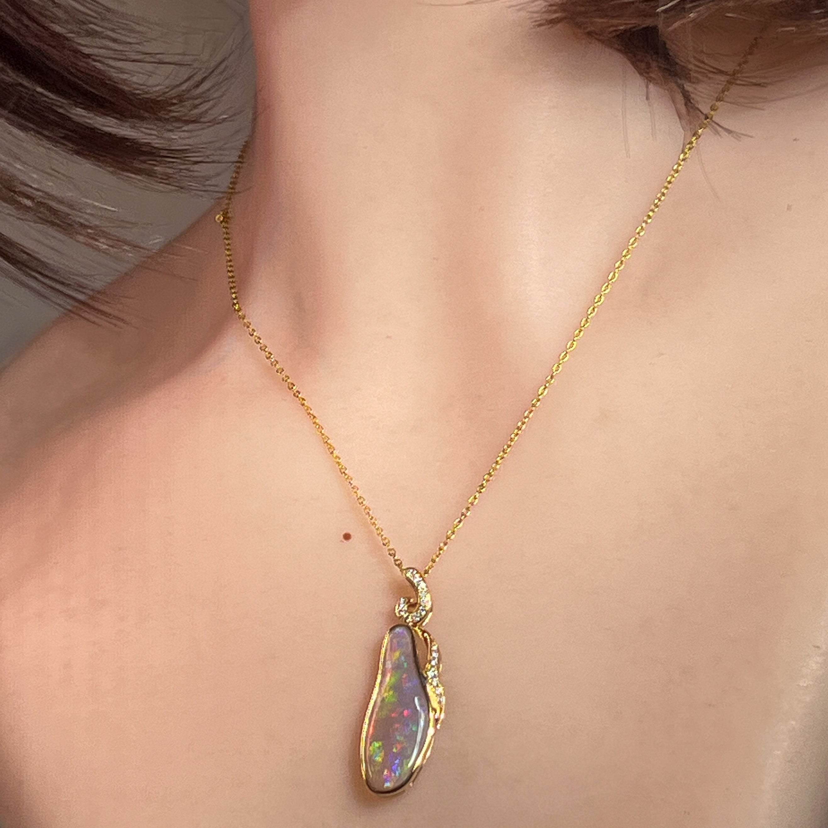 18kt Yellow Gold Red Purple Crystal Opal and diamond pendant