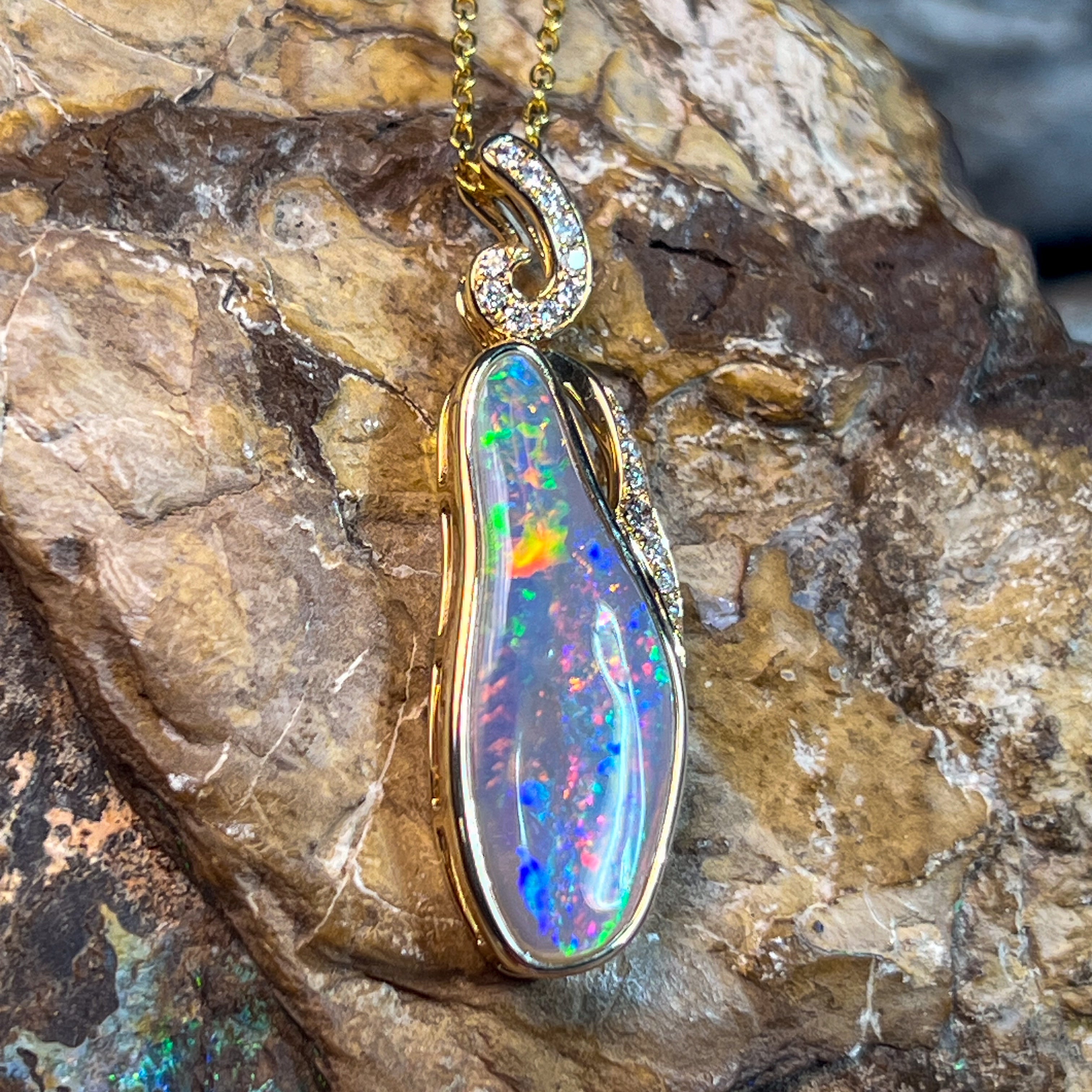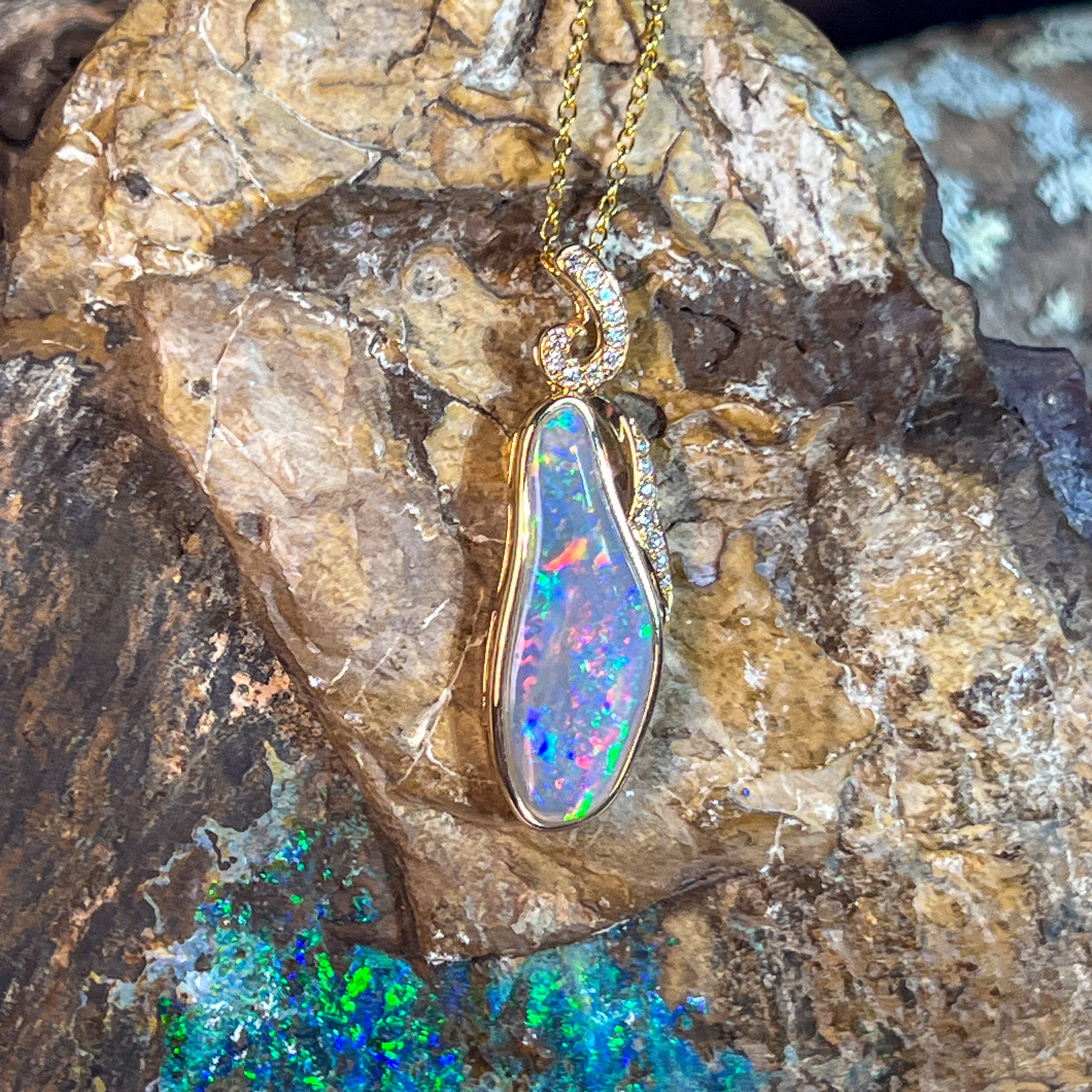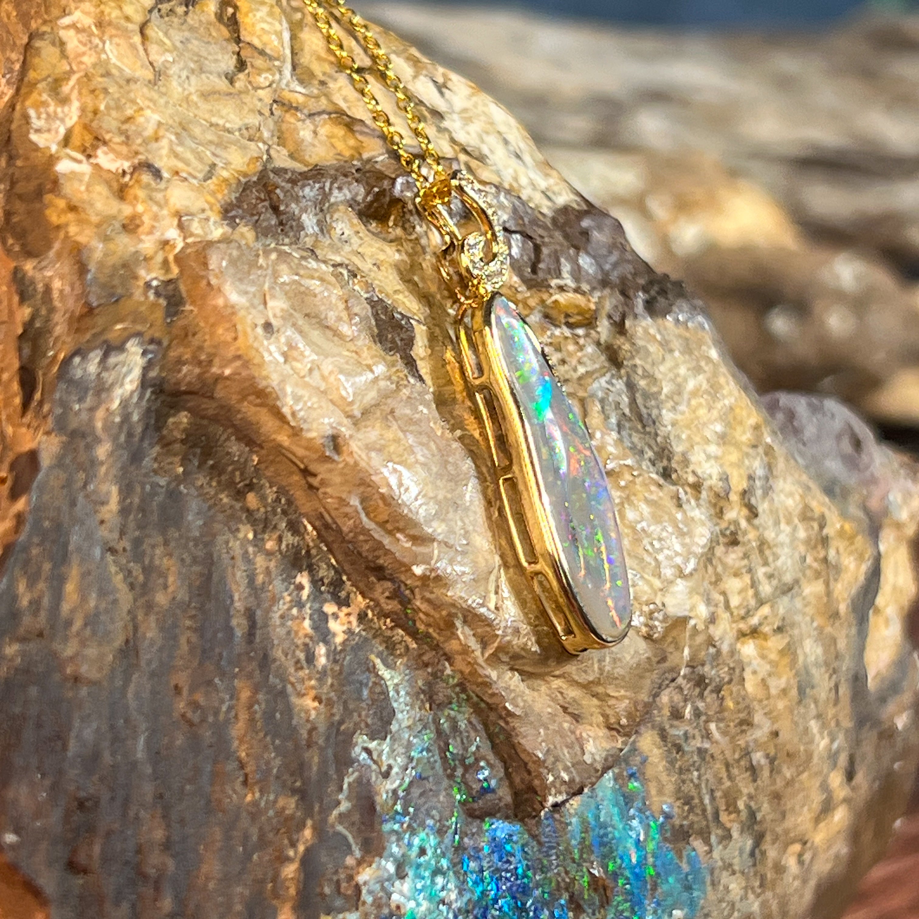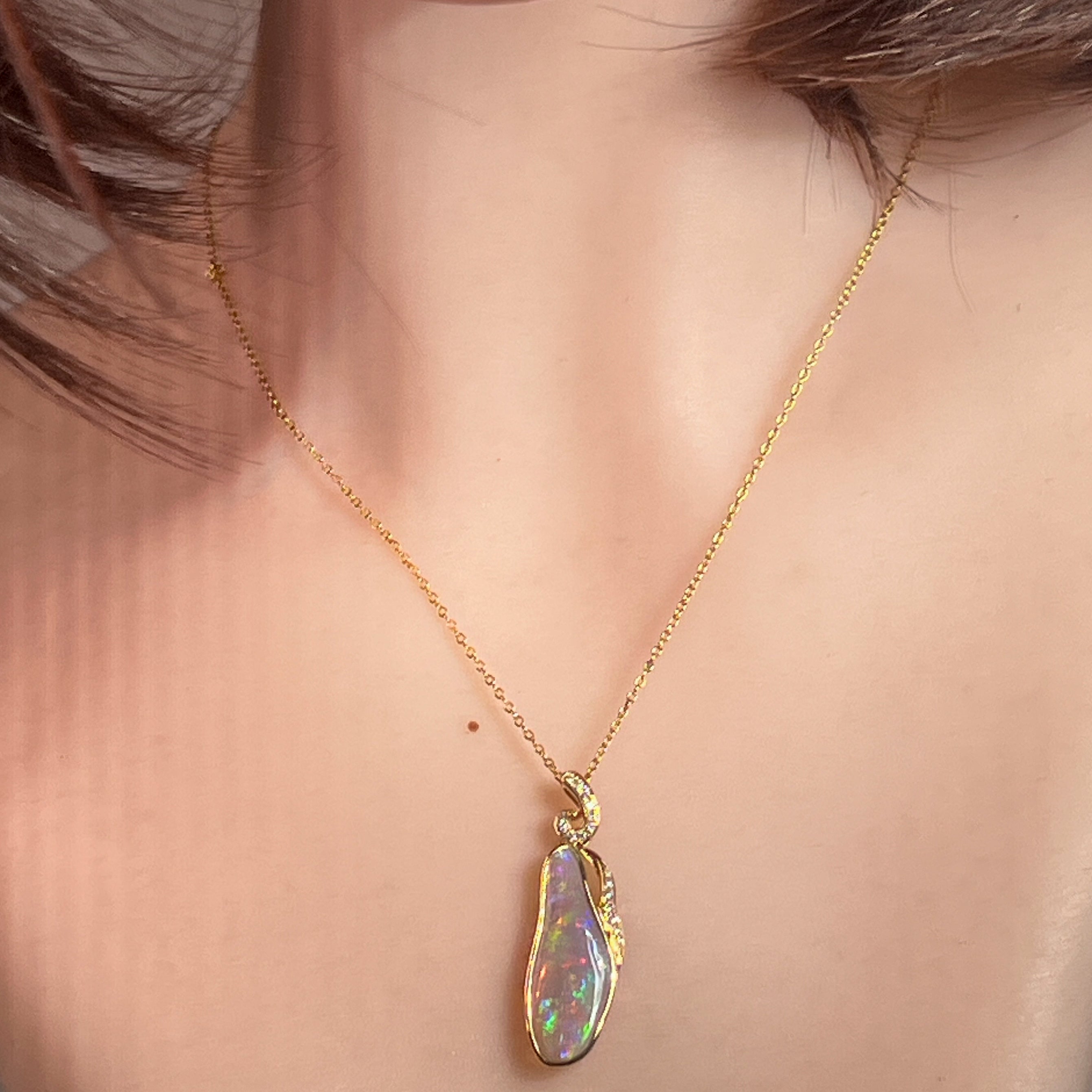 18kt Yellow Gold Red Purple Crystal Opal and diamond pendant