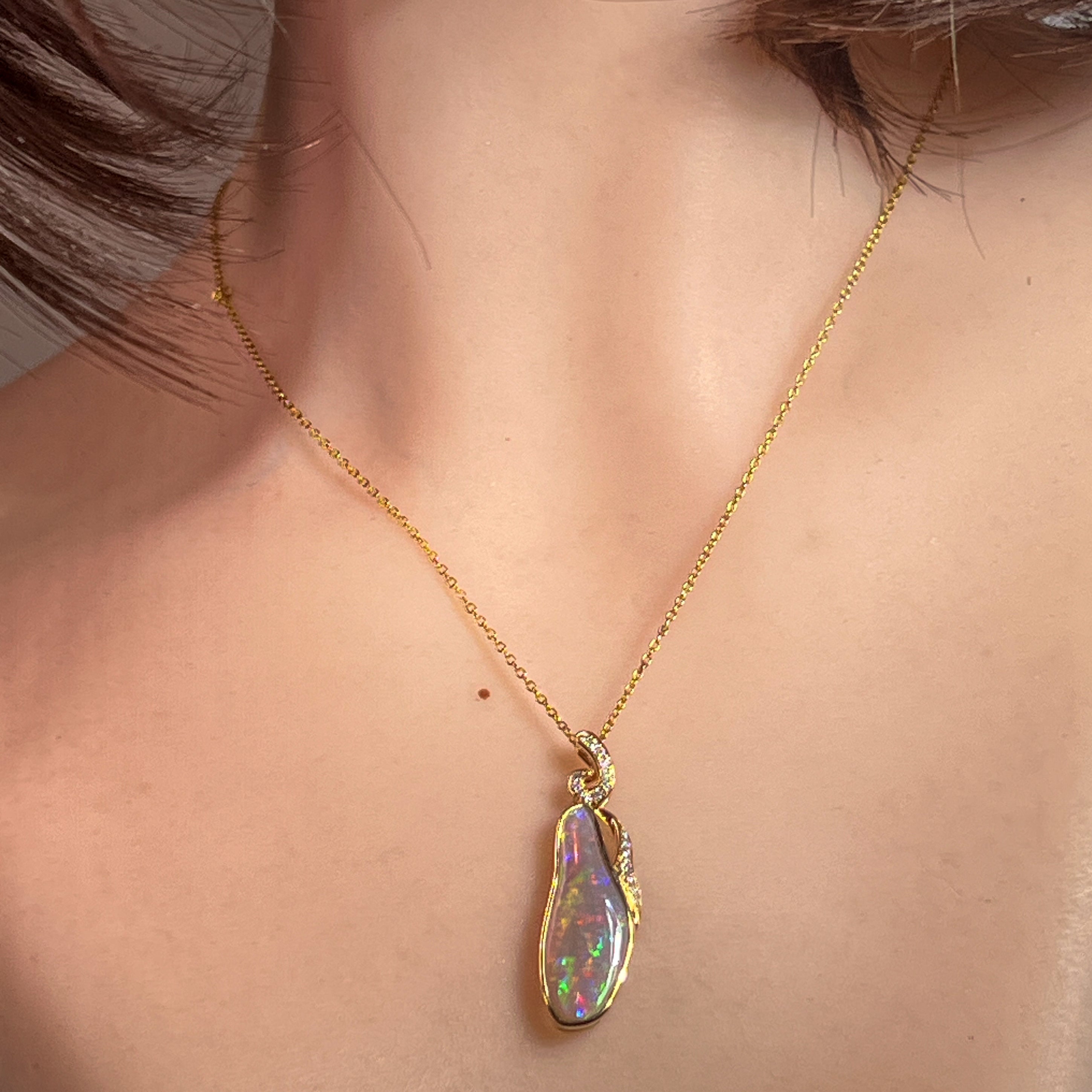 Elevate your elegance with this 18kt yellow gold pendant featuring a stunning red-purple crystal opal, accented by sparkling diamonds. Its vibrant colors and luxurious design make it a captivating statement piece, perfect for adding a touch of sophistication to any outfit. Crafted to catch the light and attention, this pendant transforms your look with timeless beauty and refined charm.