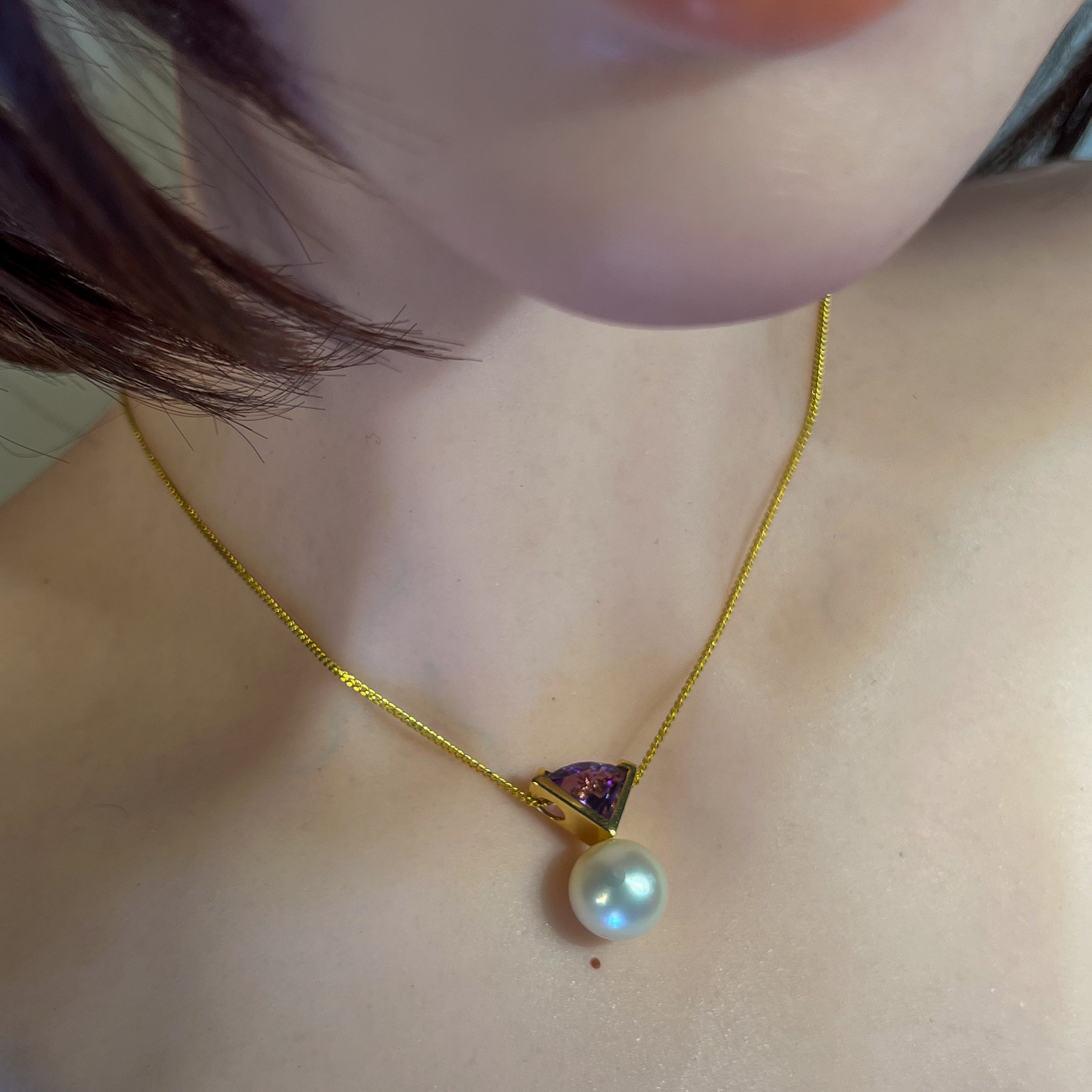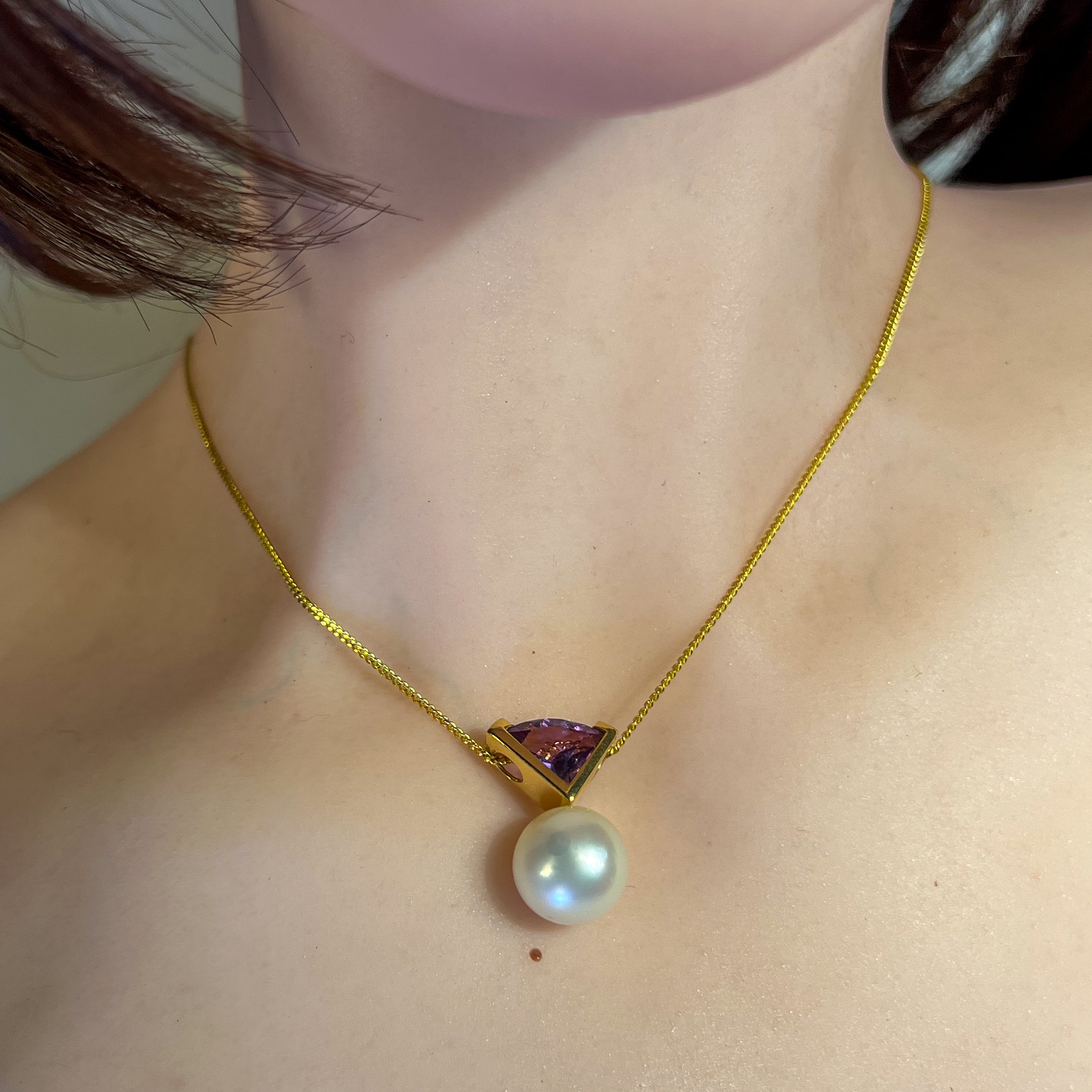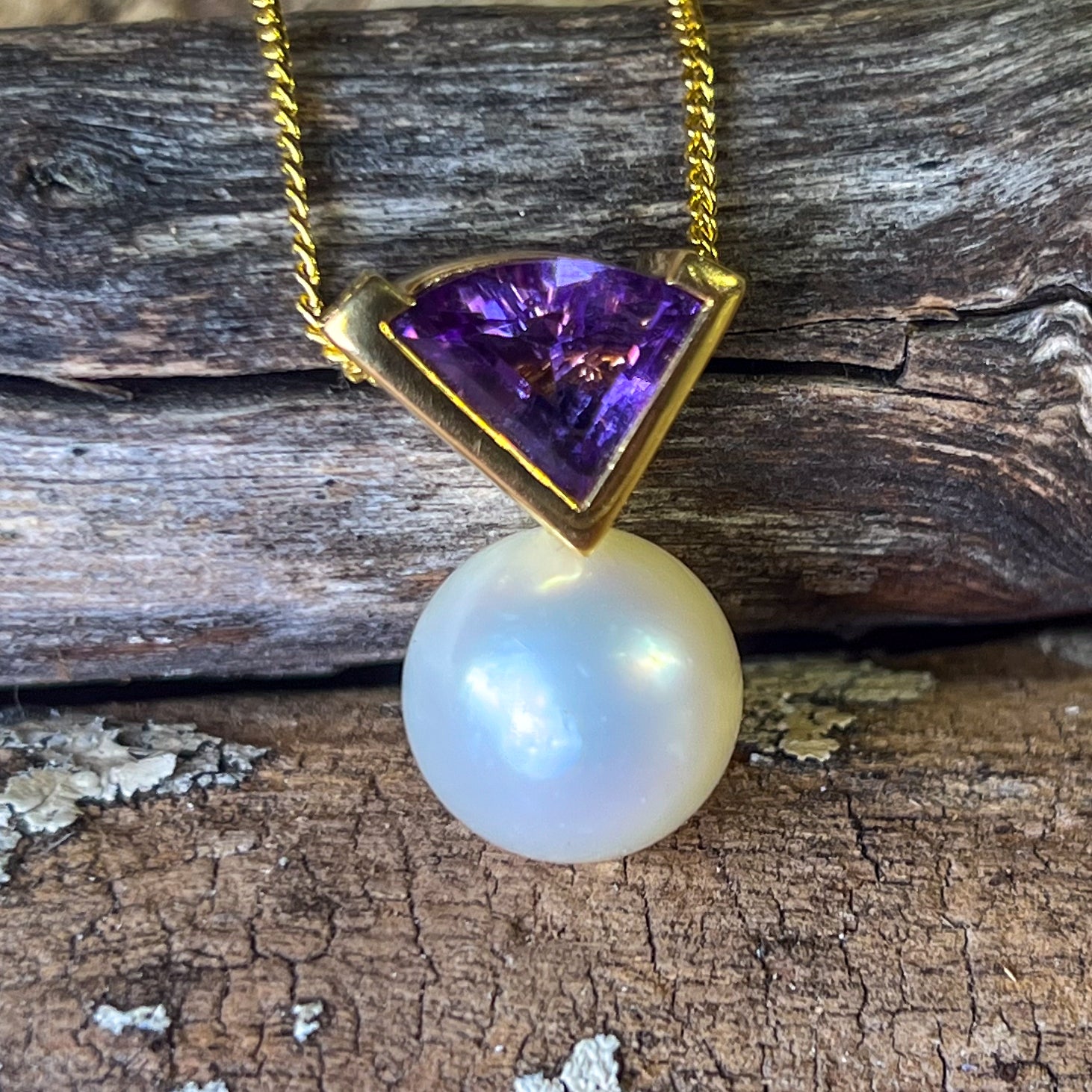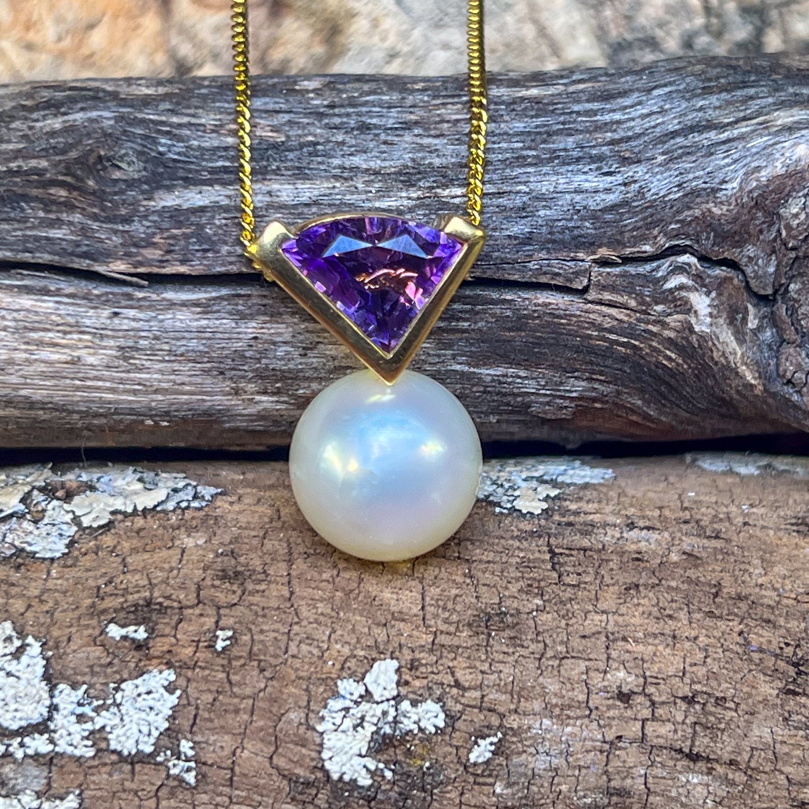 This luxurious pendant features a rare 14mm South Sea pearl suspended in a contemporary 18kt yellow gold setting. The vibrant purple amethyst adds a touch of modern elegance to this one-of-a-kind piece. Upgrade any outfit and make a statement with this unique pendant. Perfect gift for any occasion!
