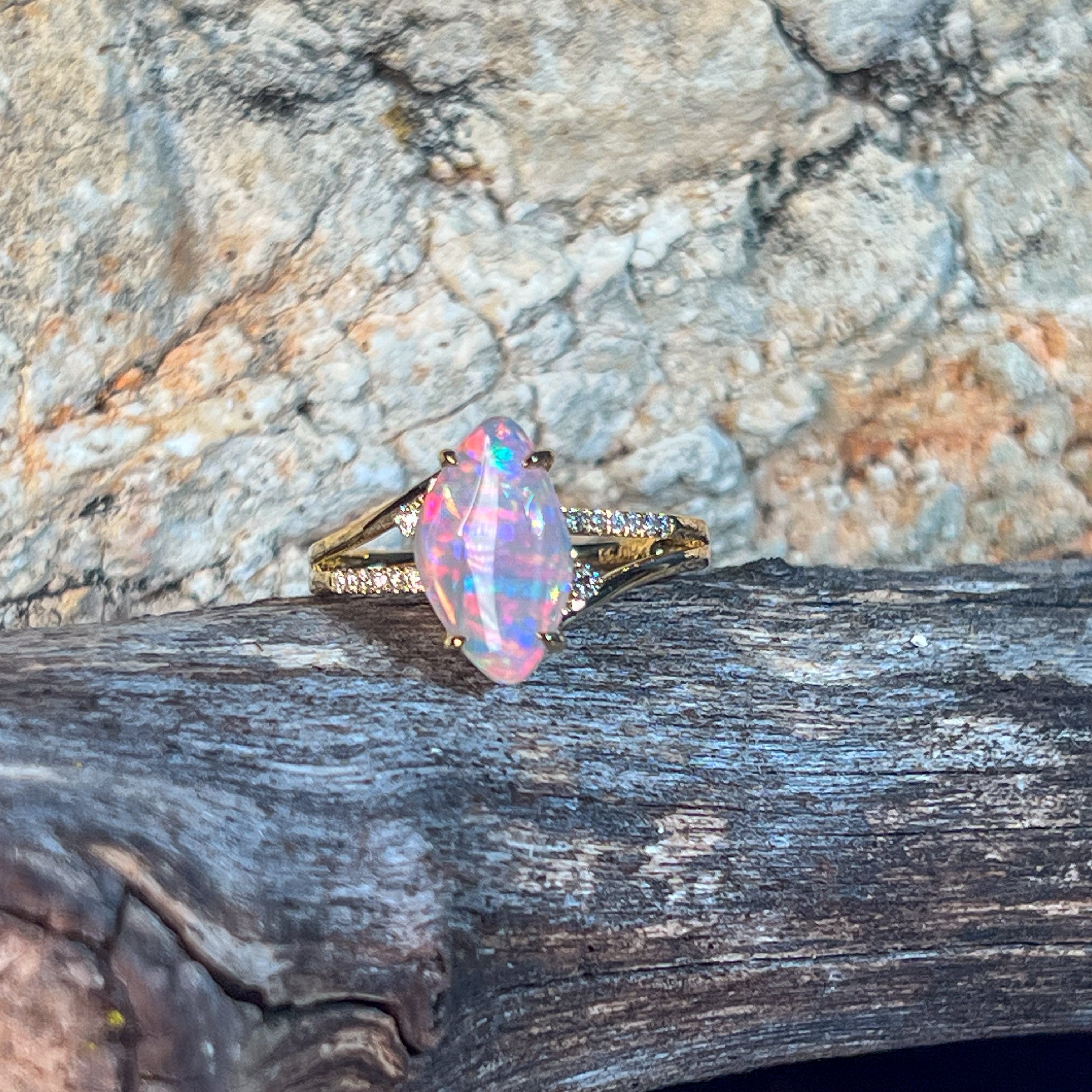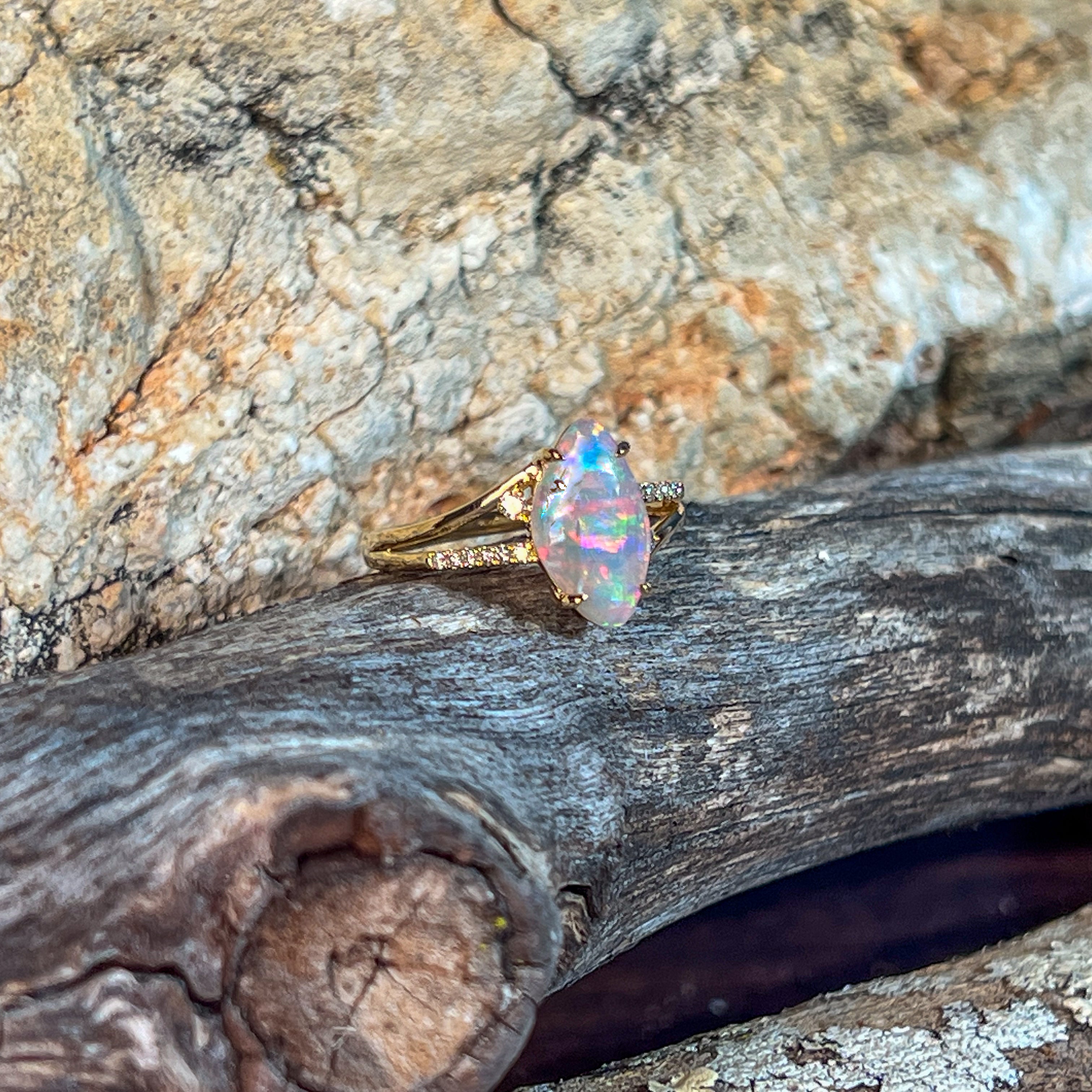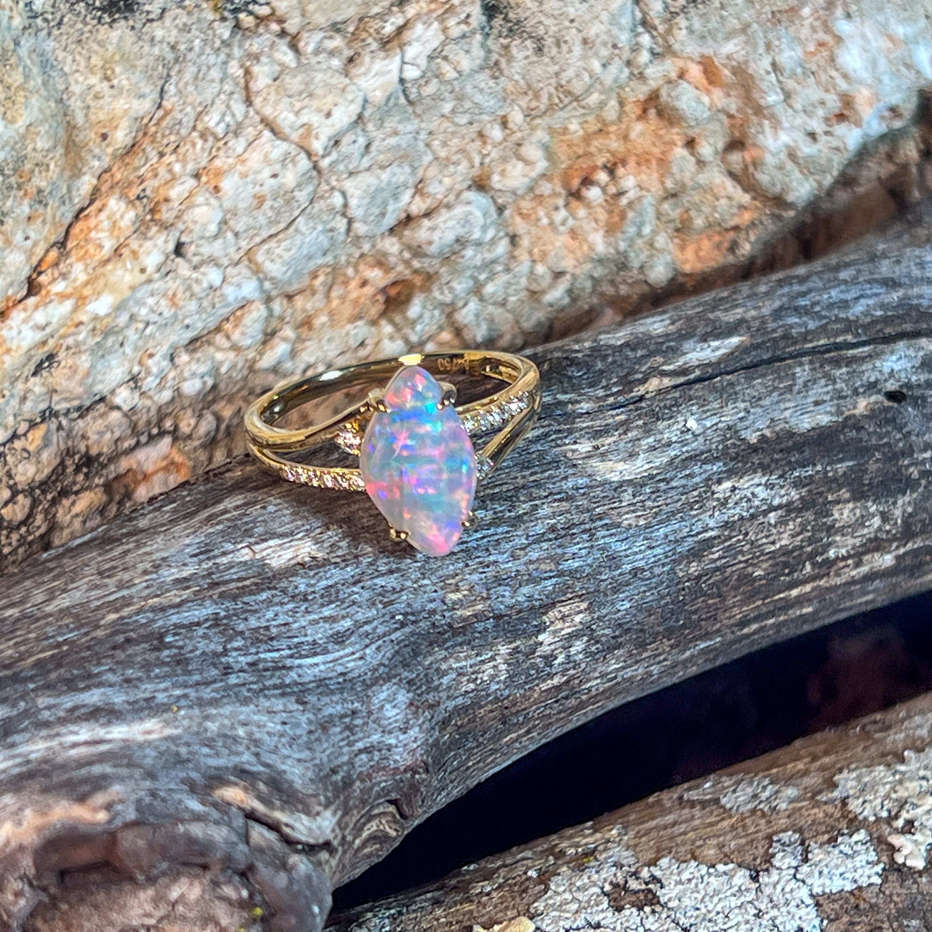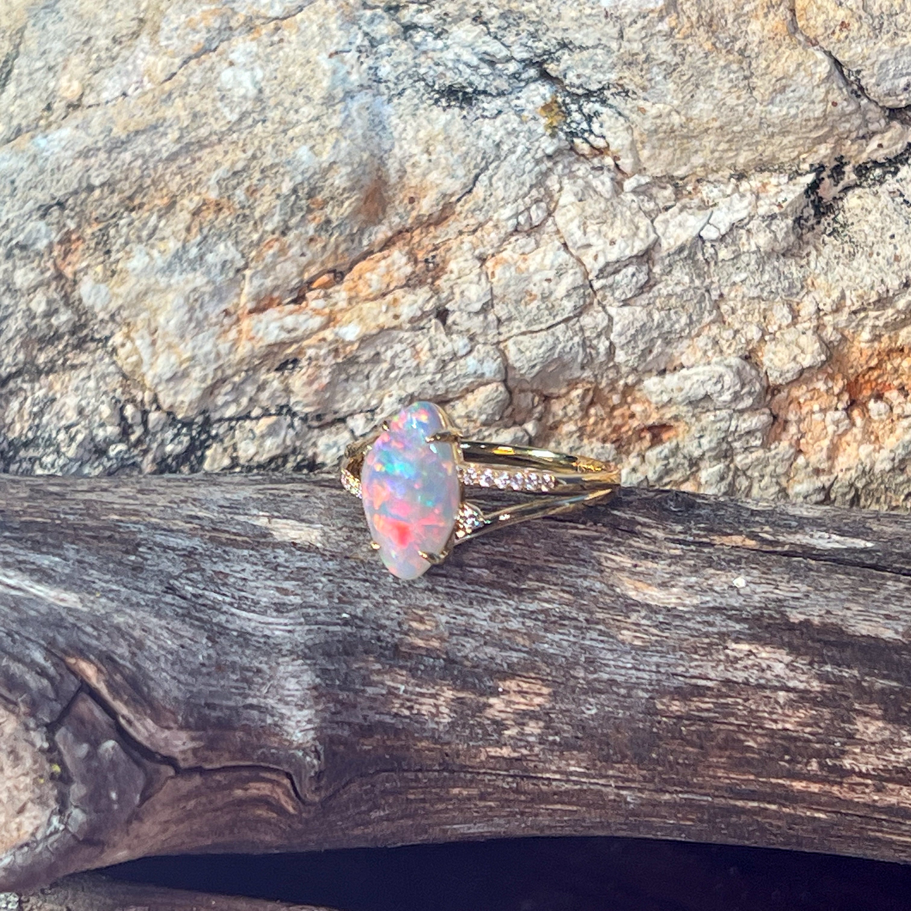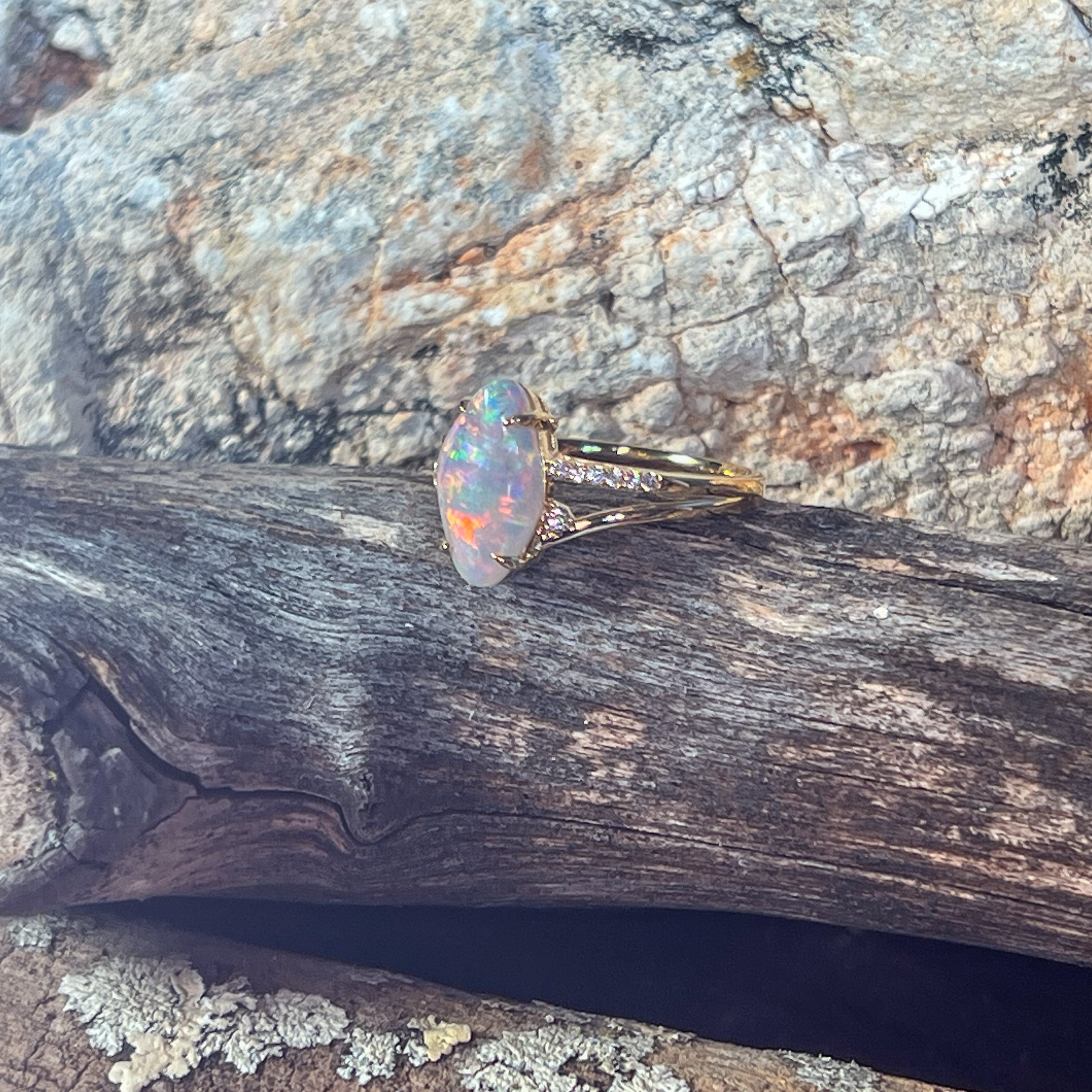 Elevate your style with this stunning 18kt yellow gold split shank ring, featuring a captivating 1.3ct opal surrounded by sparkling diamonds. Its modern design blends elegance with boldness, making it the perfect statement piece for any cocktail event. Experience the allure of vibrant opal hues paired with the brilliance of diamonds, crafted to enhance your confidence and charm.