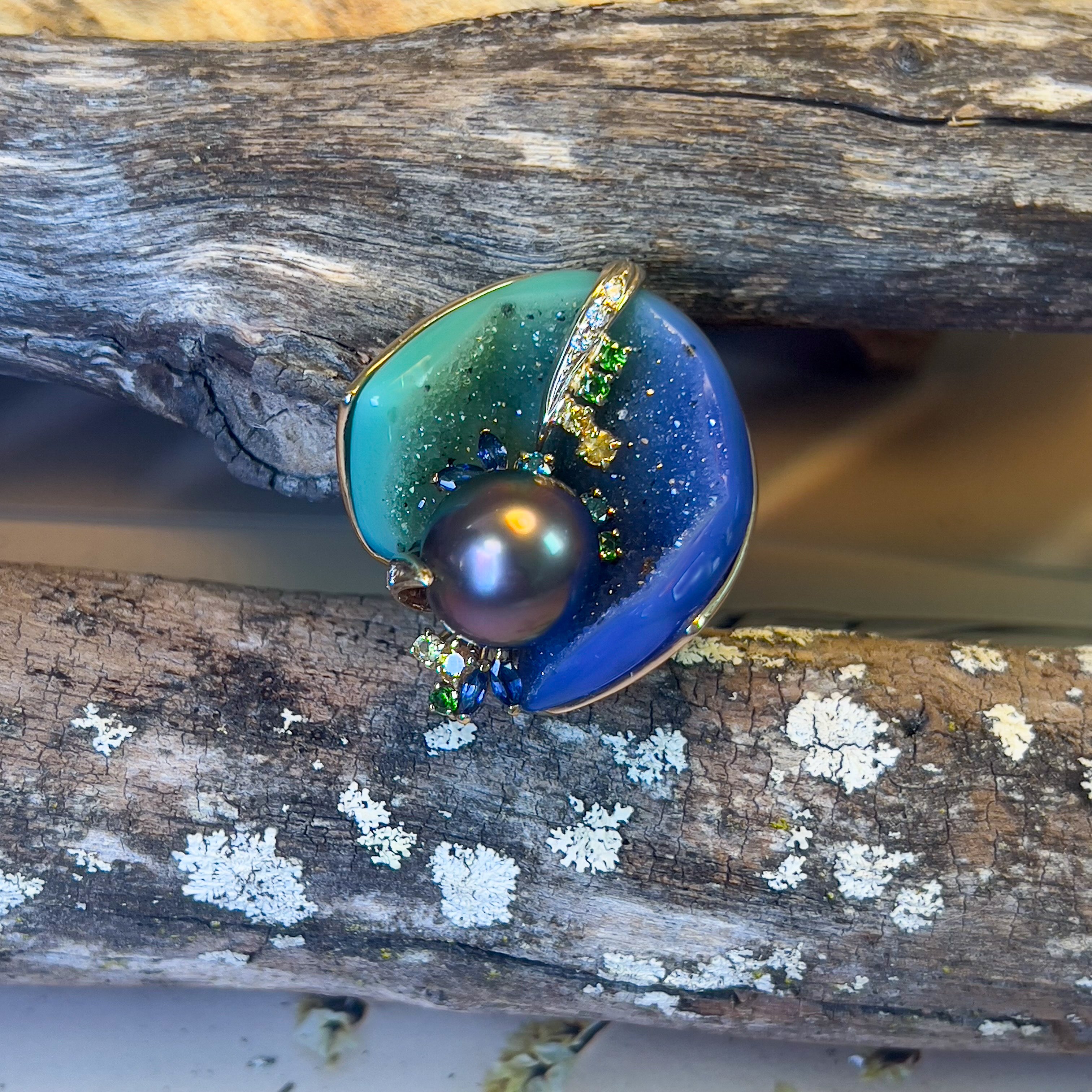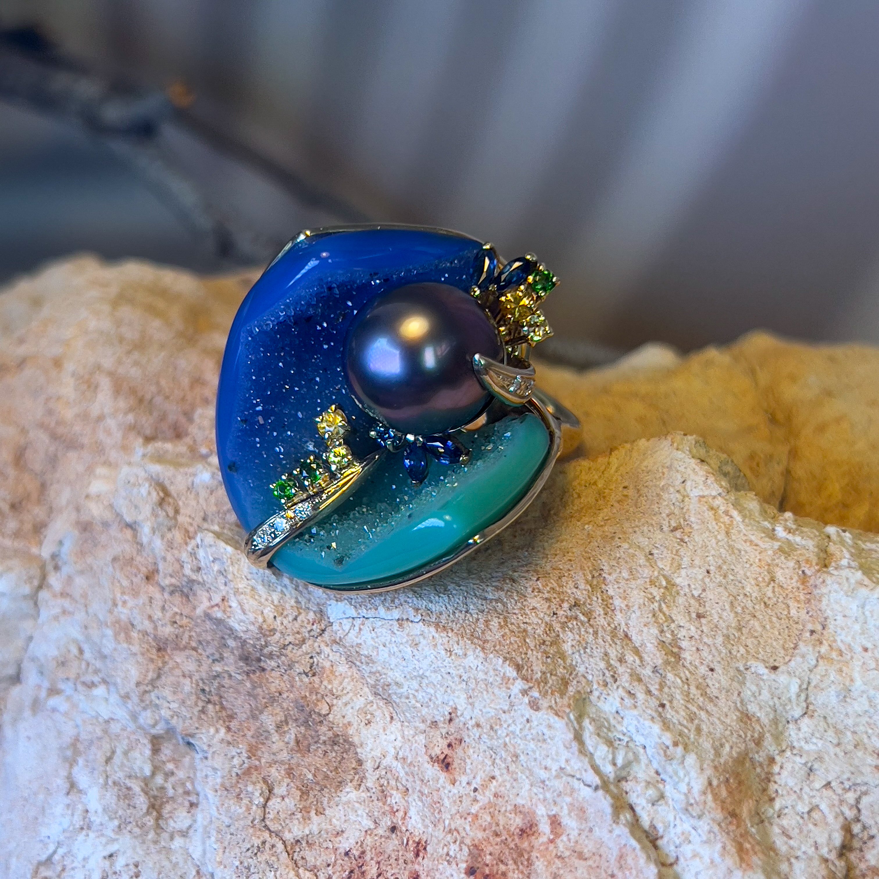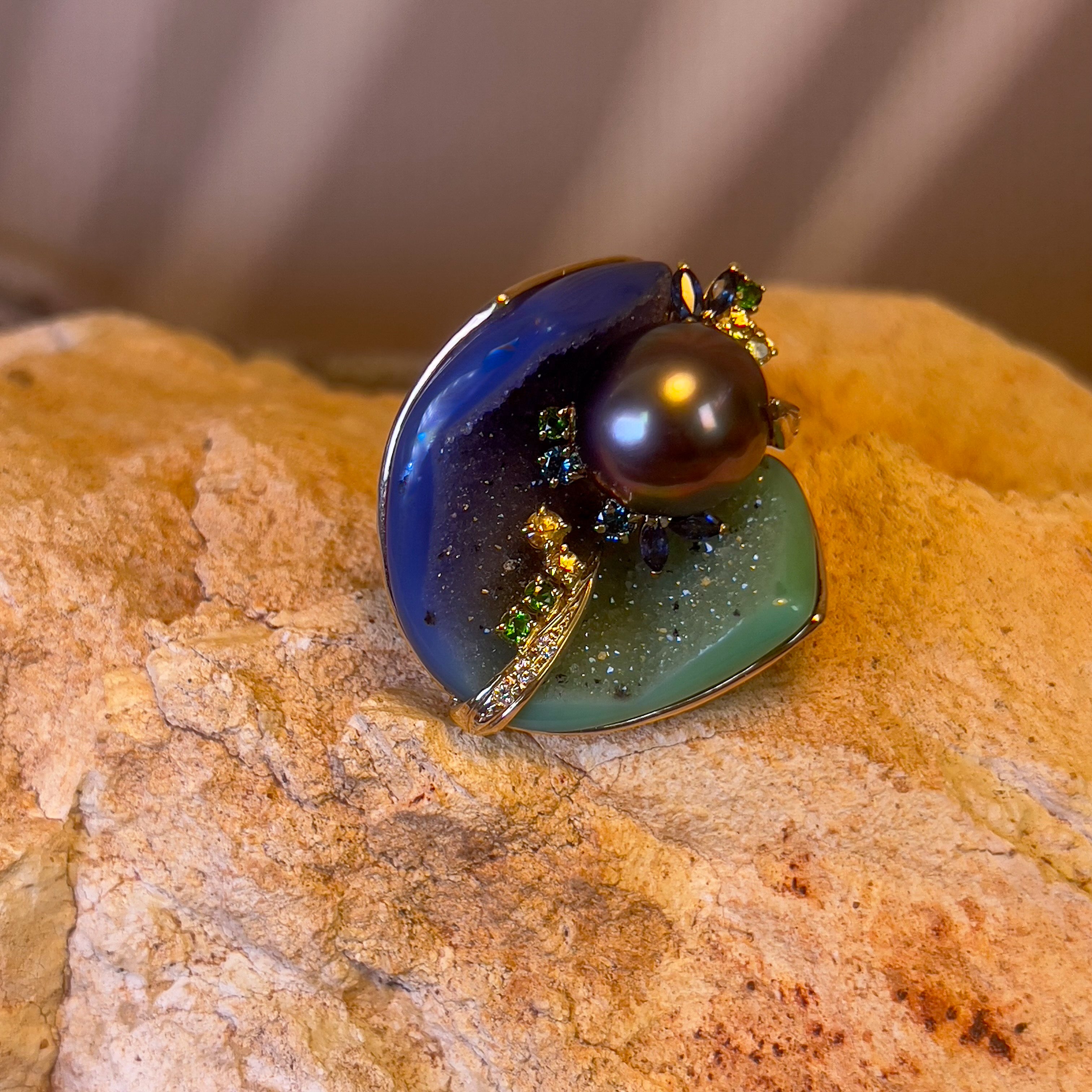 18kt Yellow Gold Tahitian Pearl ,Agate, diamond and sapphire ring