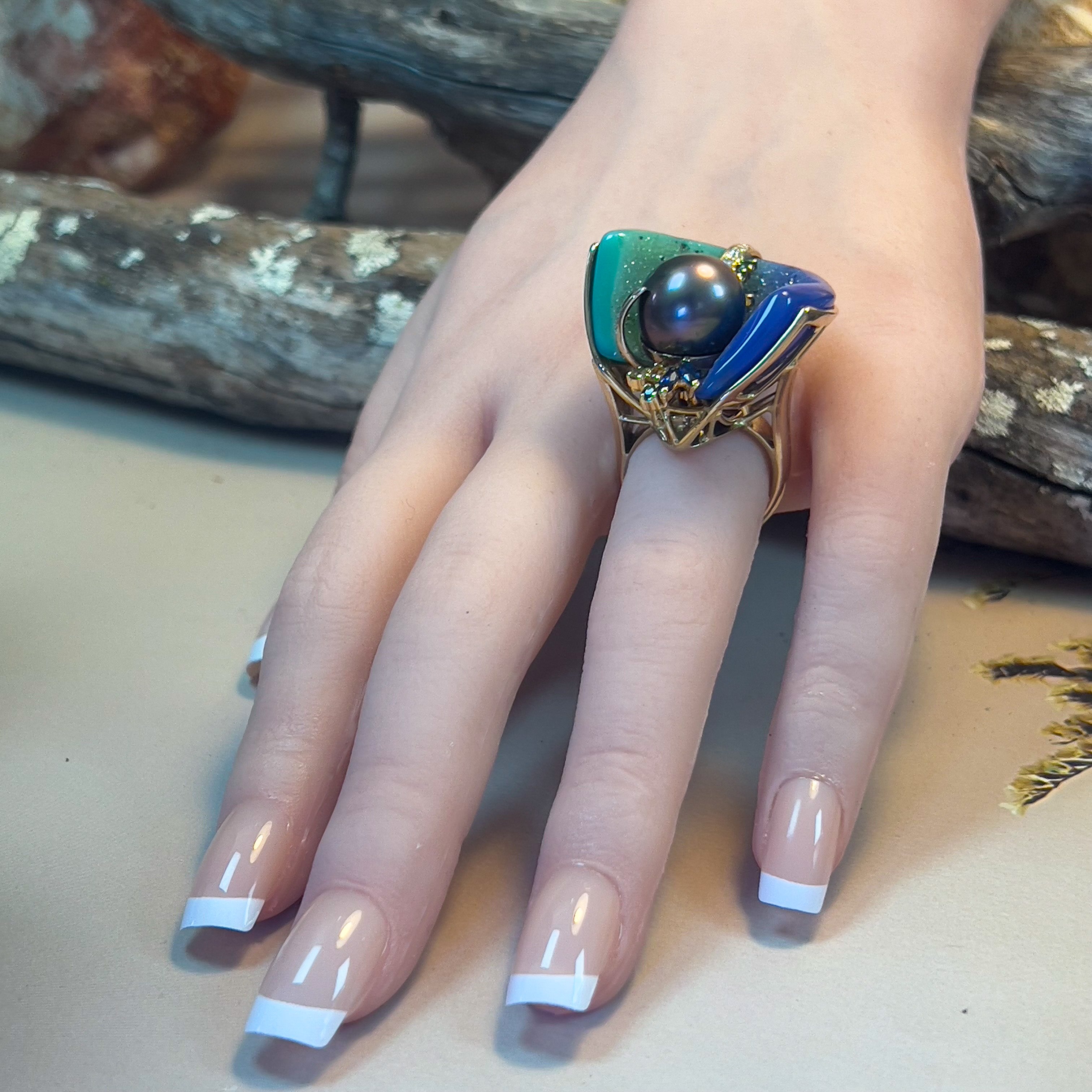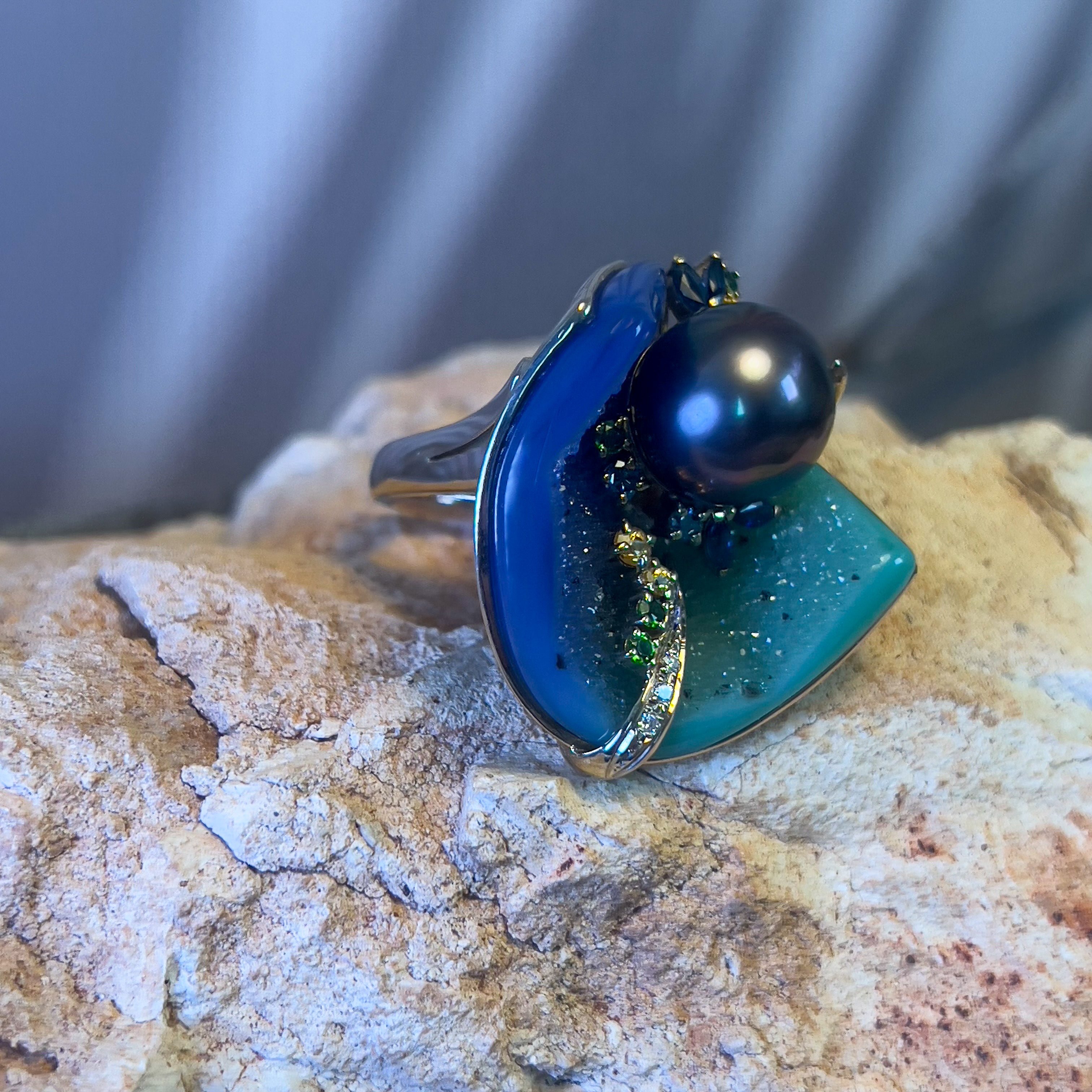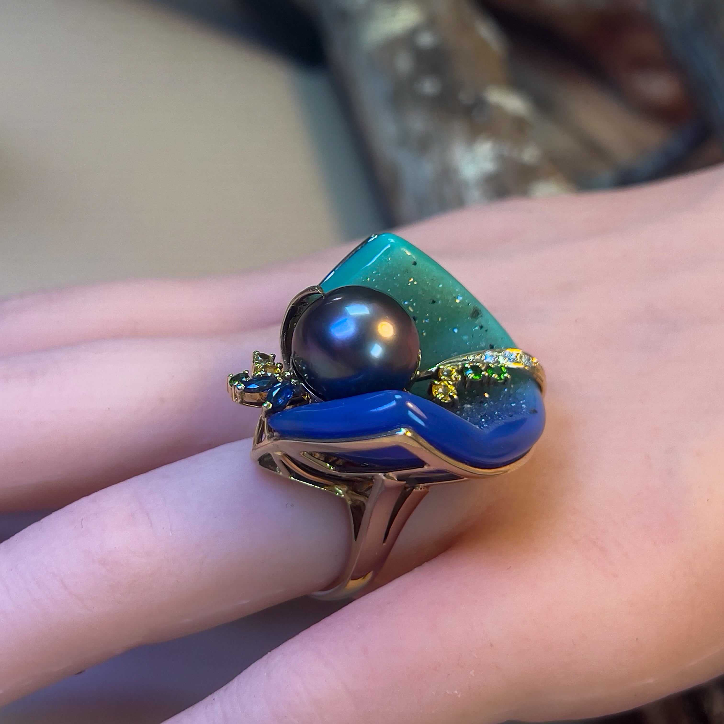 18kt Yellow Gold Tahitian Pearl ,Agate, diamond and sapphire ring