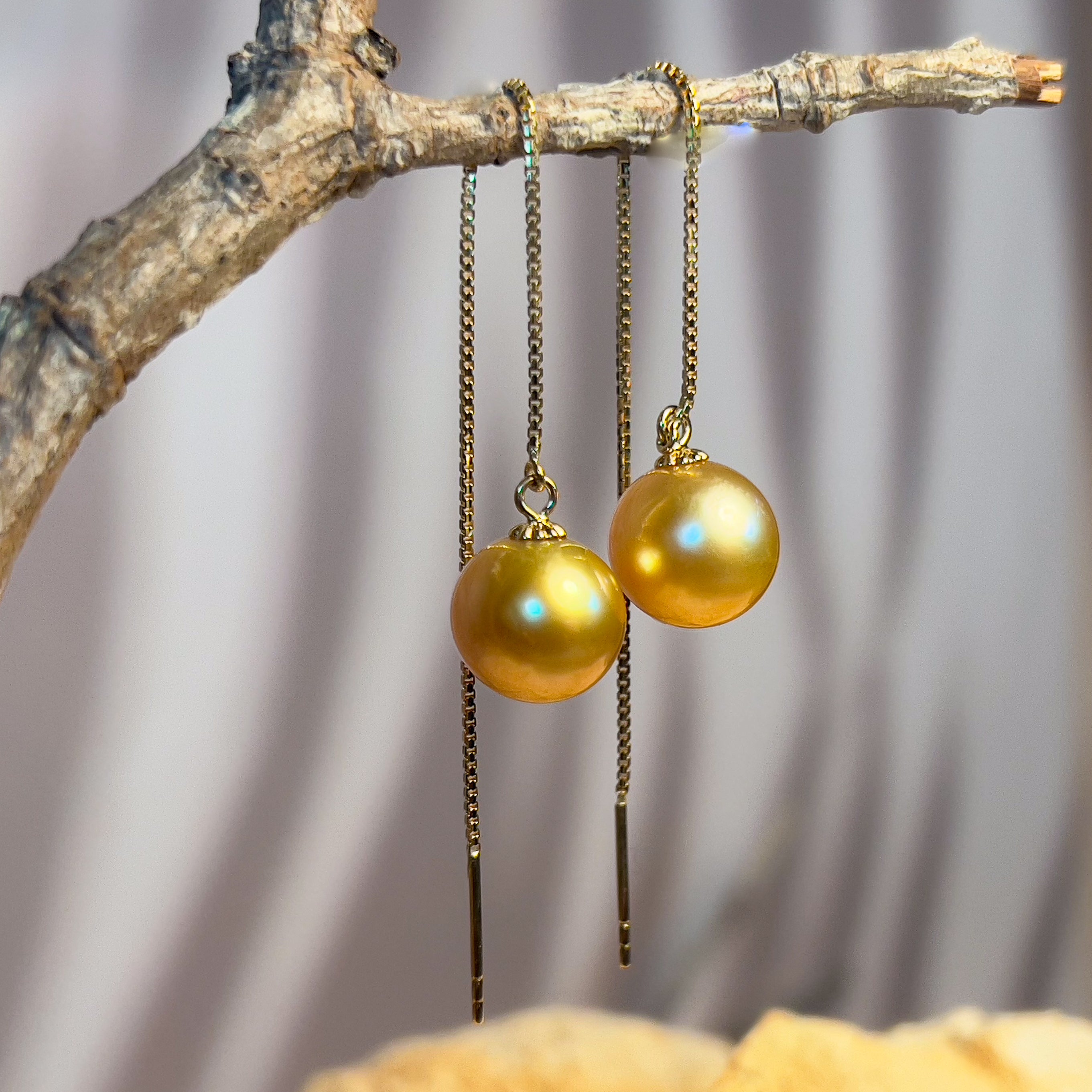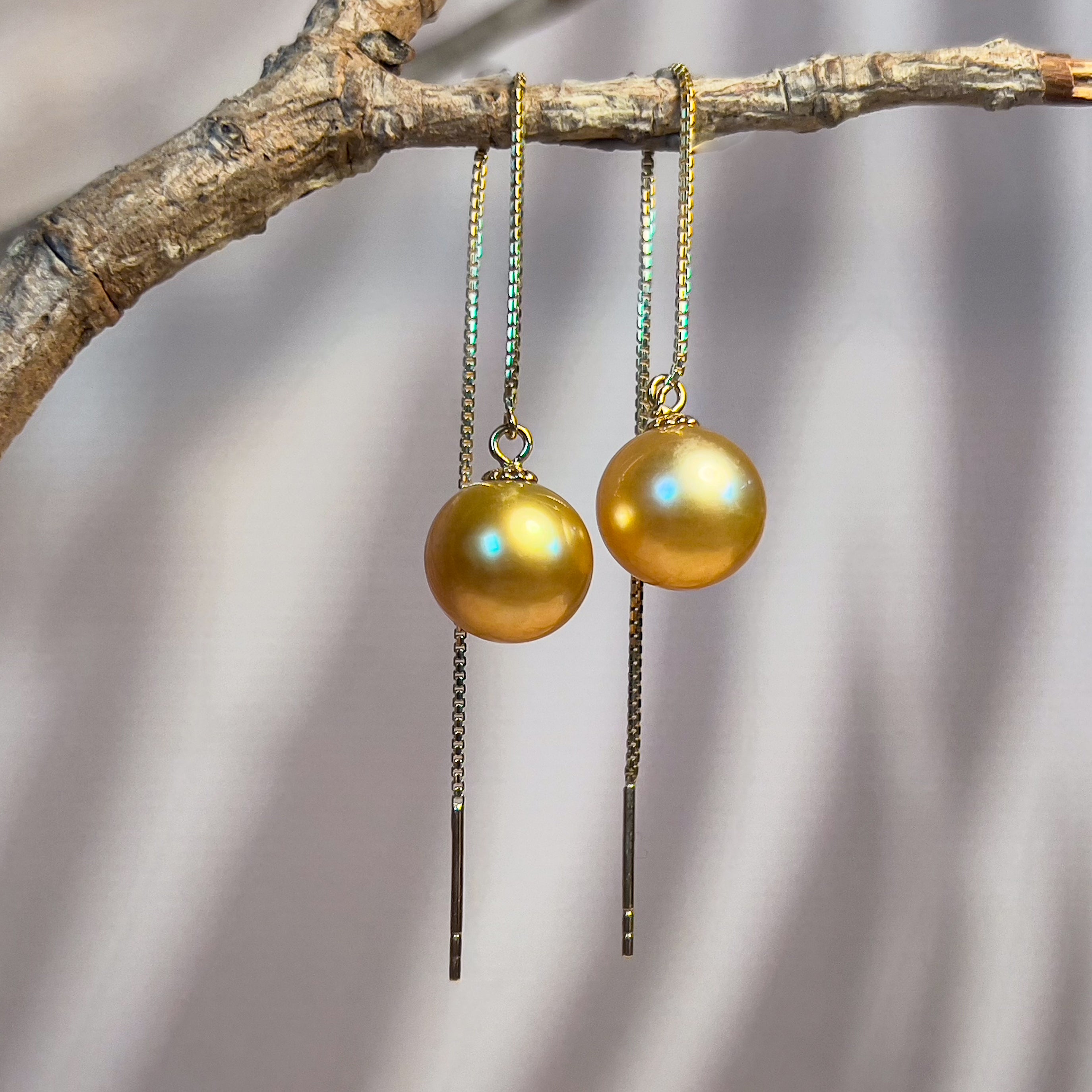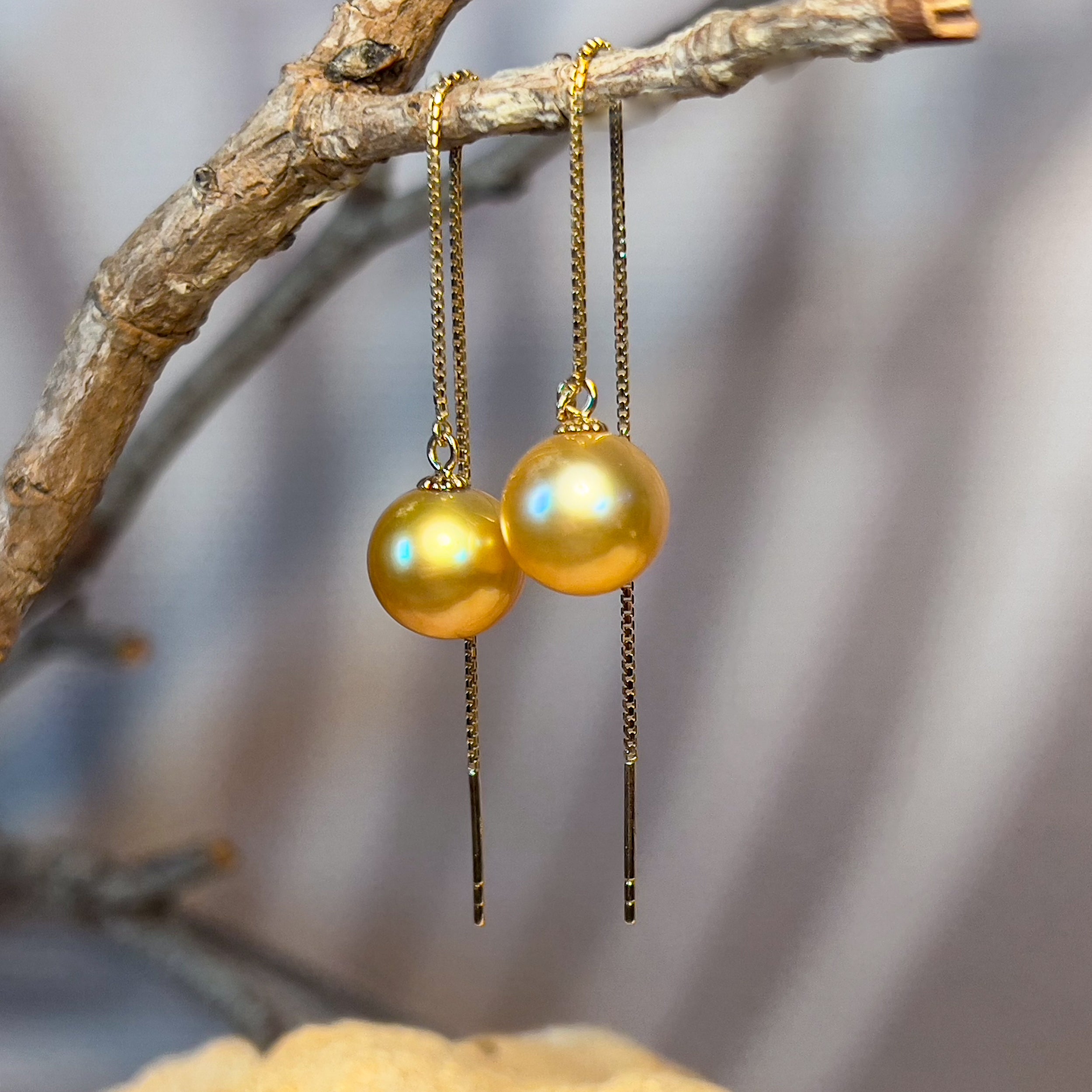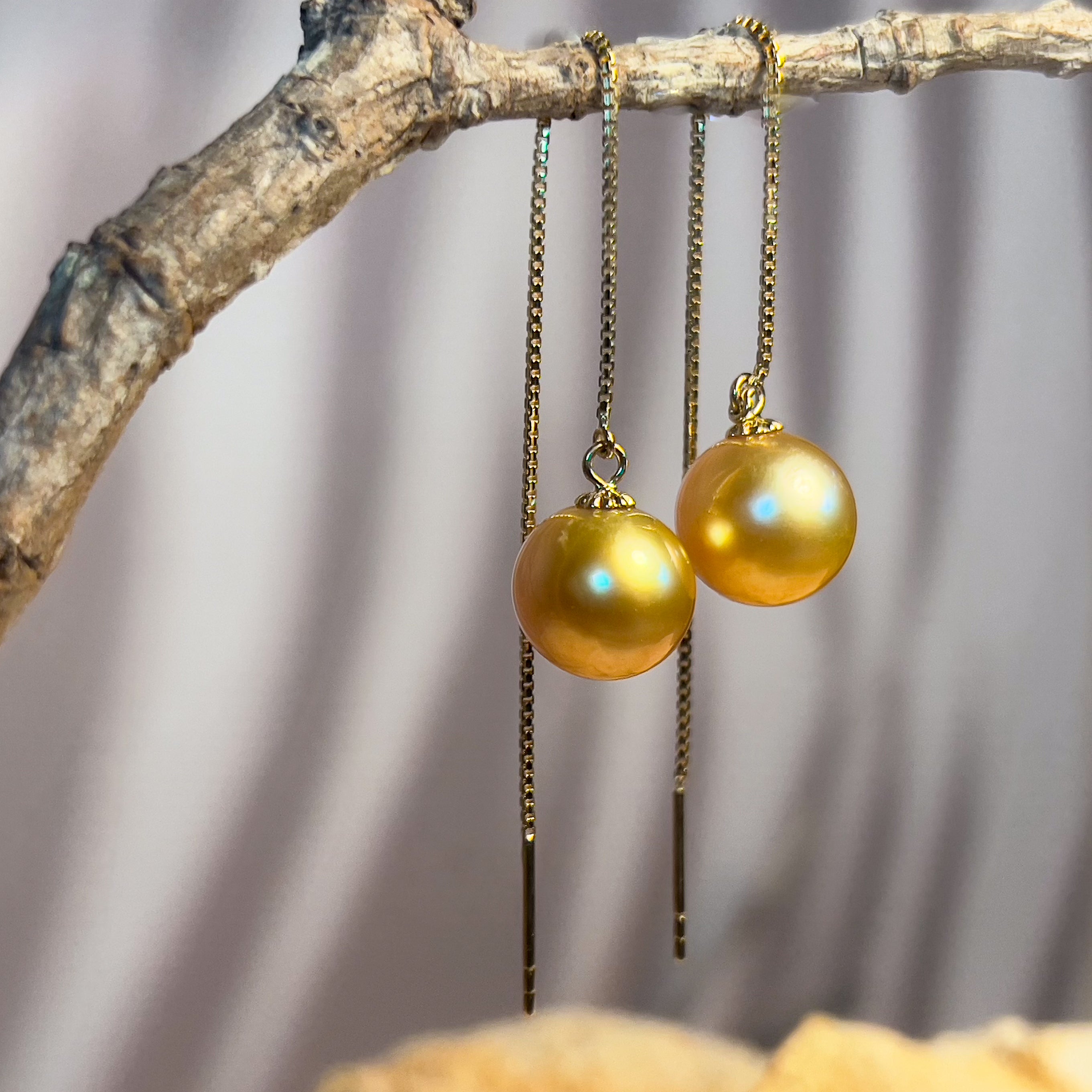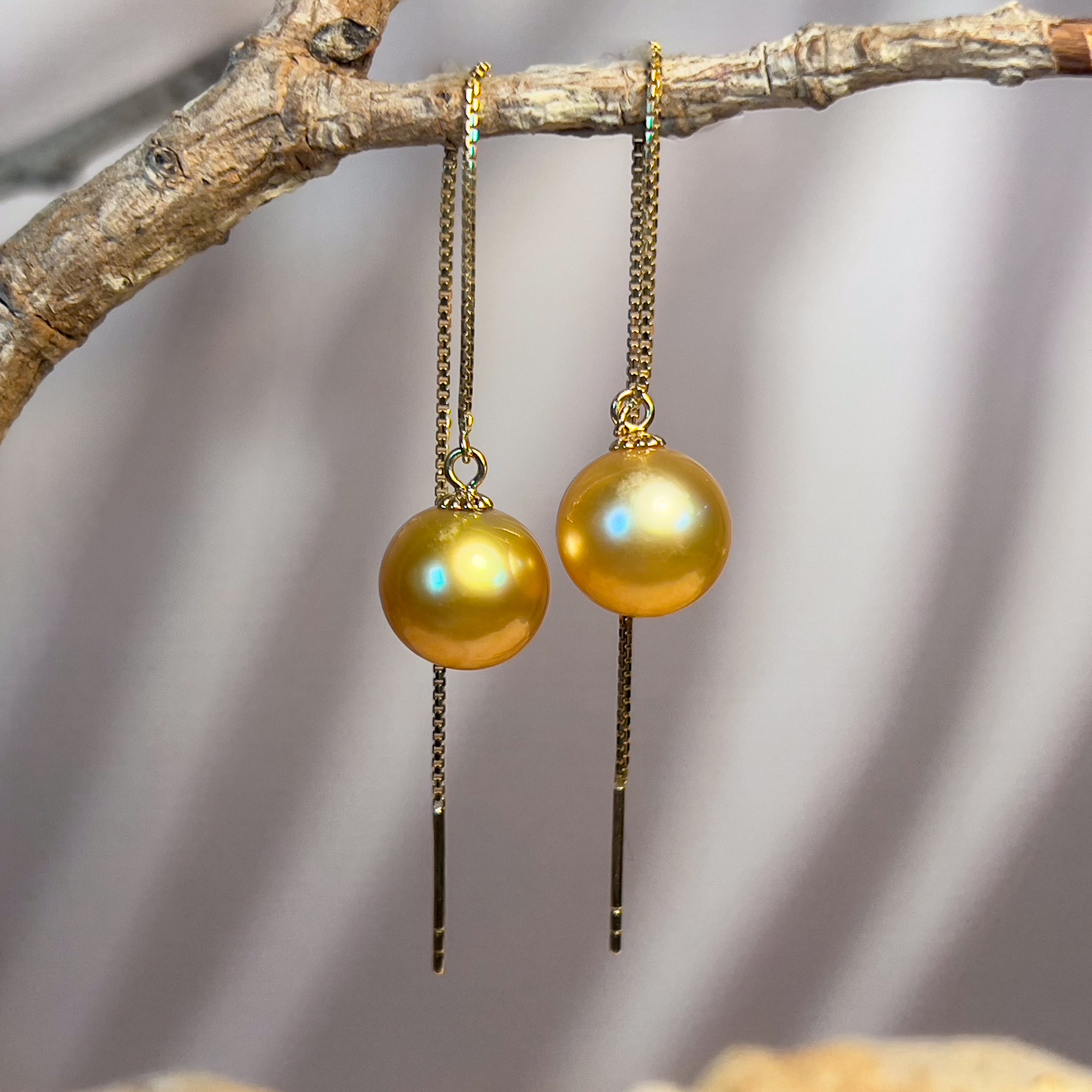 18kt Yellow Gold thread through dangling Golden South Sea 10-10.5mm earrings
