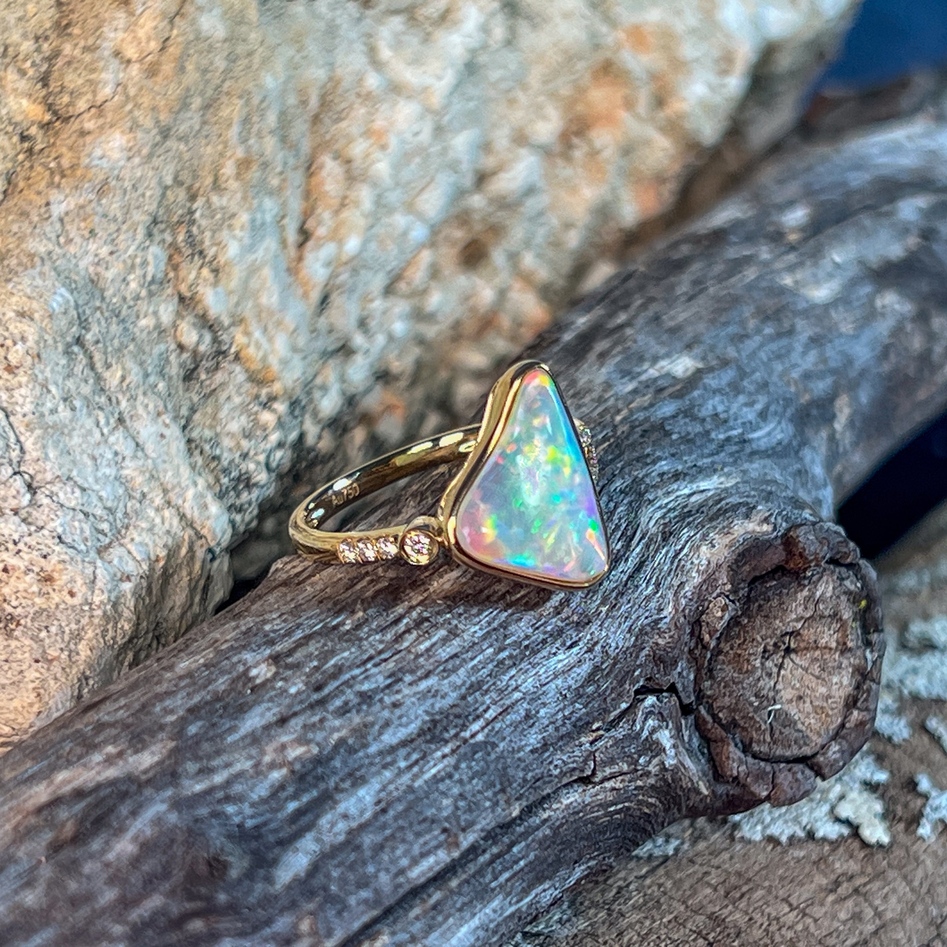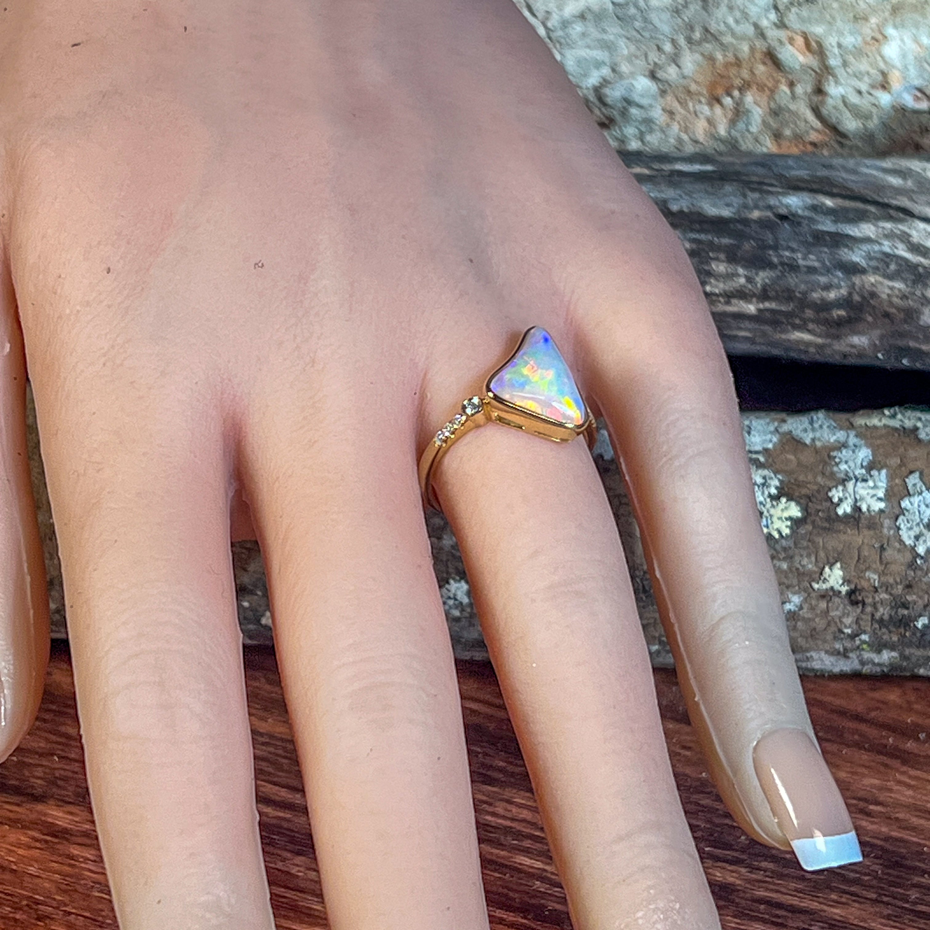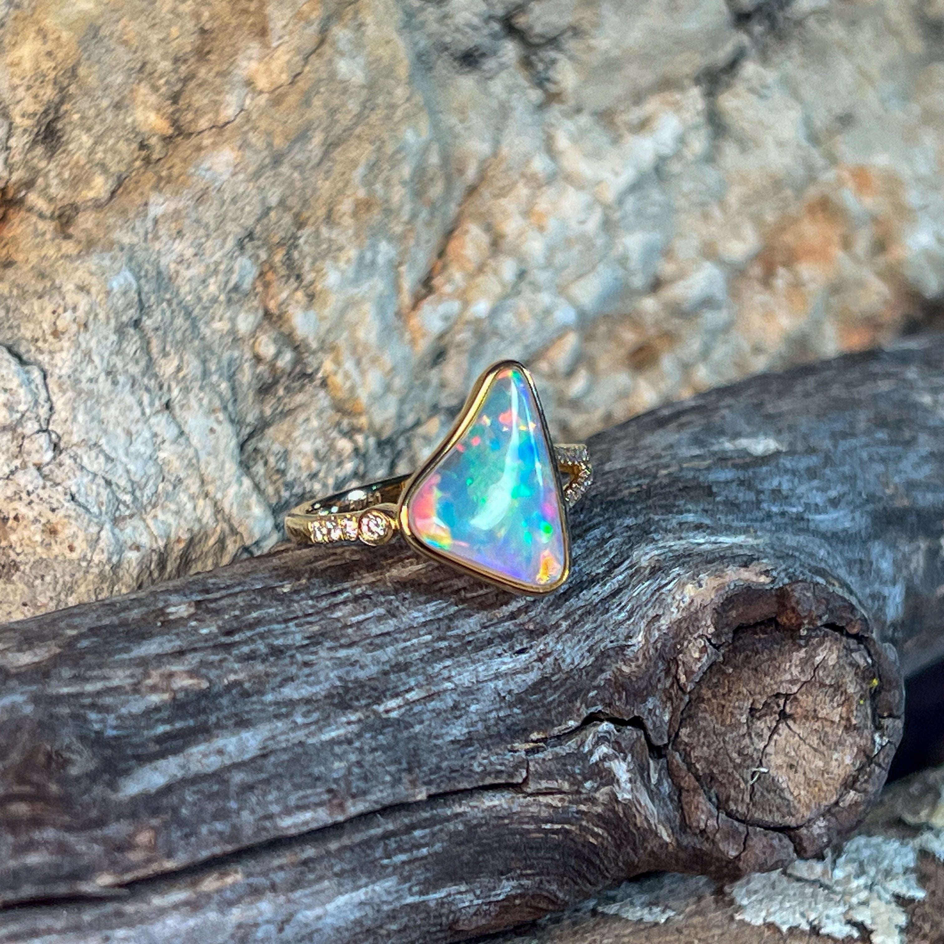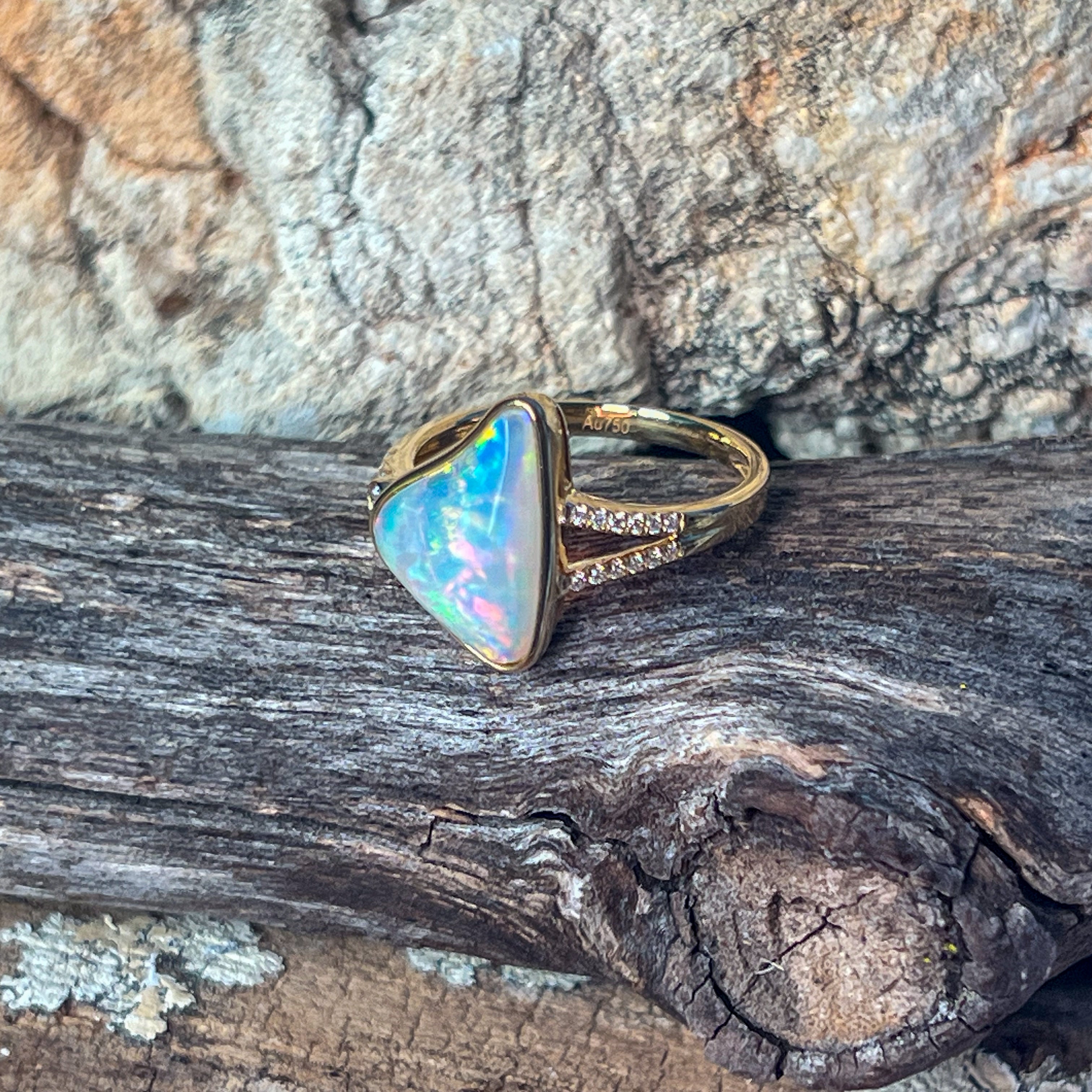 Elevate your style with this stunning 18kt yellow gold ring featuring a captivating 1.65ct triangular crystal opal, accented by sparkling diamonds. Its modern design blends elegance with contemporary flair, making it the perfect statement piece for any occasion. Experience the unique play of colors in the opal, complemented by the brilliance of diamonds, crafted to enhance your natural beauty and confidence.