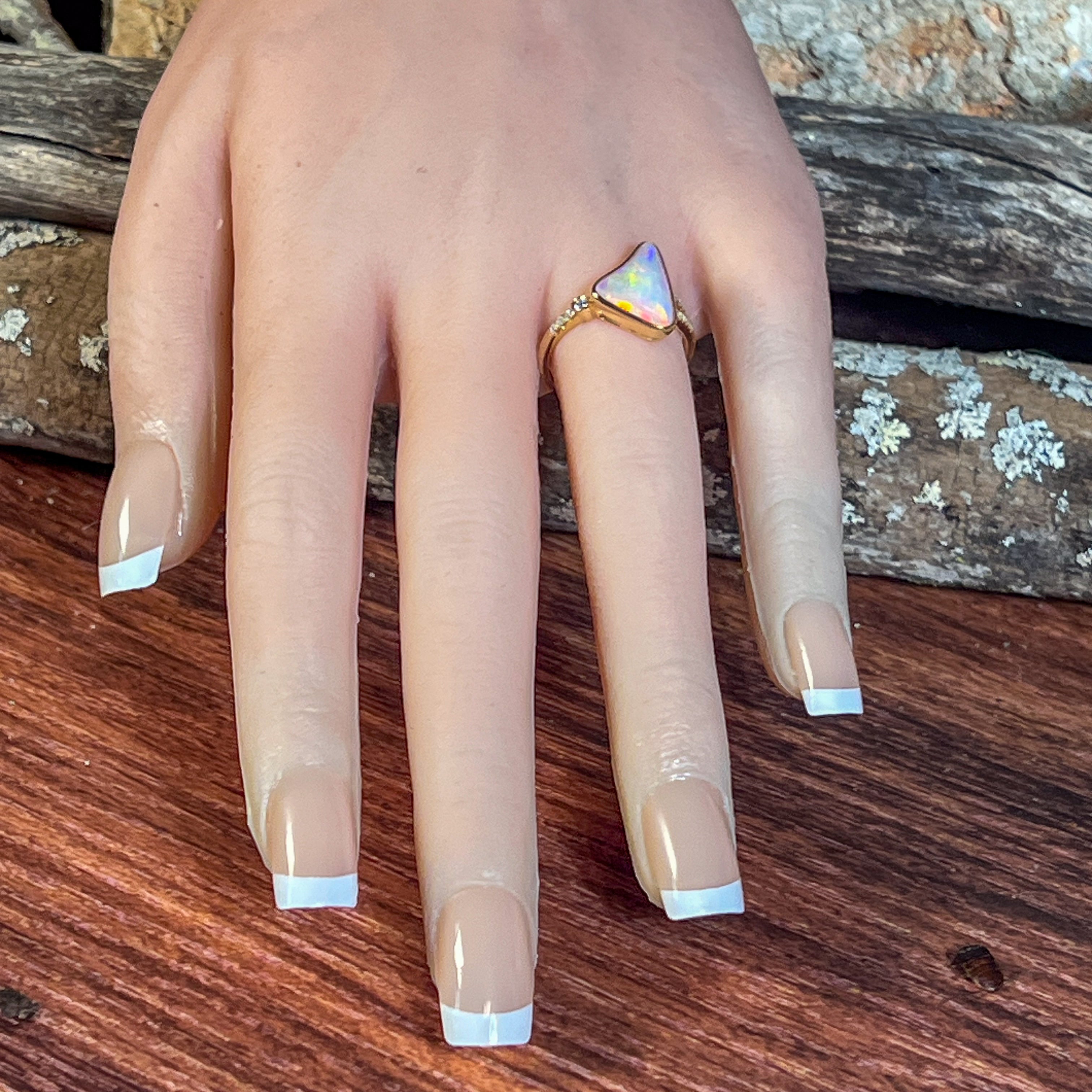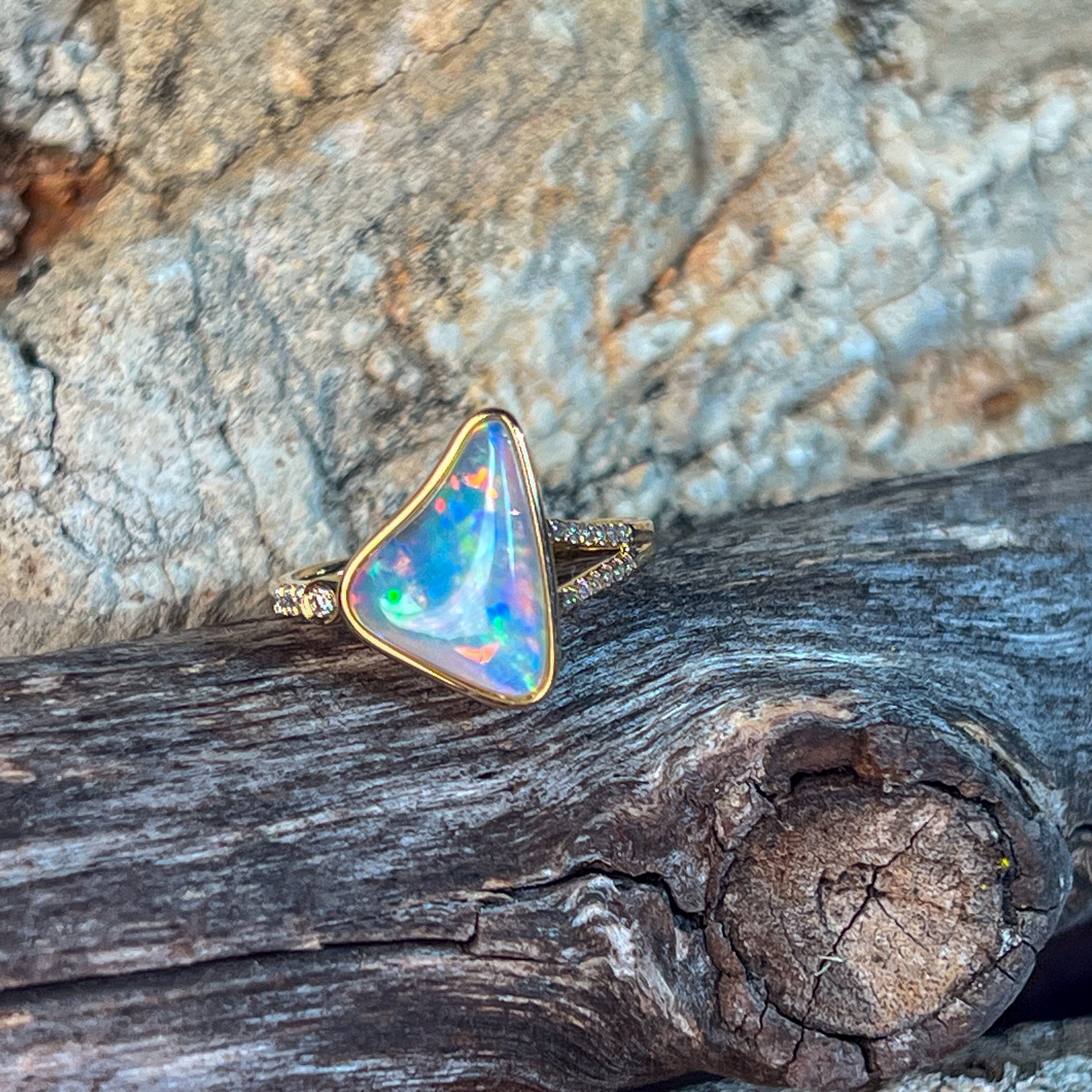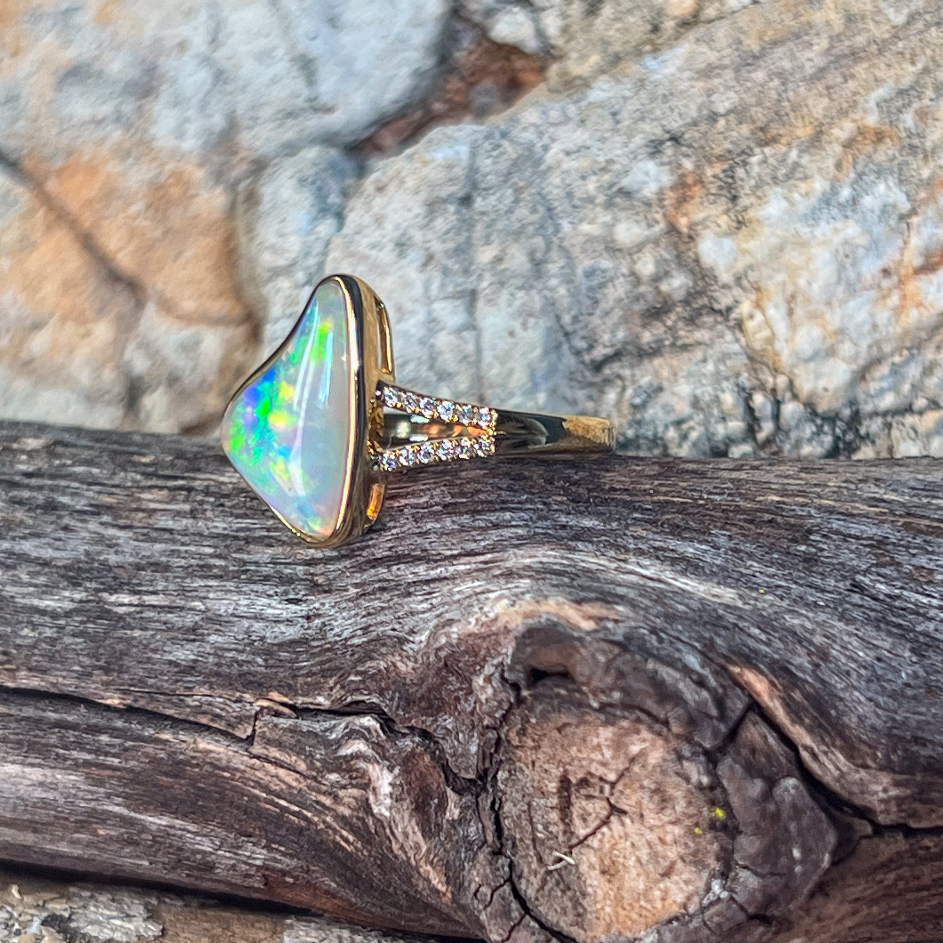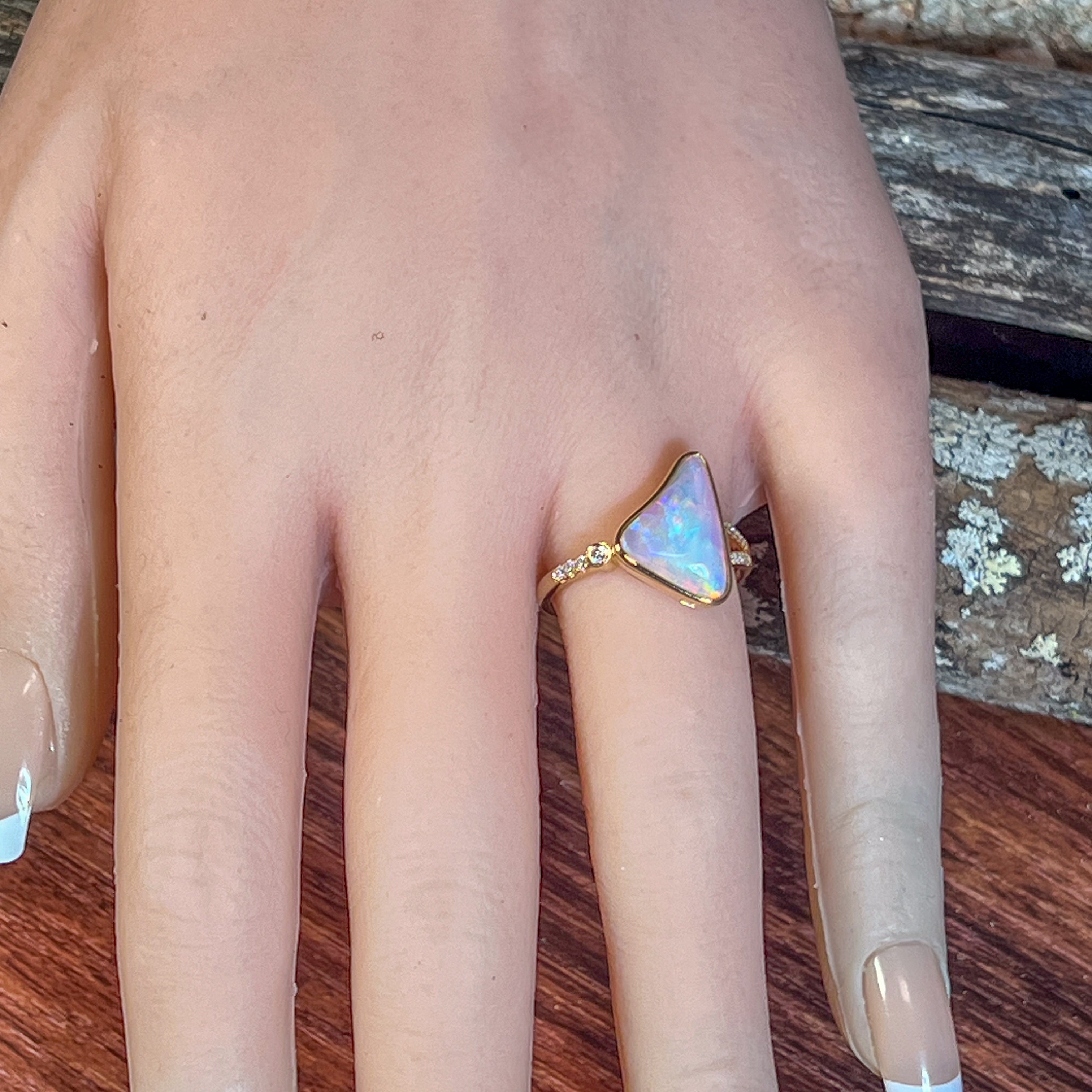 Elevate your style with this stunning 18kt yellow gold ring featuring a captivating 1.65ct triangular crystal opal, accented by sparkling diamonds. Its modern design blends elegance with contemporary flair, making it the perfect statement piece for any occasion. Experience the unique play of colors in the opal, complemented by the brilliance of diamonds, crafted to enhance your natural beauty and confidence.