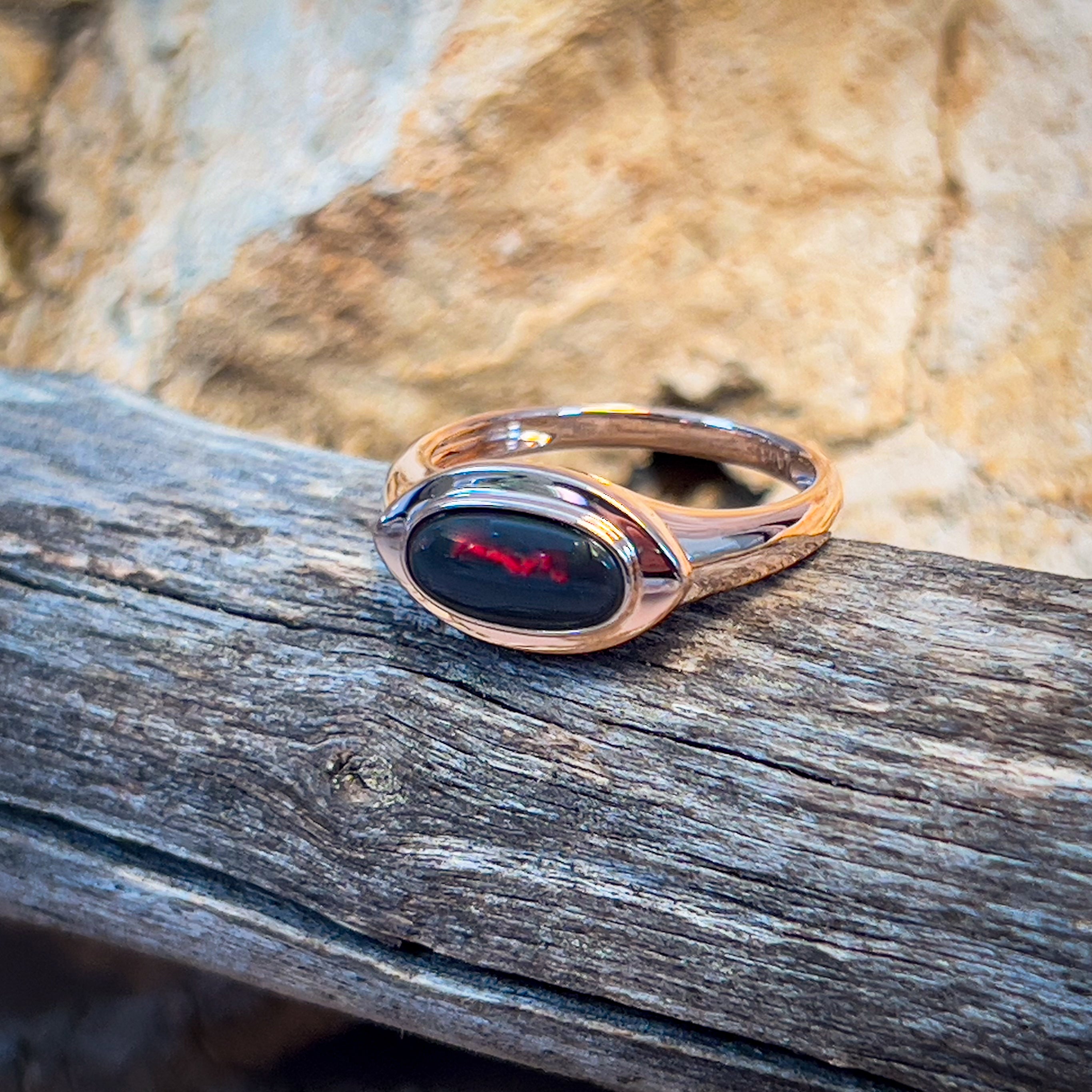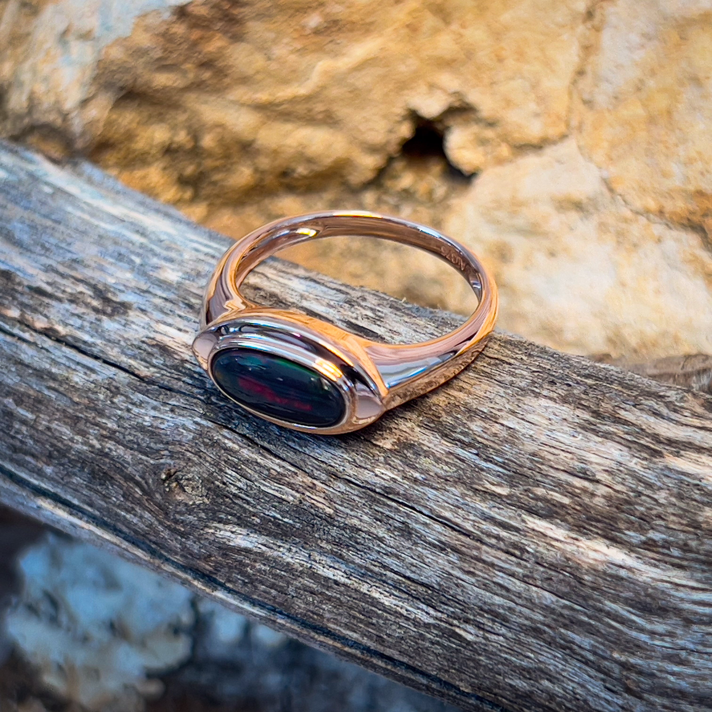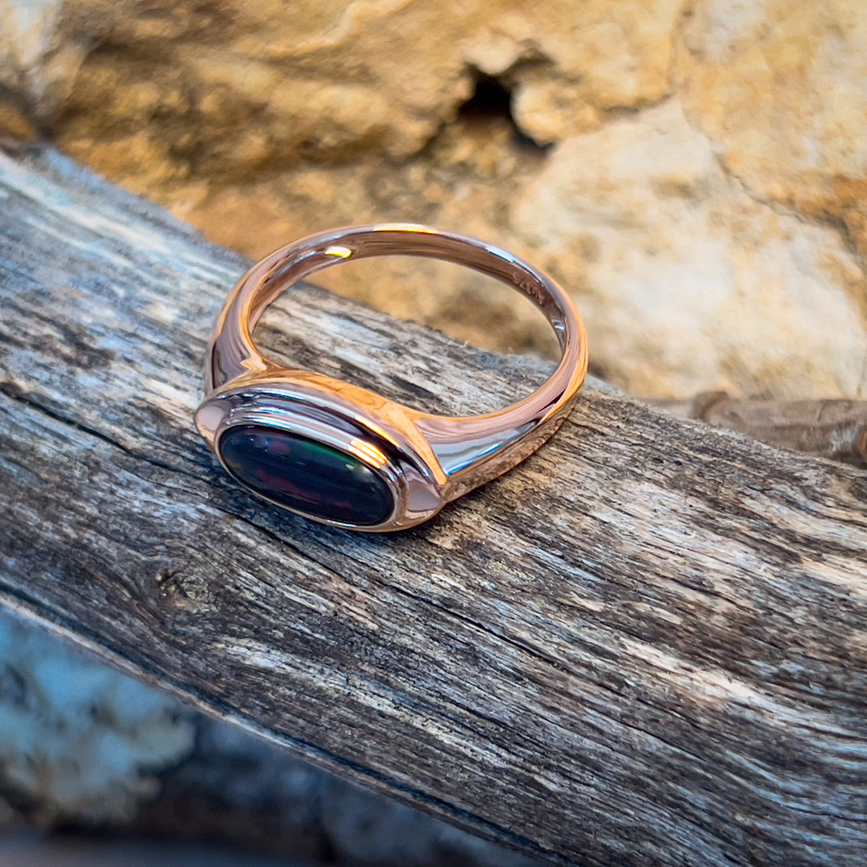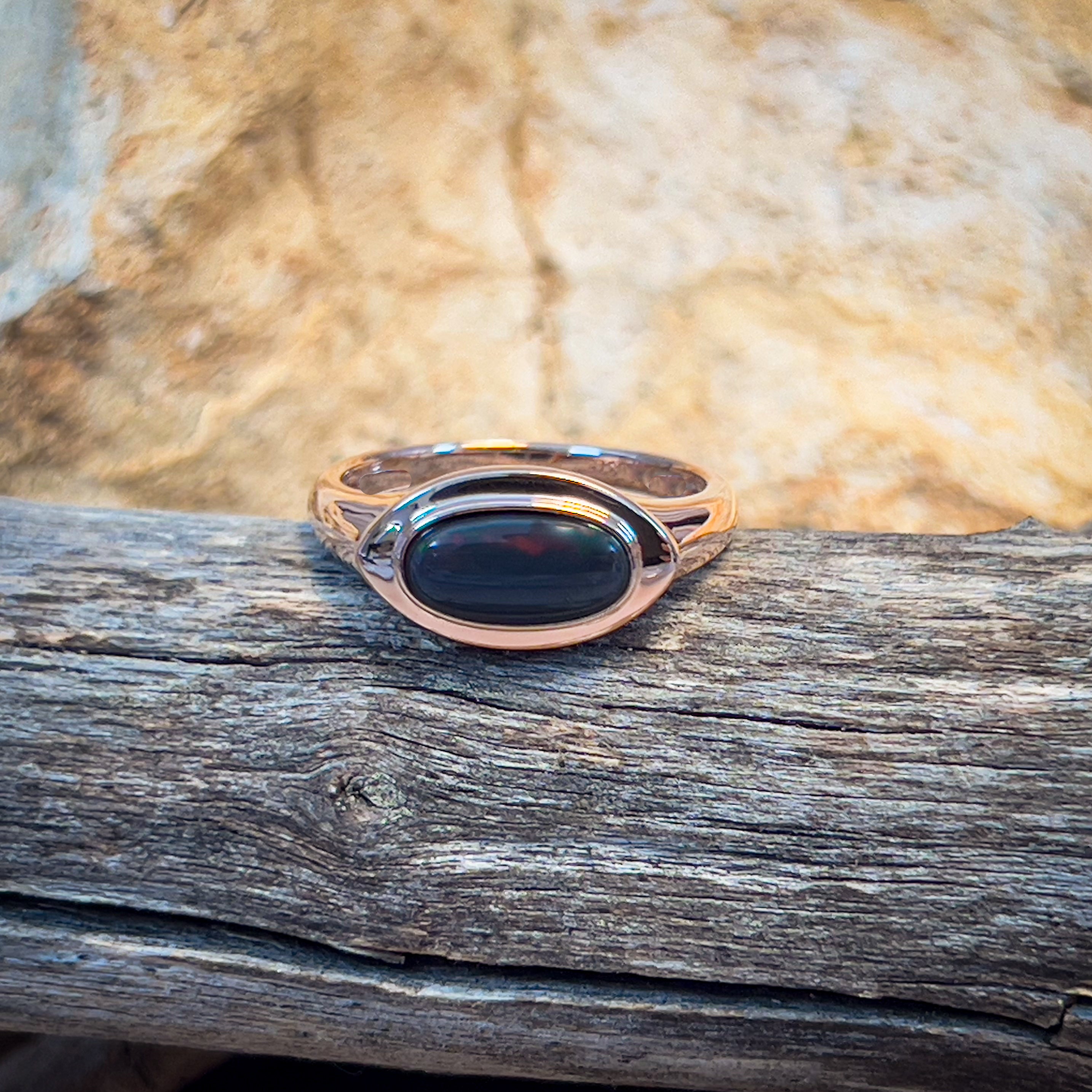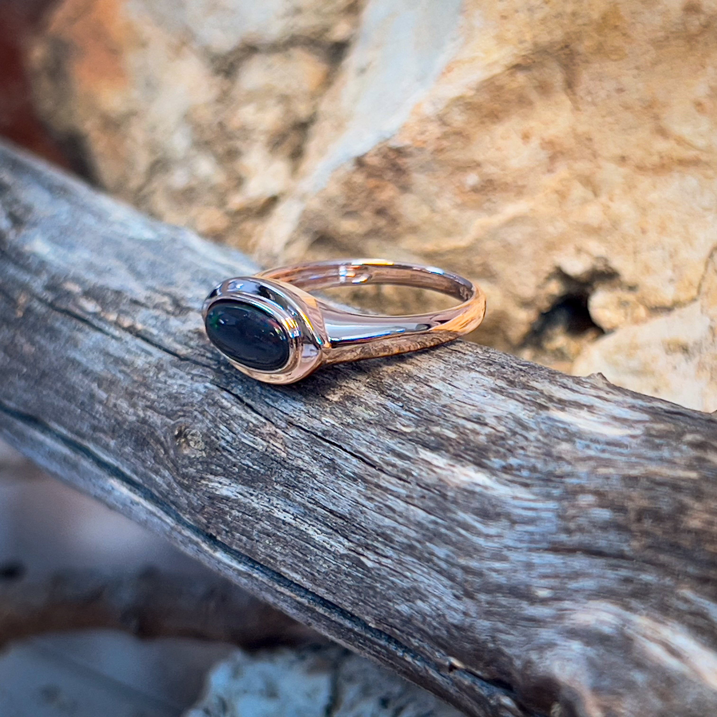 Dare to make a statement with our 9kt Rose Gold Black Opal 1.04ct ring! This bold piece features a mesmerizing black opal stone set in rich rose gold, creating a striking contrast that will elevate any outfit. Add a touch of adventure and style to your jewellery collection with this unique opal ring!