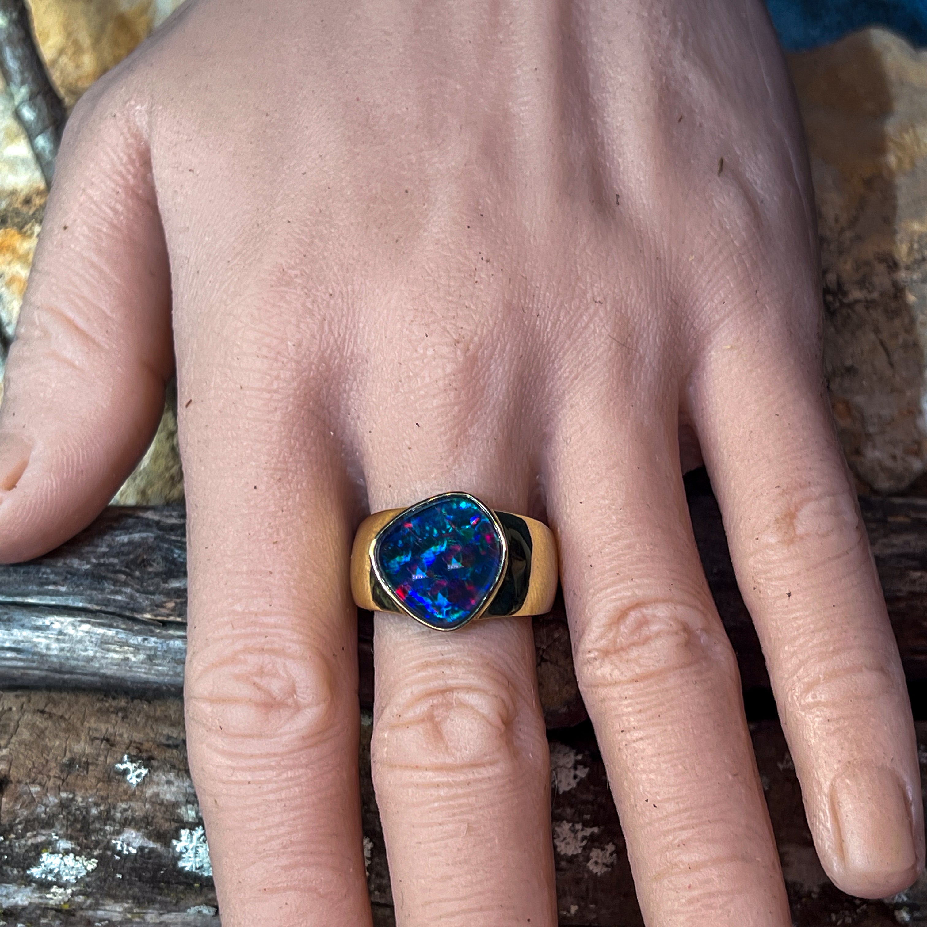 Elevate your style with this 9kt Yellow Gold Freeform Opal Triplet men's ring, designed in a classic signet style. Its bold yet timeless silhouette makes a confident statement, while the unique freeform opal triplet adds vibrant color and depth. Crafted to complement any look, this ring offers lasting elegance and a distinctive edge for the modern gentleman.