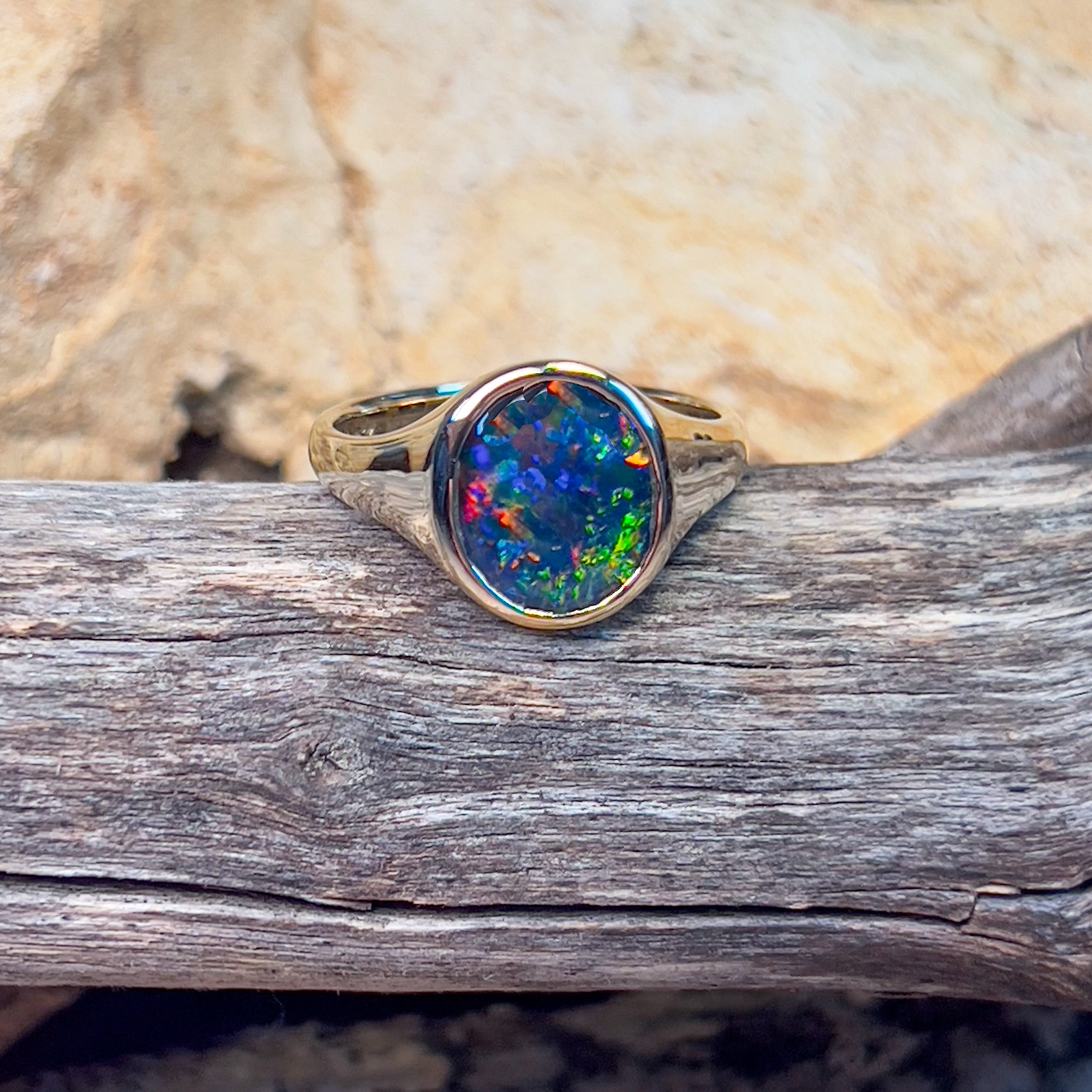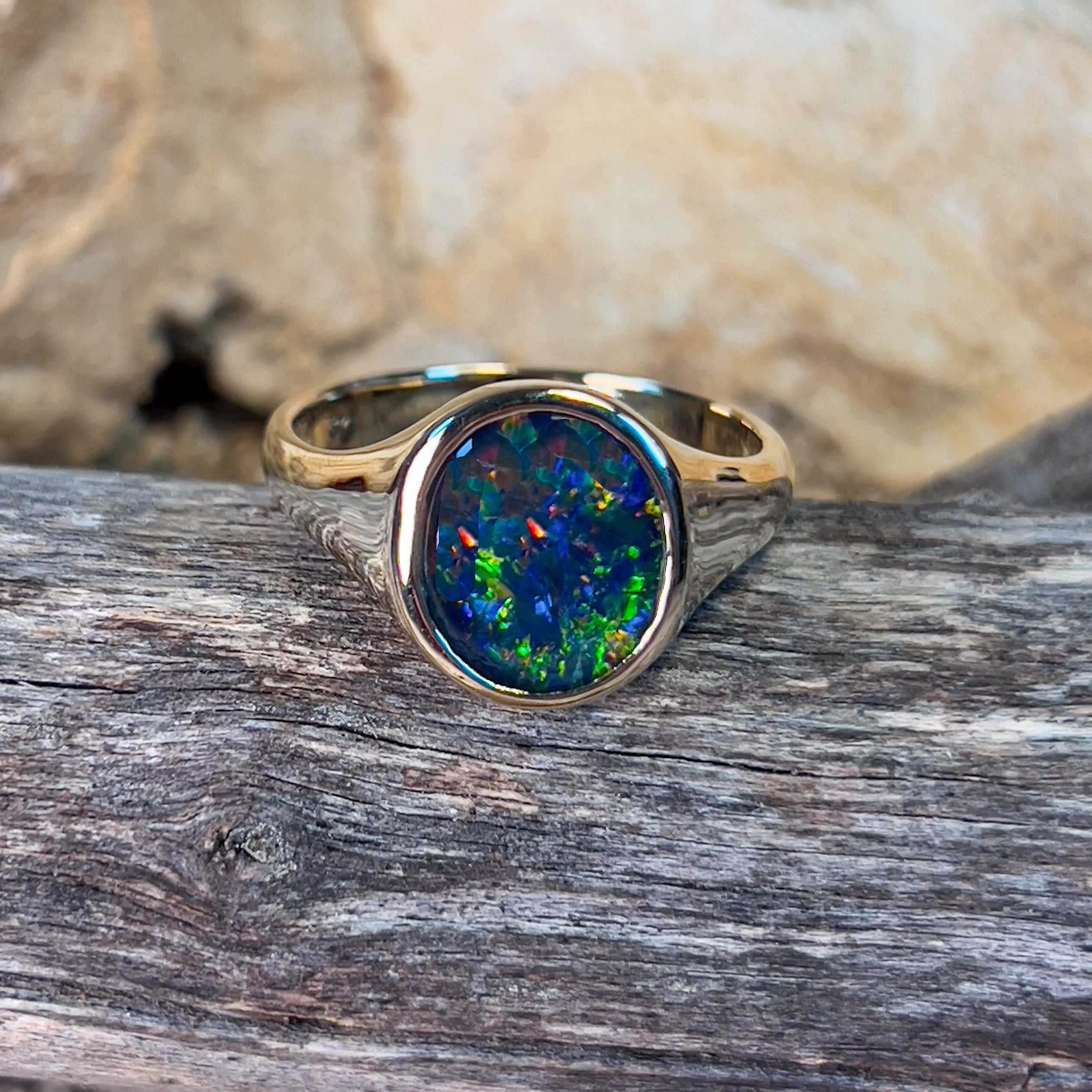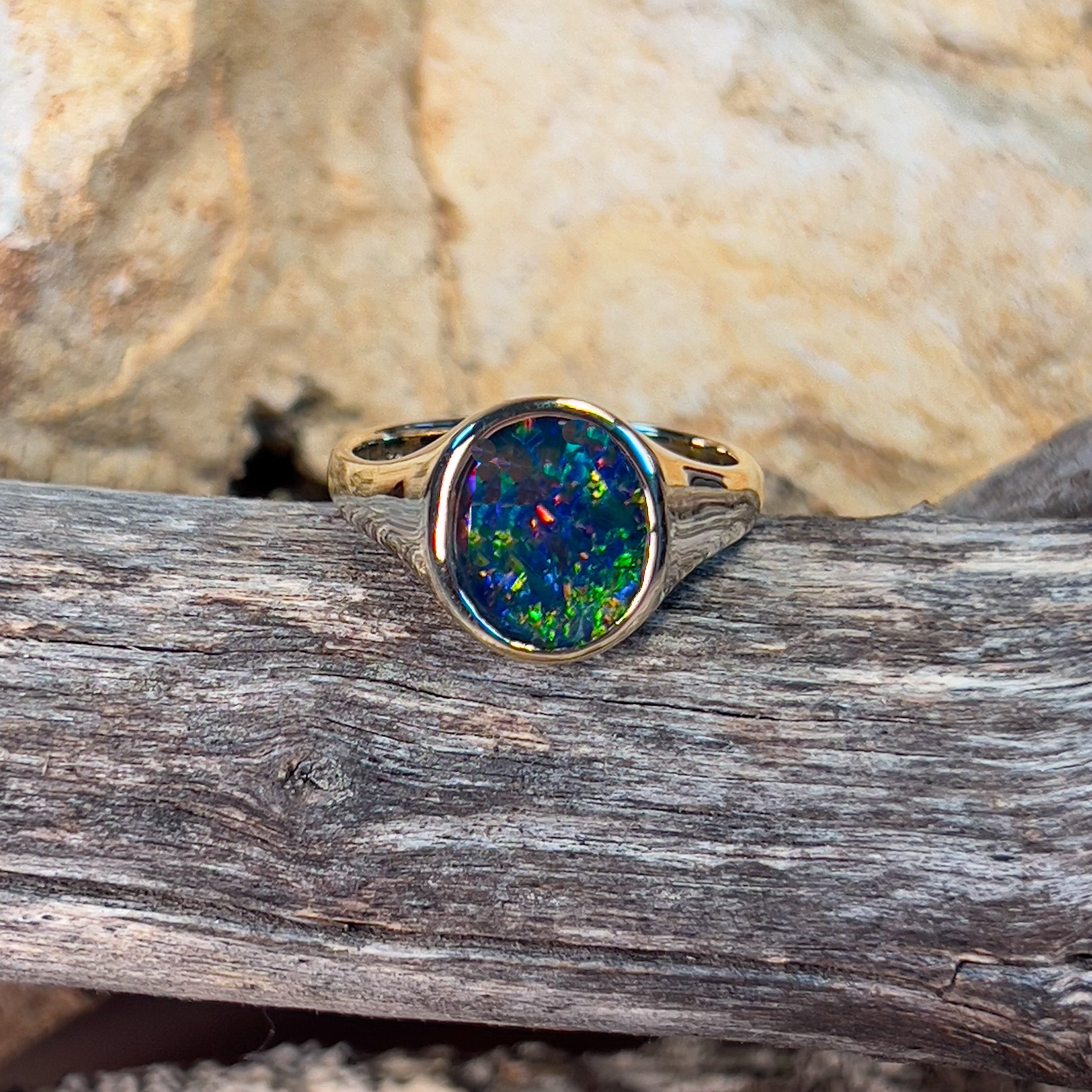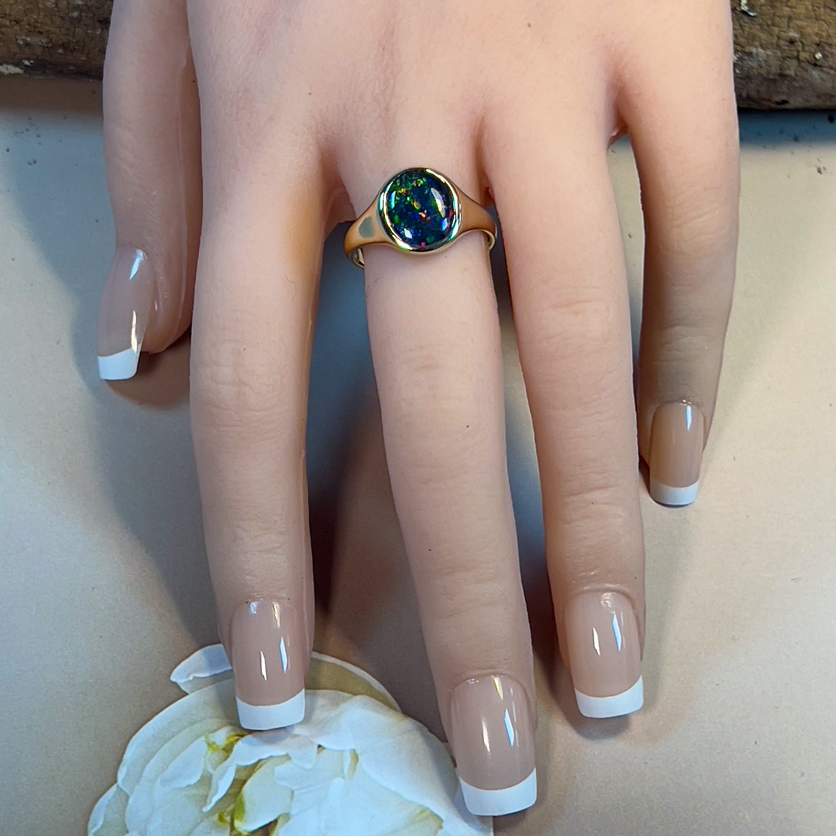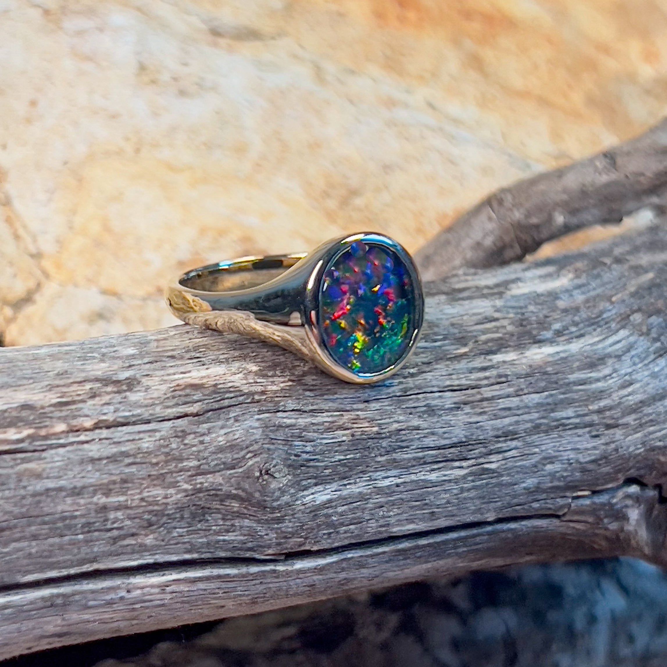Introducing our 9kt Yellow Gold Opal triplet signet ring, featuring top quality natural opal that showcases firey colours. This stunning ring is sure to add a touch of elegance and sophistication to any outfit, making it the perfect accessory for any occasion. With its vibrant and radiant colors, this ring is a must-have for any jewelry collection.