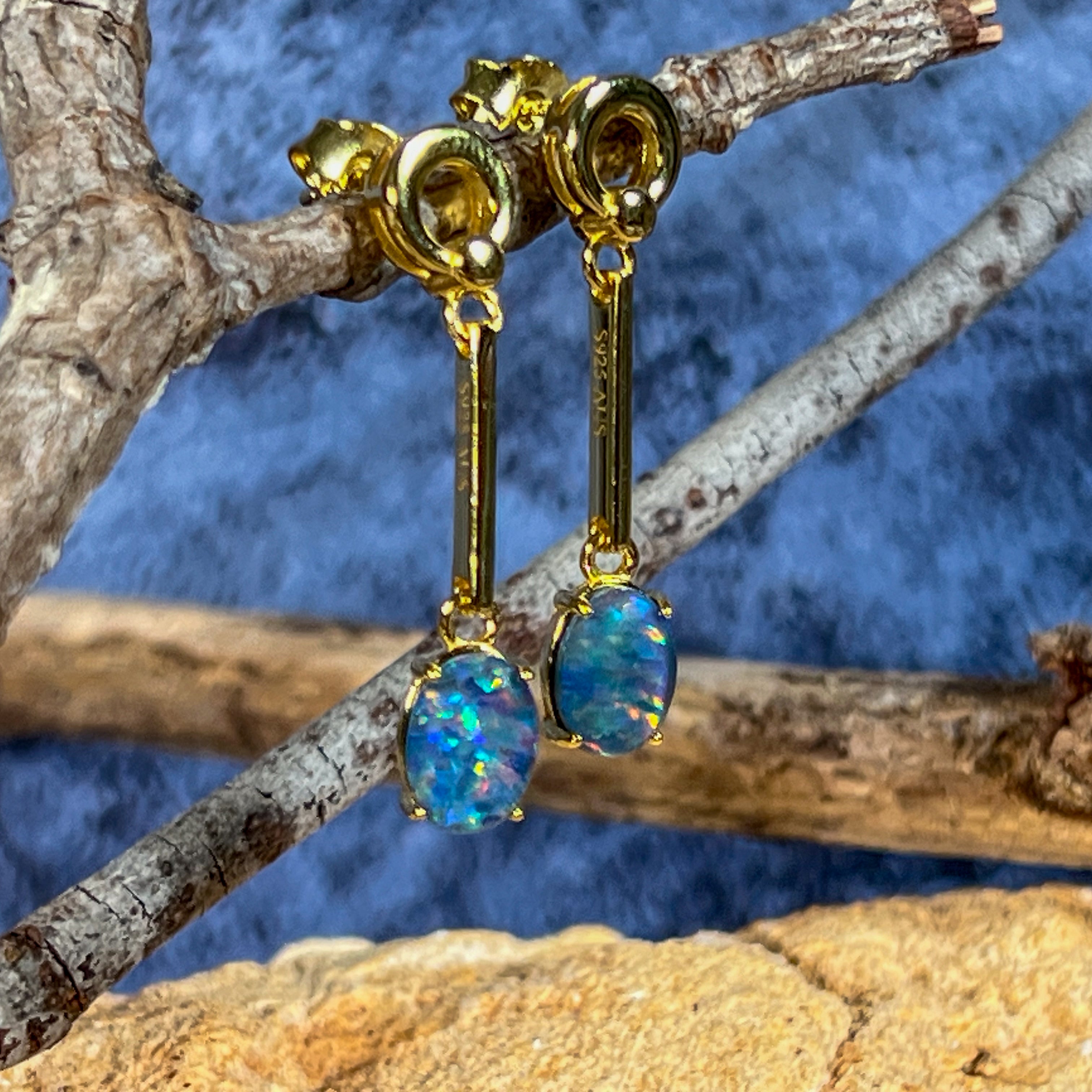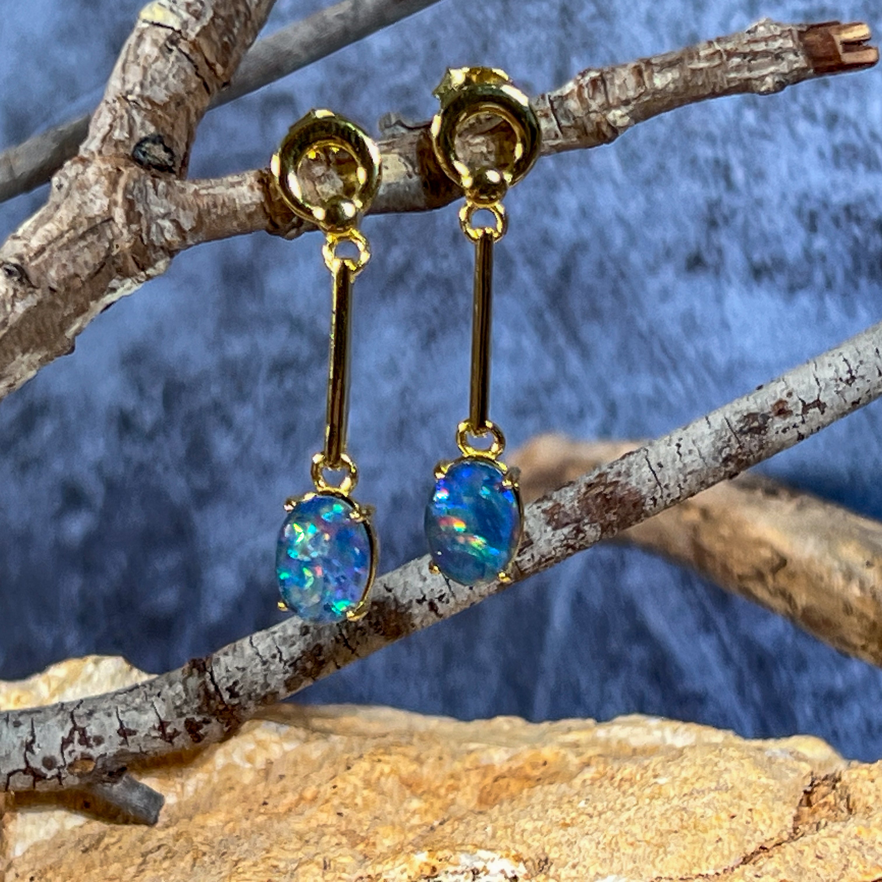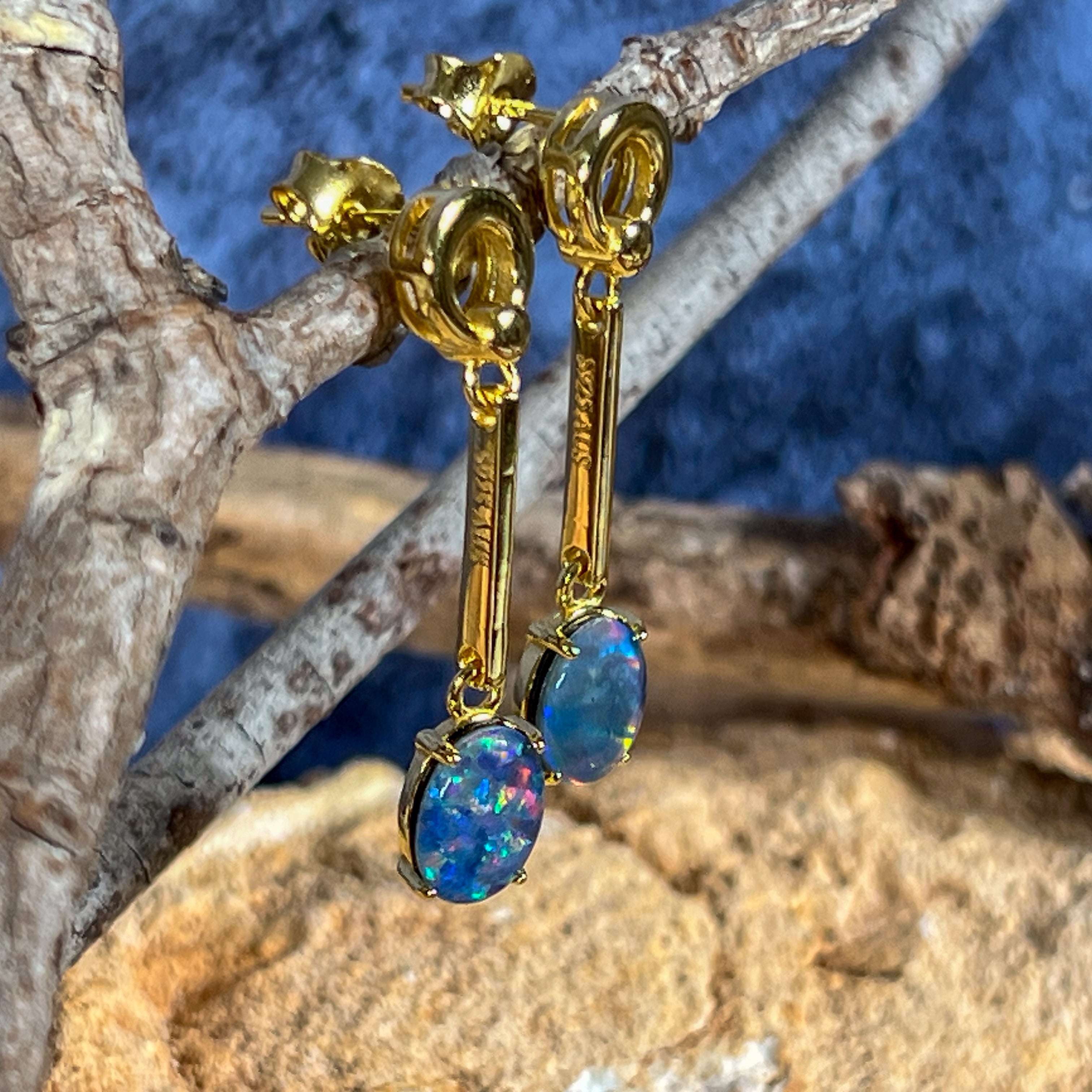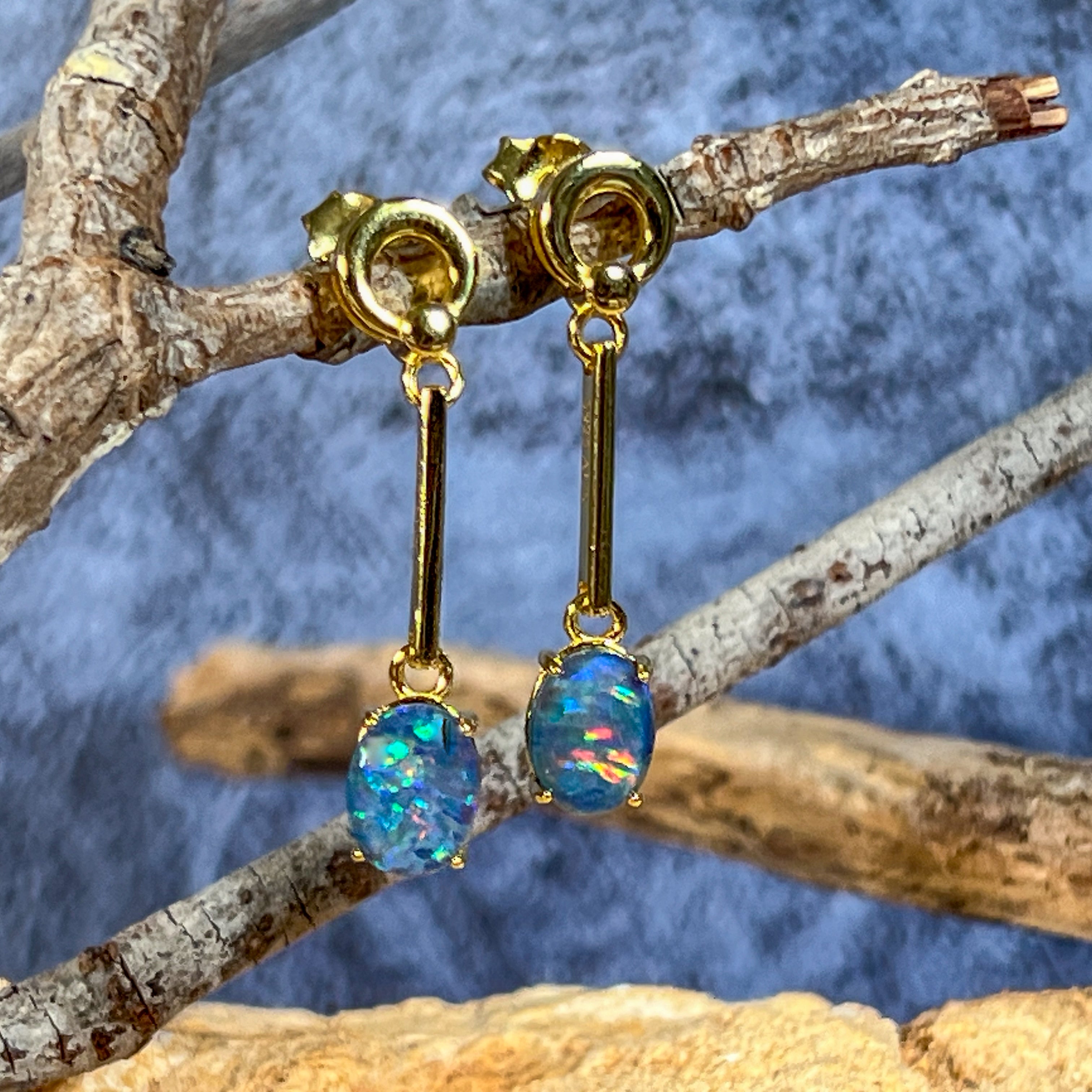 Upgrade your style with our Gold Plated Opal triplet earrings. Dangling from a secure claw set, these 8x6mm earrings offer a stunning pop of color and a unique bar design. Elevate any outfit with these elegant earrings!