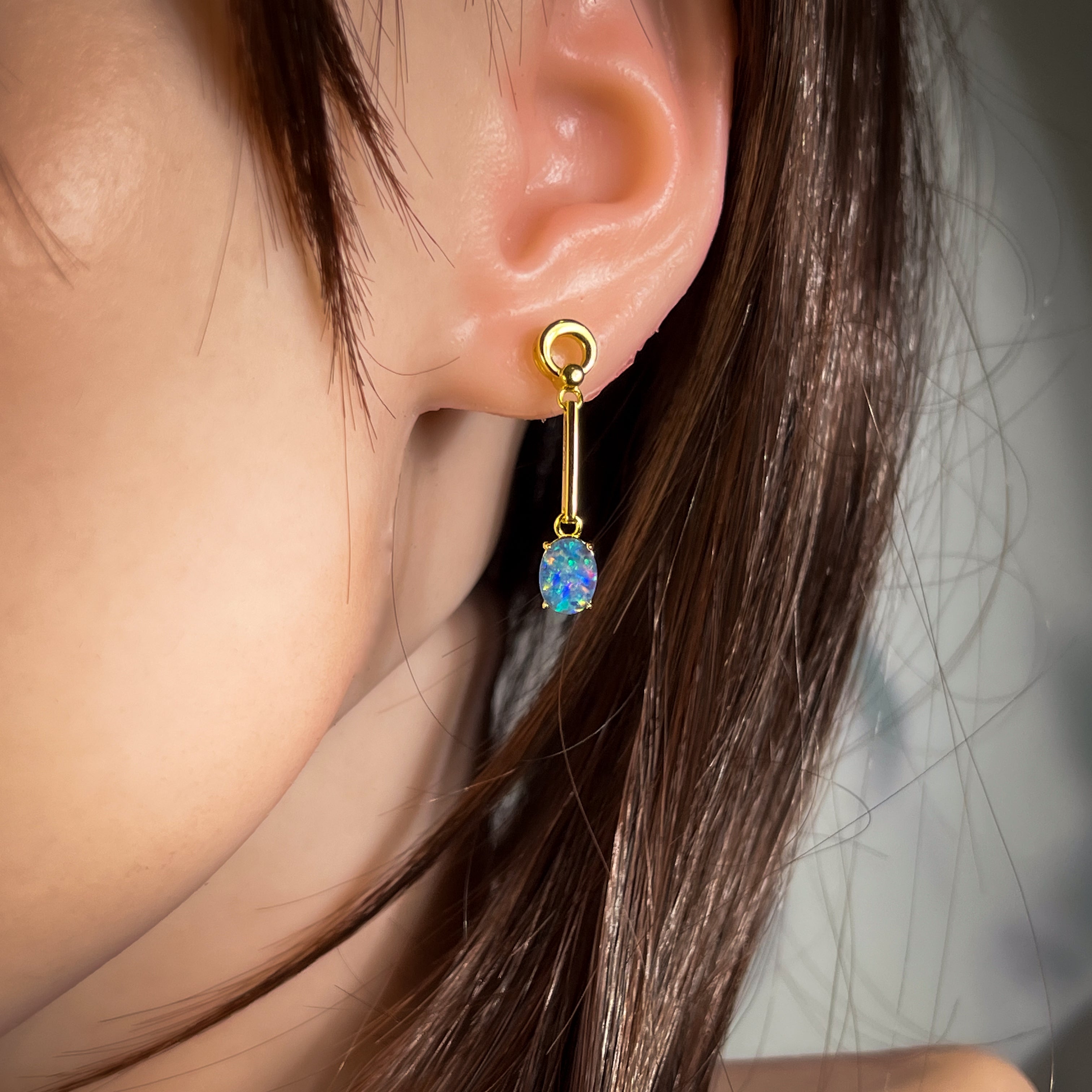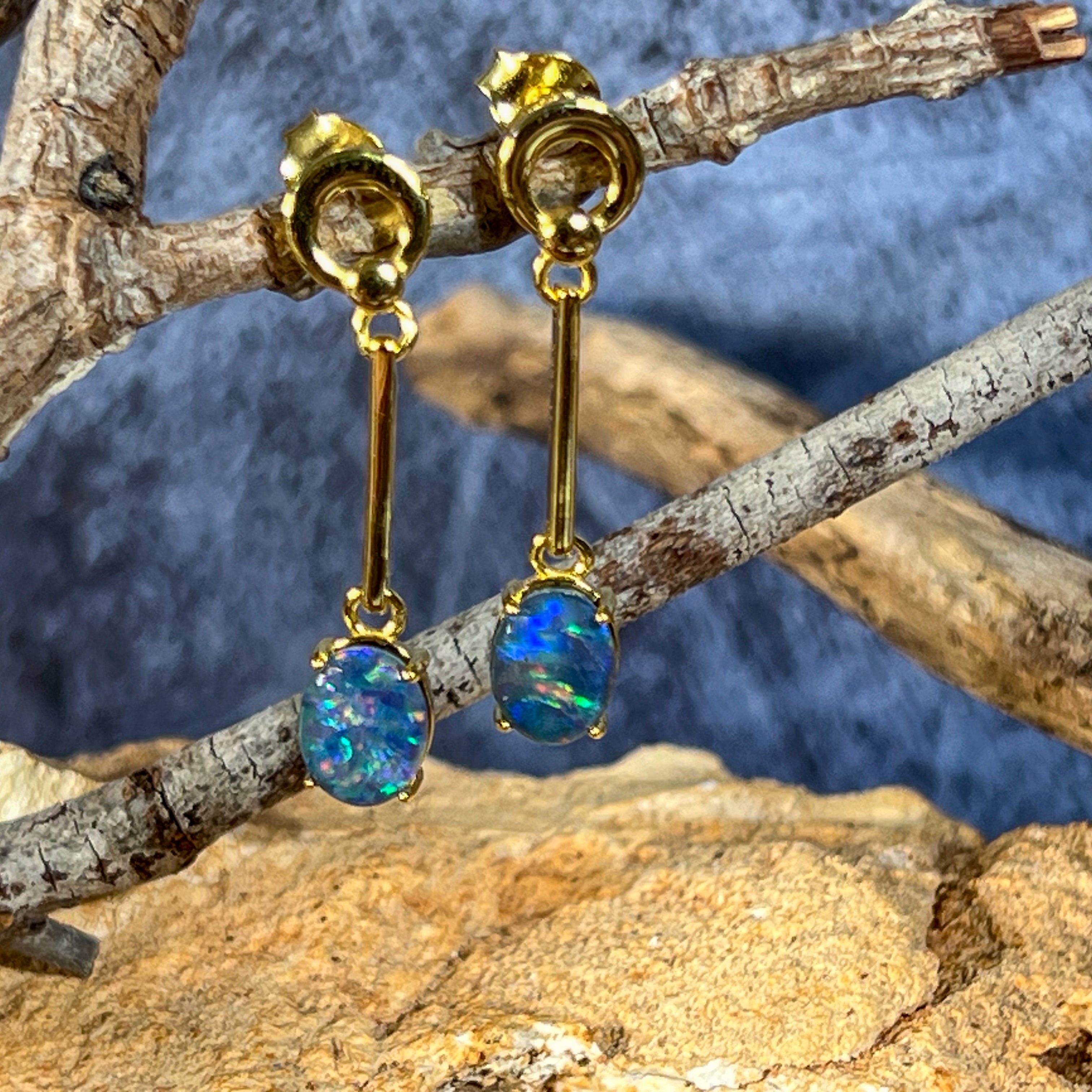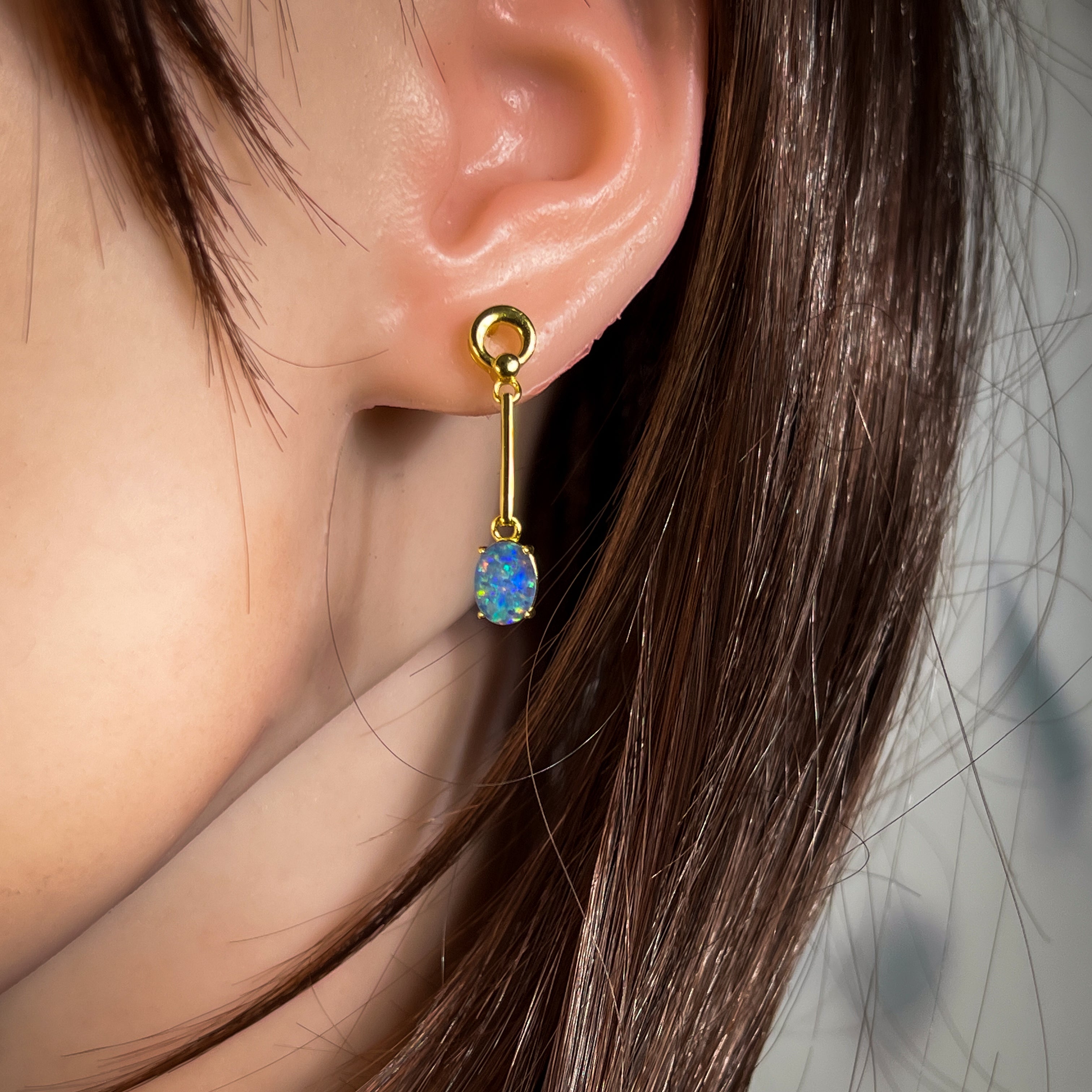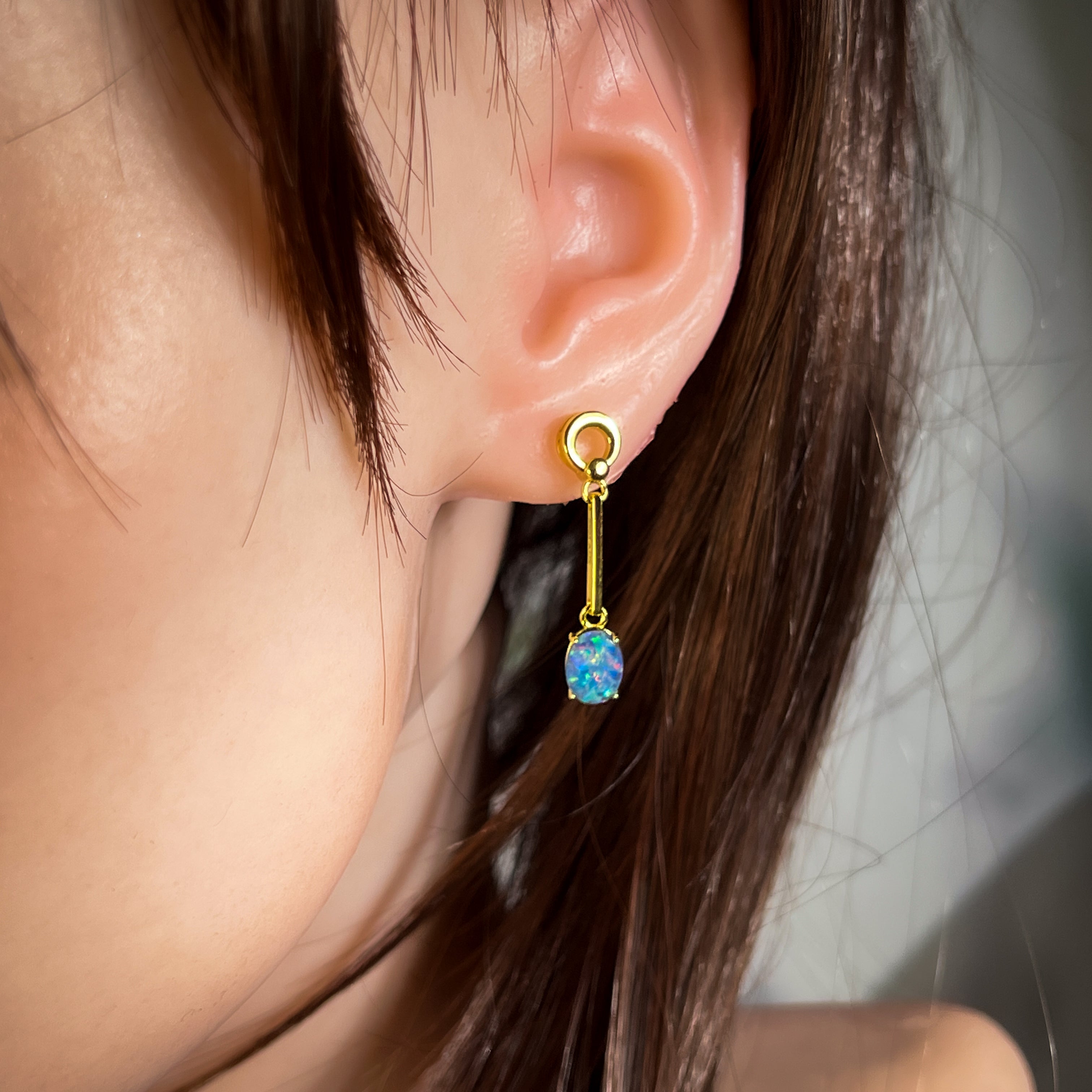 Upgrade your style with our Gold Plated Opal triplet earrings. Dangling from a secure claw set, these 8x6mm earrings offer a stunning pop of color and a unique bar design. Elevate any outfit with these elegant earrings!