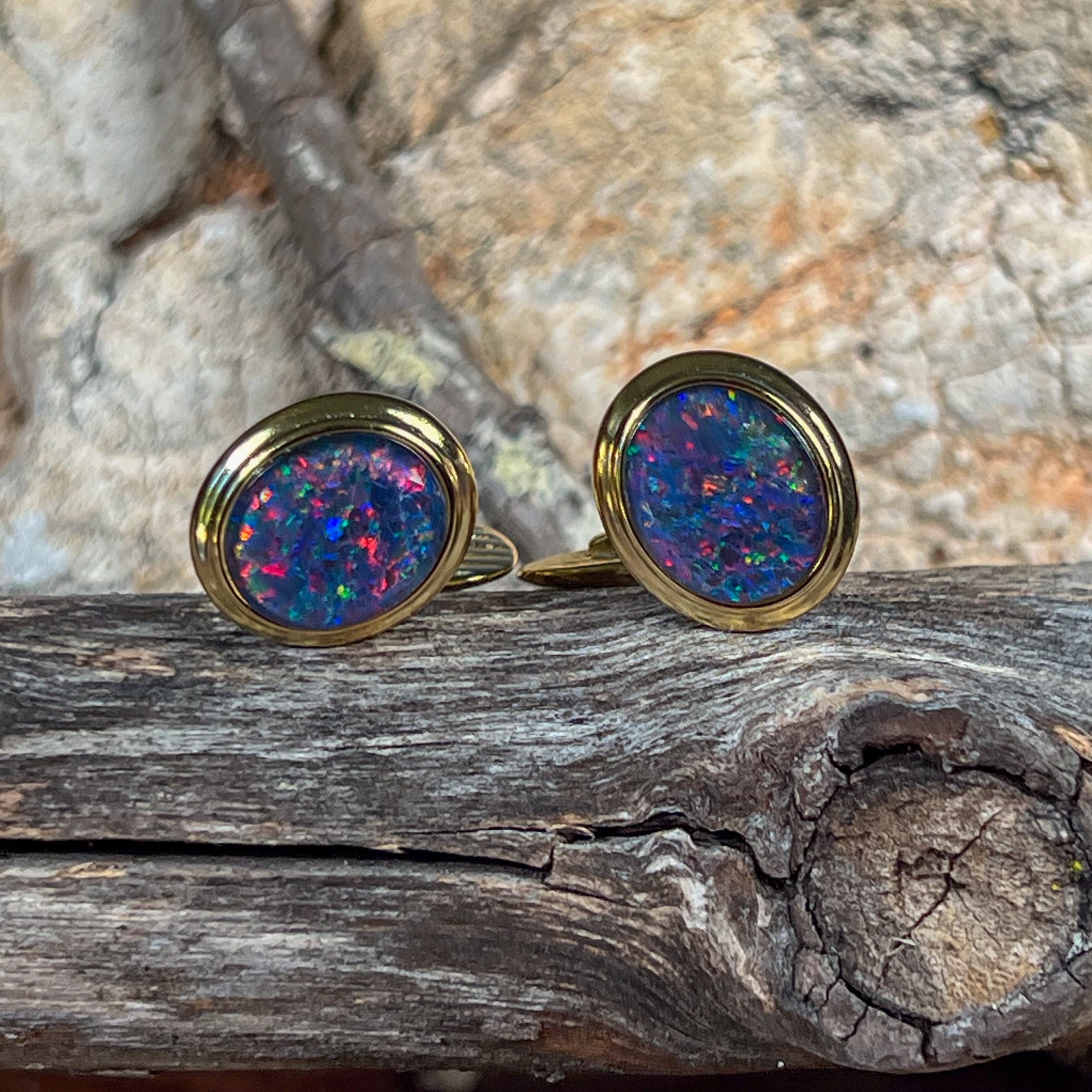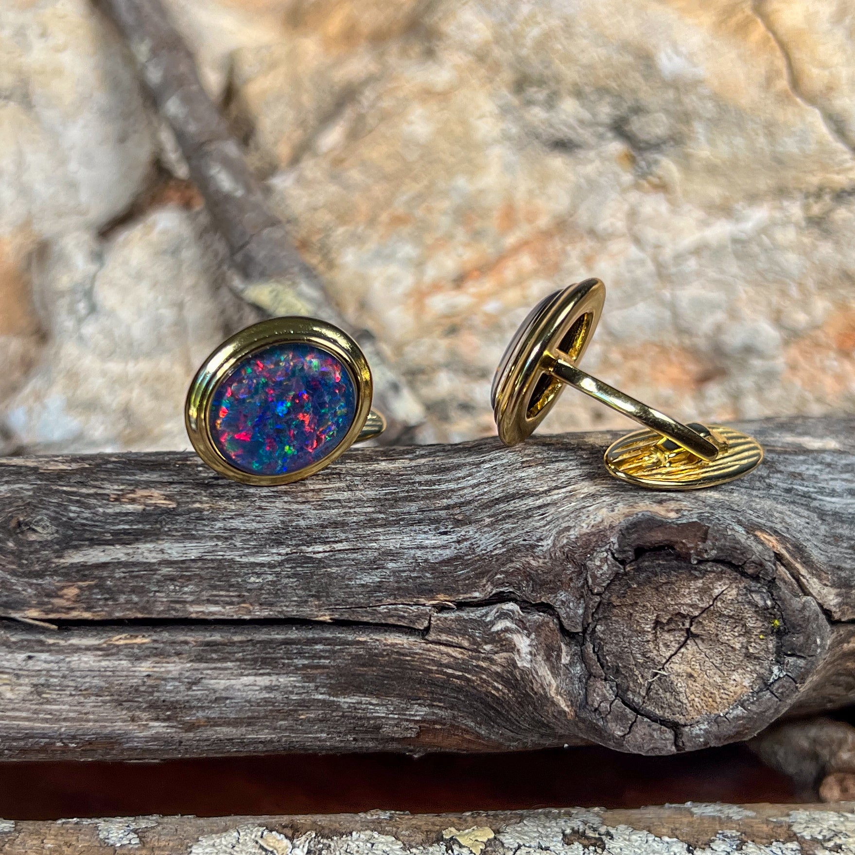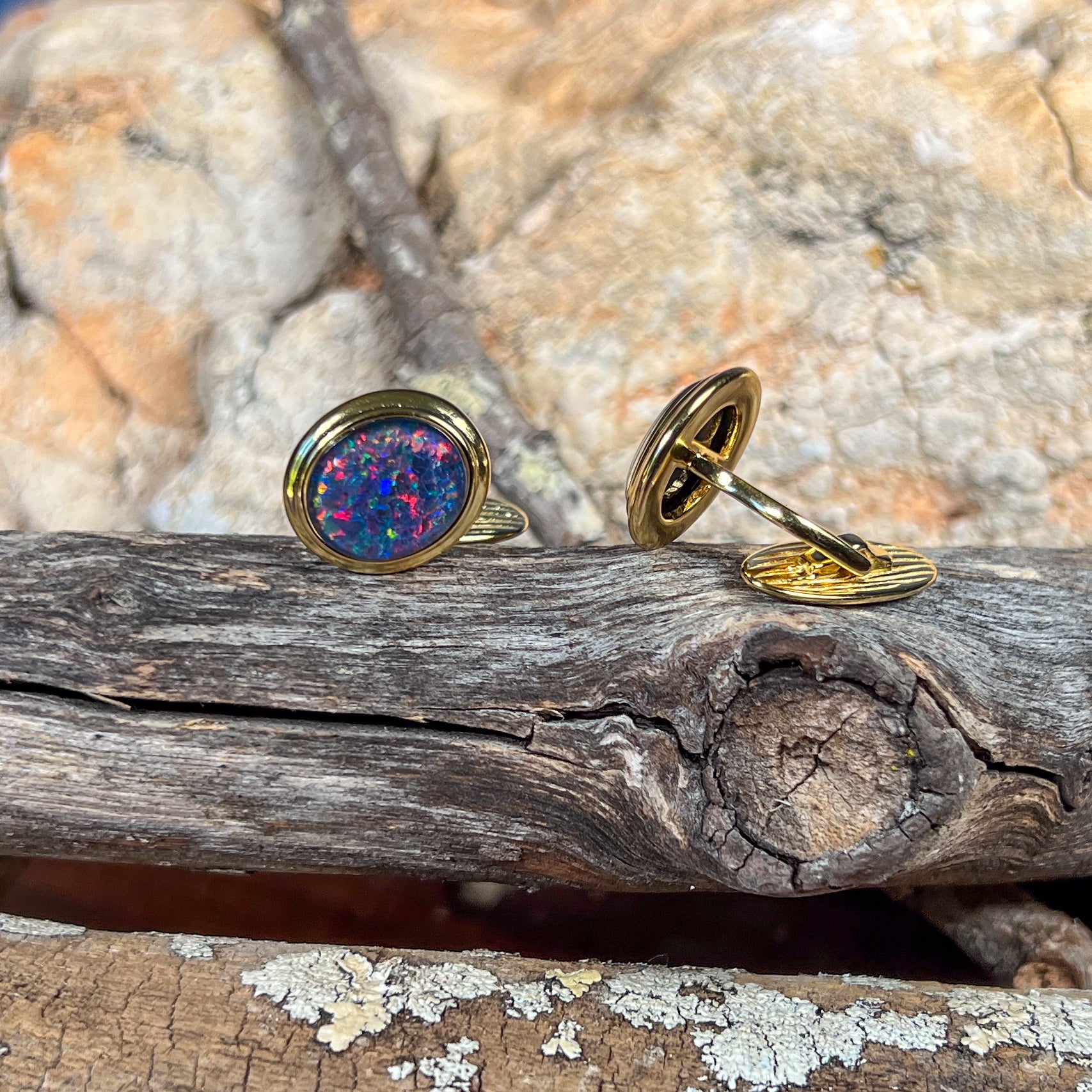 Elevate your style with these Gold Plated Silver cufflinks featuring 12x10mm opal triplets set in a secure bezel. Their timeless design combines classic elegance with vibrant opal hues, making them the perfect accessory to enhance any formal outfit with a refined touch. Durable and eye-catching, these cufflinks offer lasting sophistication for special occasions or daily wear.