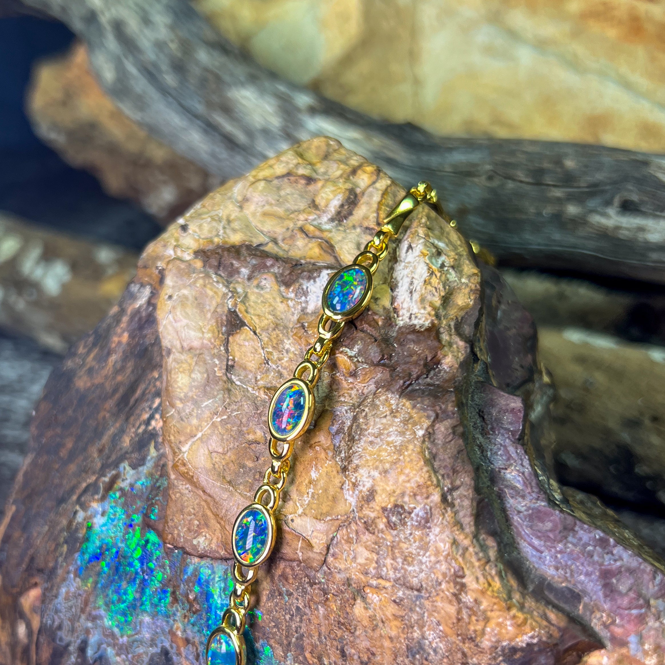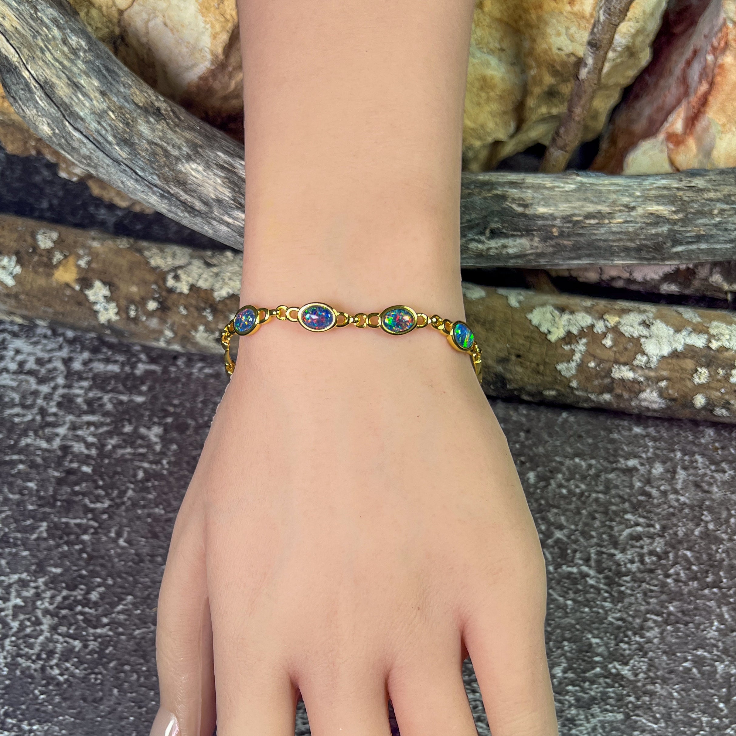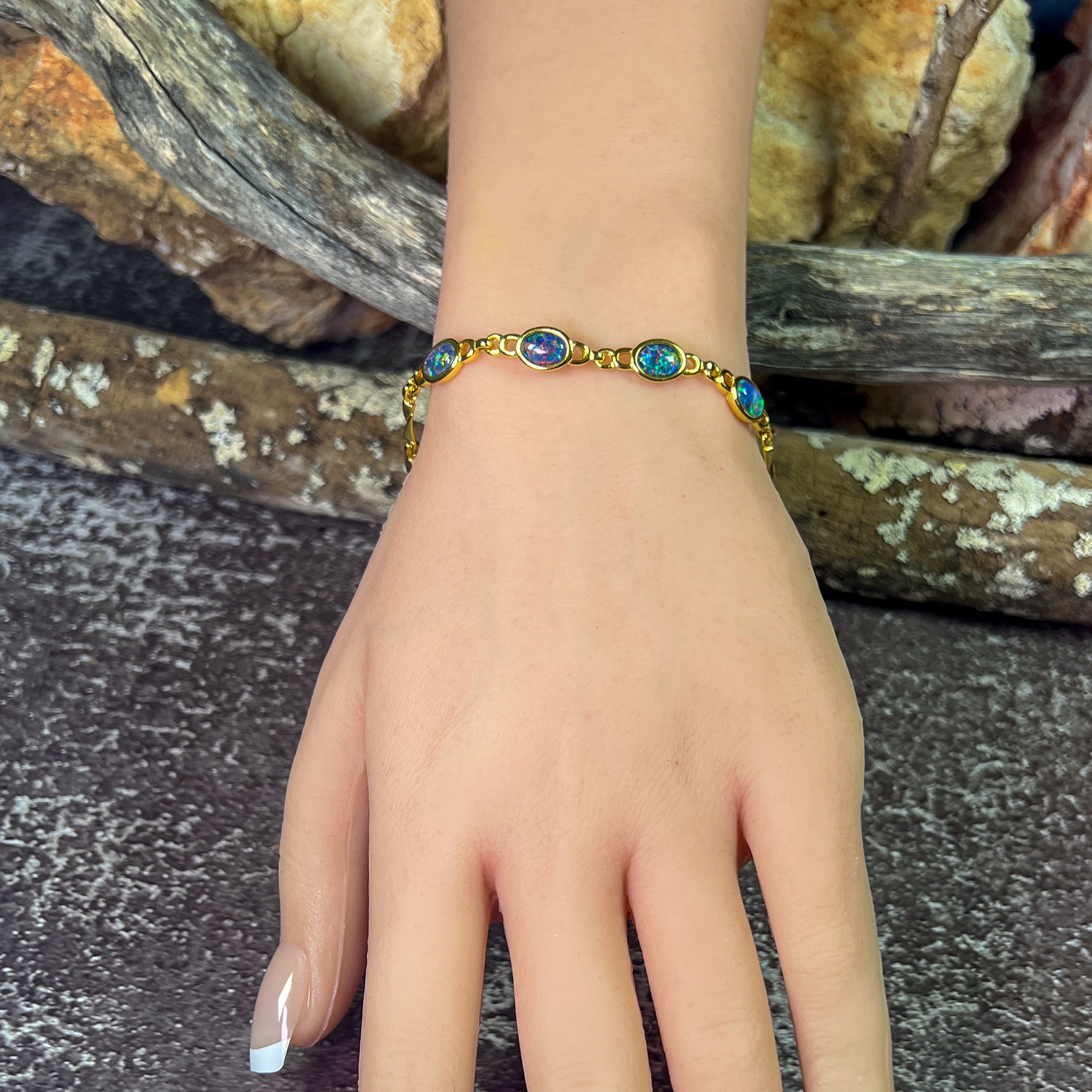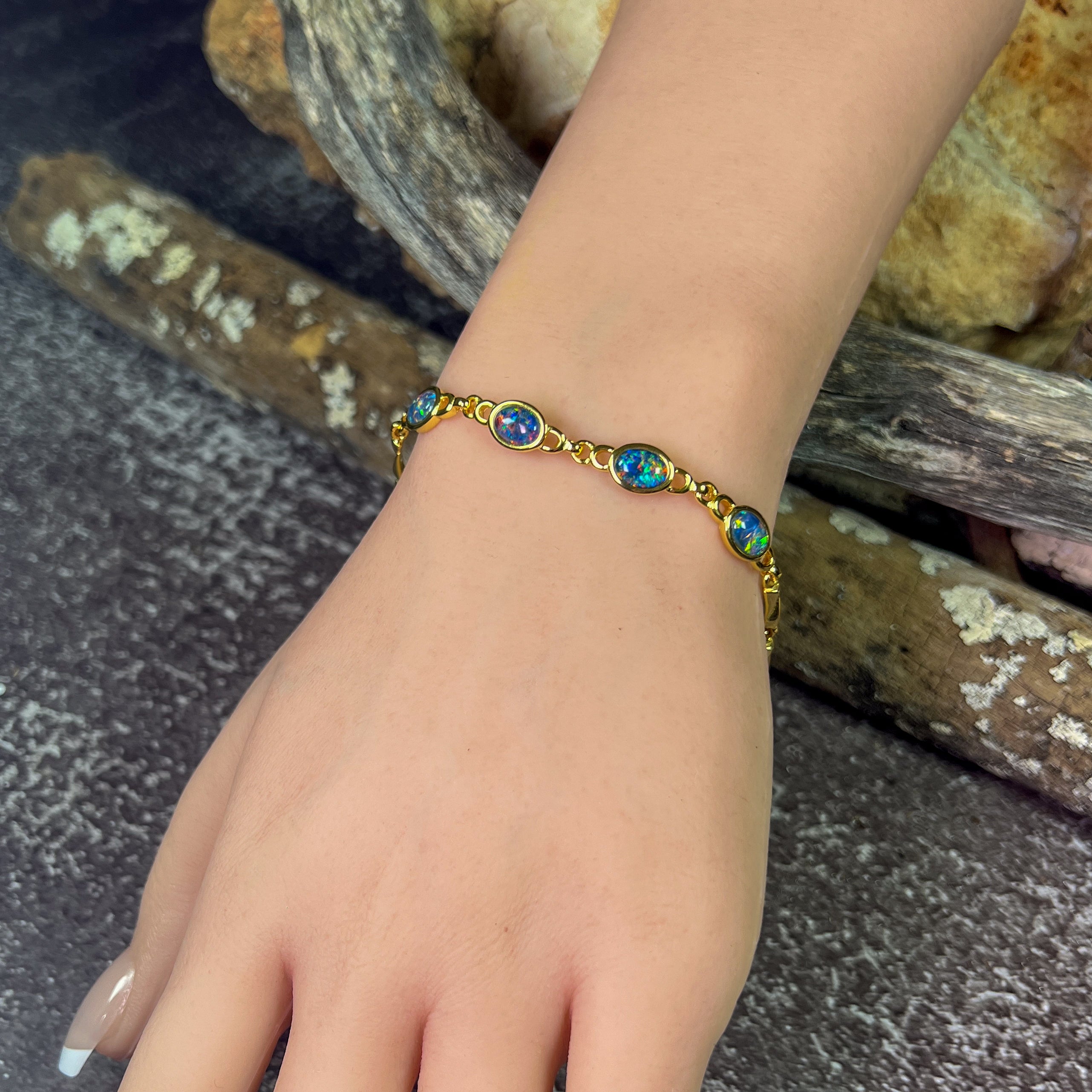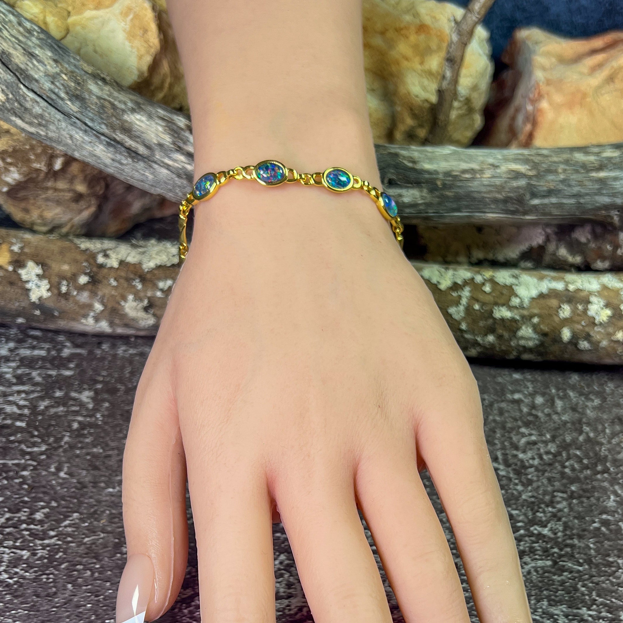 Indulge in the luxurious beauty of our Gold Plated Silver 4 Opal Triplet Bracelet. This exquisite piece features a stunning array of multi-colored opals that will captivate the senses. Elevate any outfit with the unique and vibrant colors of this bracelet. Experience the perfect blend of elegance and style in one piece.