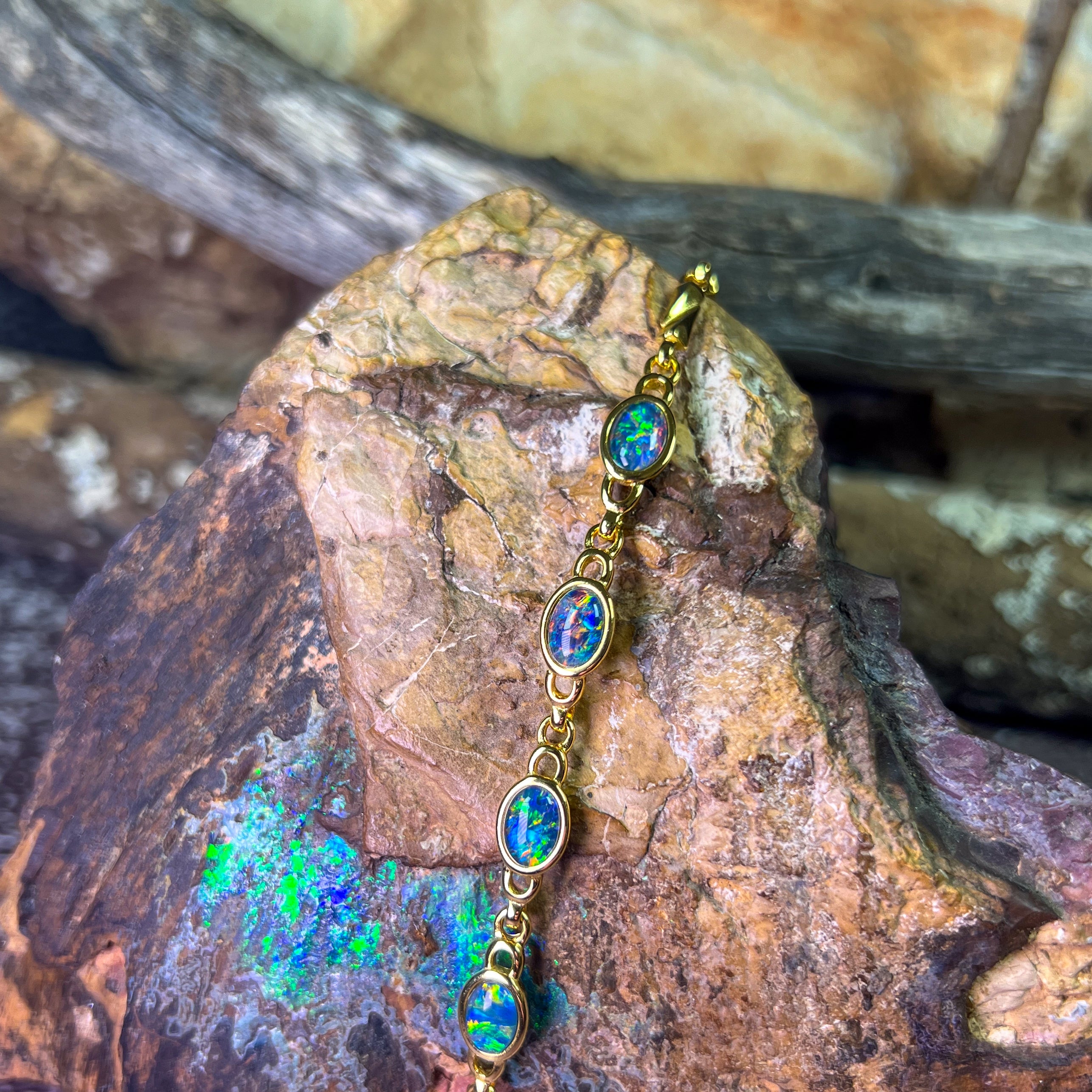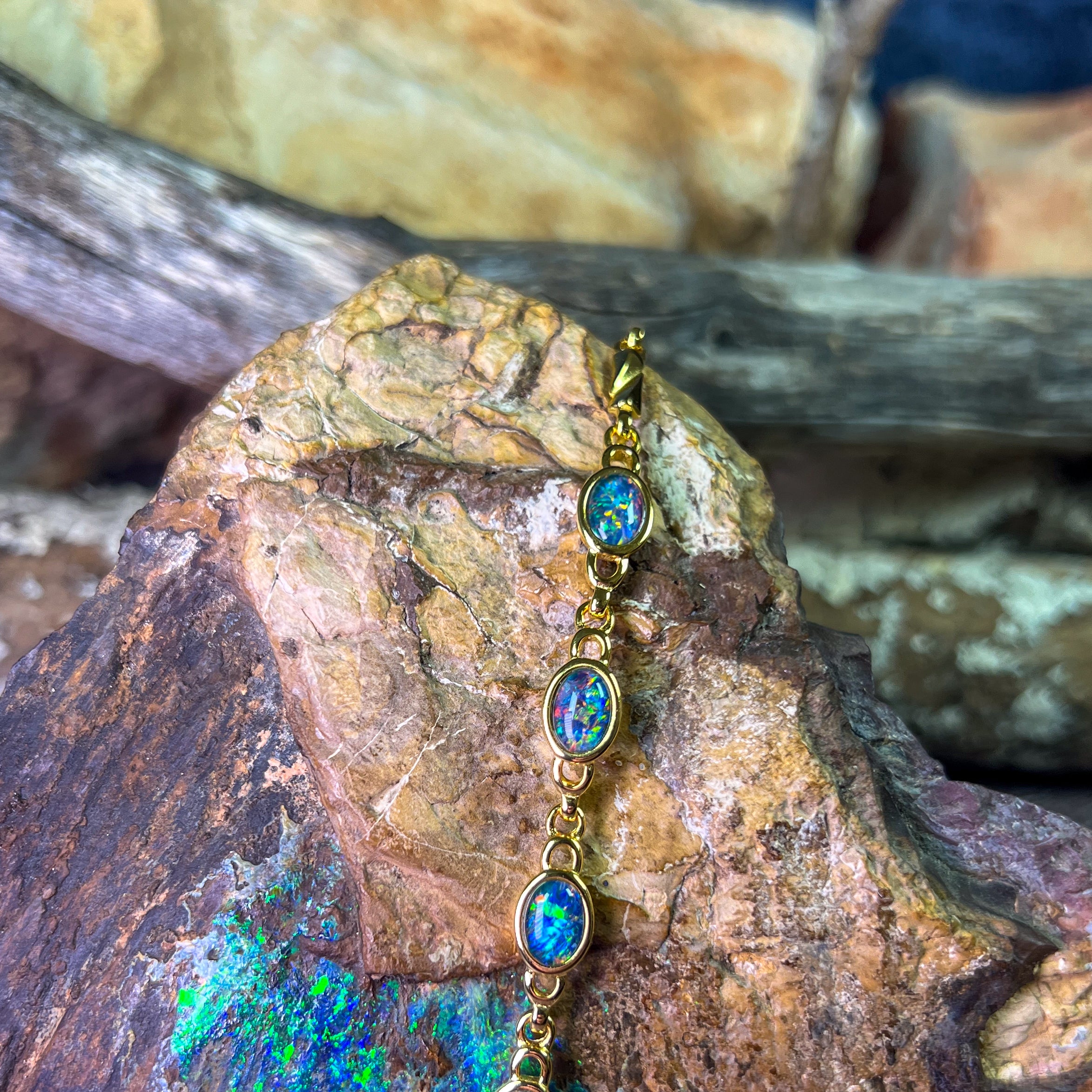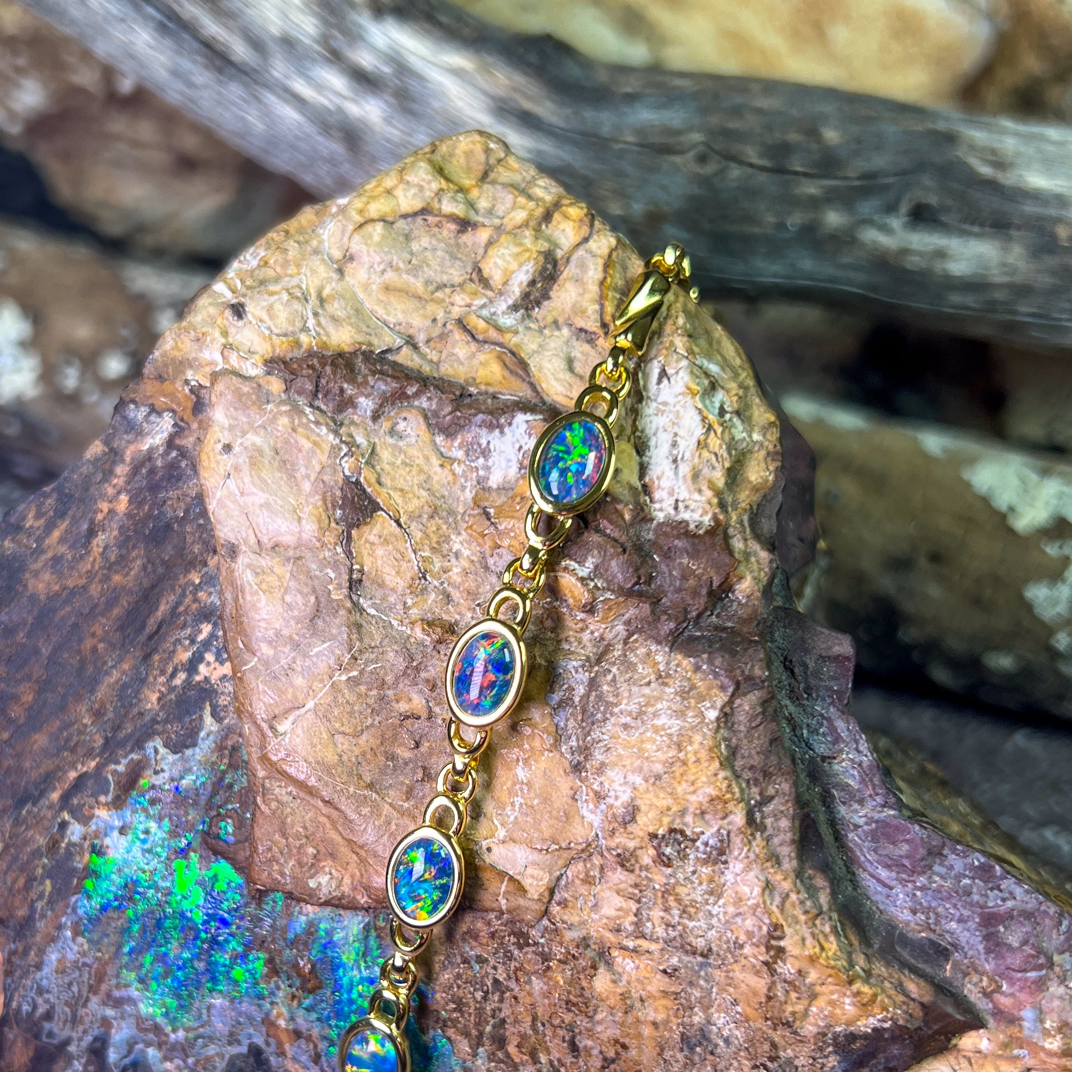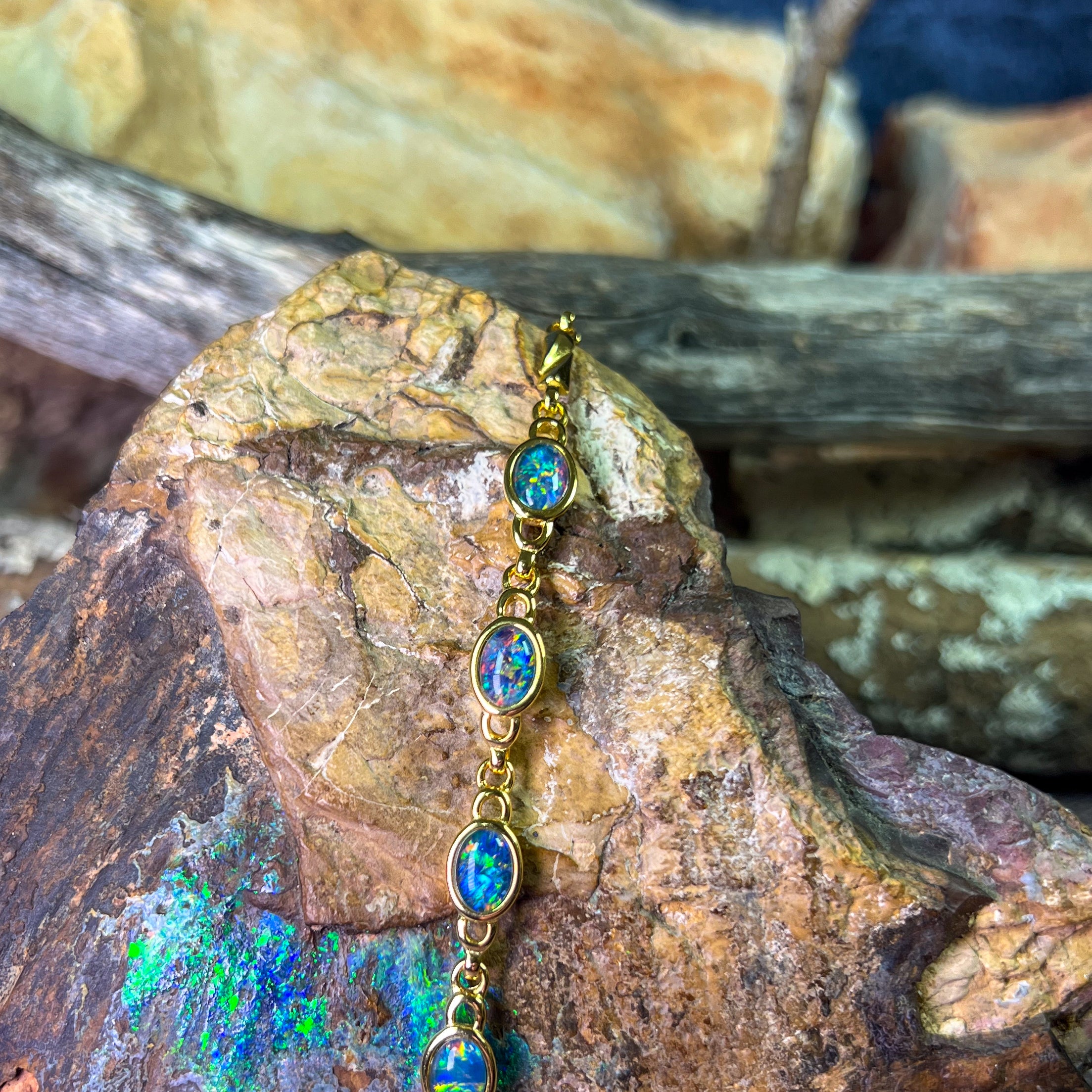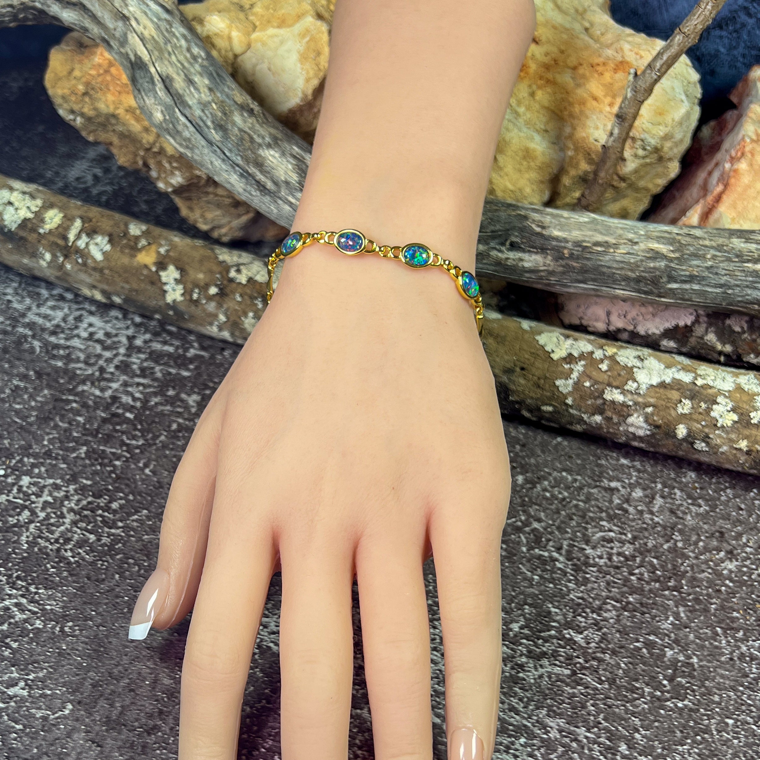 Indulge in the luxurious beauty of our Gold Plated Silver 4 Opal Triplet Bracelet. This exquisite piece features a stunning array of multi-colored opals that will captivate the senses. Elevate any outfit with the unique and vibrant colors of this bracelet. Experience the perfect blend of elegance and style in one piece.