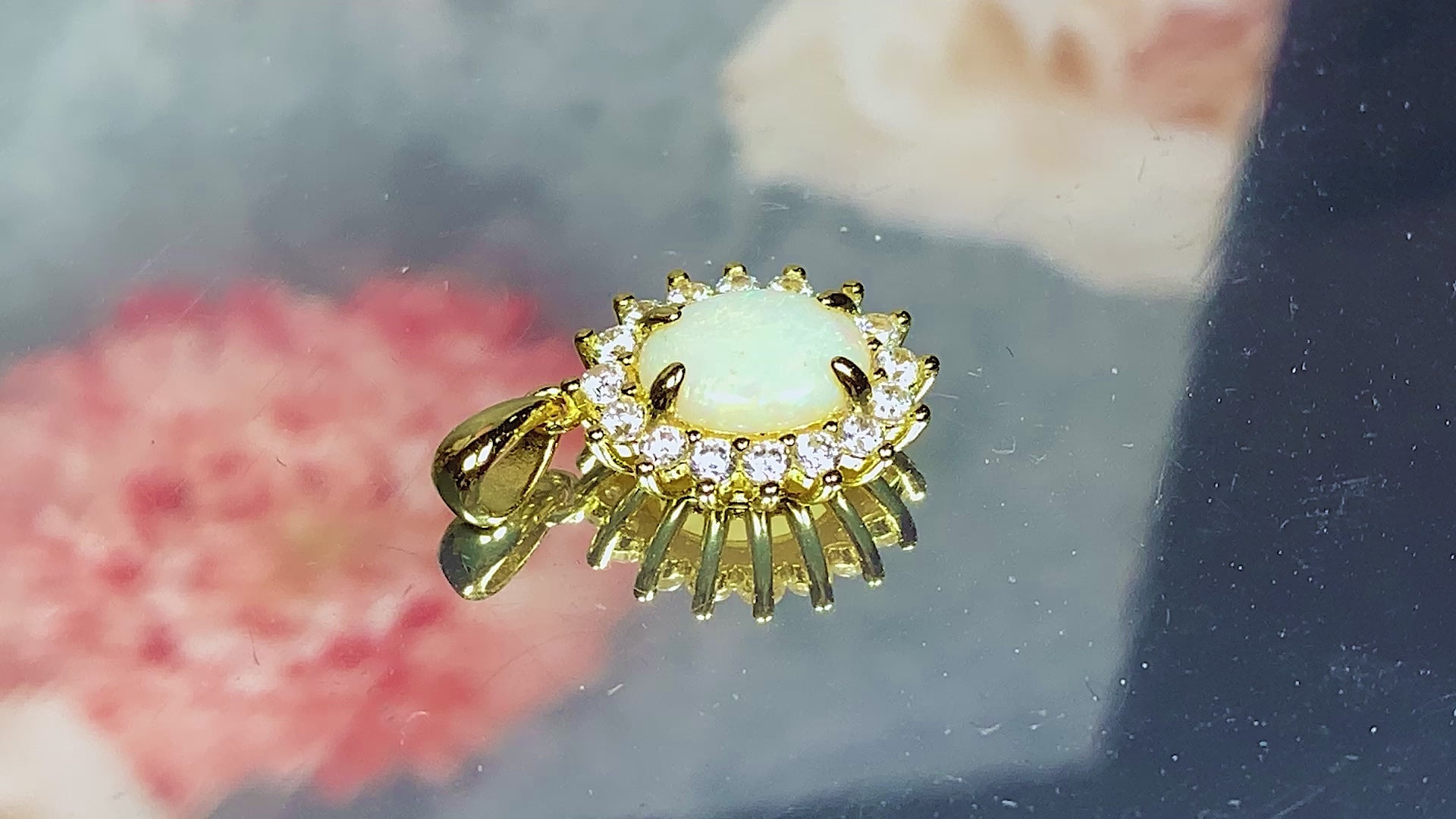 This stunning pendant is perfect for any occasion. Crafted with gold plated silver and featuring a classic cluster design, this White Opal necklace is sure to be treasured. Give the perfect gift for her -- a birthstone jewellery she'll love!