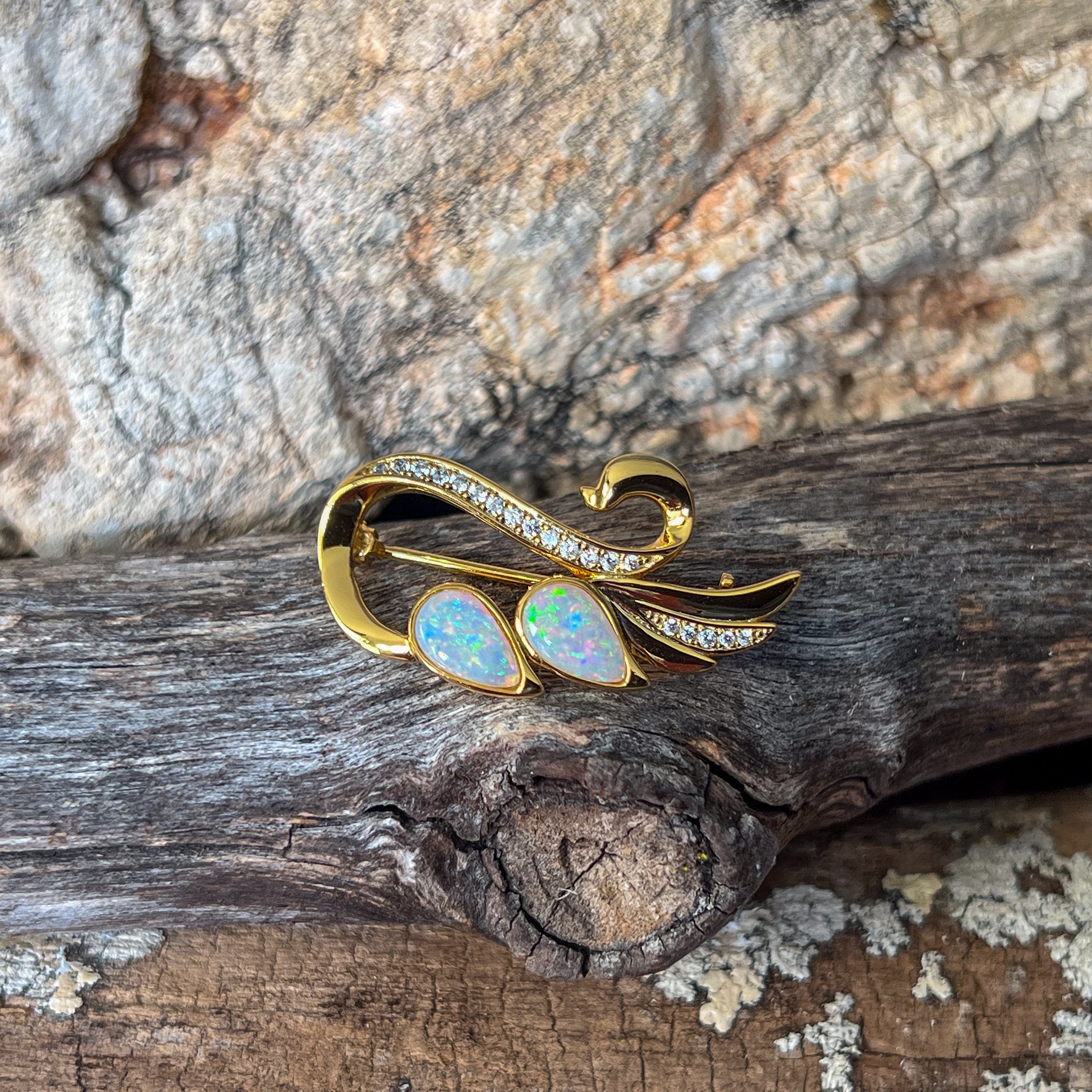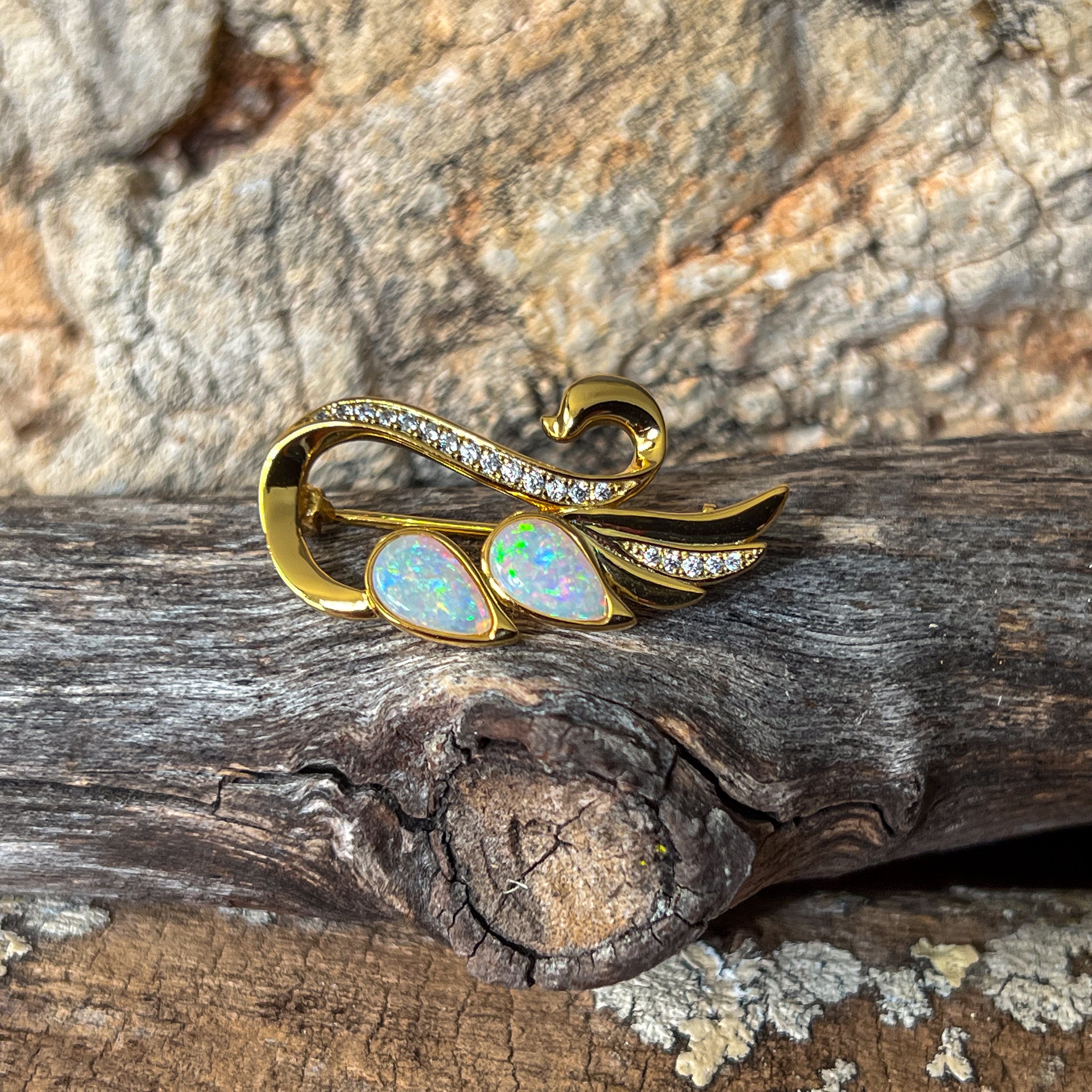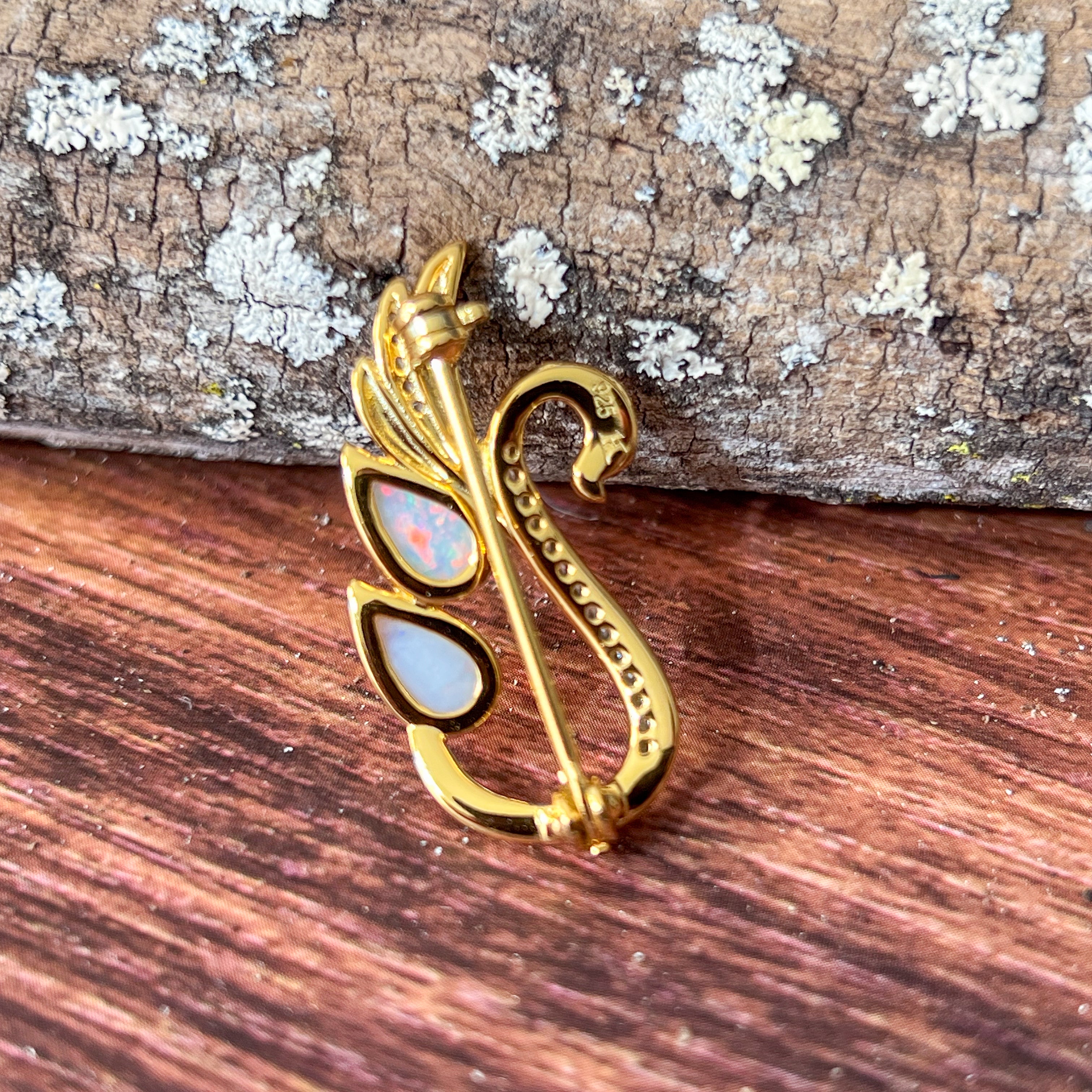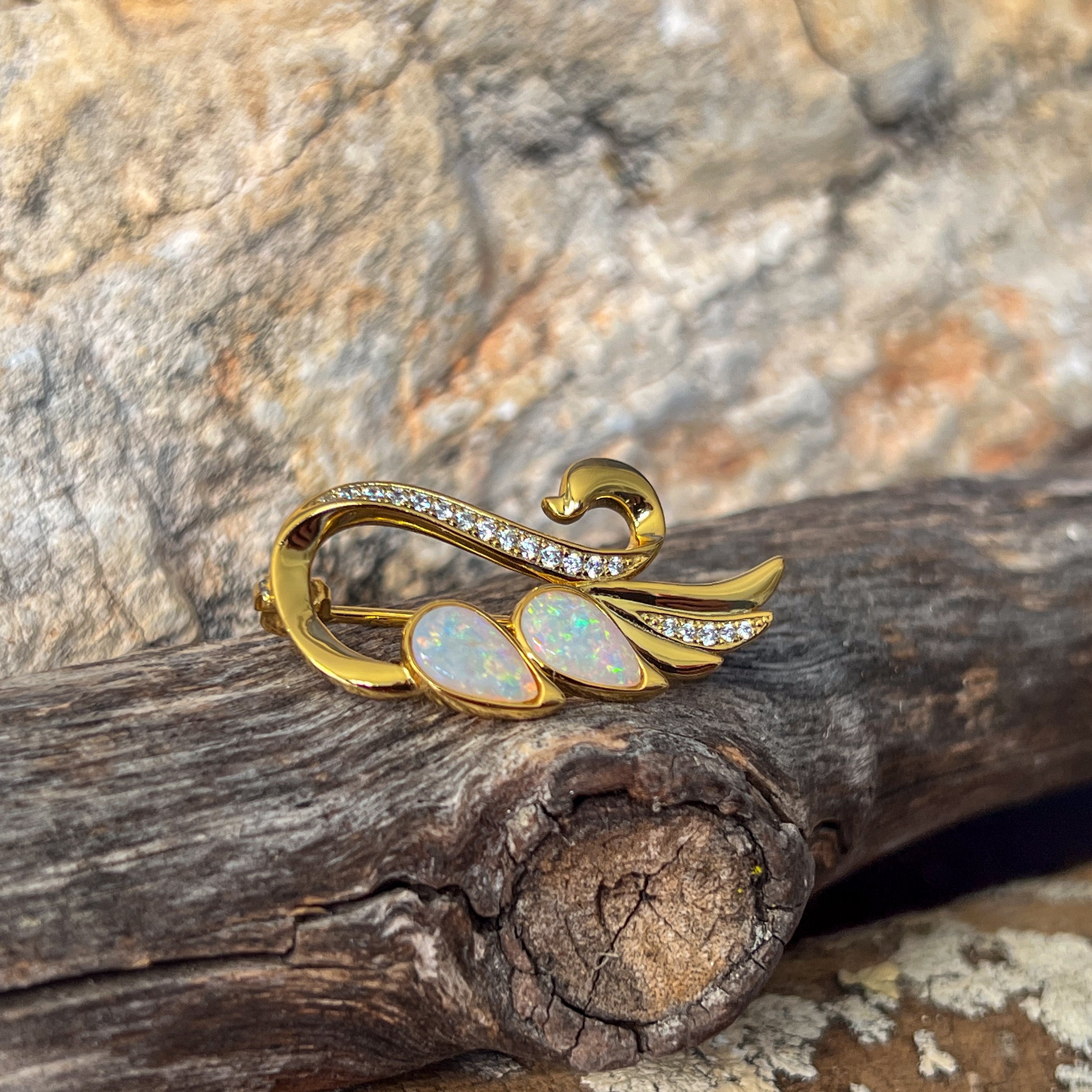 This elegant gold-plated silver brooch features a graceful swan design adorned with shimmering white opals. Its delicate craftsmanship makes it a meaningful gift, perfect for adding a touch of sophistication and natural beauty to any outfit. A timeless piece that celebrates elegance and the unique allure of opal jewellery.