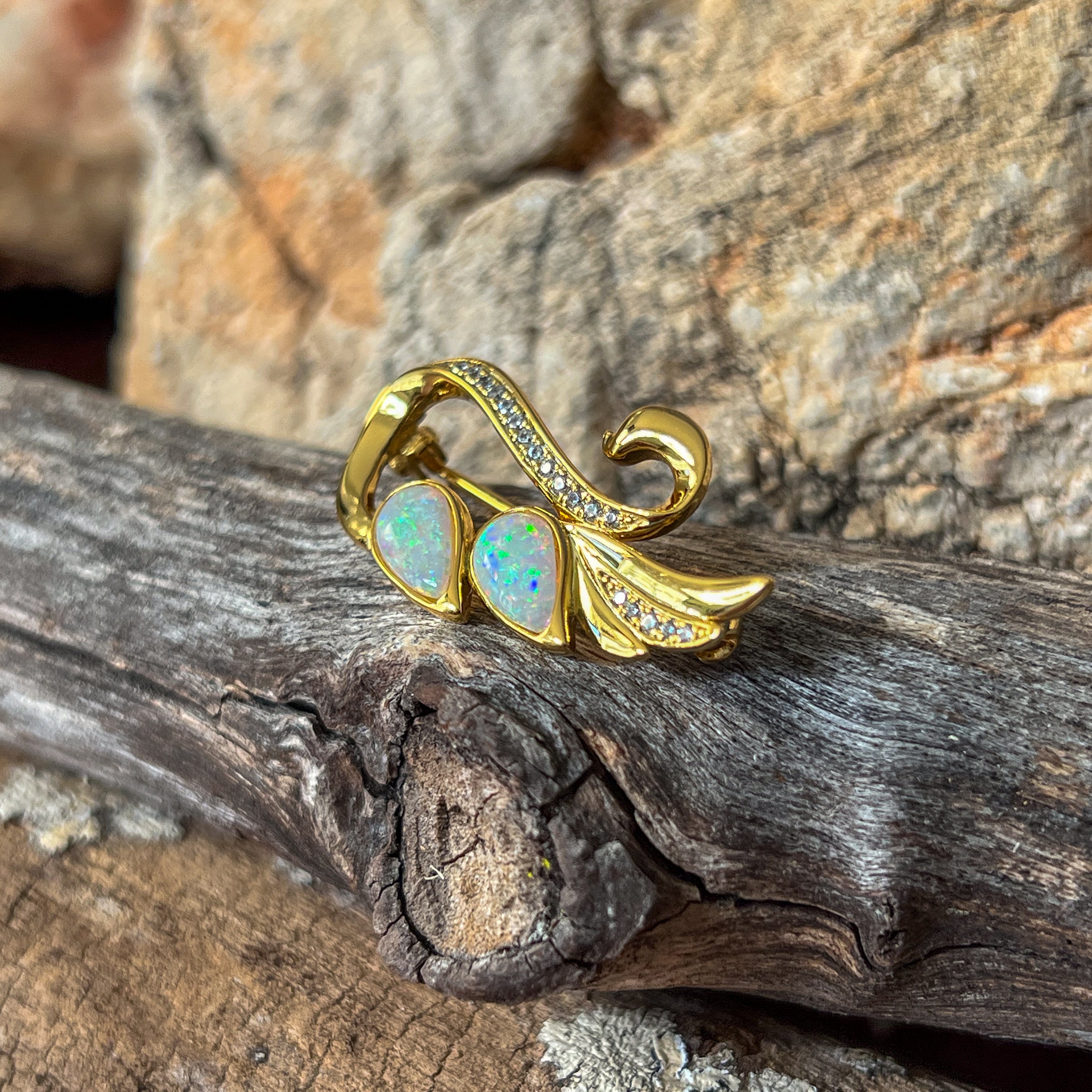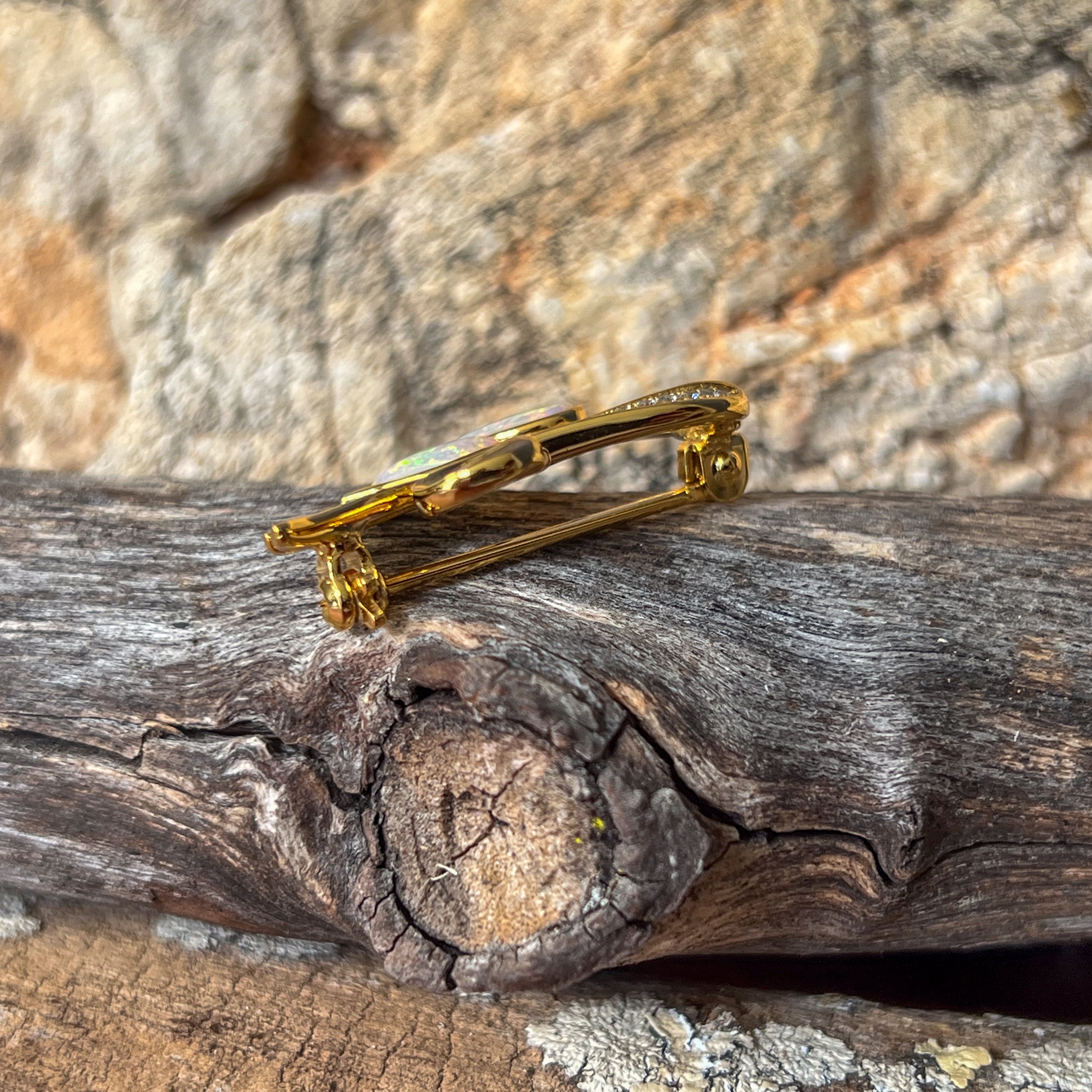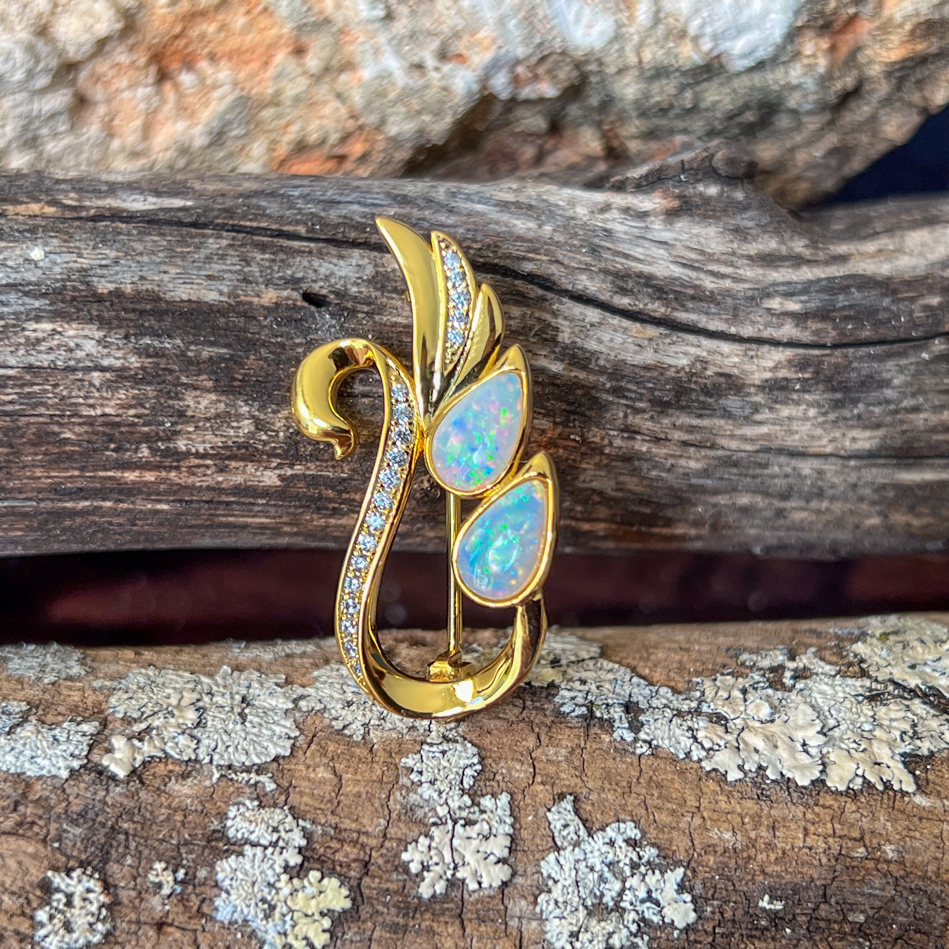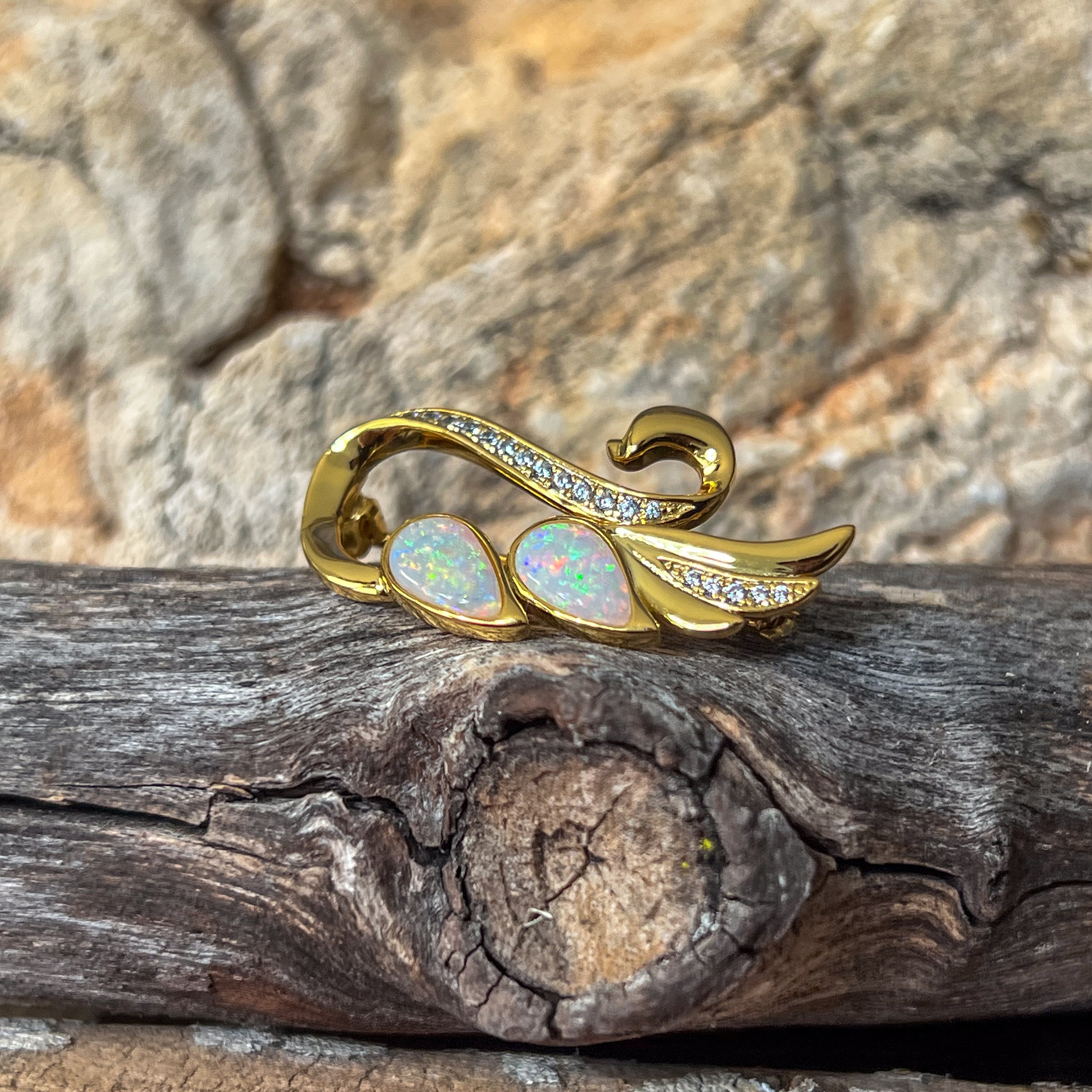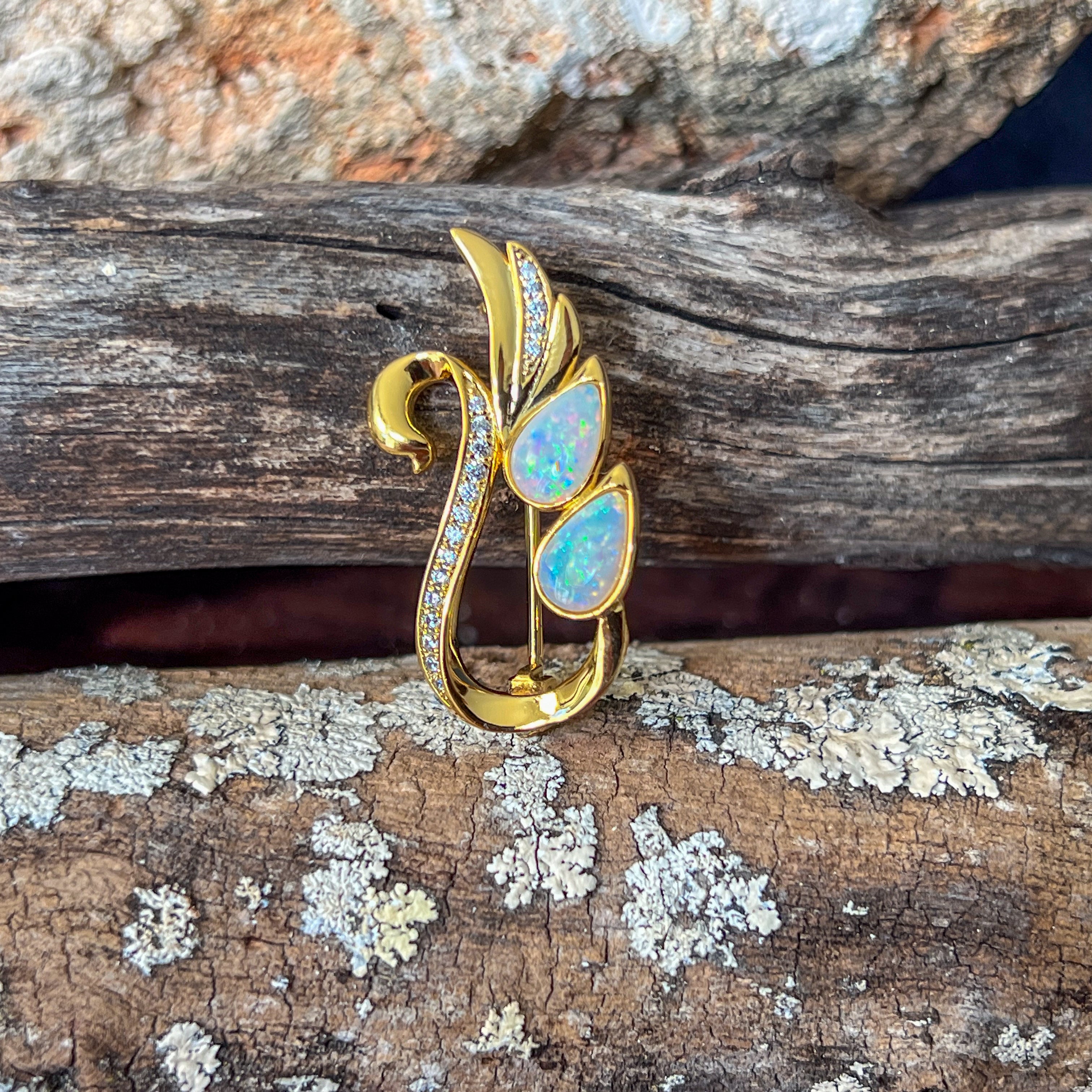 This elegant gold-plated silver brooch features a graceful swan design adorned with shimmering white opals. Its delicate craftsmanship makes it a meaningful gift, perfect for adding a touch of sophistication and natural beauty to any outfit. A timeless piece that celebrates elegance and the unique allure of opal jewellery.