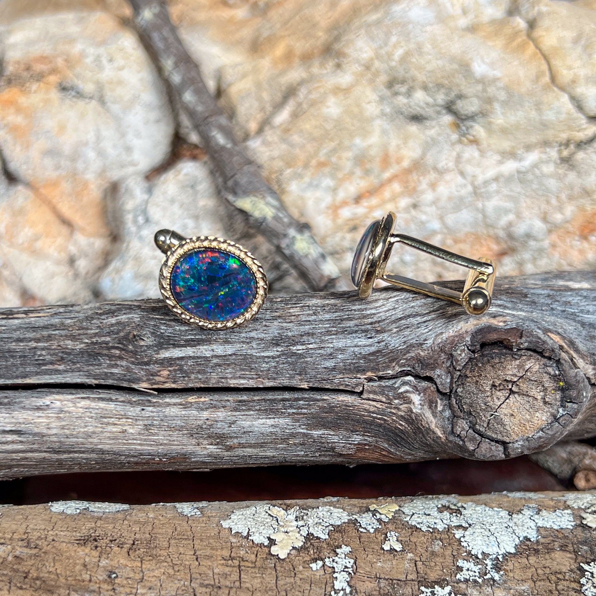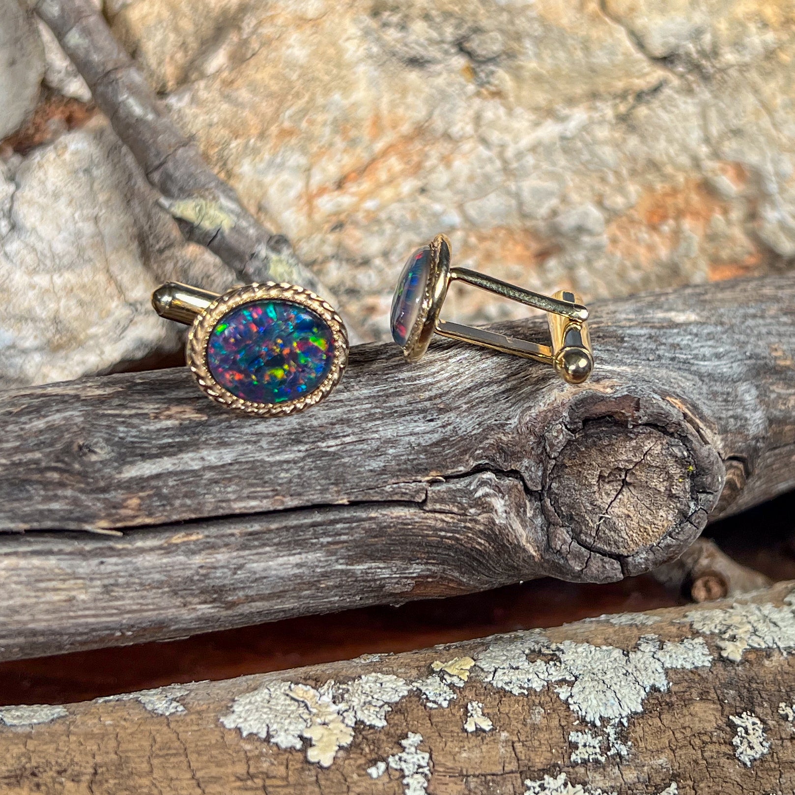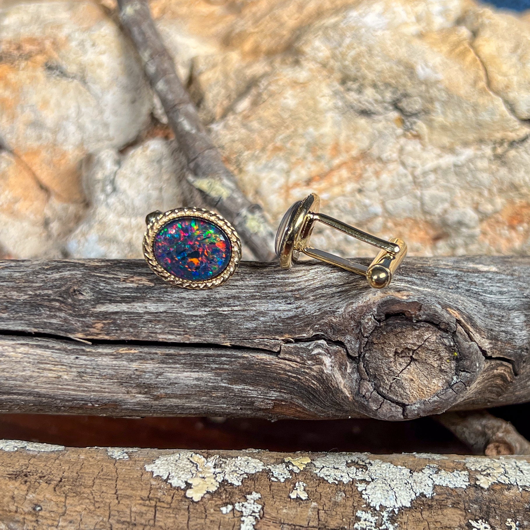 Elevate your style with these gold-plated silver cufflinks, featuring striking 12x10mm opal triplets. Their classic design combines timeless elegance with vibrant opal hues, perfect for adding a refined touch to any formal outfit. Durable silver craftsmanship with a rich gold finish ensures lasting sophistication and appeal. Ideal for special occasions or as a thoughtful gift, these cufflinks bring subtle luxury to your wardrobe.