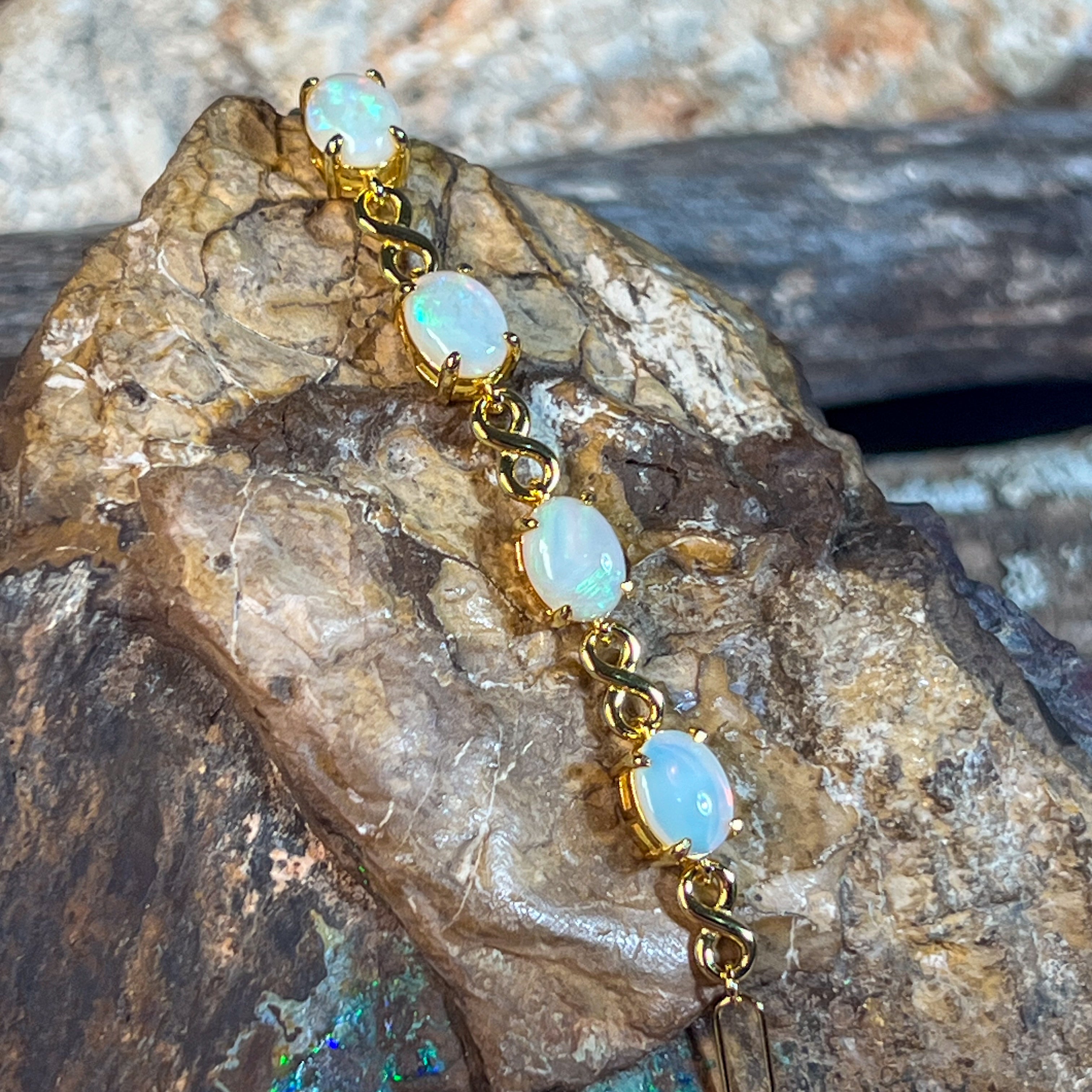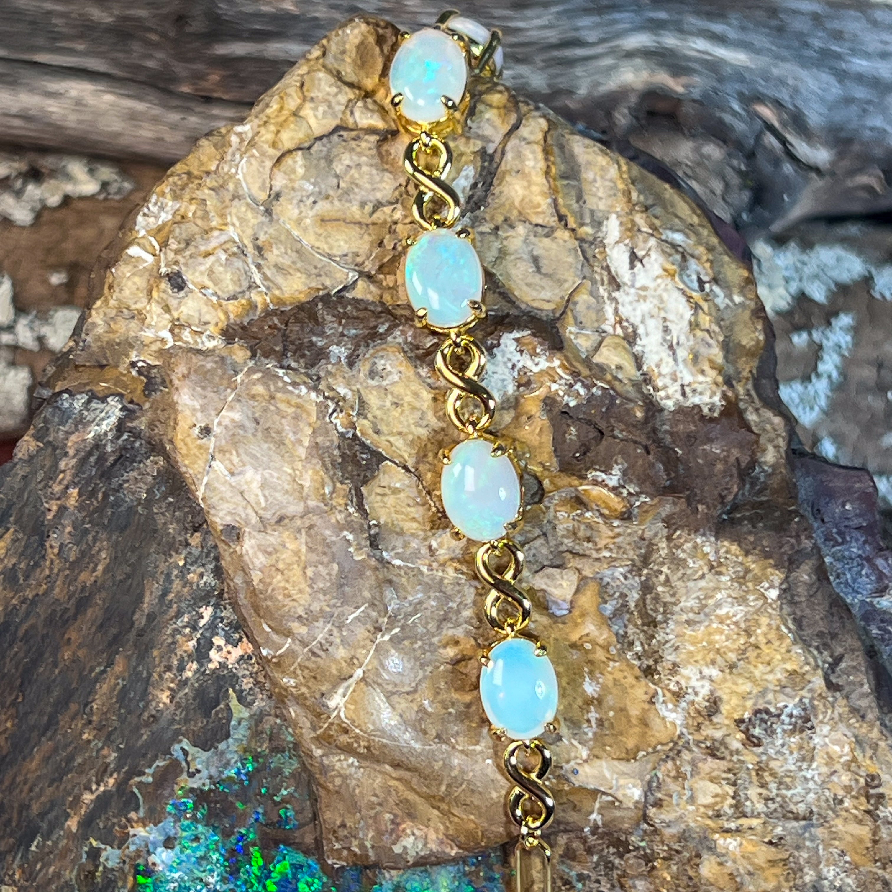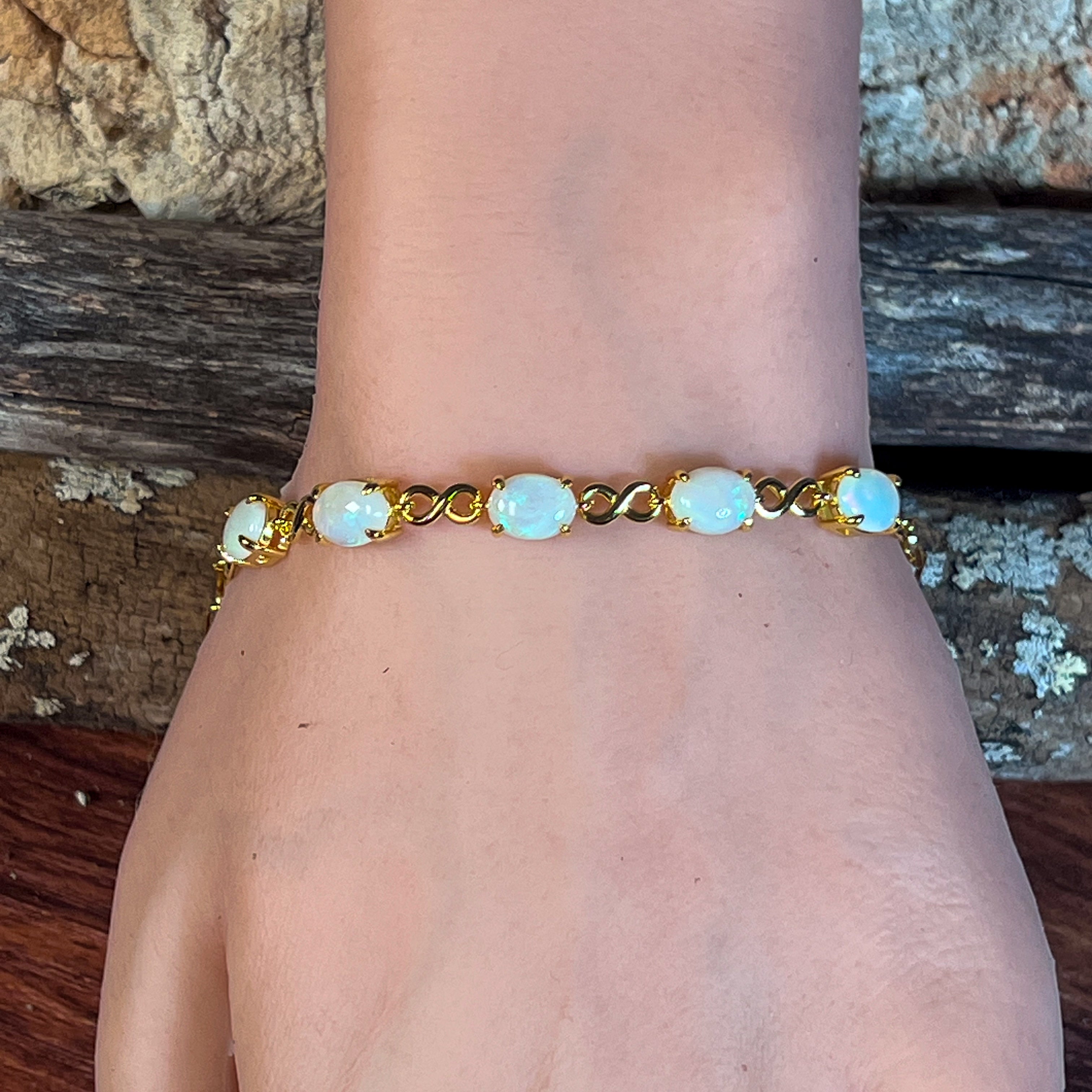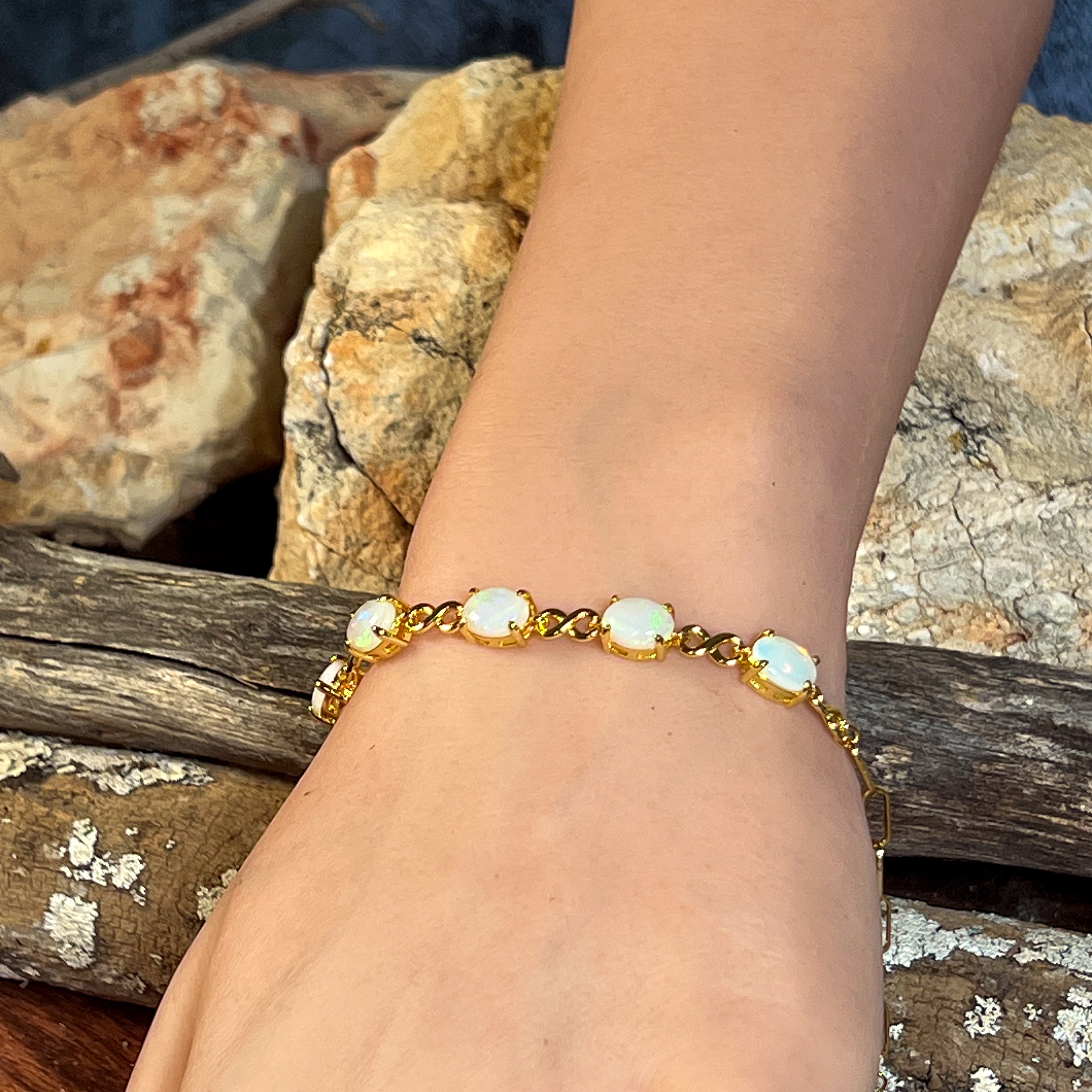 Elevate your style with this gold-plated silver bracelet featuring a sleek infinity design and a delicate 8x6mm light opal. Its modern elegance makes it perfect for everyday wear or special occasions, adding a subtle yet captivating shimmer to your wrist. Durable and timeless, this piece effortlessly complements any outfit while symbolizing endless possibilities.