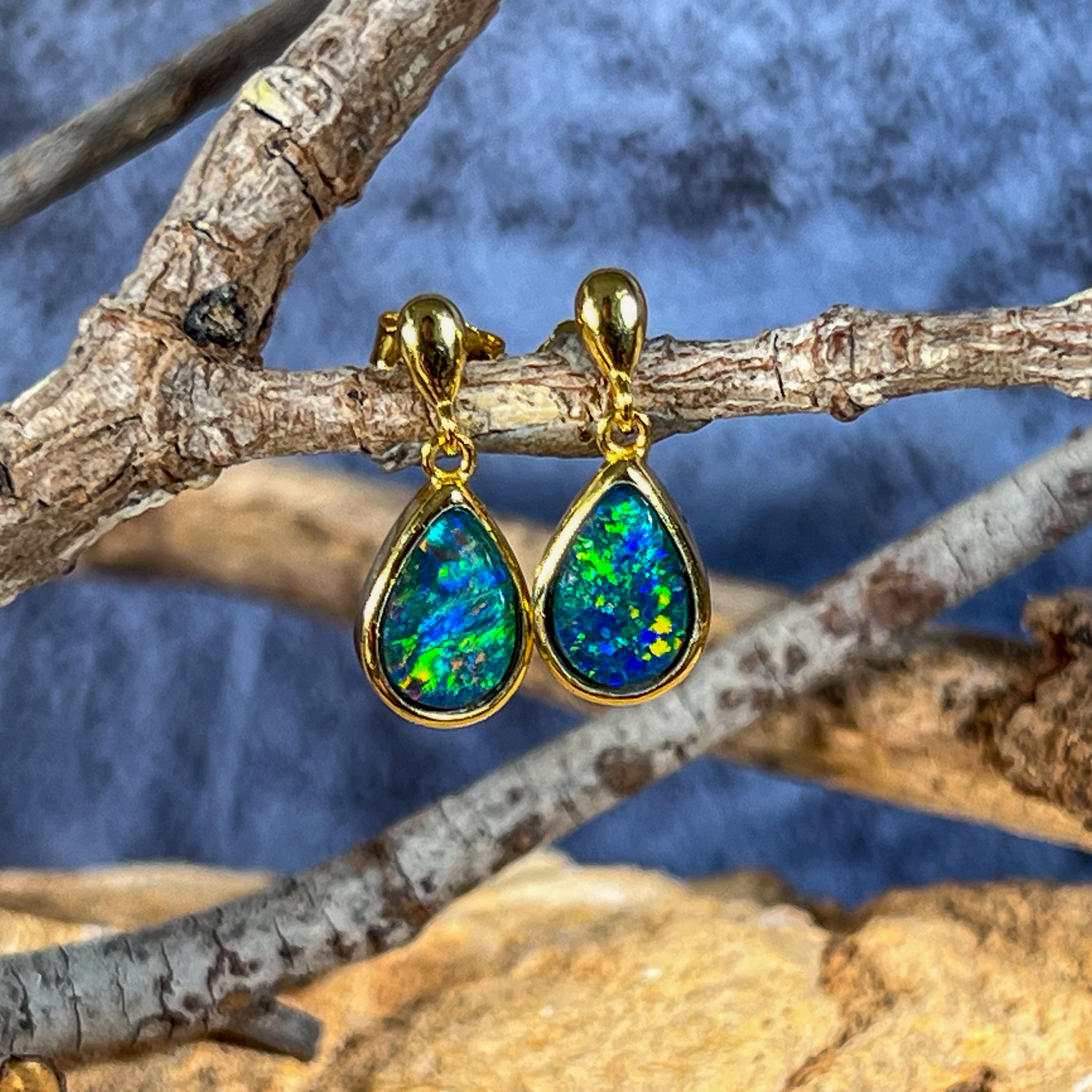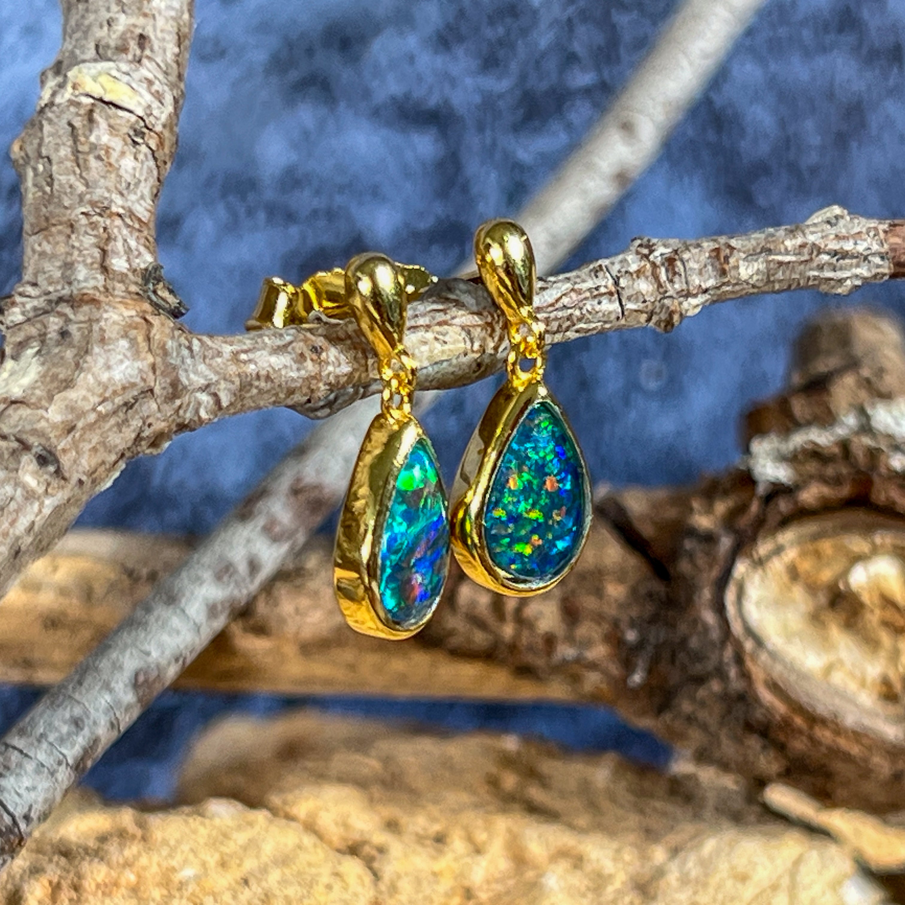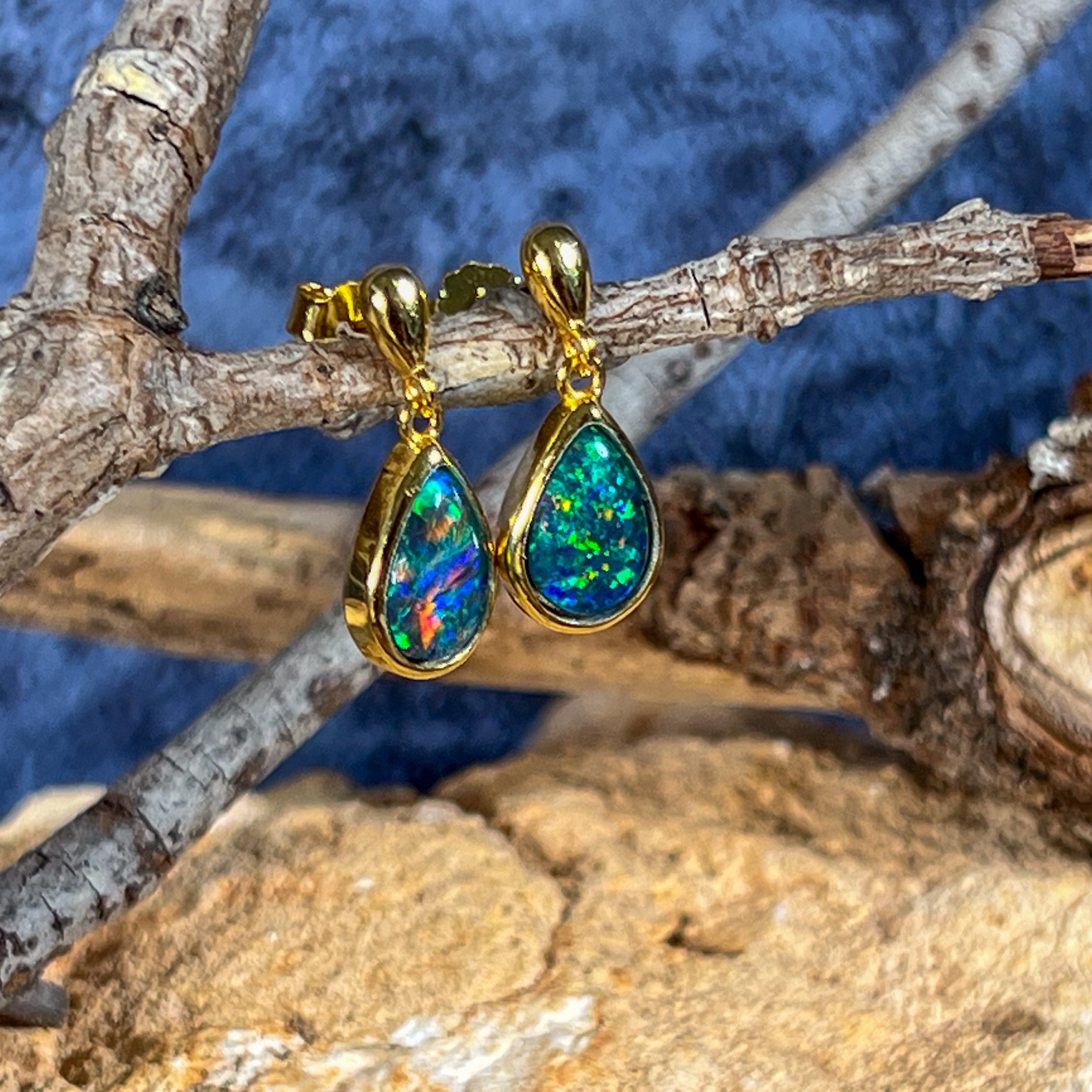 Gold plated Silver short drop pear shape 9x6mm Opal triplet earrings