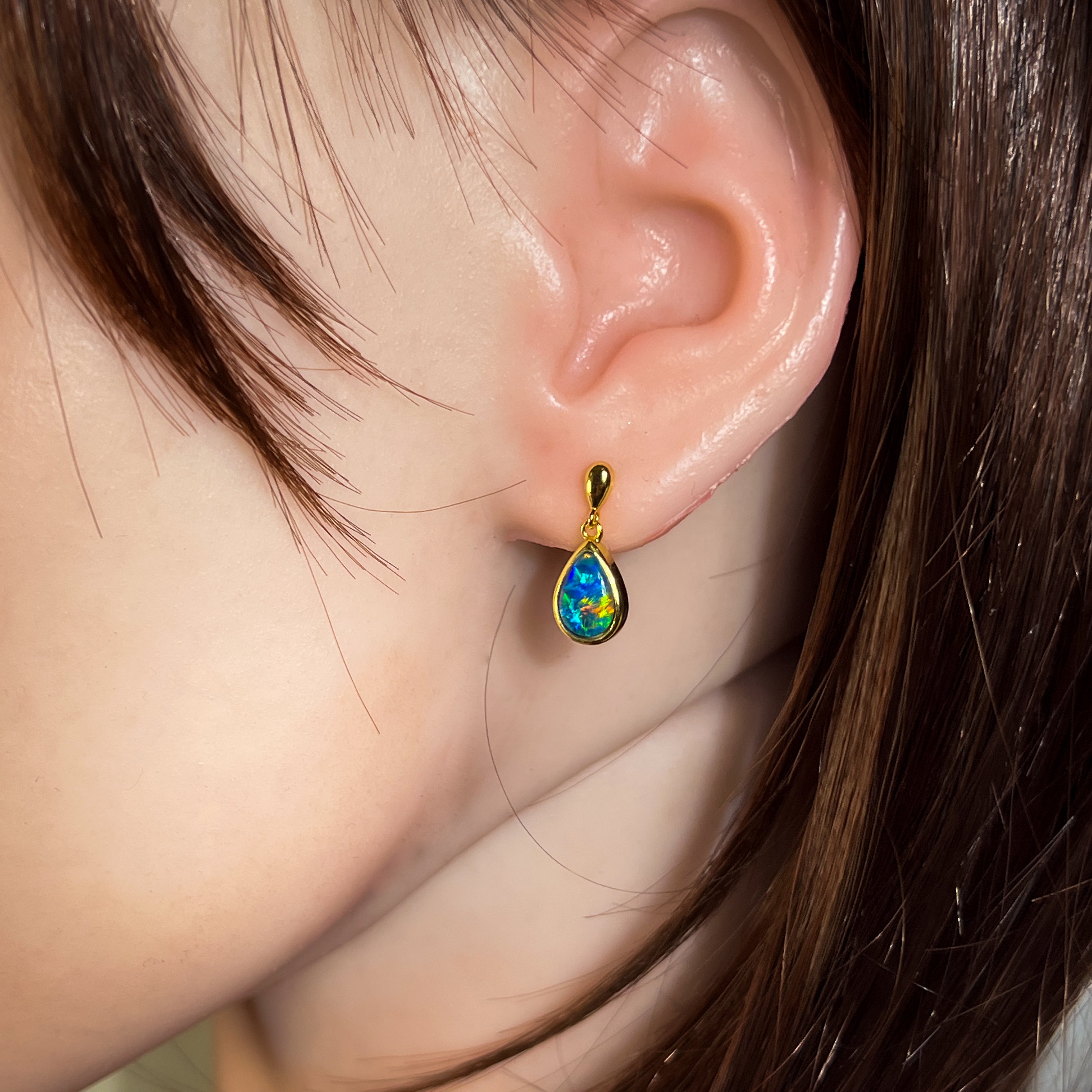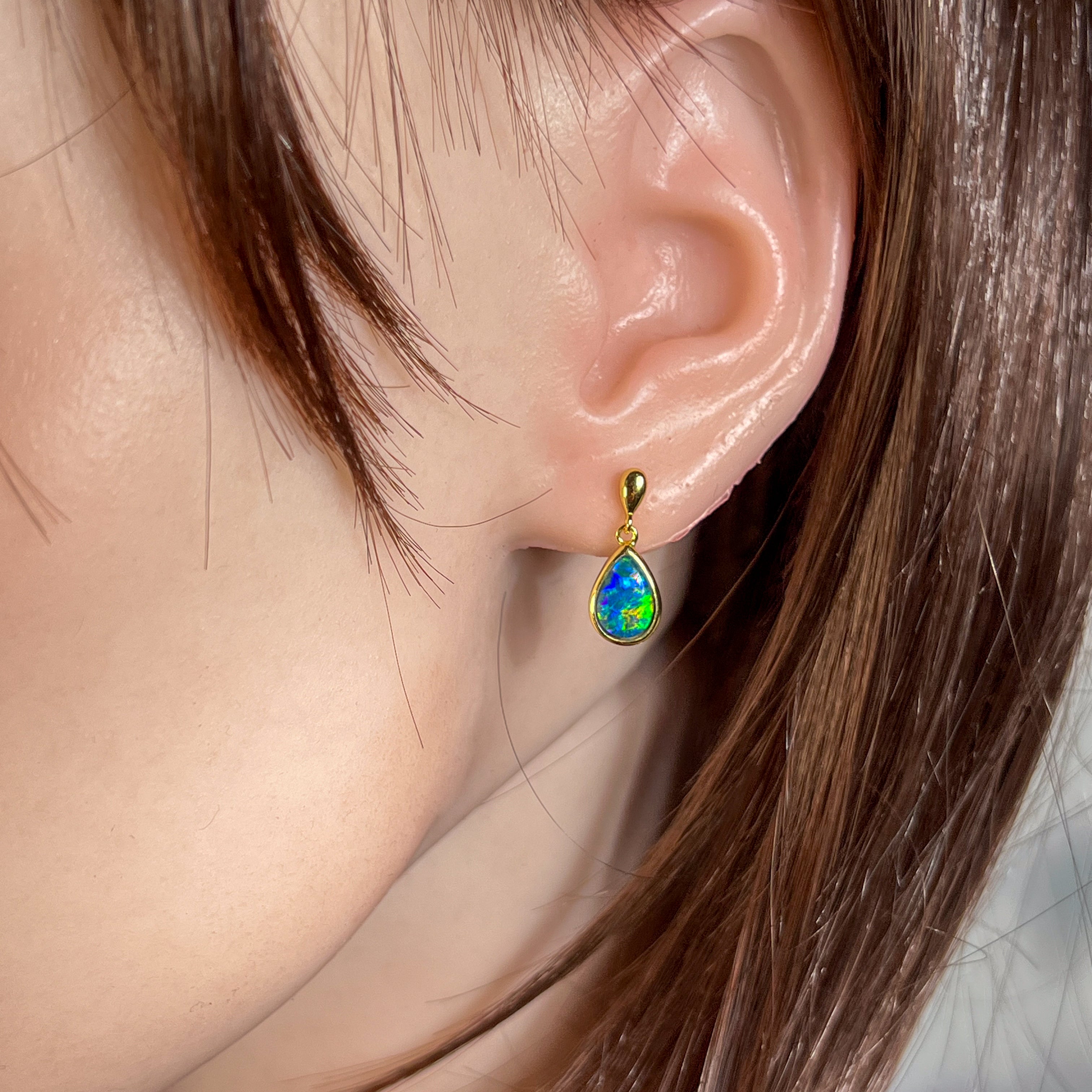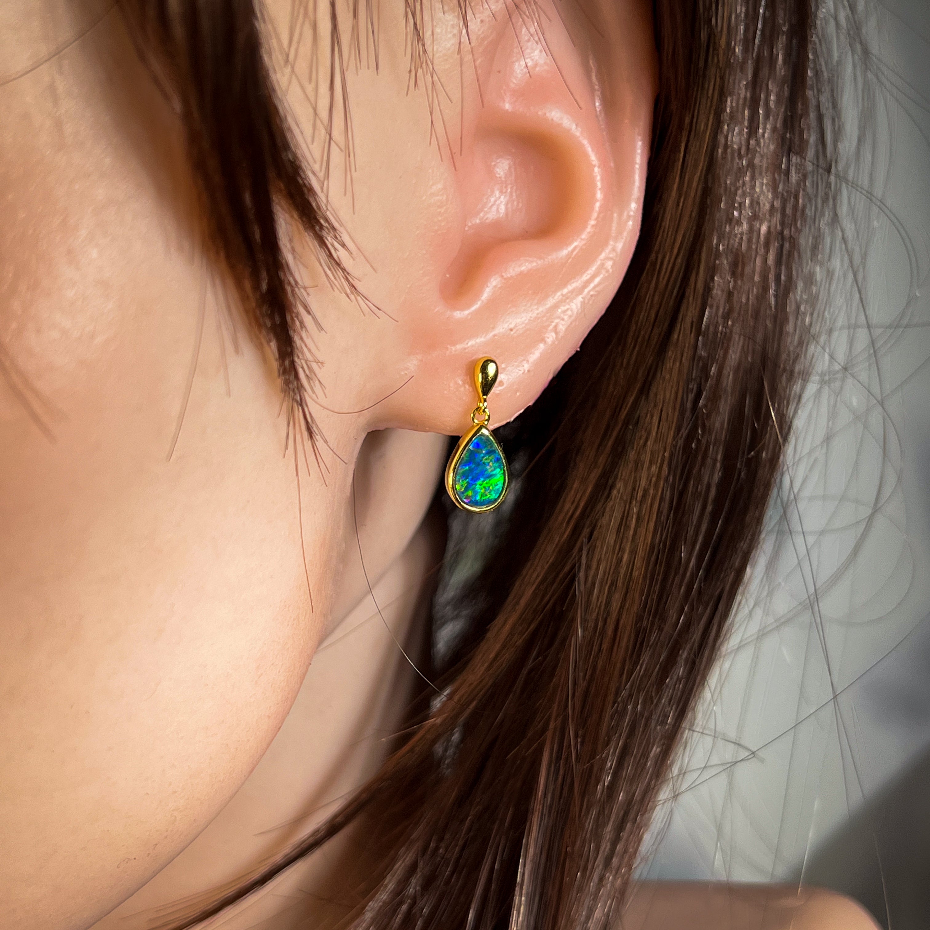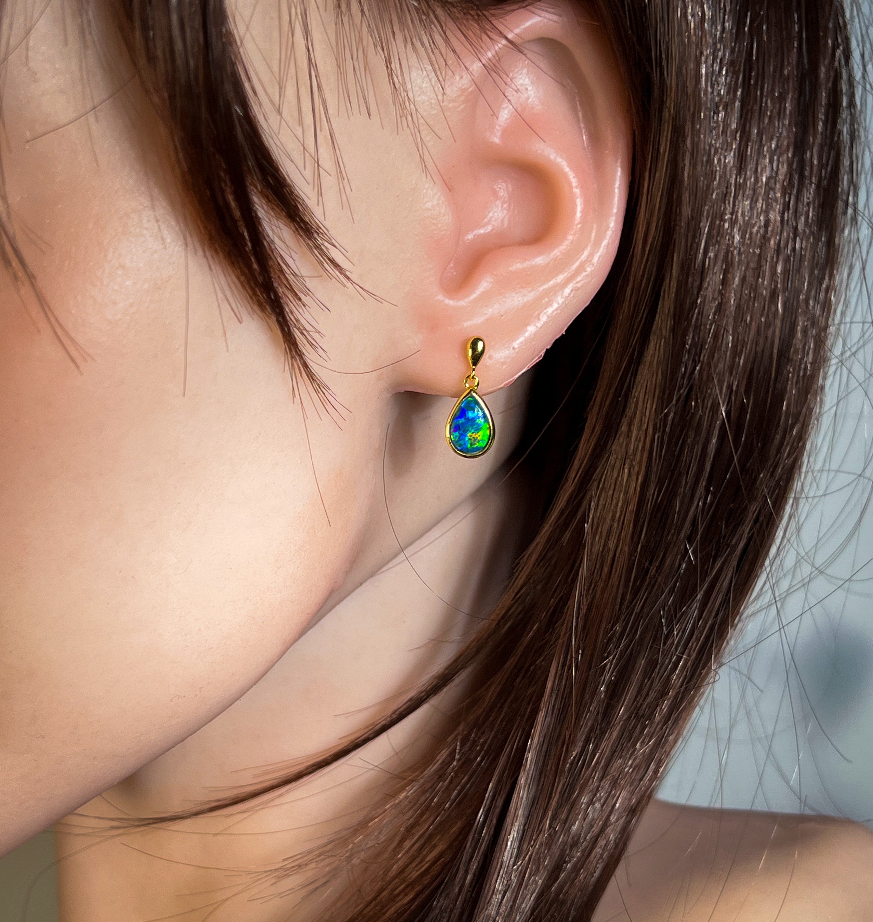 Indulge in the luxurious elegance of our Gold plated Silver short drop pear shape 9x6mm Opal triplet earrings! These striking dangle earrings are sure to add a touch of sophistication to any outfit. With their beautiful opal triplets, they offer a subtle and unique sparkle that will make you stand out from the crowd. Elevate your style and embrace the beauty of these stunning earrings today!