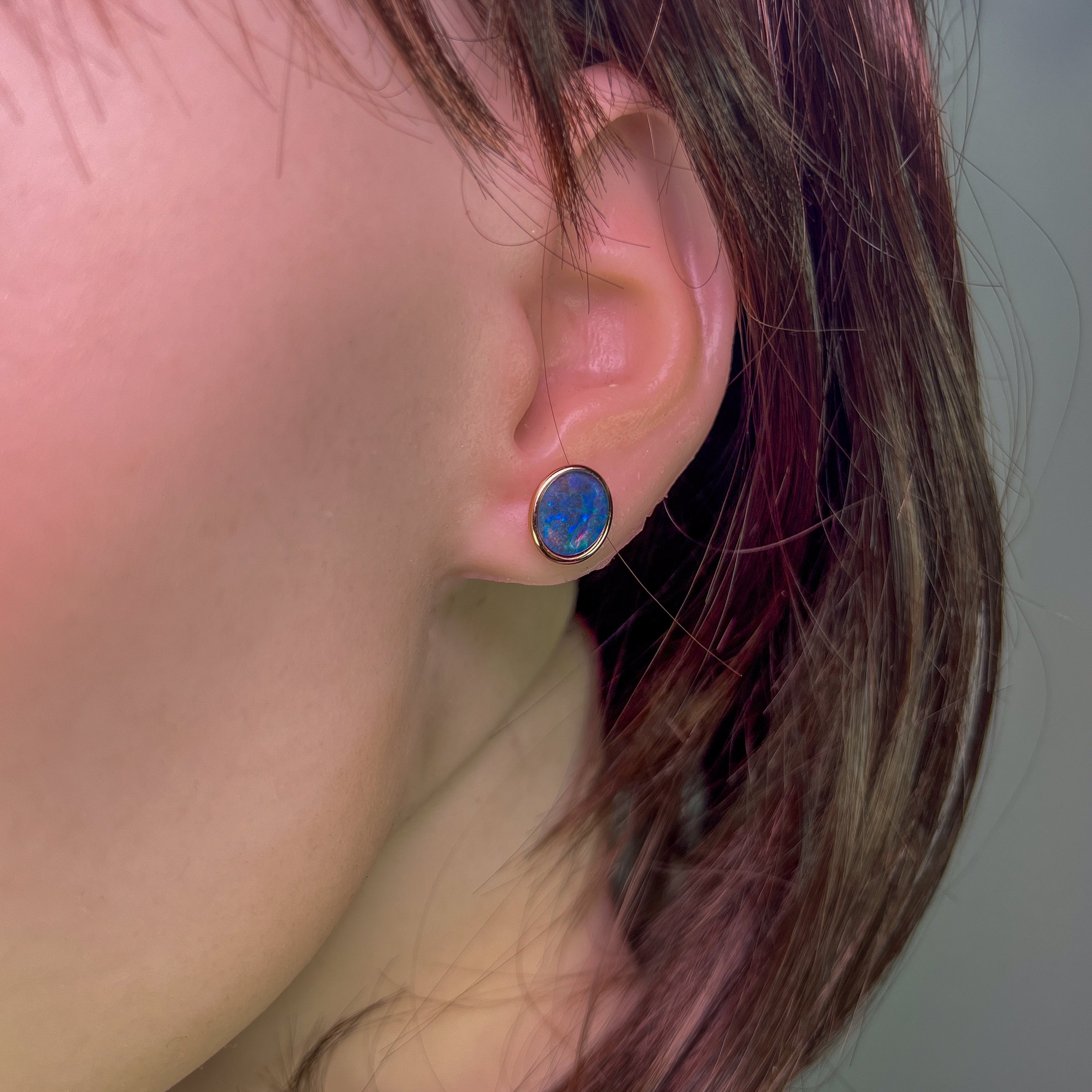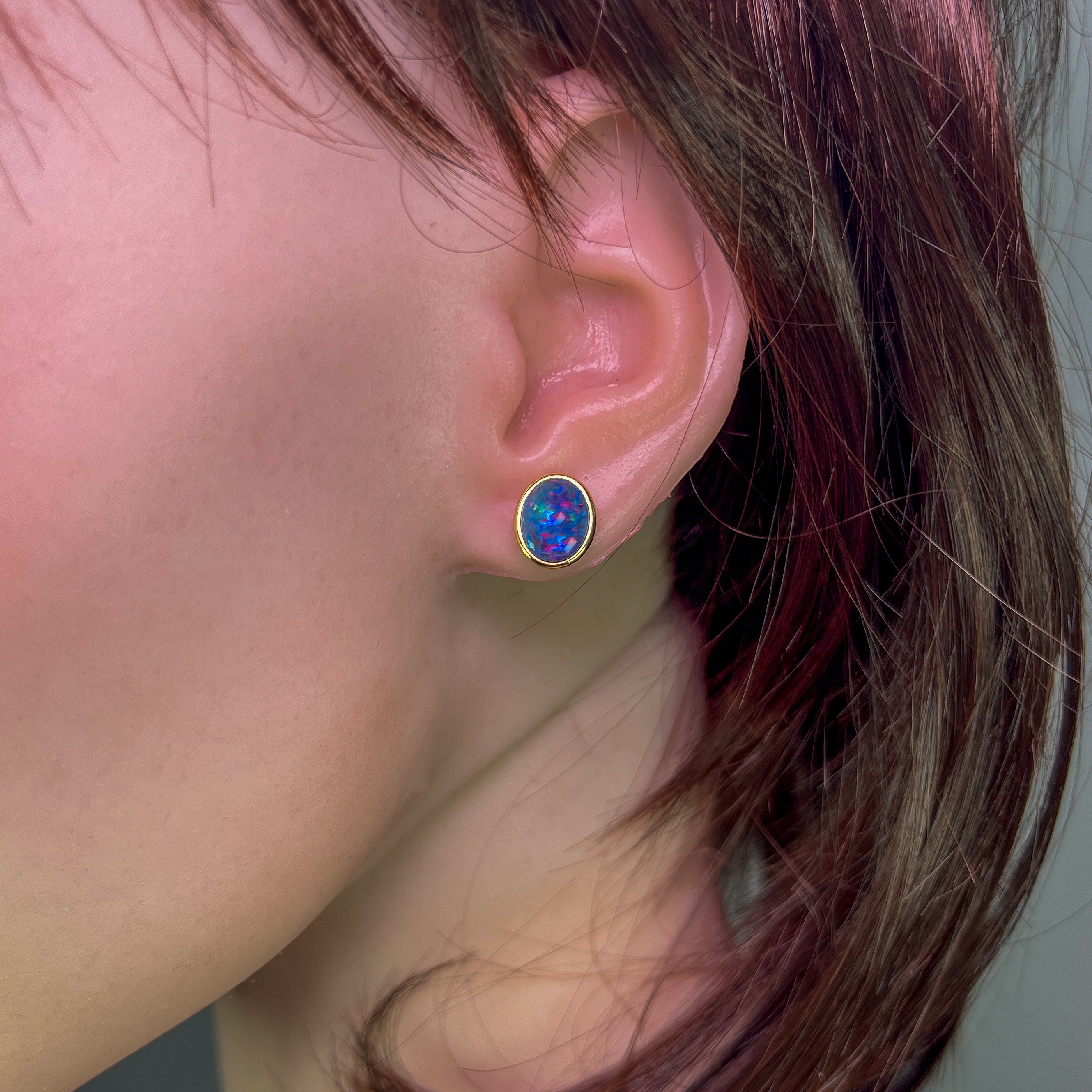 Enhance your style with these elegant Gold Plated Sterling Silver 10x8mm Opal triplet Oval bezel set studs. The stunning opal birthstone catches the light with its unique play of colors, making it a beautiful gift for any occasion. Crafted with precision and quality, these earrings are a must-have for any jewelry collection.