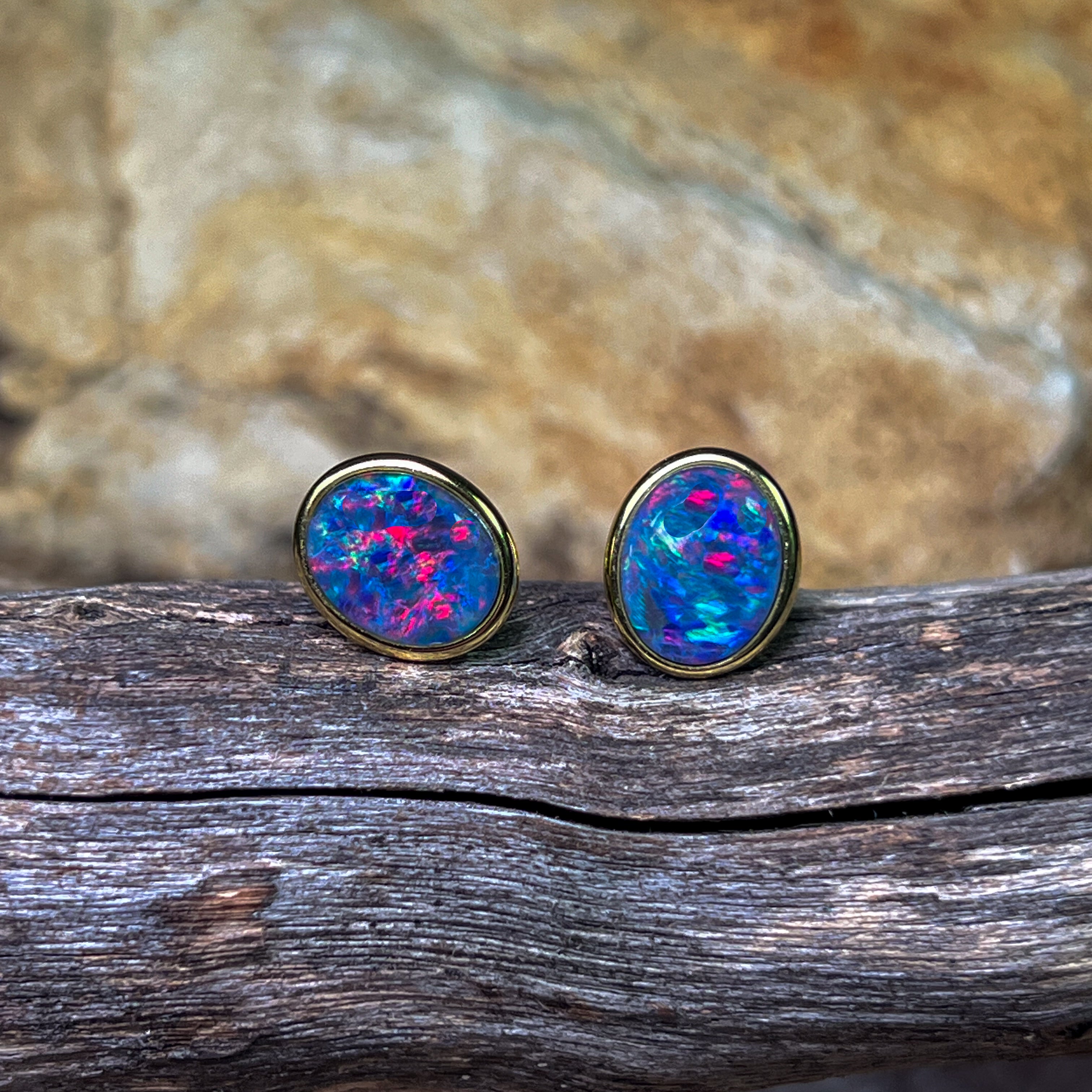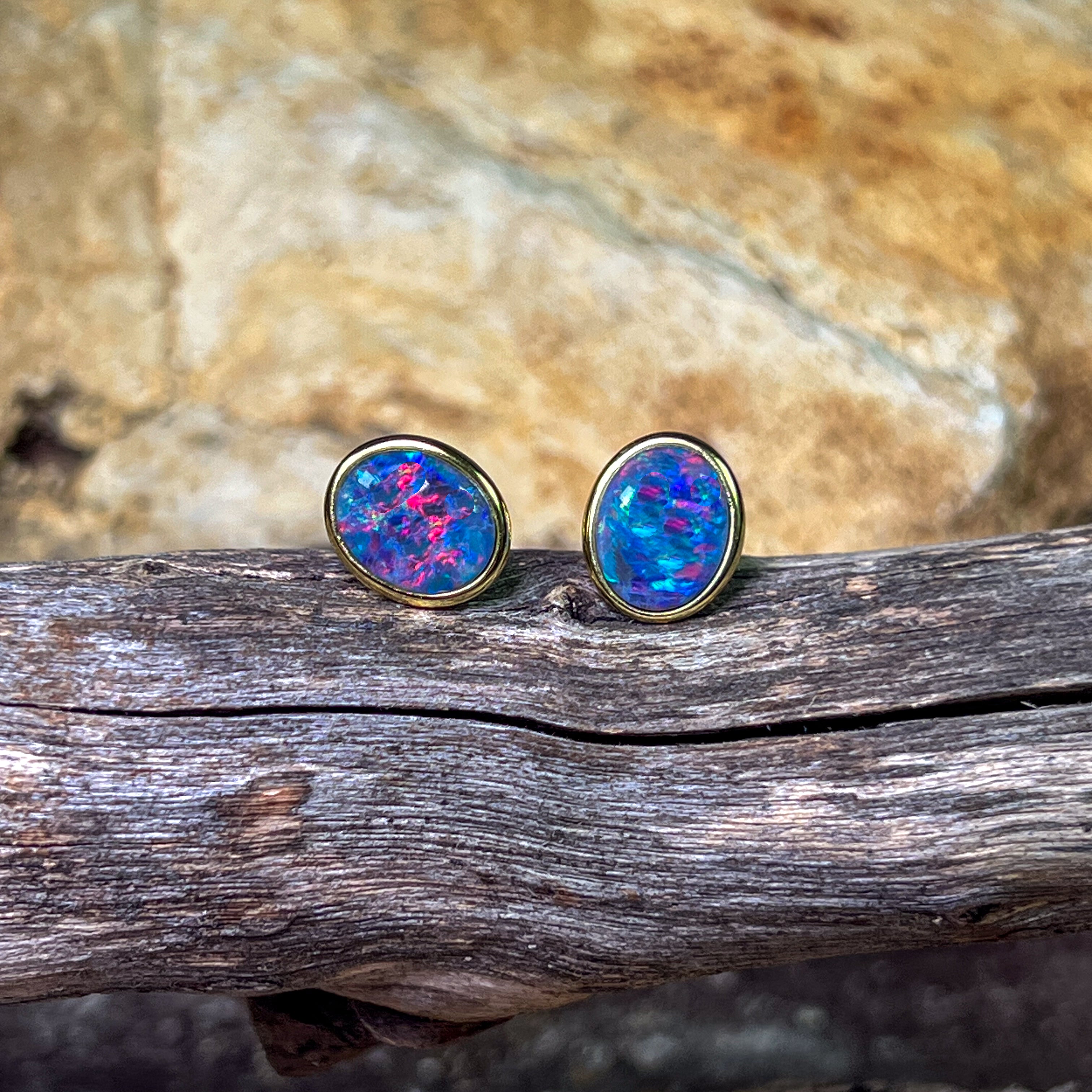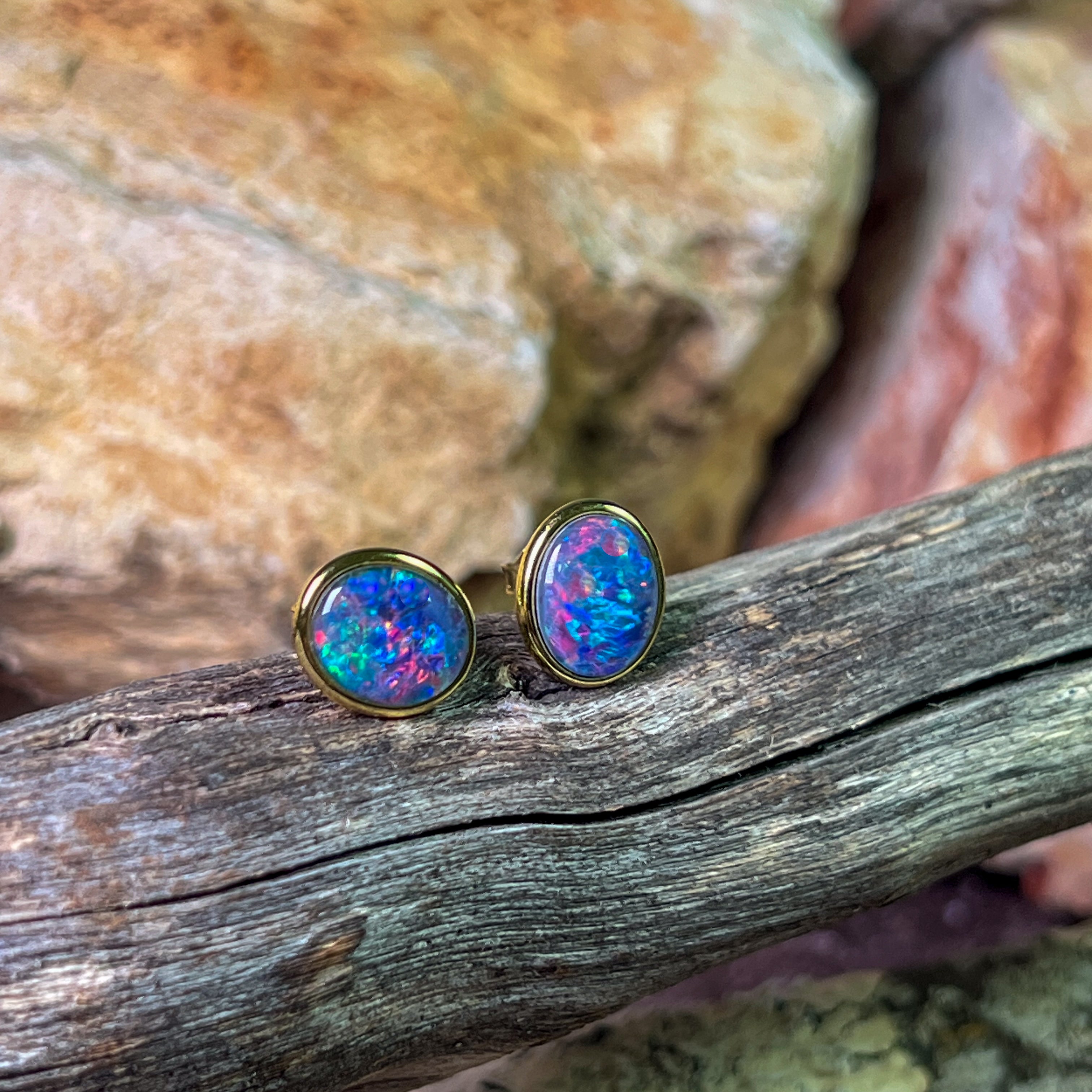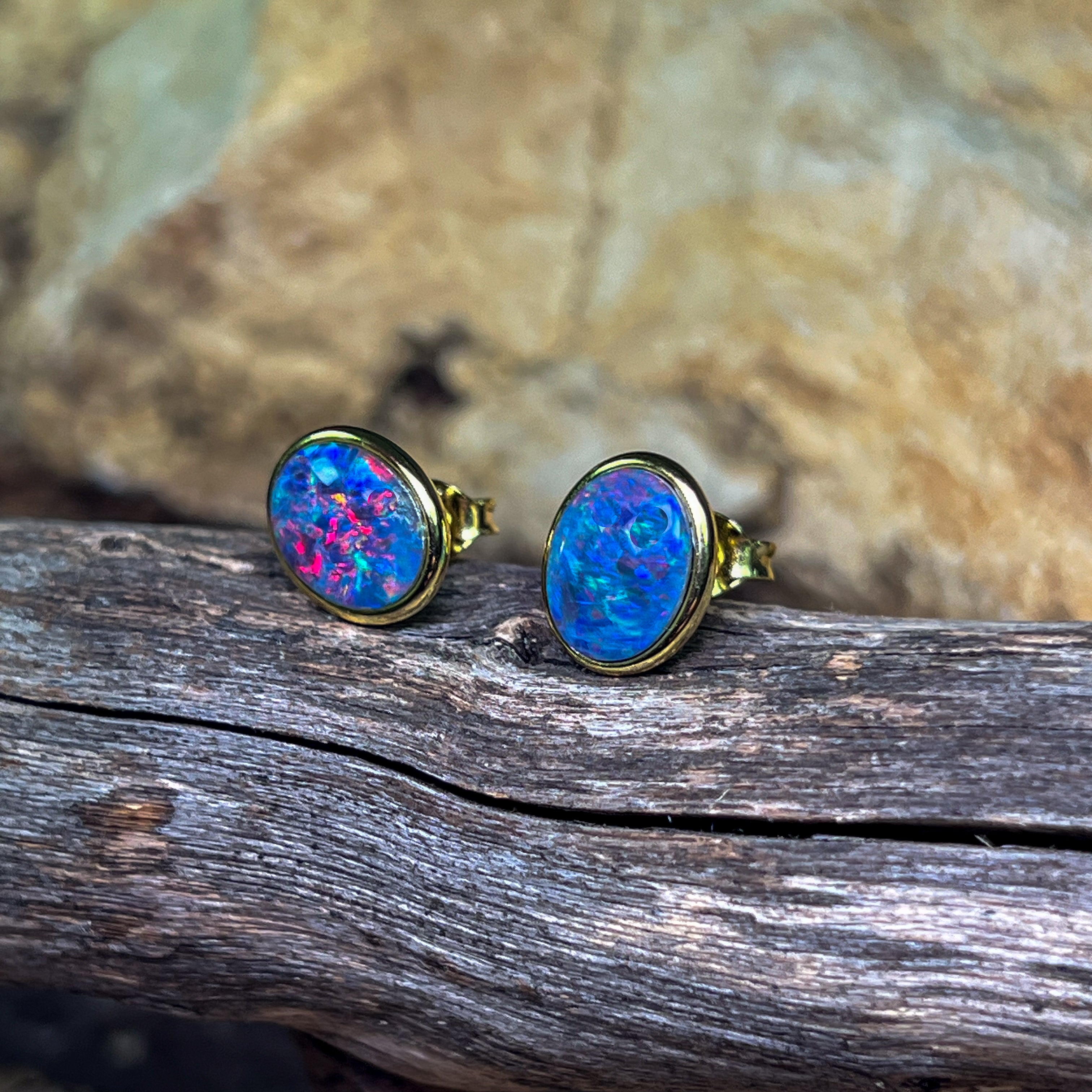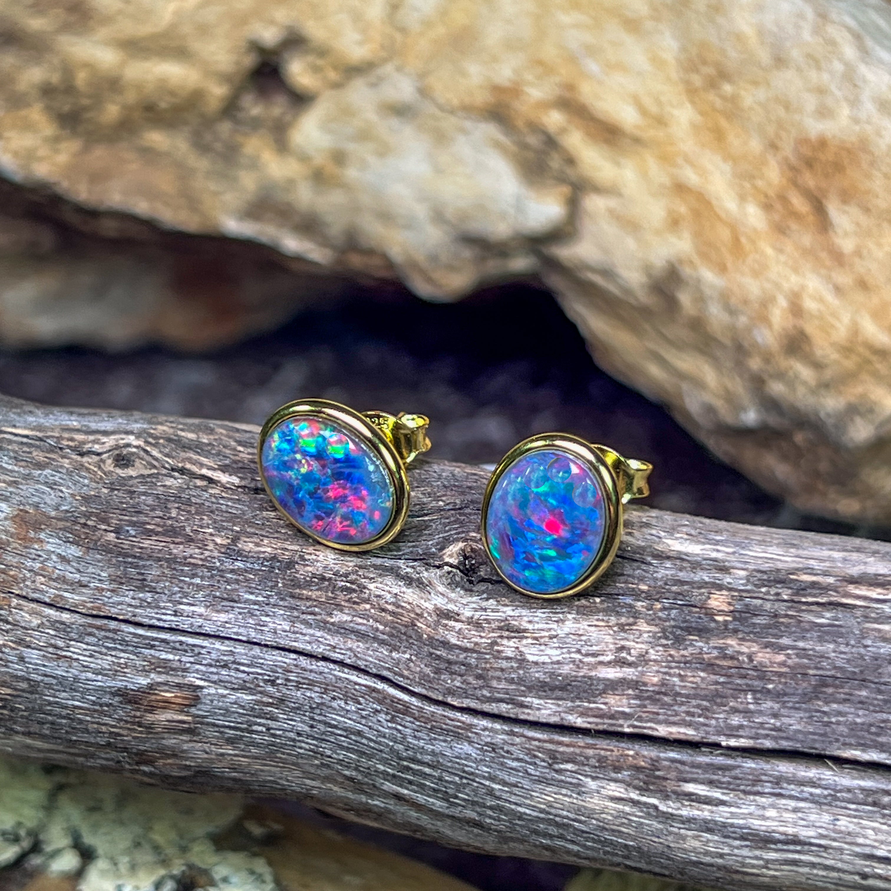 Gold Plated Sterling Silver 10x8mm Opal triplet Oval bezel set studs